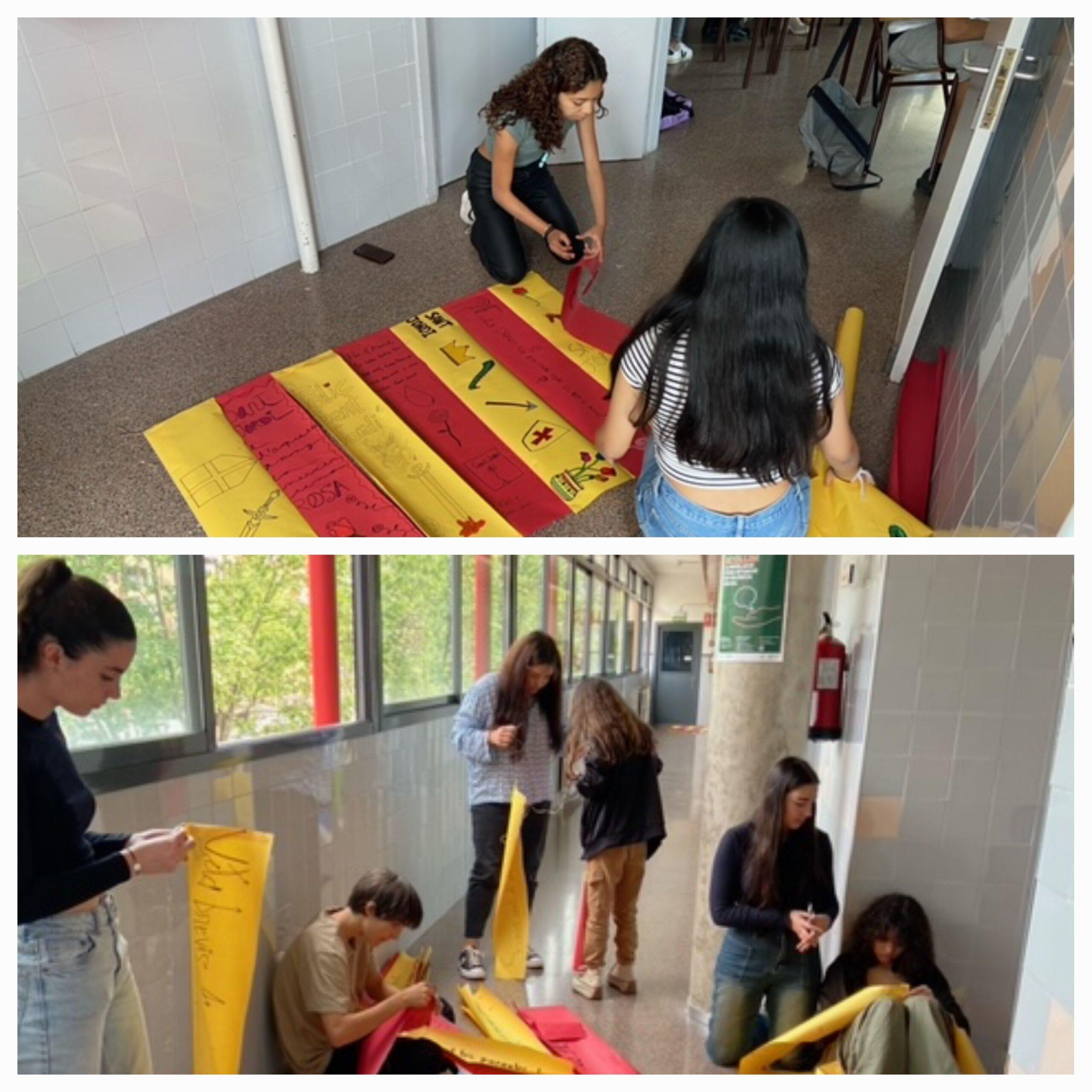 Durant les primeres hores, vam decorar les finestres dels passadissos escribint versos que vam crear o vam buscar d’altres autores i autors. Amb totes les composicions, vam representar els colors de La Senyera.