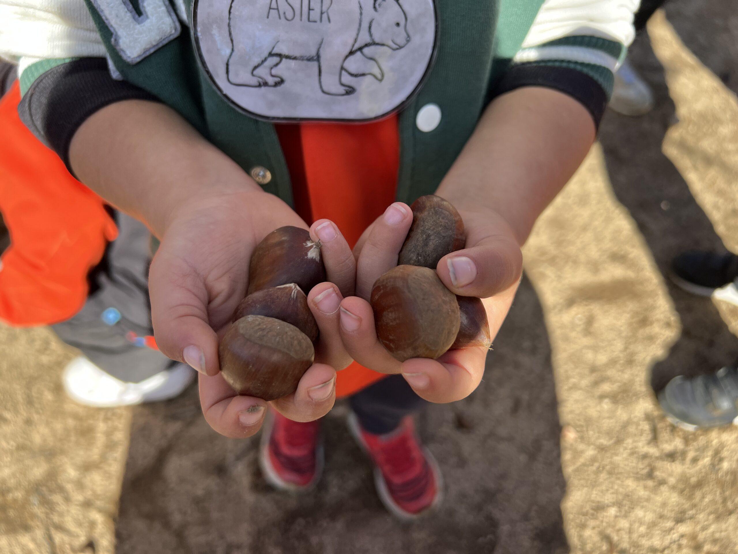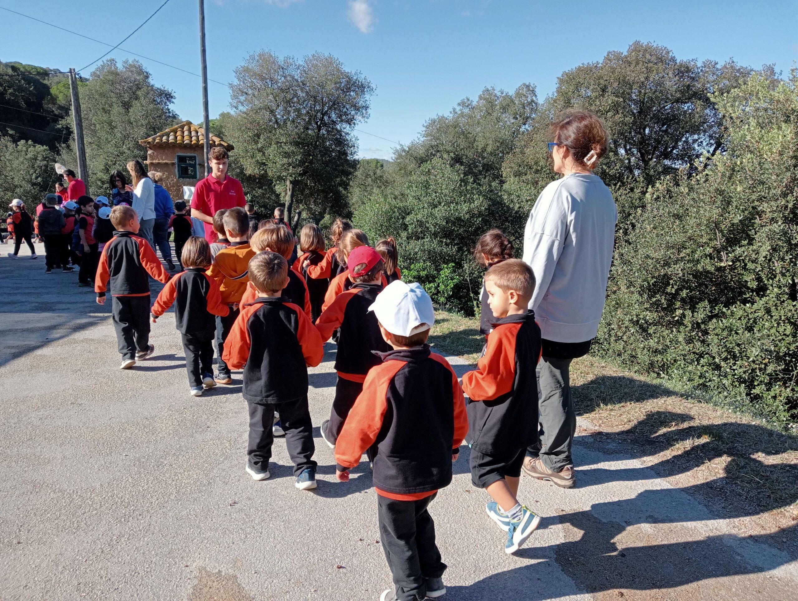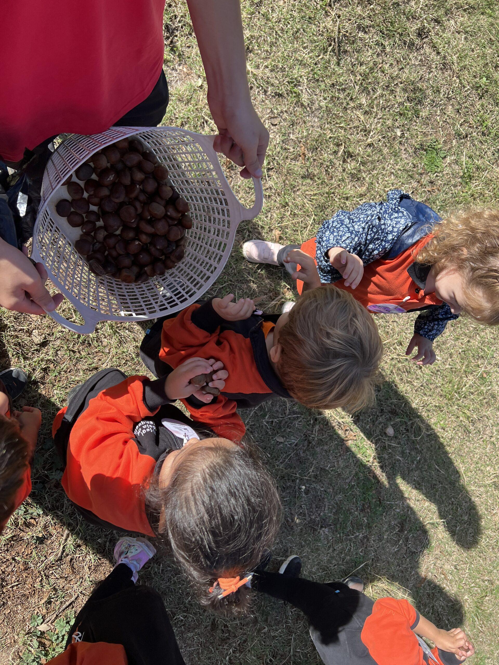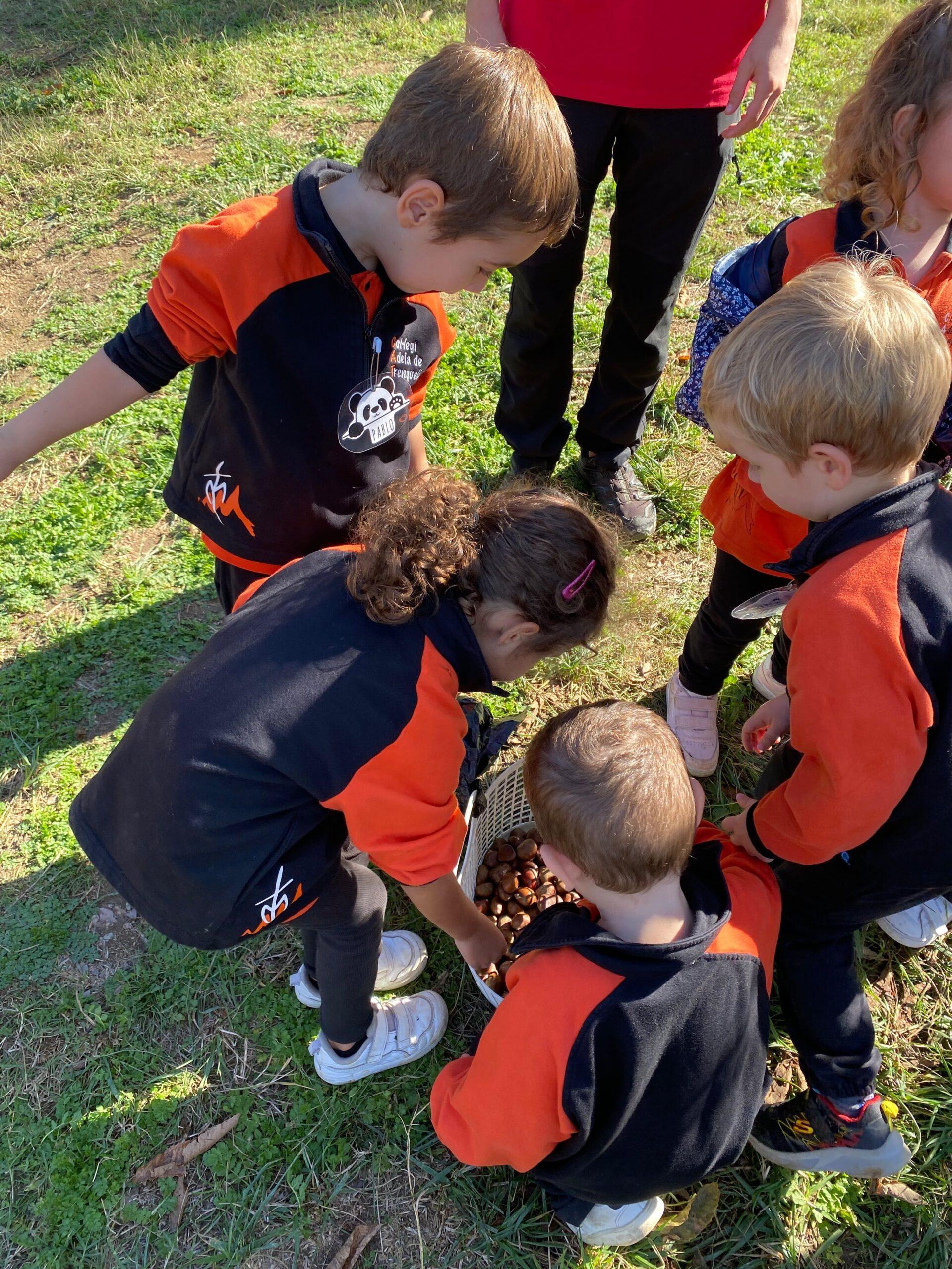 Tot va començar amb un recorregut per la natura dels voltants de la casa, on els monitors i les monitores els van explicar els arbres de tardor. Van poder observar els colors de les fulles, així com anar a un castanyer a collir unes quantes castanyes. Seguidament, després d’una passejada pel bosc, els infants van anar a la casa de la Maria, la castanyera de Can Montcau, i van poder parlar una estona amb ella i torrar aquelles castanyes que havien collit.