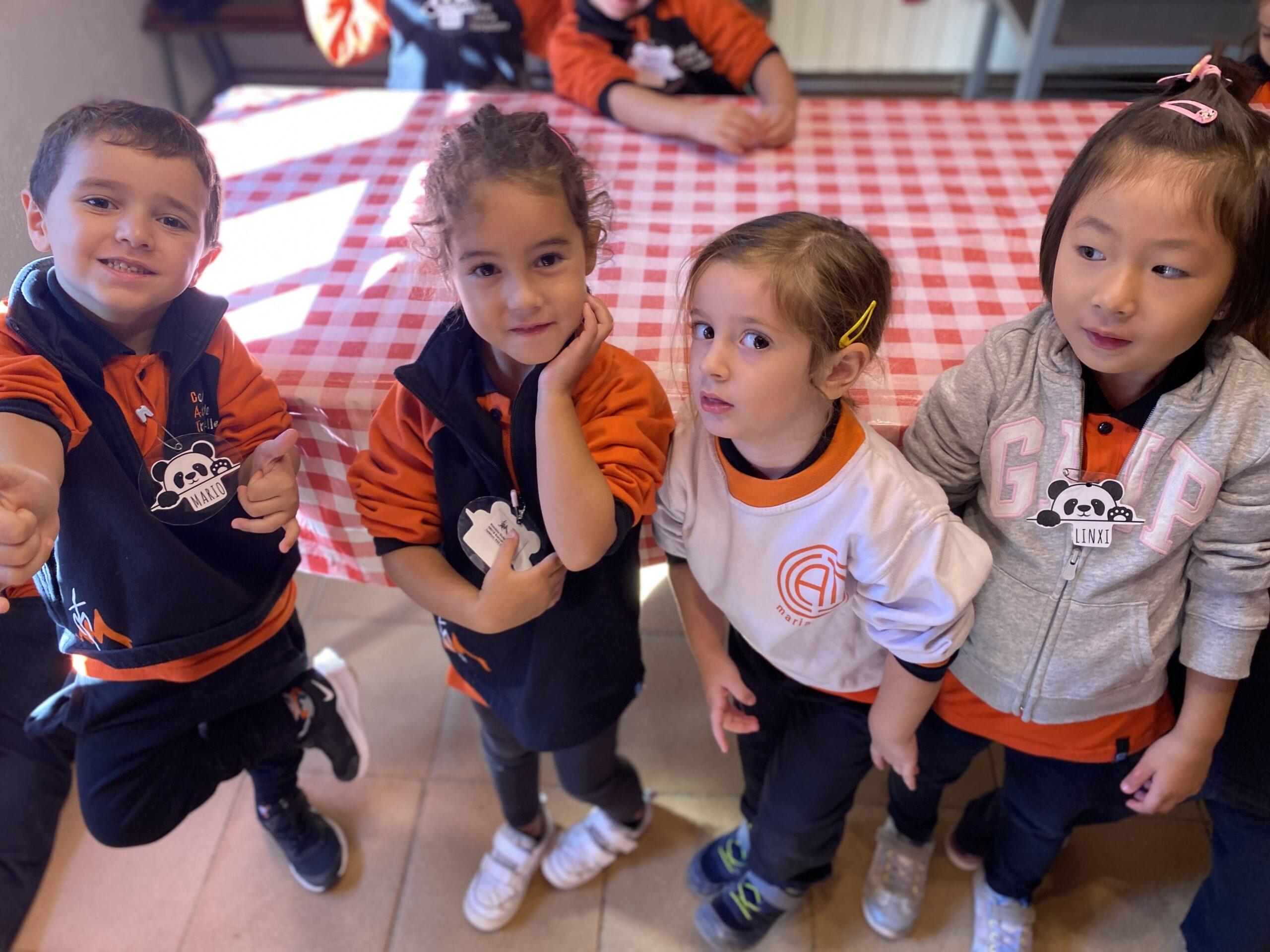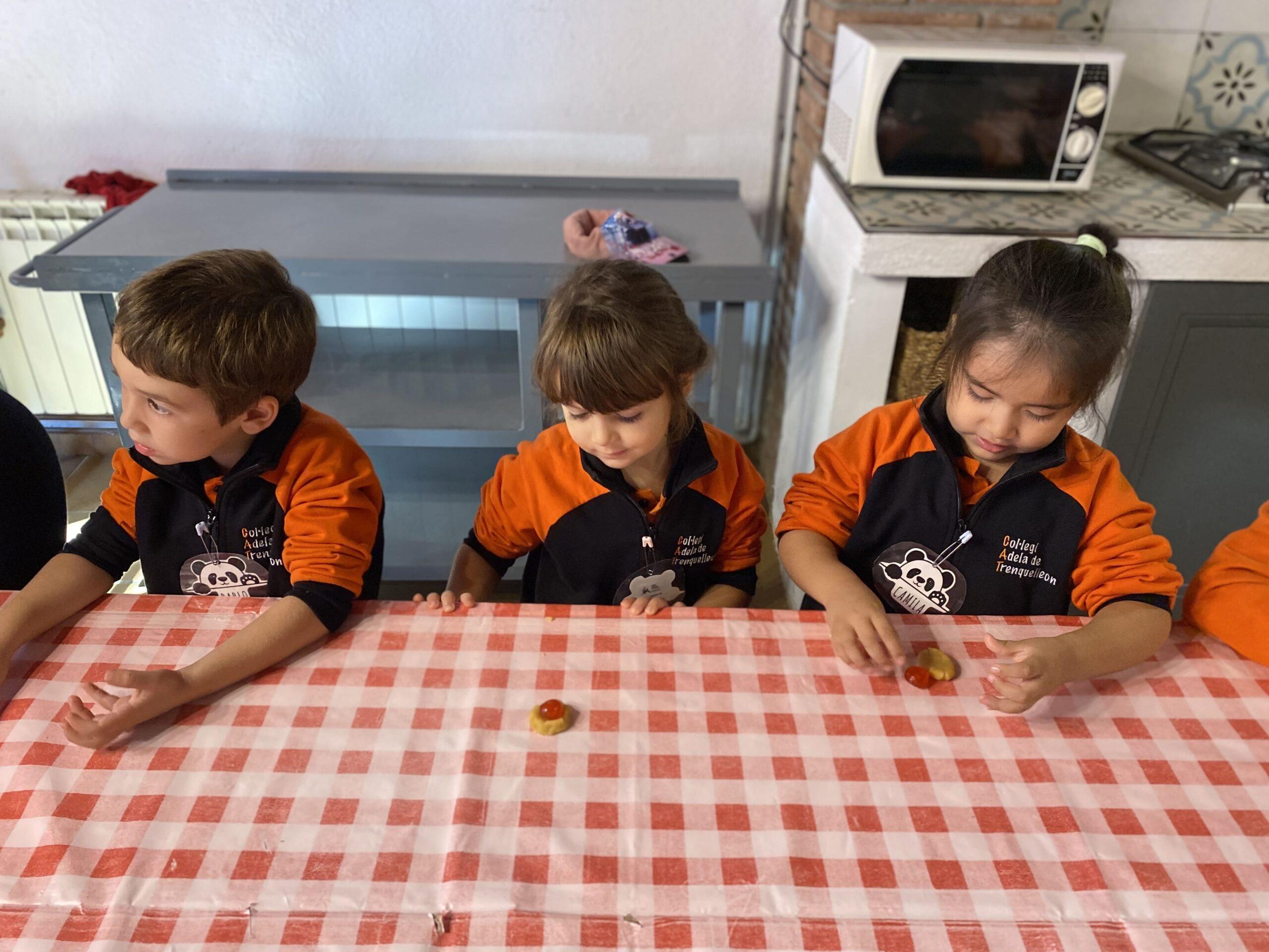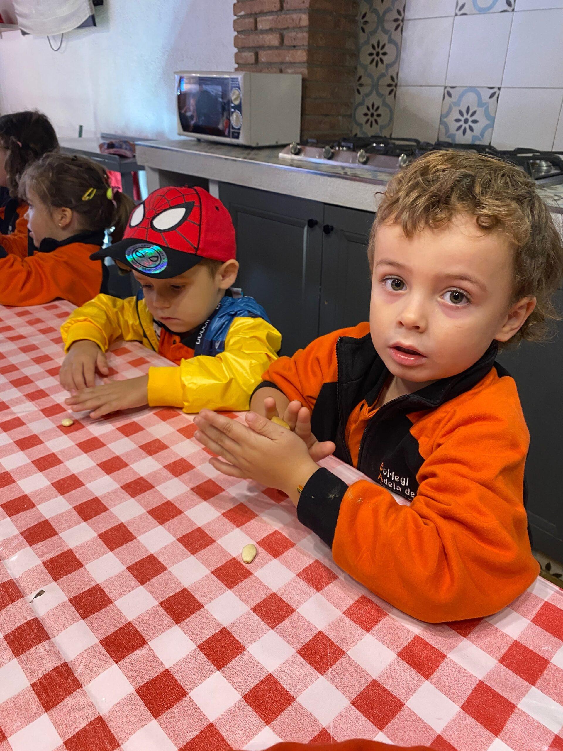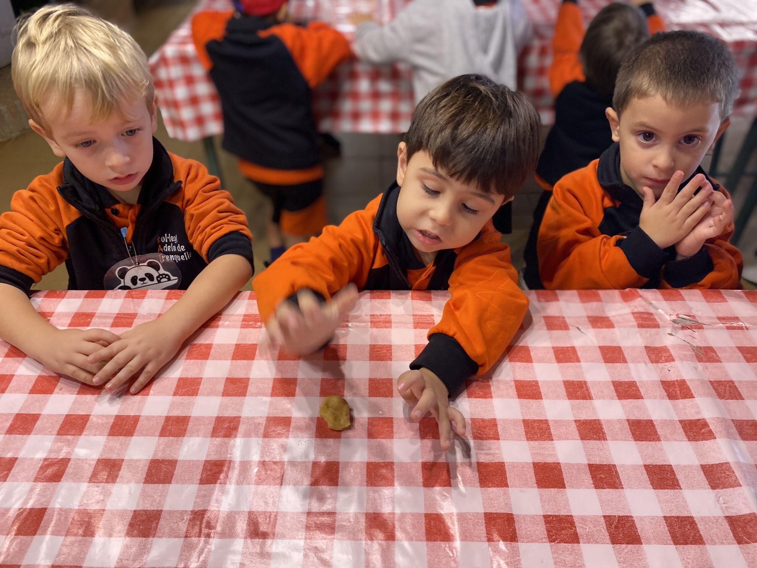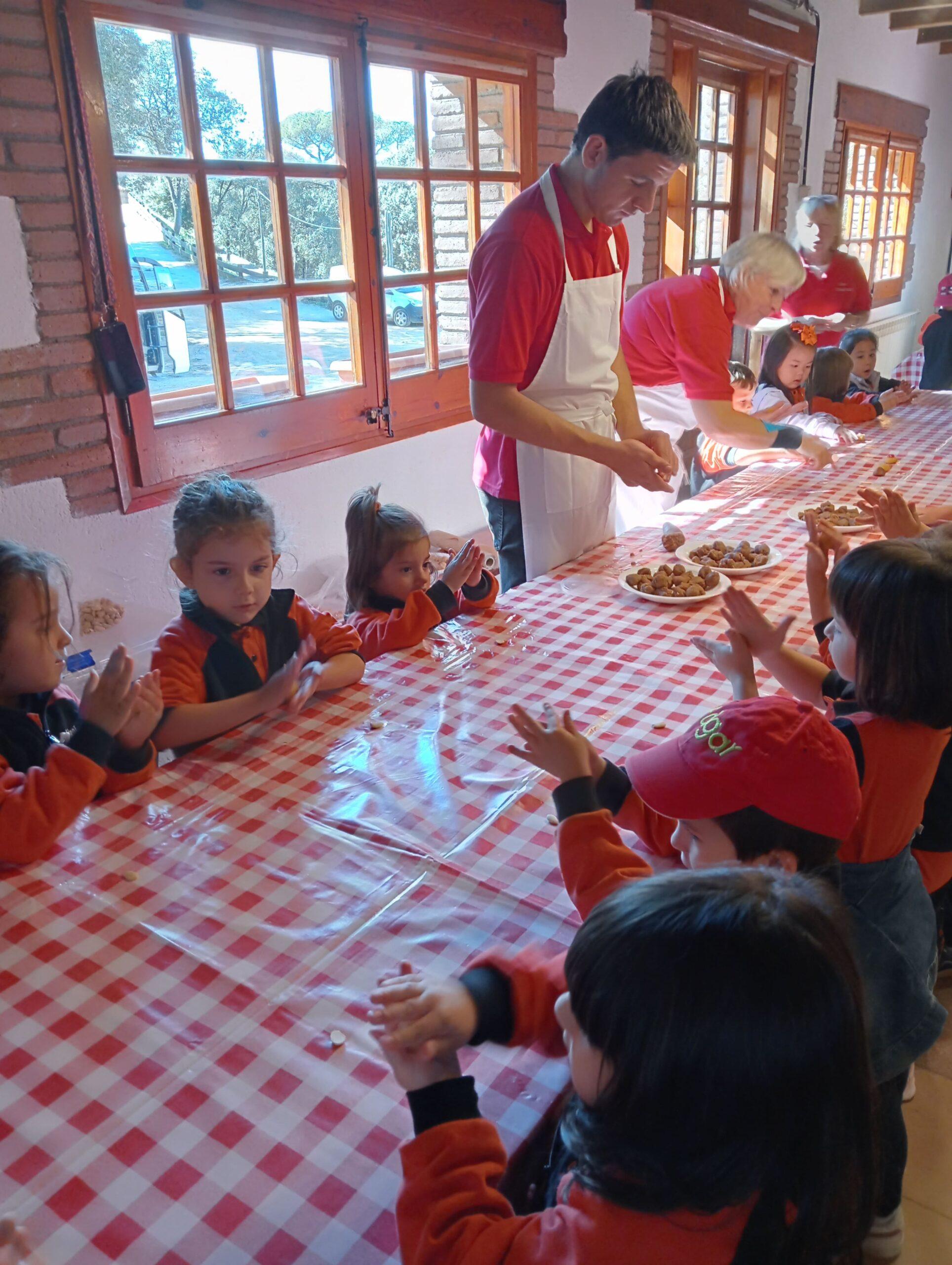 Després, els alumnes van anar a una sala per preparar una de les postres més representatives d’aquesta celebració: els panellets. Van aprendre quins són els ingredients bàsics i essencials per fer-los: ous, sucre i ametlla molta i, posteriorment, van poder fer-ne un d’ametlla, un altre de cirera i l’últim de xocolata. Un cop feta la feina, els i les monitores van posar els panellets a coure al forn de pedra i els infants van anar a dinar.