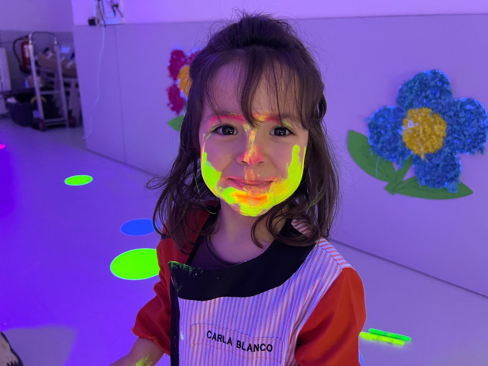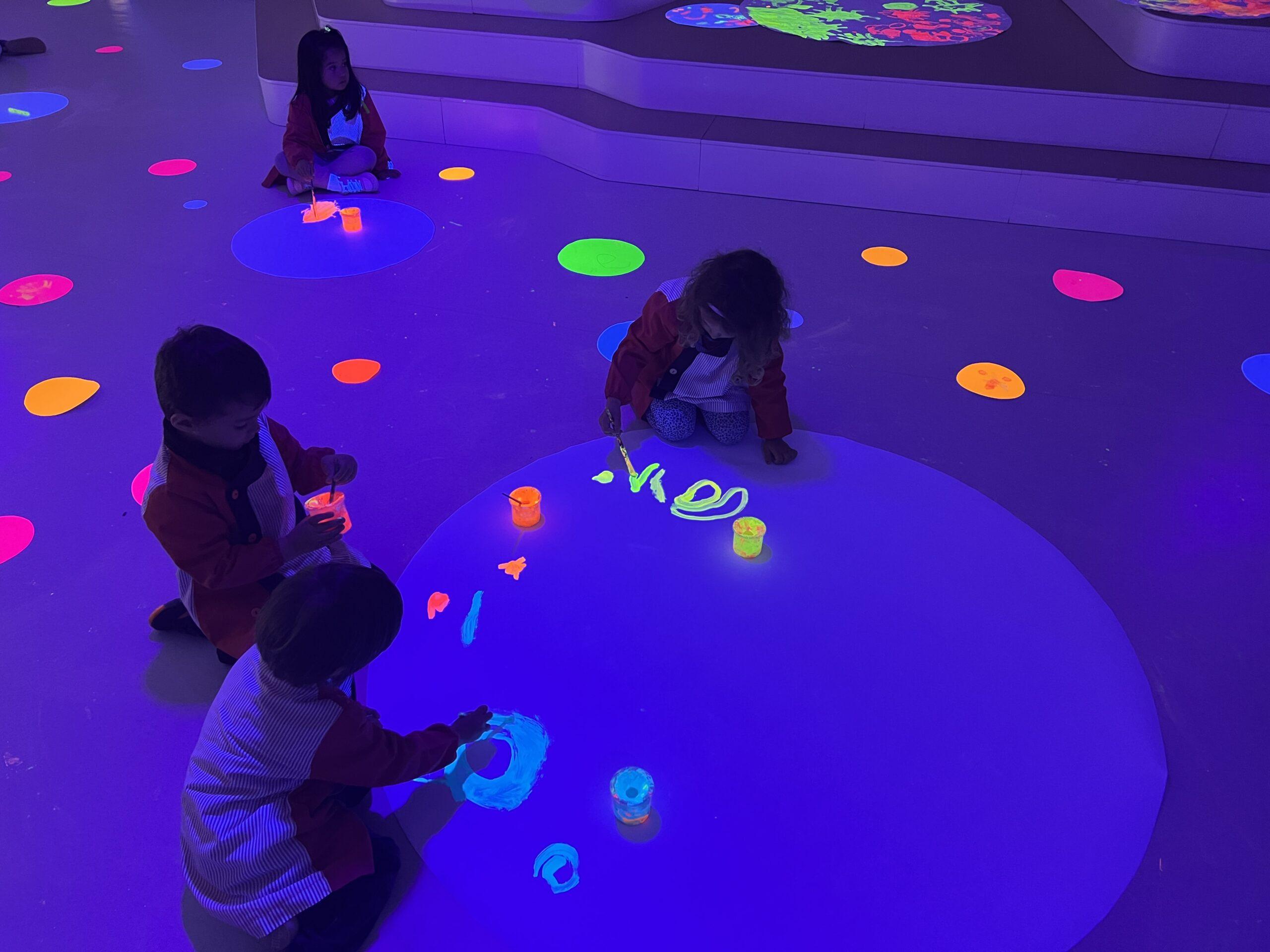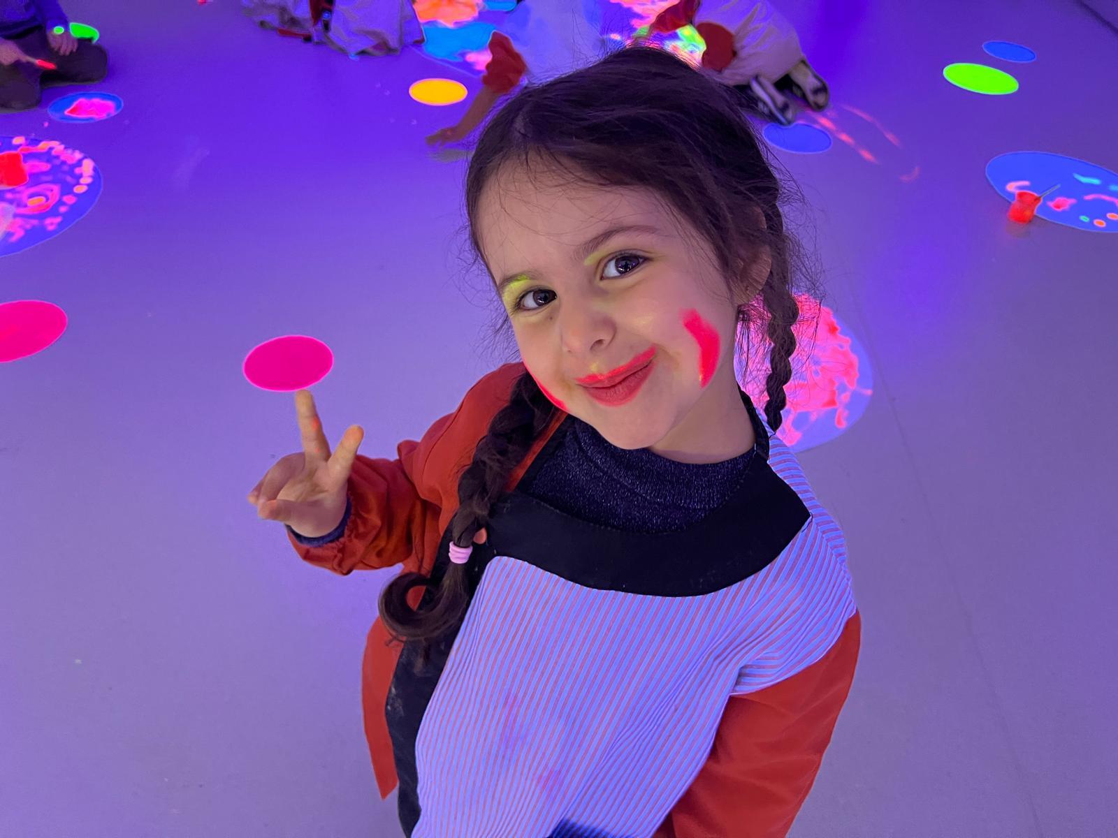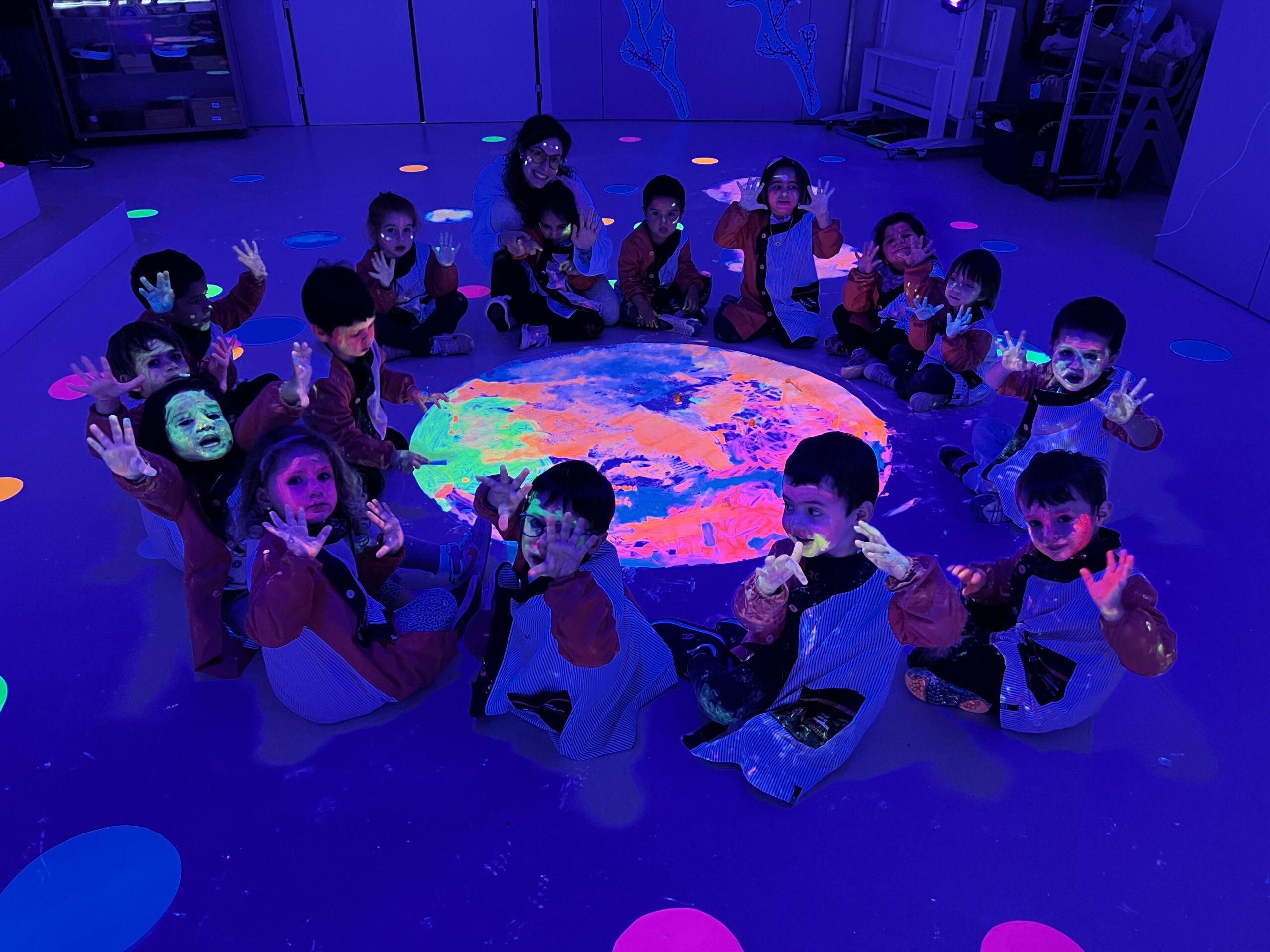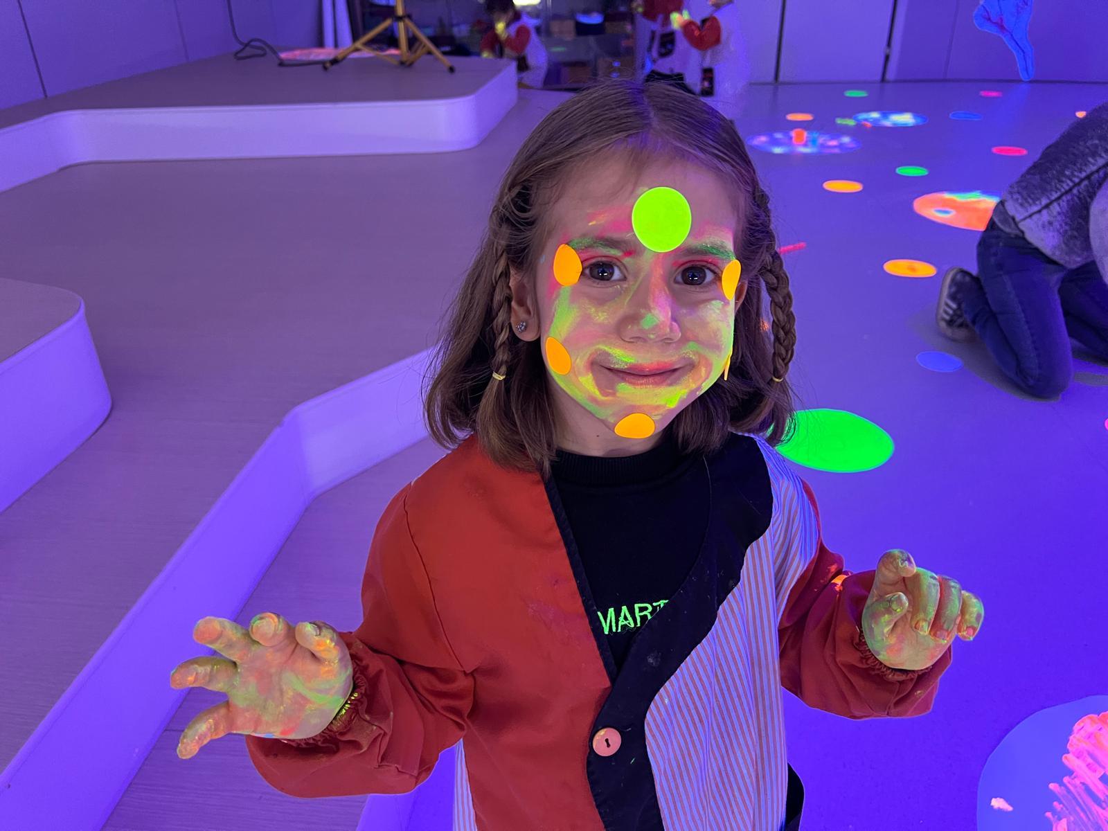 Així doncs, les noies de Koala For Kids van ajudar a profunditzar i continuar treballant la Yayoi. Ens van fer una recreació de l’univers creatiu de l’artista a través de tot l’espai. Mitjançant un focus de llum ultraviolada i cercles de colors, primer de tot, ens van explicar una mica l’obra de la Yayoi i la seva vida. Seguidament, van convidar els nens i les nenes a entrar dins de la instal·lació artística creada. Dins d’aquest espai fluor, els infants van poder pintar, dibuixar i maquillar-se amb pintura fluorescent tot fent cercles tal com feia l’artista. Va ser una experiència molt divertida!