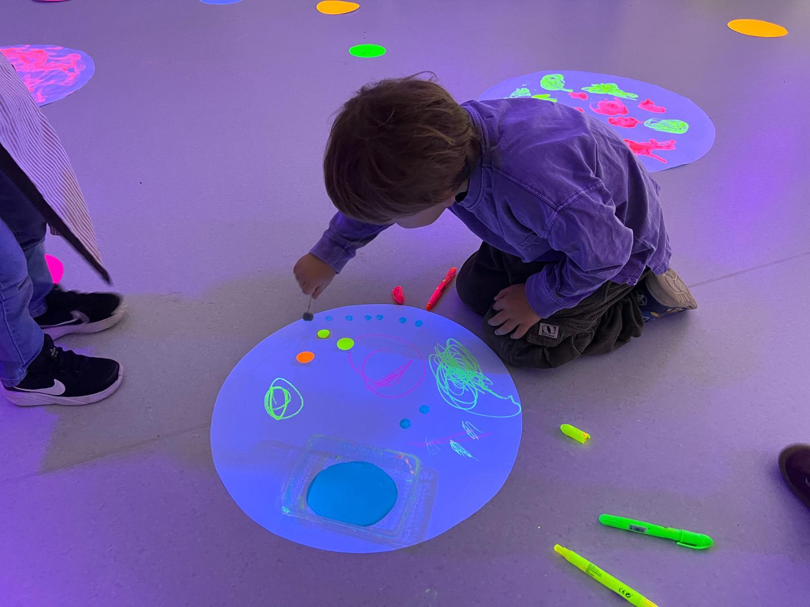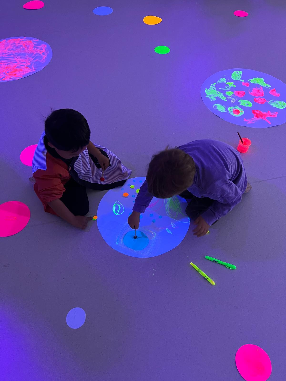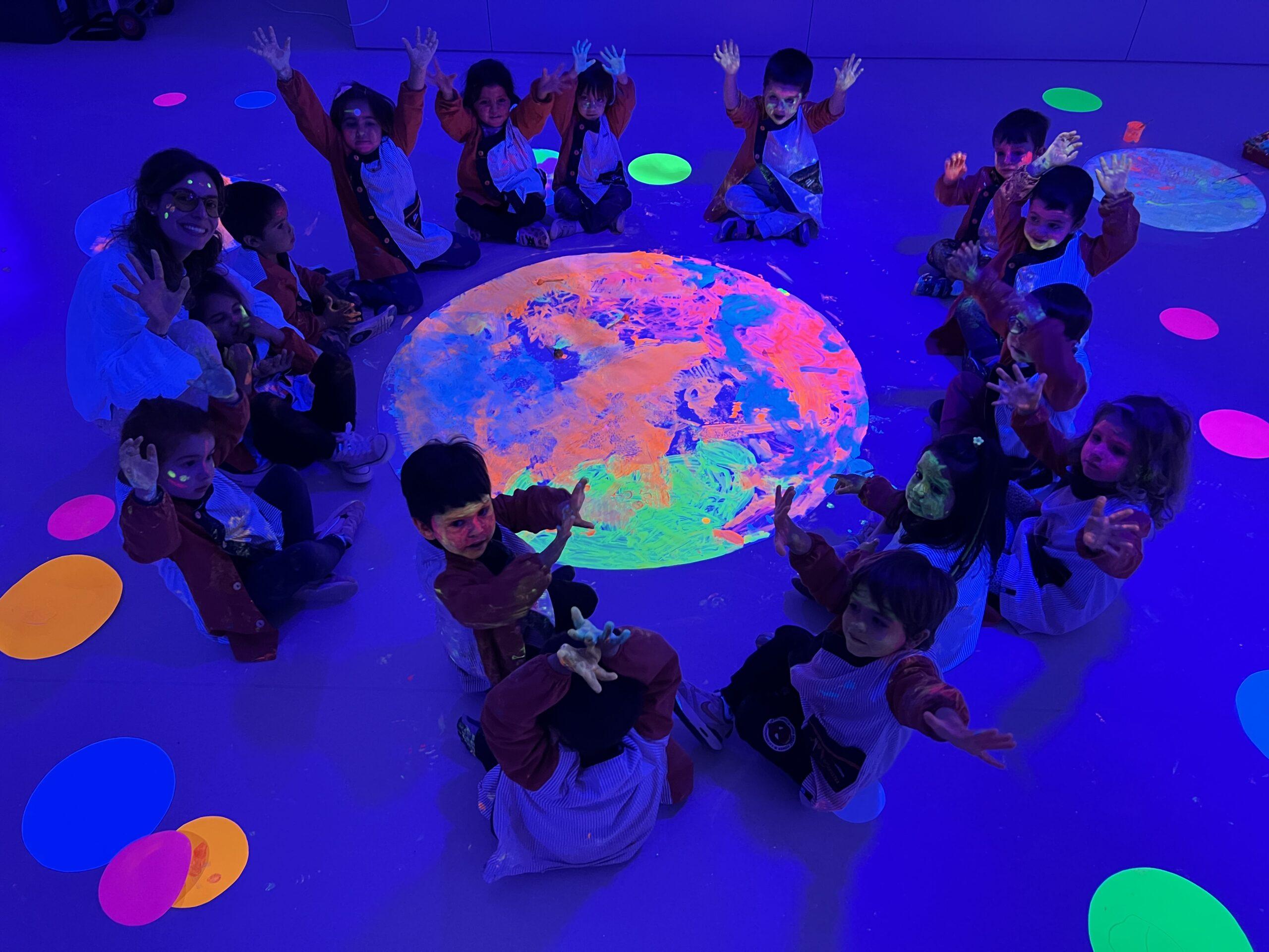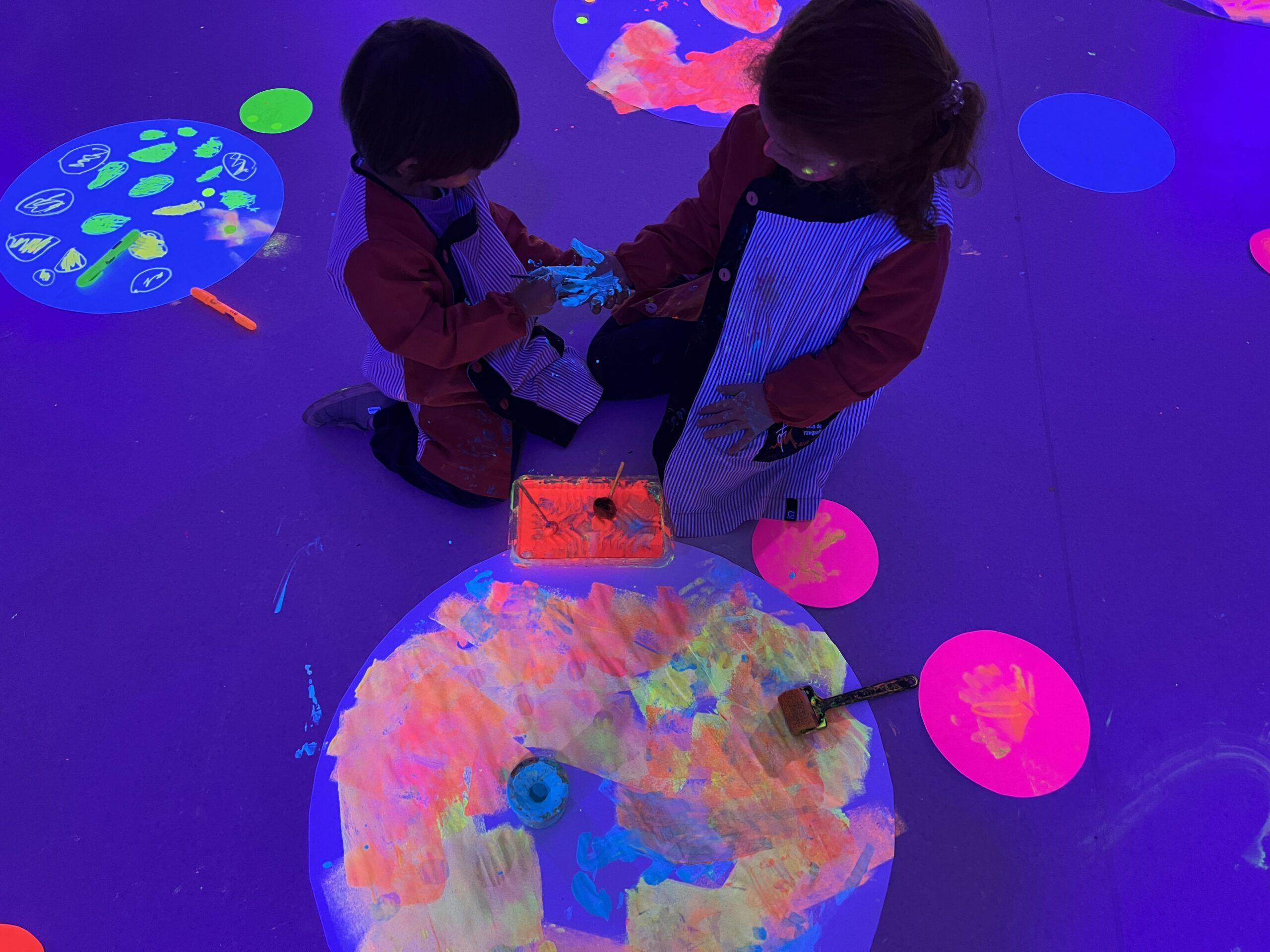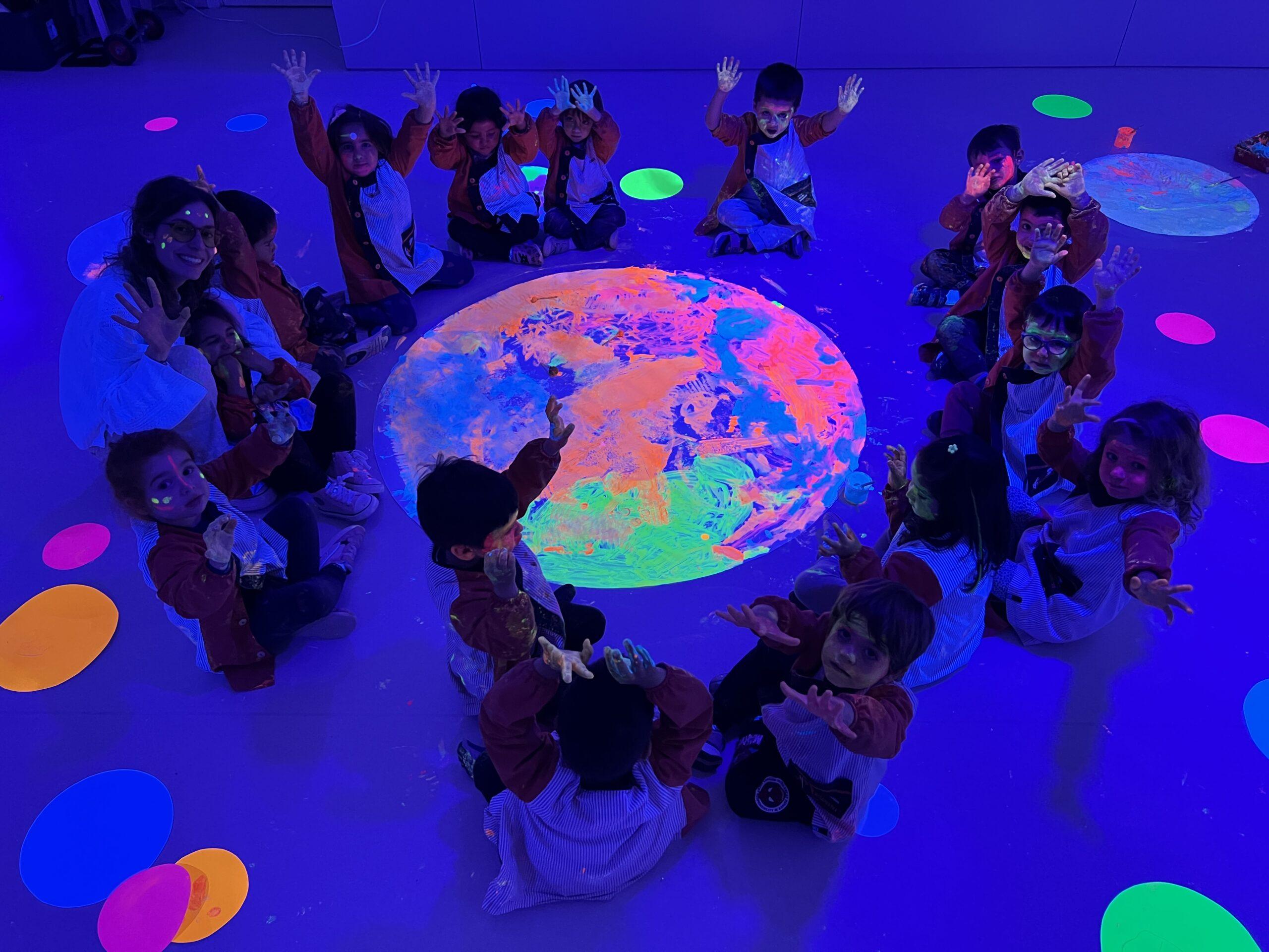 Així doncs, les noies de Koala For Kids van ajudar a profunditzar i continuar treballant la Yayoi. Ens van fer una recreació de l’univers creatiu de l’artista a través de tot l’espai. Mitjançant un focus de llum ultraviolada i cercles de colors, primer de tot, ens van explicar una mica l’obra de la Yayoi i la seva vida. Seguidament, van convidar els nens i les nenes a entrar dins de la instal·lació artística creada. Dins d’aquest espai fluor, els infants van poder pintar, dibuixar i maquillar-se amb pintura fluorescent tot fent cercles tal com feia l’artista. Va ser una experiència molt divertida!