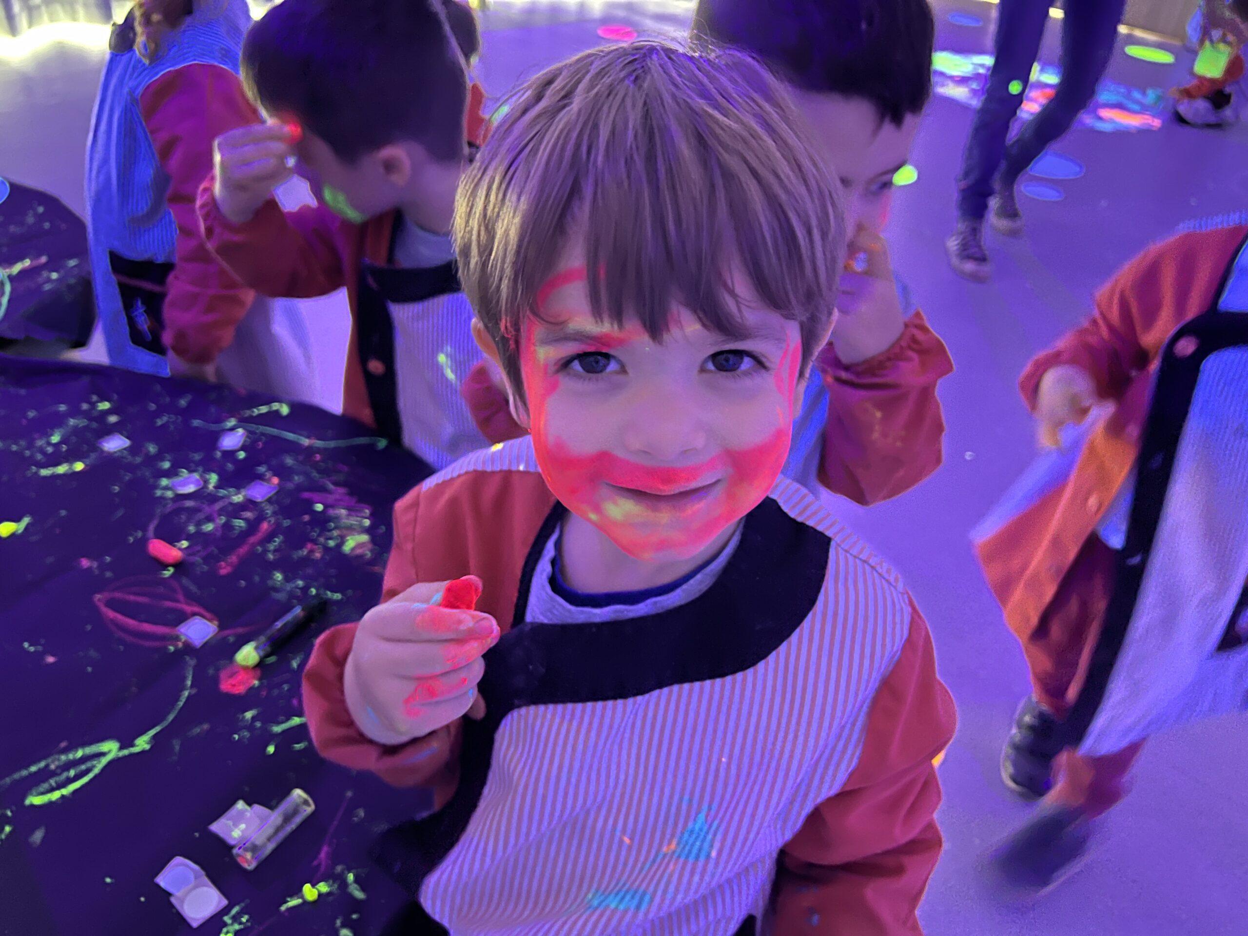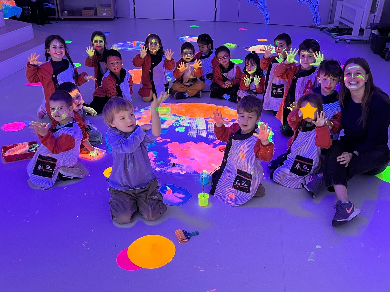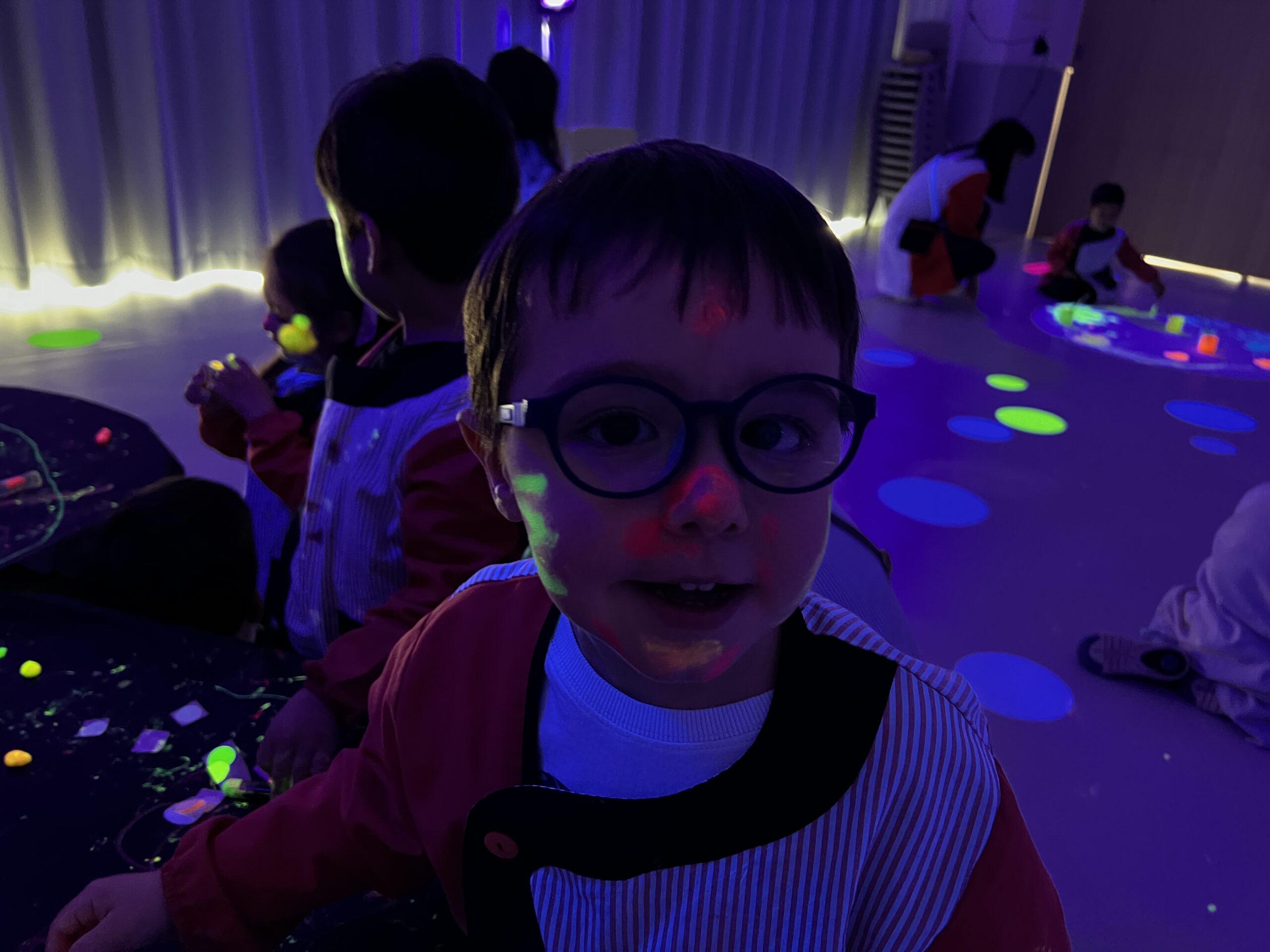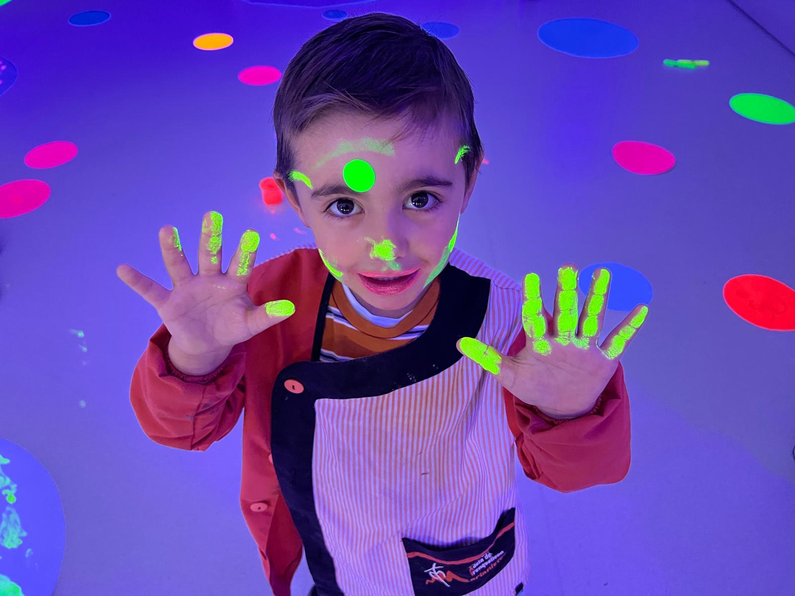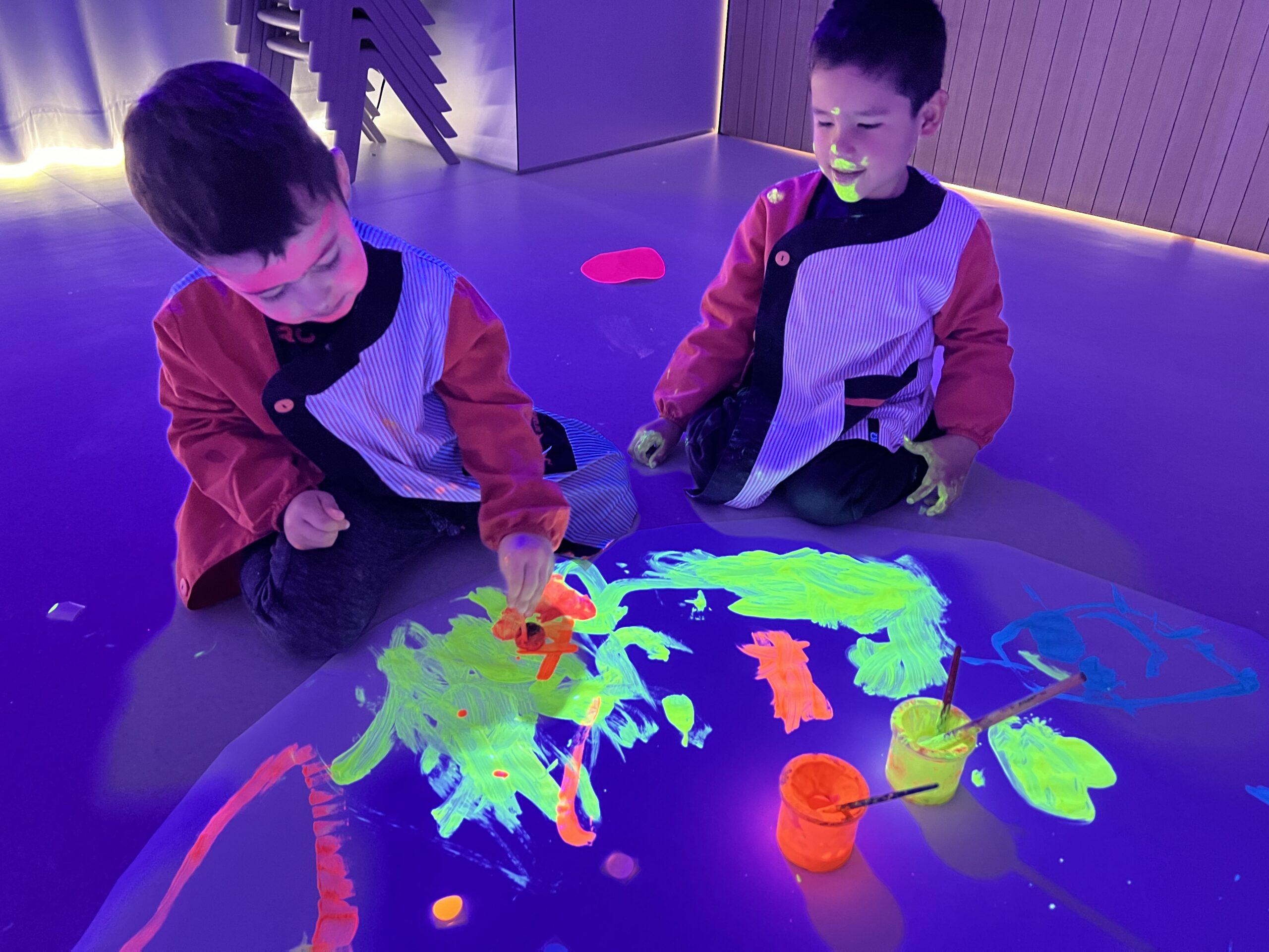 Així doncs, les noies de Koala For Kids van ajudar a profunditzar i continuar treballant la Yayoi. Ens van fer una recreació de l’univers creatiu de l’artista a través de tot l’espai. Mitjançant un focus de llum ultraviolada i cercles de colors, primer de tot, ens van explicar una mica l’obra de la Yayoi i la seva vida. Seguidament, van convidar els nens i les nenes a entrar dins de la instal·lació artística creada. Dins d’aquest espai fluor, els infants van poder pintar, dibuixar i maquillar-se amb pintura fluorescent tot fent cercles tal com feia l’artista. Va ser una experiència molt divertida!