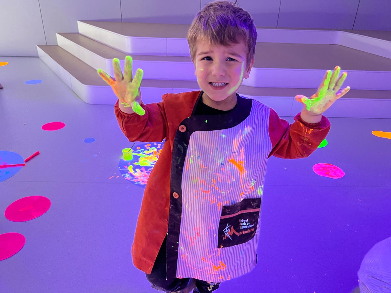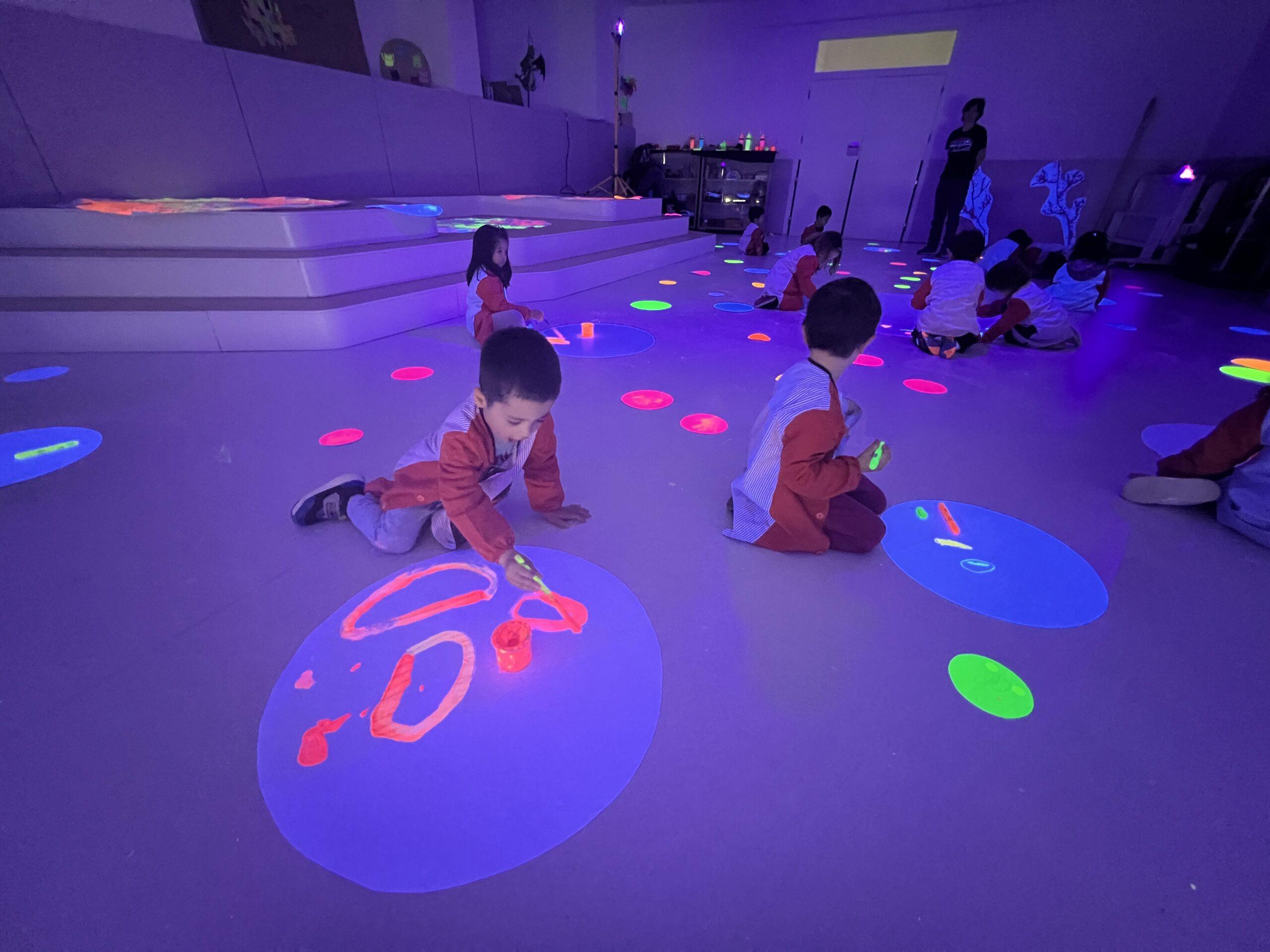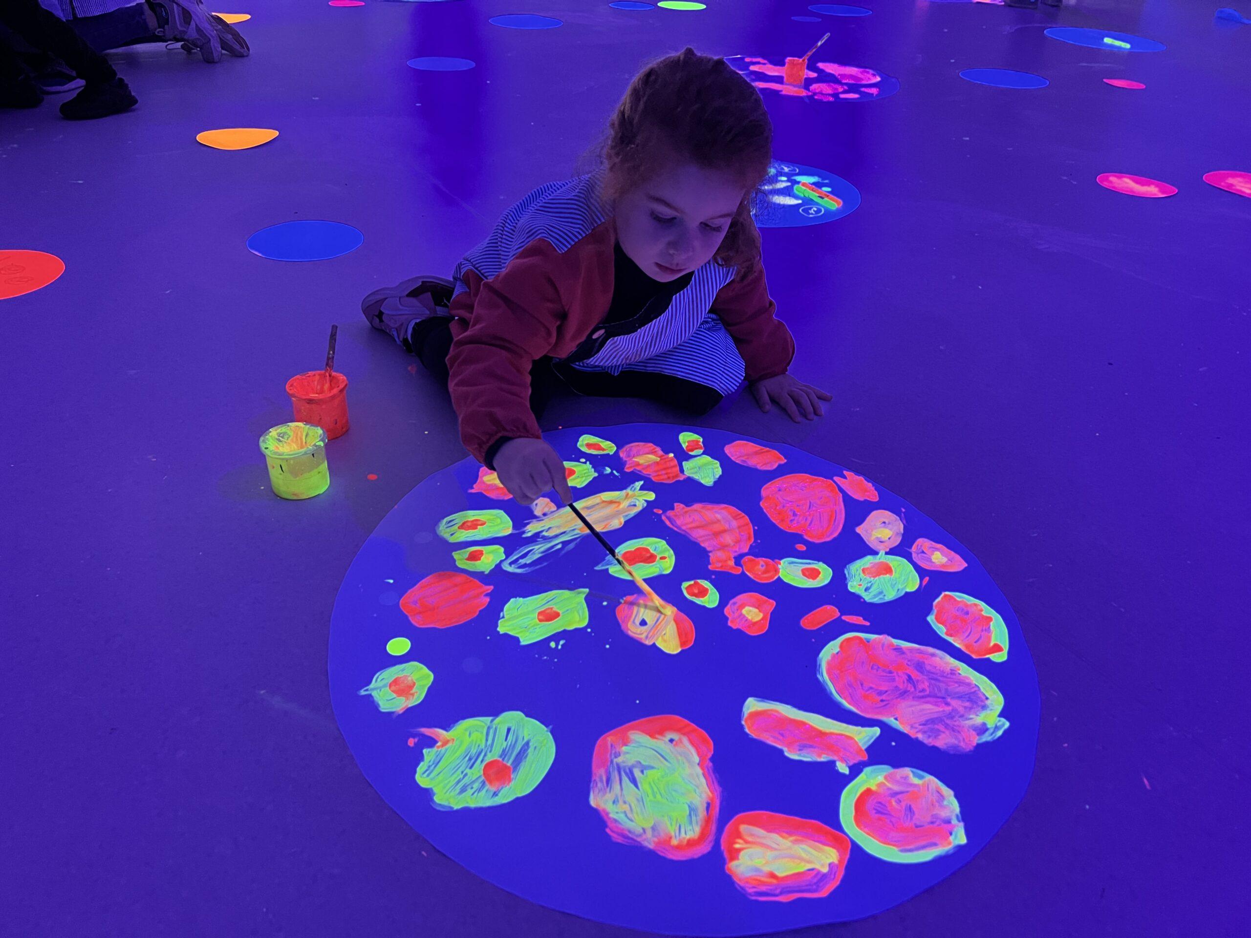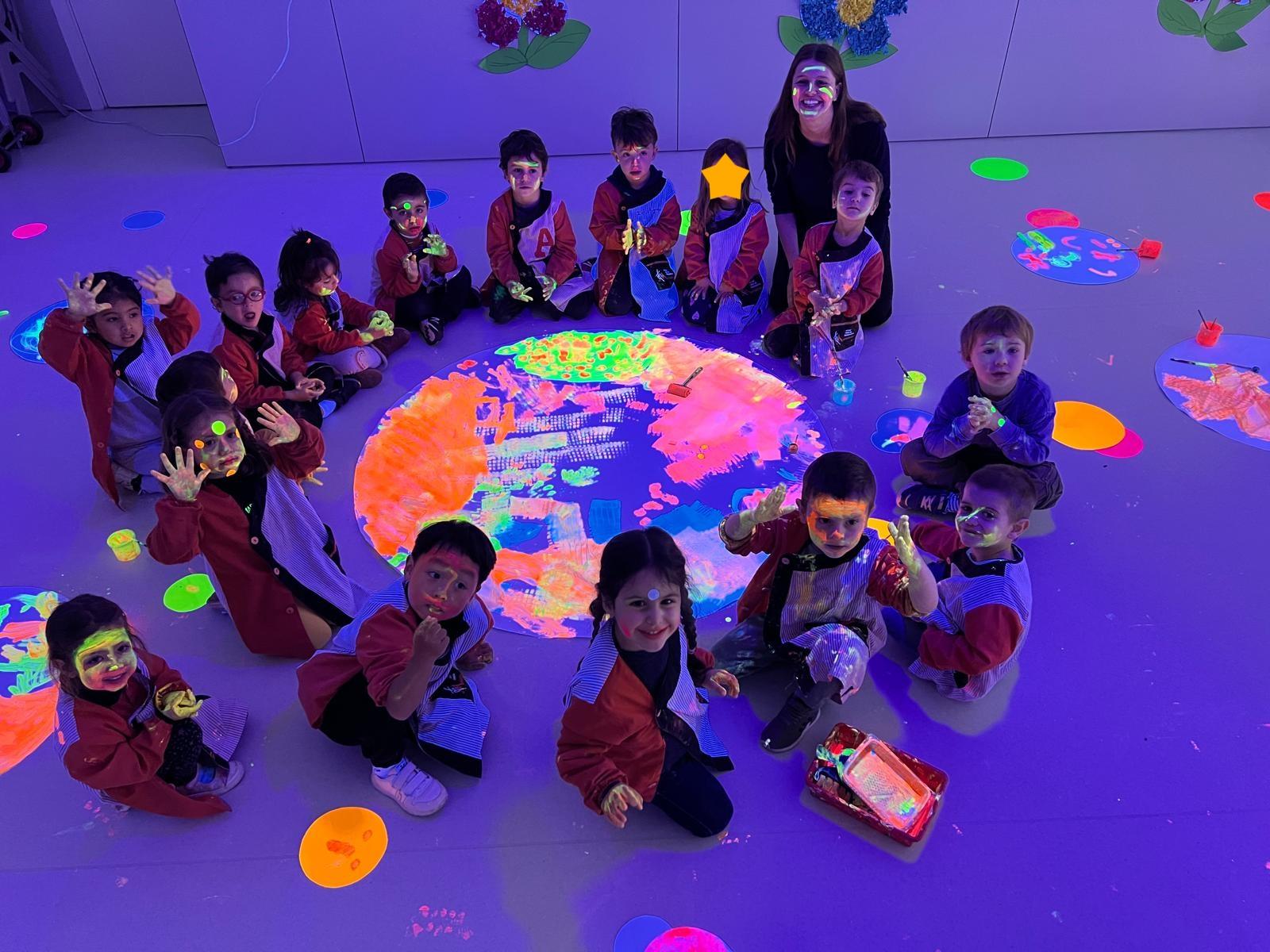 Així doncs, les noies de Koala For Kids van ajudar a profunditzar i continuar treballant la Yayoi. Ens van fer una recreació de l’univers creatiu de l’artista a través de tot l’espai. Mitjançant un focus de llum ultraviolada i cercles de colors, primer de tot, ens van explicar una mica l’obra de la Yayoi i la seva vida. Seguidament, van convidar els nens i les nenes a entrar dins de la instal·lació artística creada. Dins d’aquest espai fluor, els infants van poder pintar, dibuixar i maquillar-se amb pintura fluorescent tot fent cercles tal com feia l’artista. Va ser una experiència molt divertida!