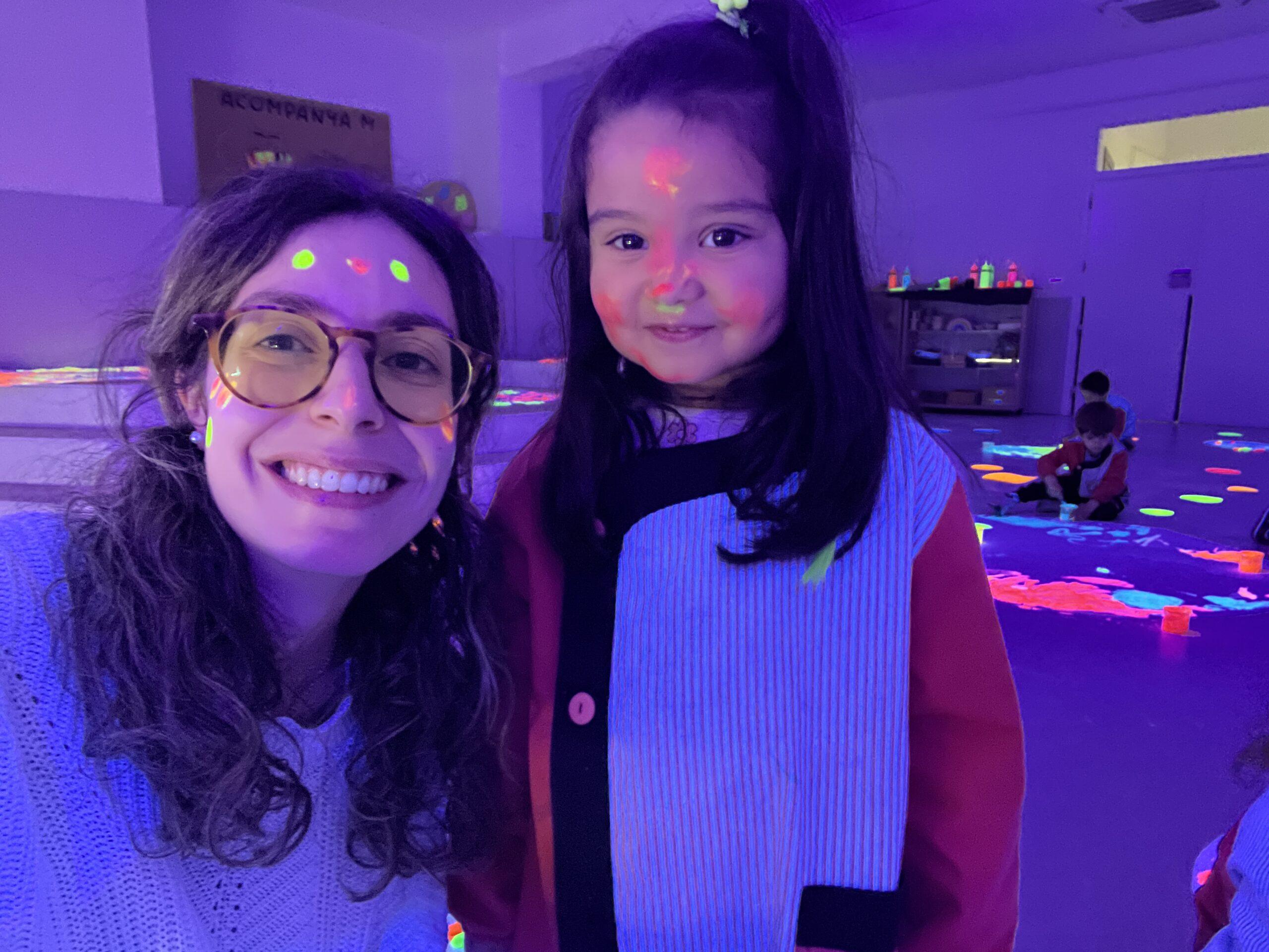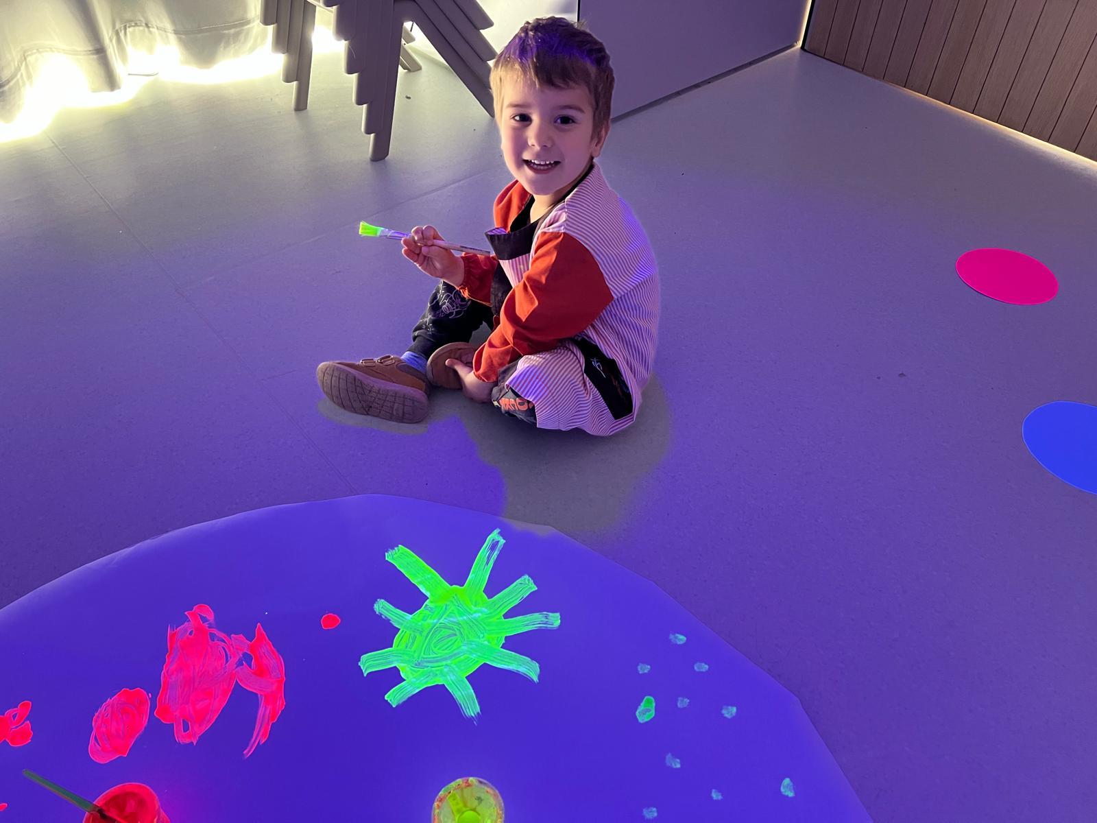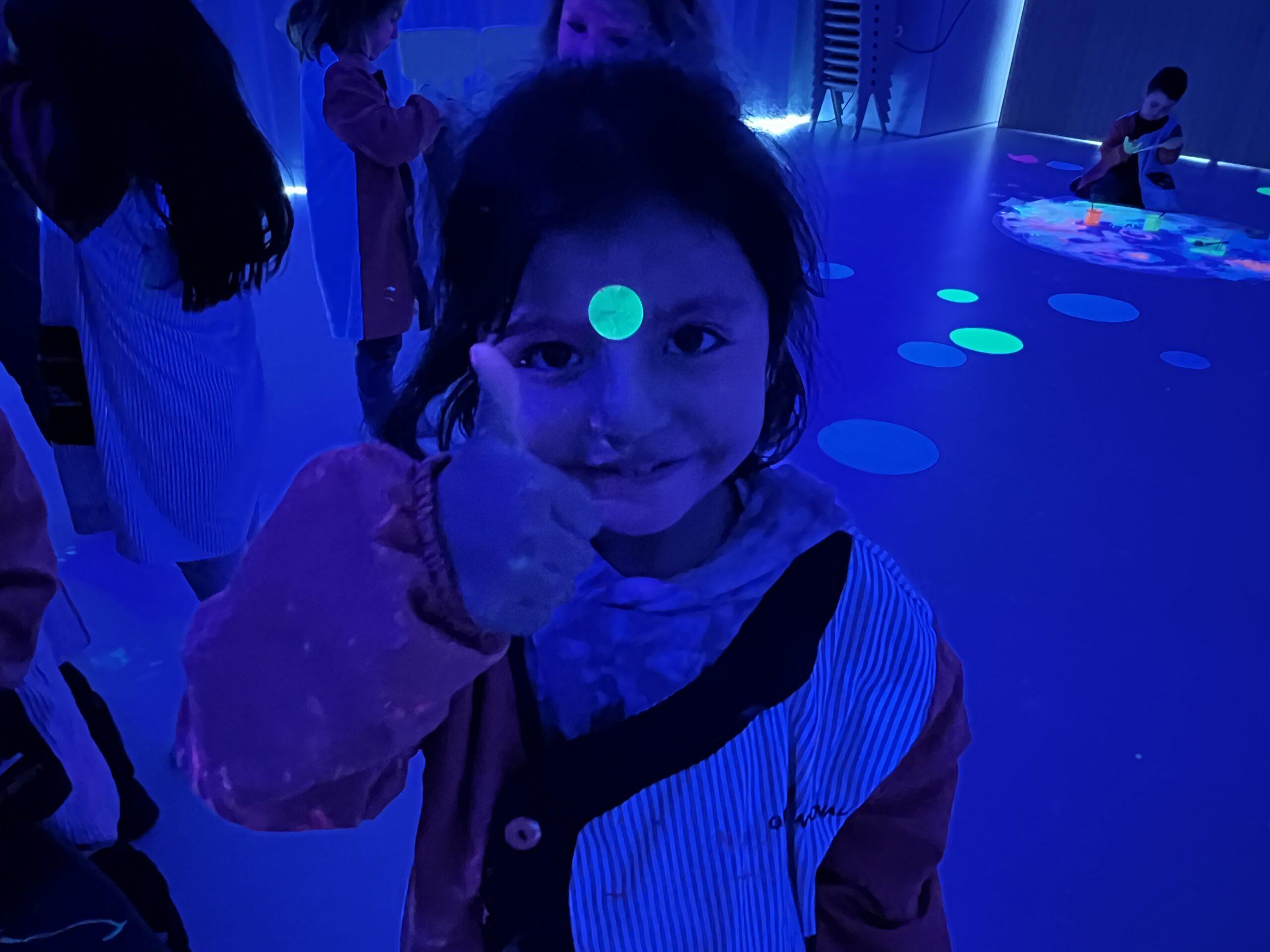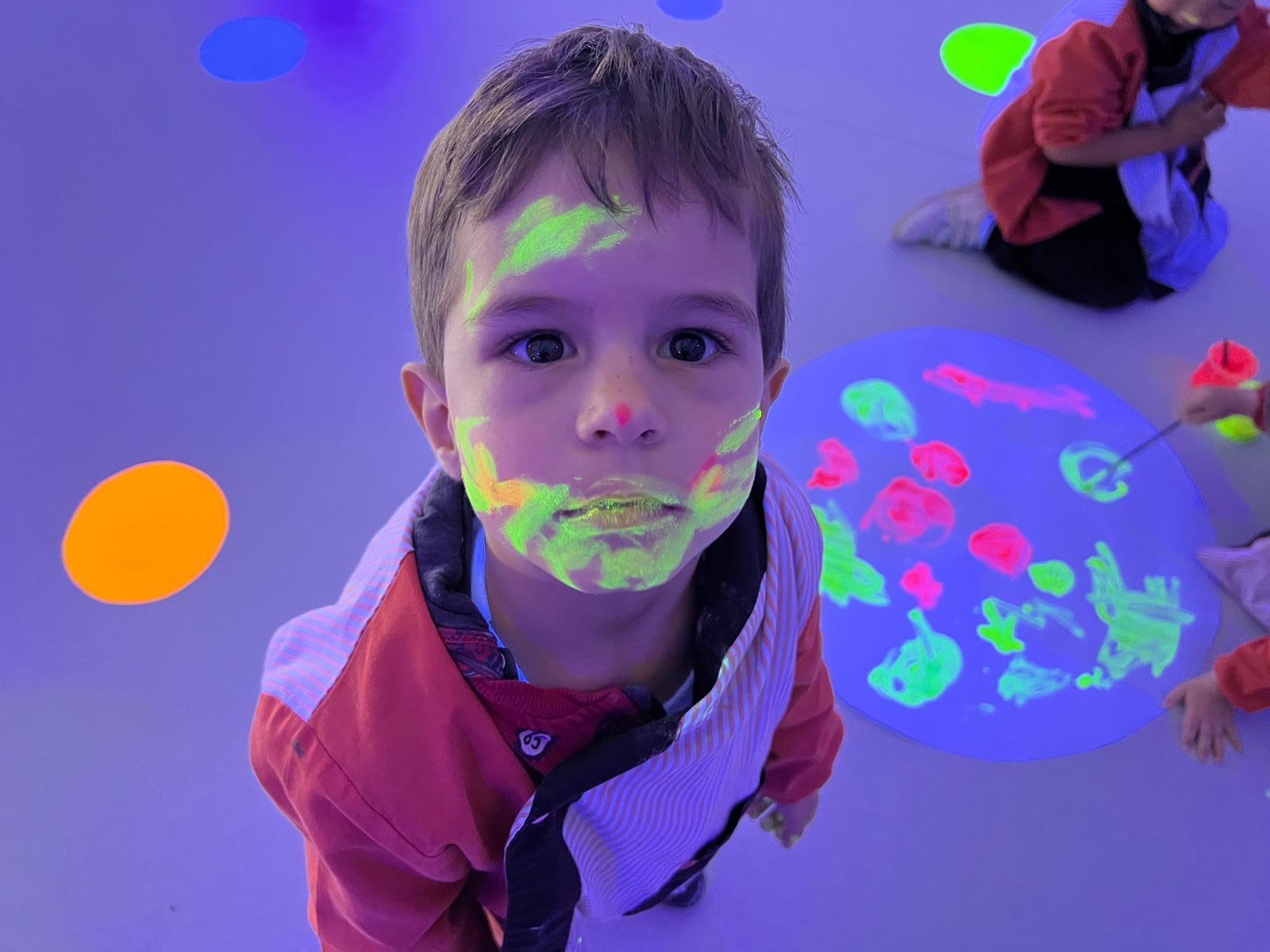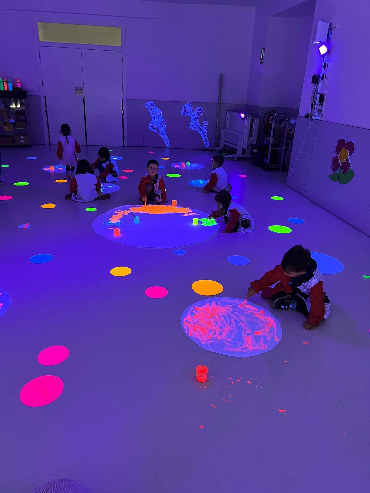 Així doncs, les noies de Koala For Kids van ajudar a profunditzar i continuar treballant la Yayoi. Ens van fer una recreació de l’univers creatiu de l’artista a través de tot l’espai. Mitjançant un focus de llum ultraviolada i cercles de colors, primer de tot, ens van explicar una mica l’obra de la Yayoi i la seva vida. Seguidament, van convidar els nens i les nenes a entrar dins de la instal·lació artística creada. Dins d’aquest espai fluor, els infants van poder pintar, dibuixar i maquillar-se amb pintura fluorescent tot fent cercles tal com feia l’artista. Va ser una experiència molt divertida!