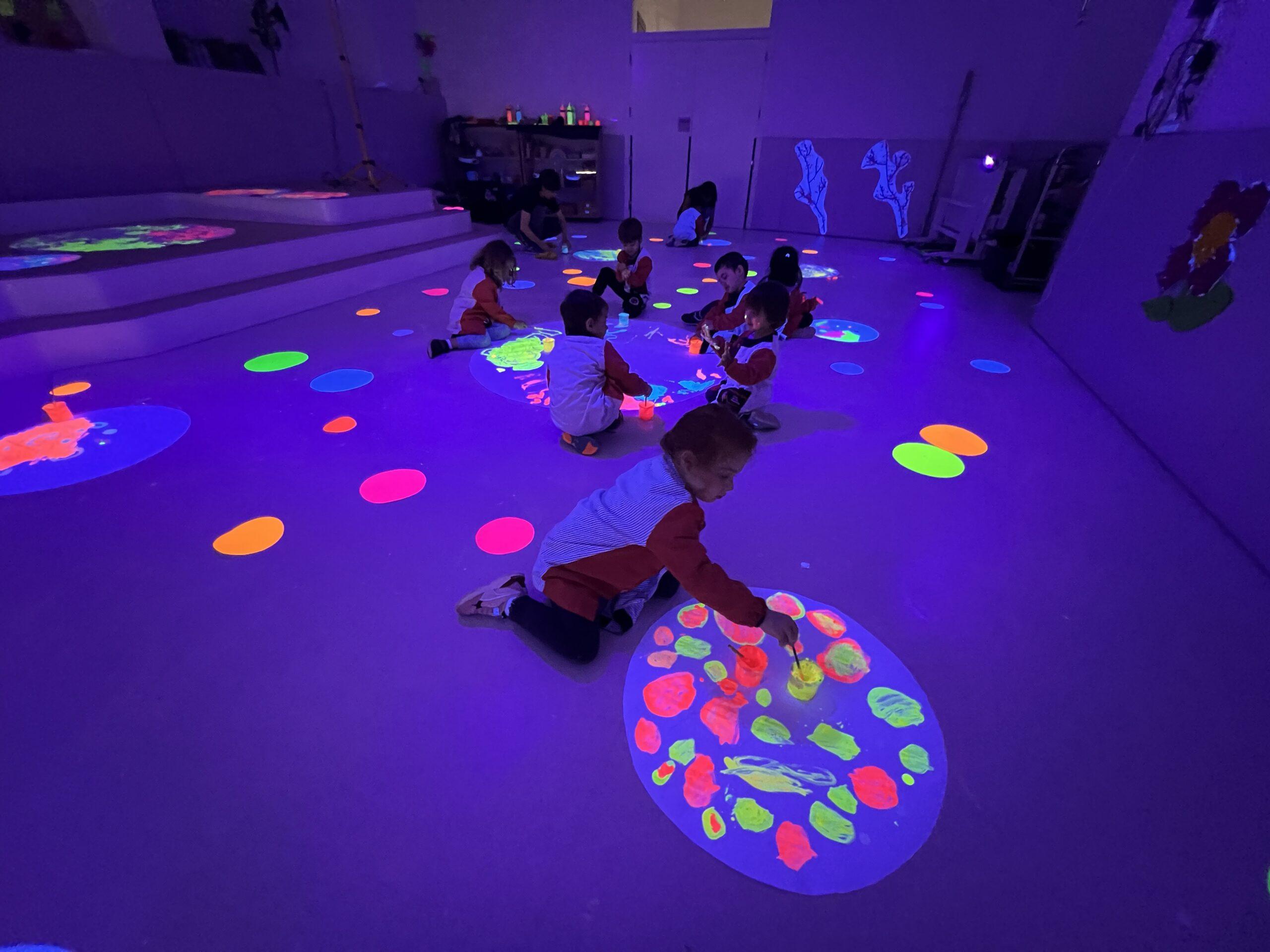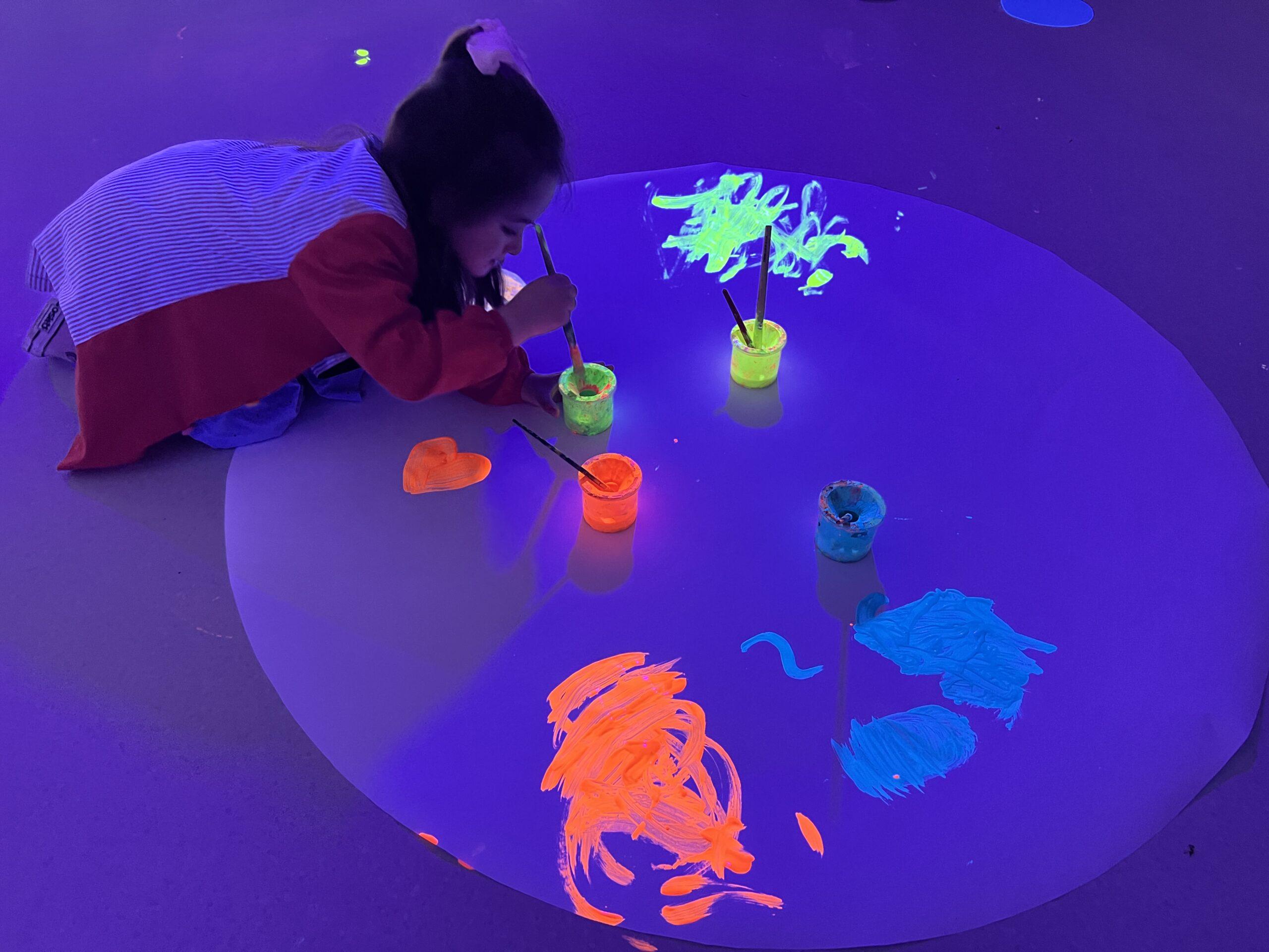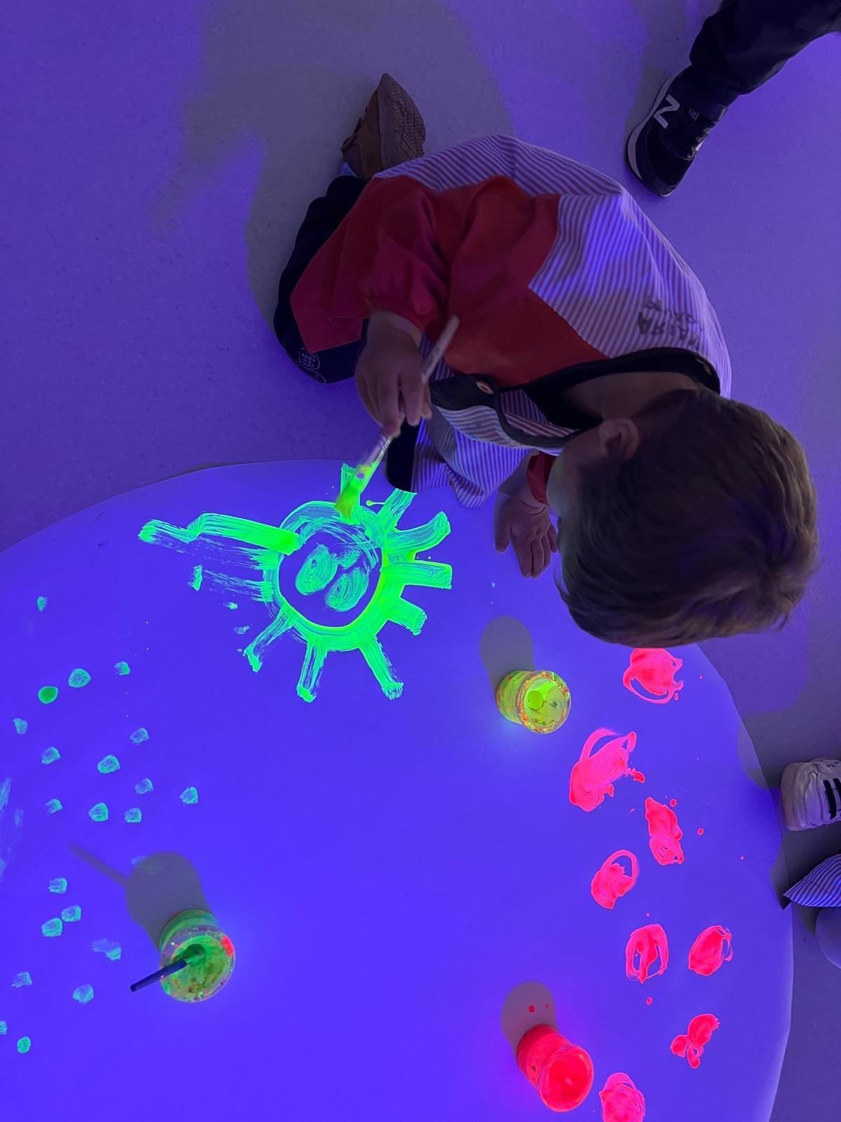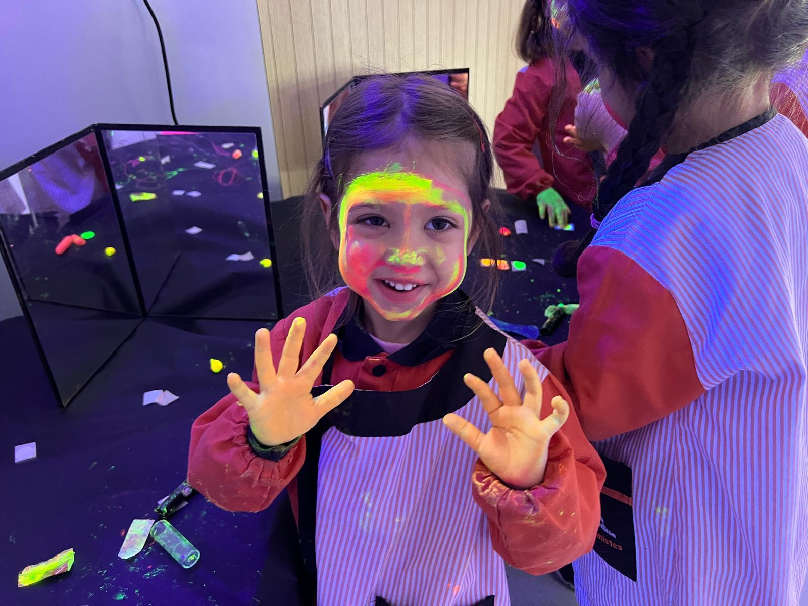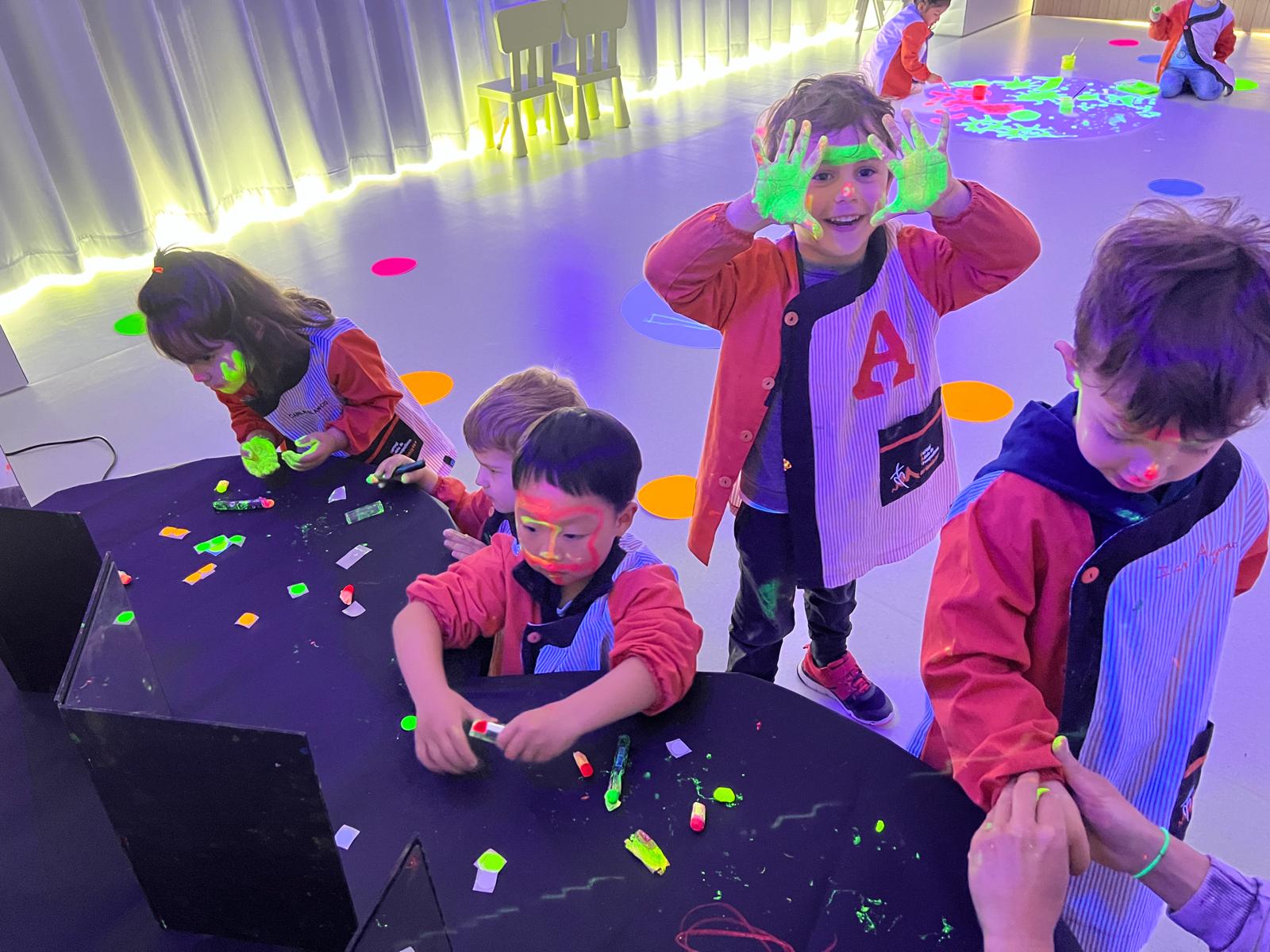 Així doncs, les noies de Koala For Kids van ajudar a profunditzar i continuar treballant la Yayoi. Ens van fer una recreació de l’univers creatiu de l’artista a través de tot l’espai. Mitjançant un focus de llum ultraviolada i cercles de colors, primer de tot, ens van explicar una mica l’obra de la Yayoi i la seva vida. Seguidament, van convidar els nens i les nenes a entrar dins de la instal·lació artística creada. Dins d’aquest espai fluor, els infants van poder pintar, dibuixar i maquillar-se amb pintura fluorescent tot fent cercles tal com feia l’artista. Va ser una experiència molt divertida!