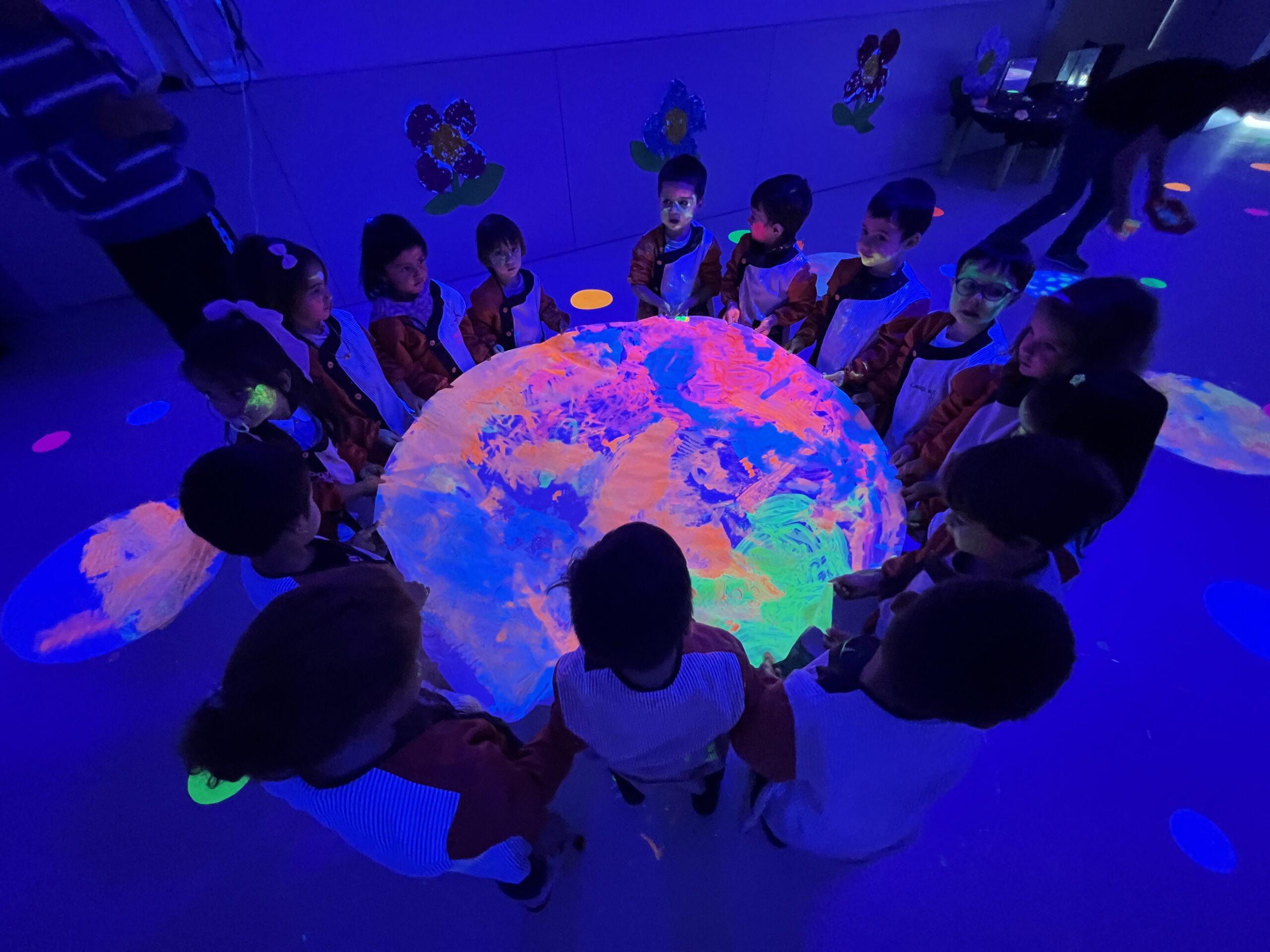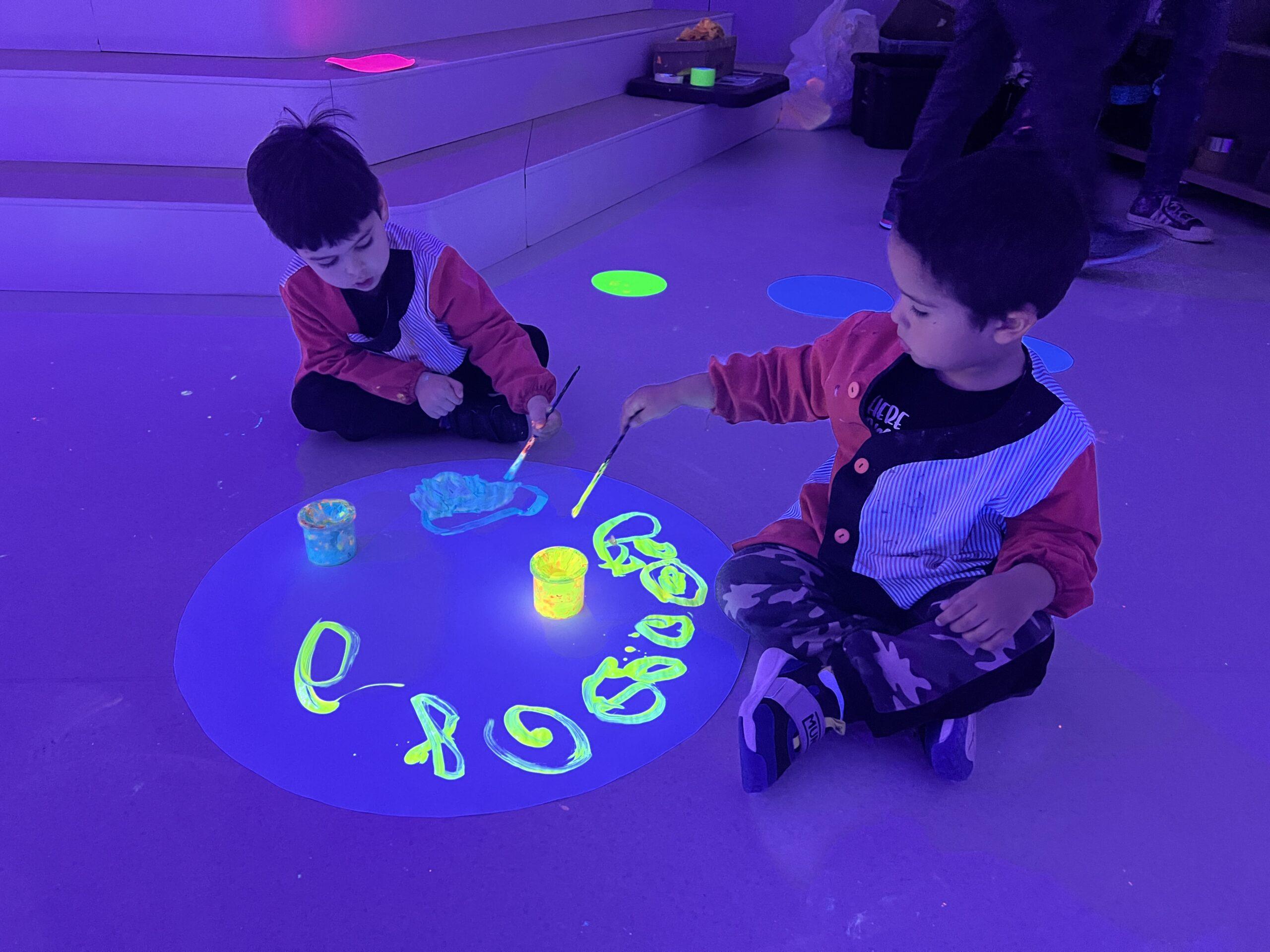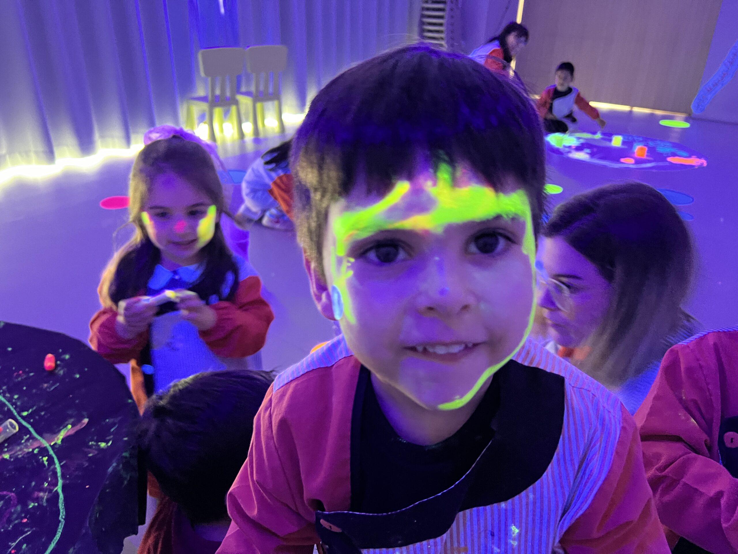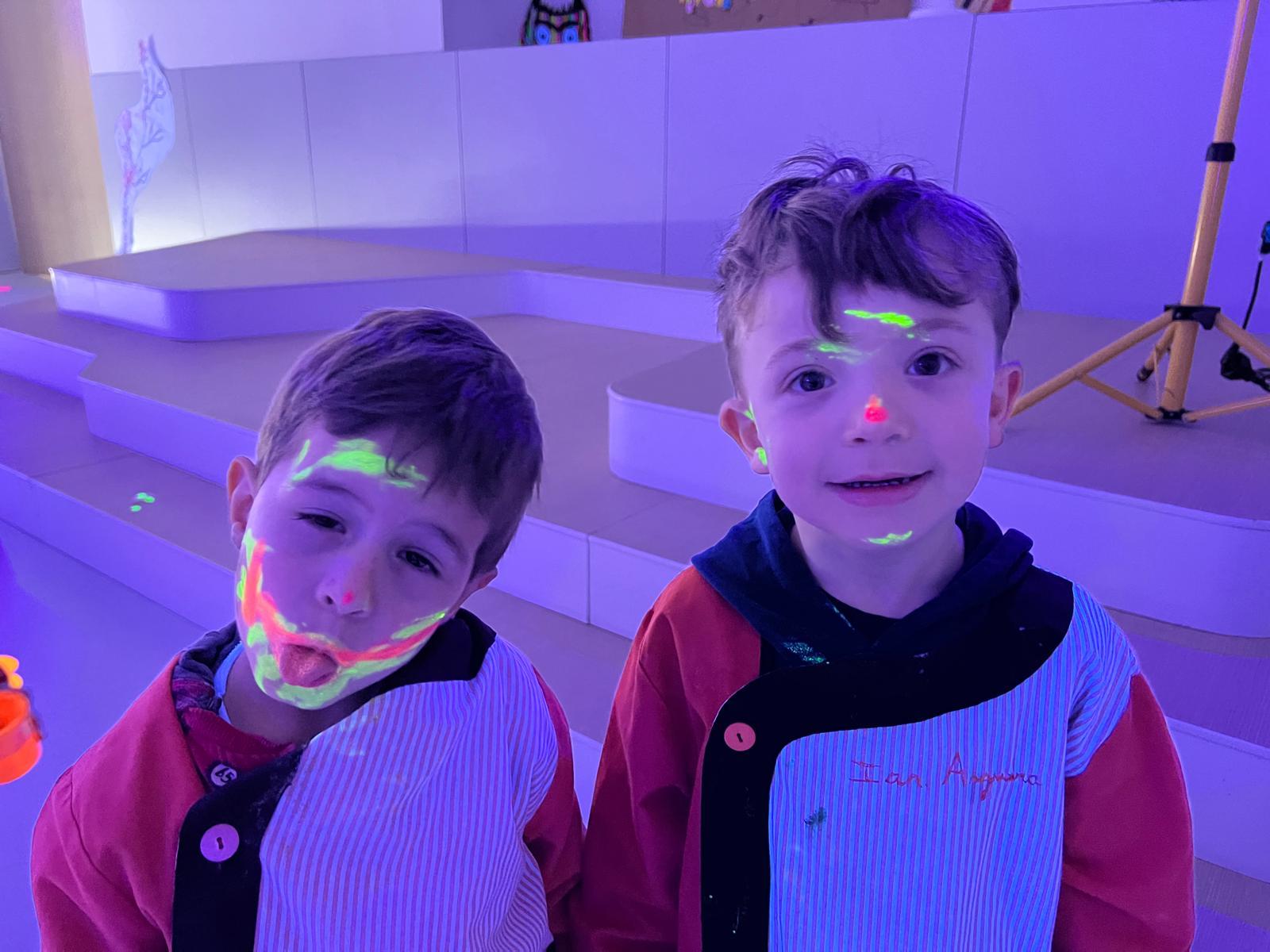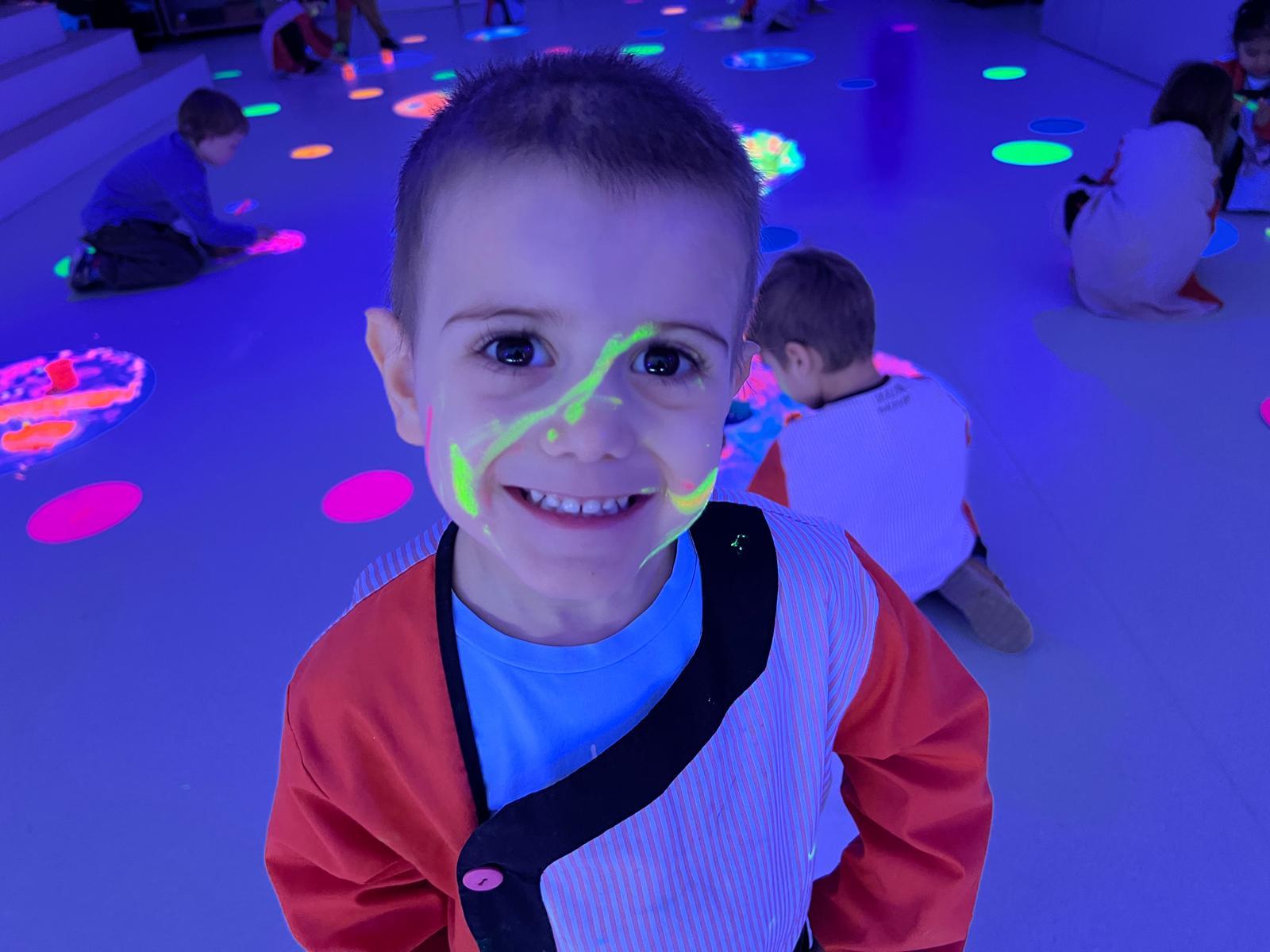 Així doncs, les noies de Koala For Kids van ajudar a profunditzar i continuar treballant la Yayoi. Ens van fer una recreació de l’univers creatiu de l’artista a través de tot l’espai. Mitjançant un focus de llum ultraviolada i cercles de colors, primer de tot, ens van explicar una mica l’obra de la Yayoi i la seva vida. Seguidament, van convidar els nens i les nenes a entrar dins de la instal·lació artística creada. Dins d’aquest espai fluor, els infants van poder pintar, dibuixar i maquillar-se amb pintura fluorescent tot fent cercles tal com feia l’artista. Va ser una experiència molt divertida!