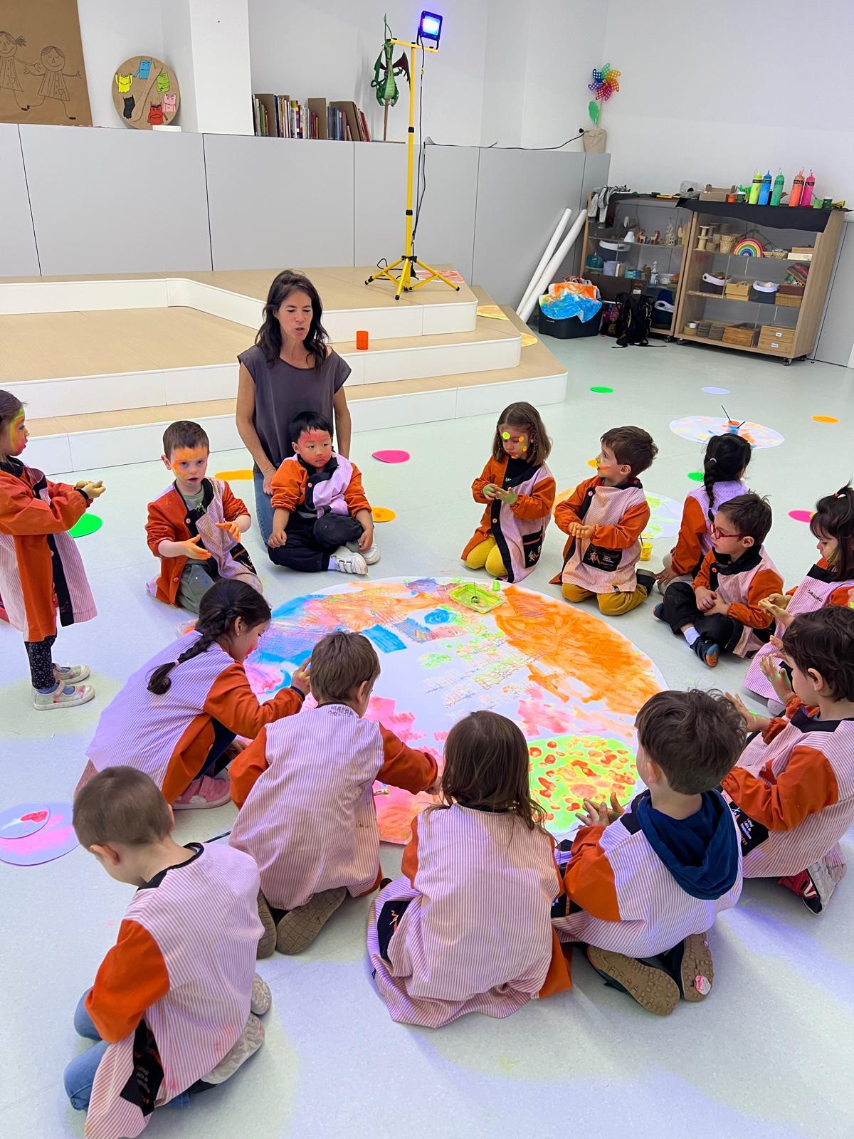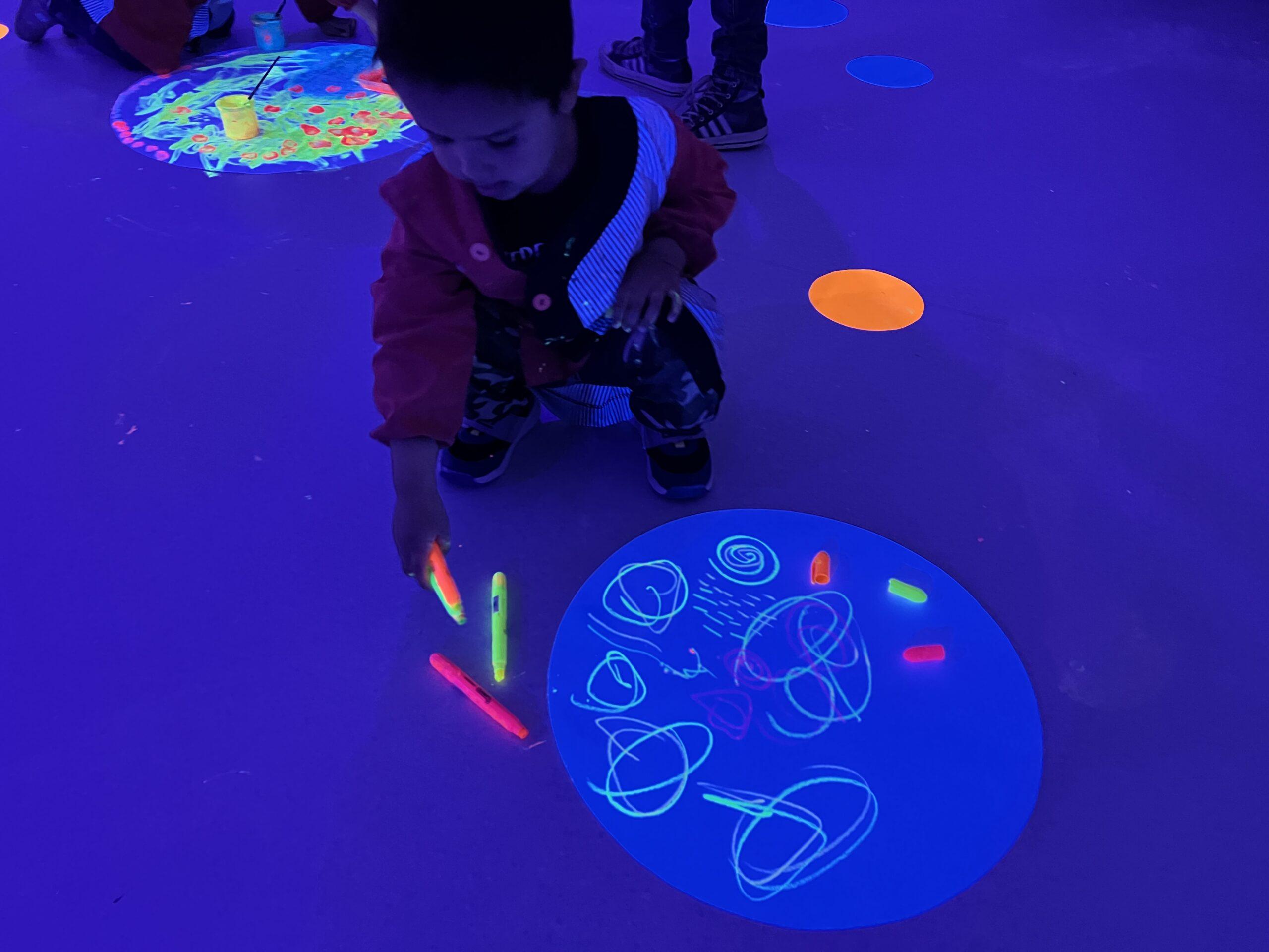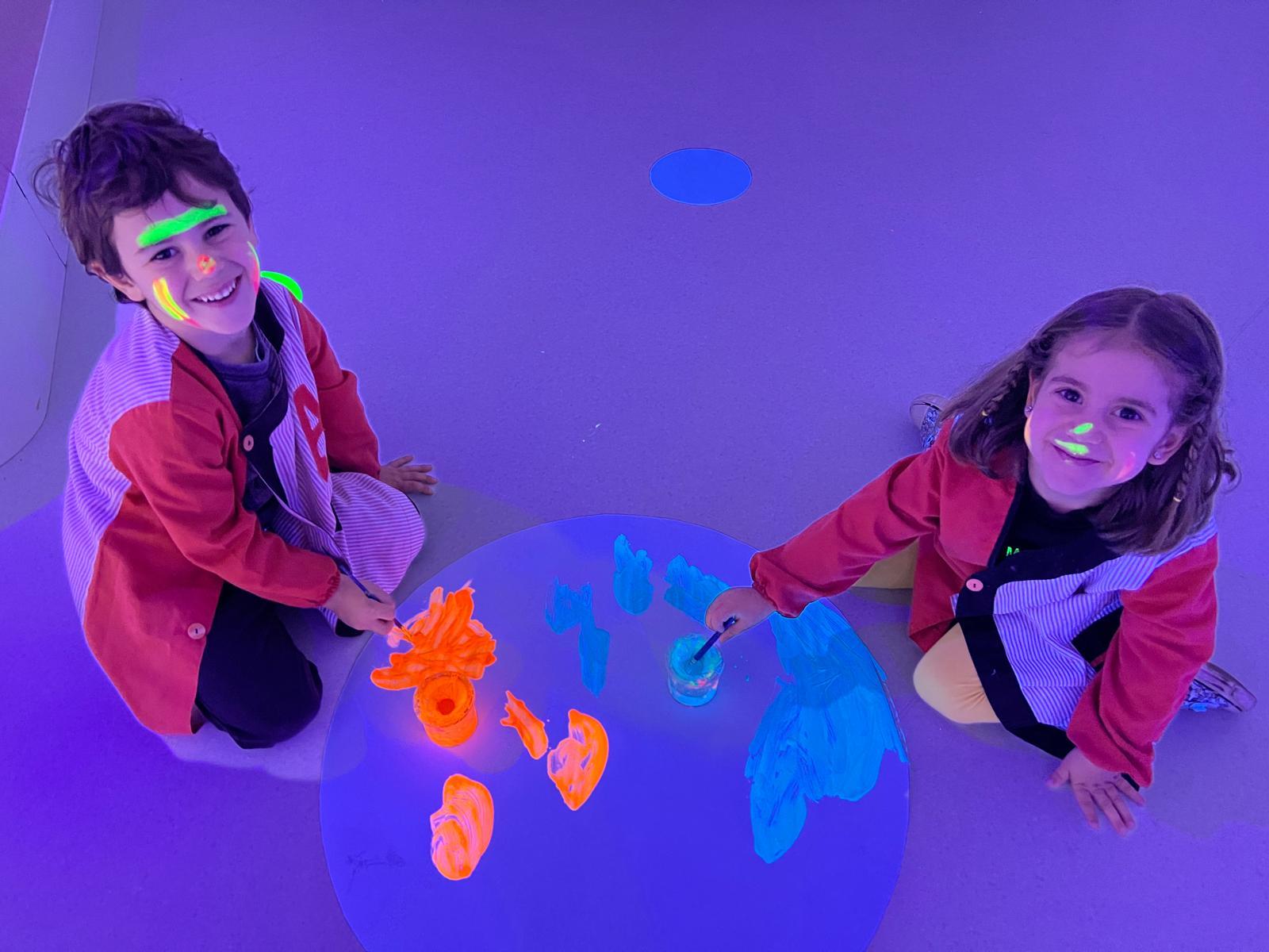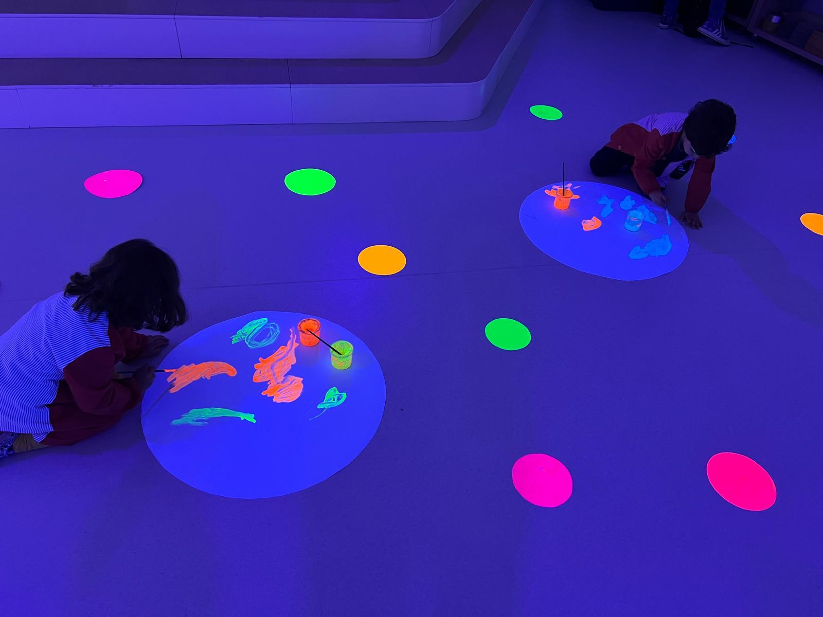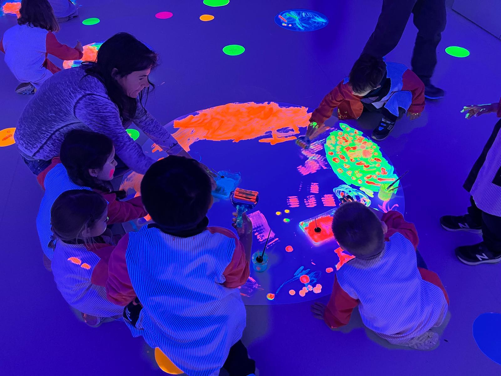 Així doncs, les noies de Koala For Kids van ajudar a profunditzar i continuar treballant la Yayoi. Ens van fer una recreació de l’univers creatiu de l’artista a través de tot l’espai. Mitjançant un focus de llum ultraviolada i cercles de colors, primer de tot, ens van explicar una mica l’obra de la Yayoi i la seva vida. Seguidament, van convidar els nens i les nenes a entrar dins de la instal·lació artística creada. Dins d’aquest espai fluor, els infants van poder pintar, dibuixar i maquillar-se amb pintura fluorescent tot fent cercles tal com feia l’artista. Va ser una experiència molt divertida!