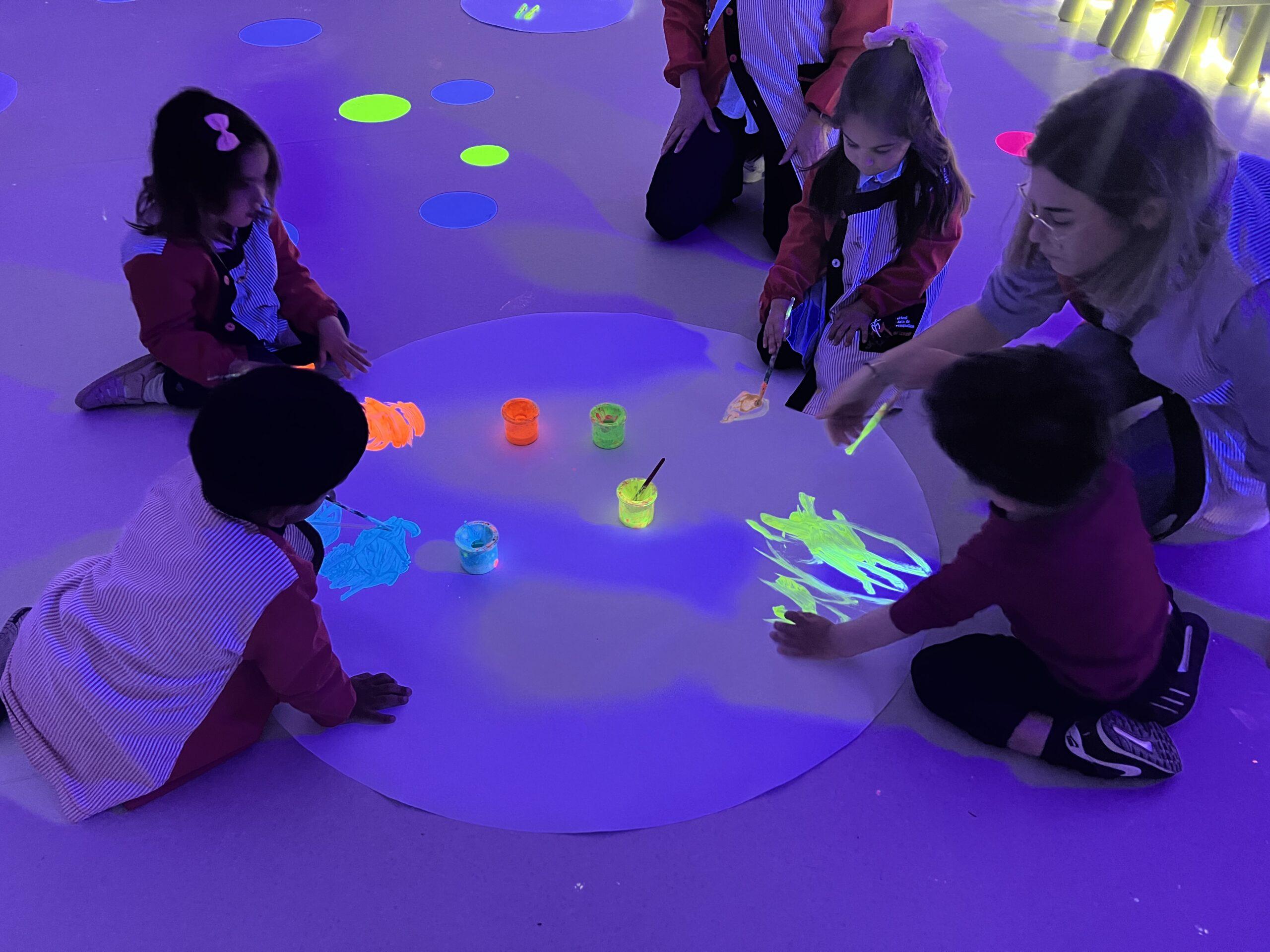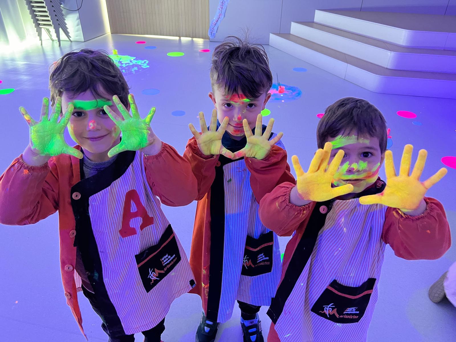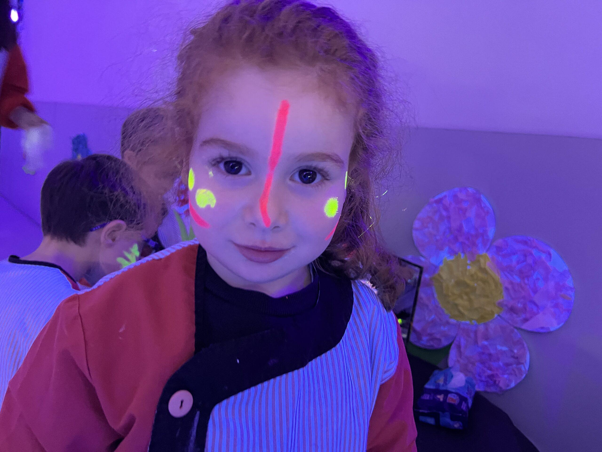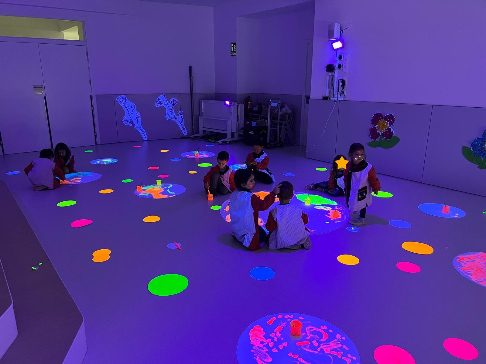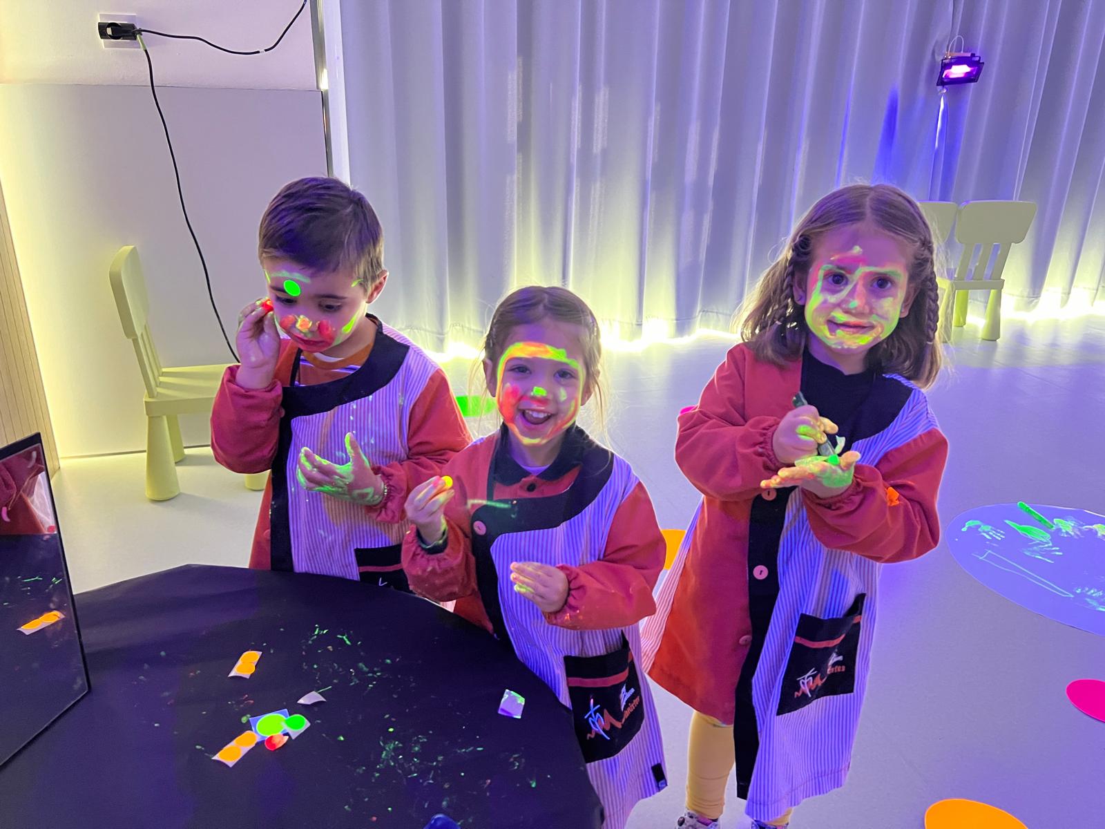 Així doncs, les noies de Koala For Kids van ajudar a profunditzar i continuar treballant la Yayoi. Ens van fer una recreació de l’univers creatiu de l’artista a través de tot l’espai. Mitjançant un focus de llum ultraviolada i cercles de colors, primer de tot, ens van explicar una mica l’obra de la Yayoi i la seva vida. Seguidament, van convidar els nens i les nenes a entrar dins de la instal·lació artística creada. Dins d’aquest espai fluor, els infants van poder pintar, dibuixar i maquillar-se amb pintura fluorescent tot fent cercles tal com feia l’artista. Va ser una experiència molt divertida!