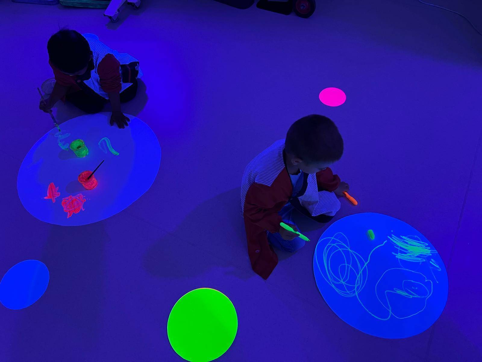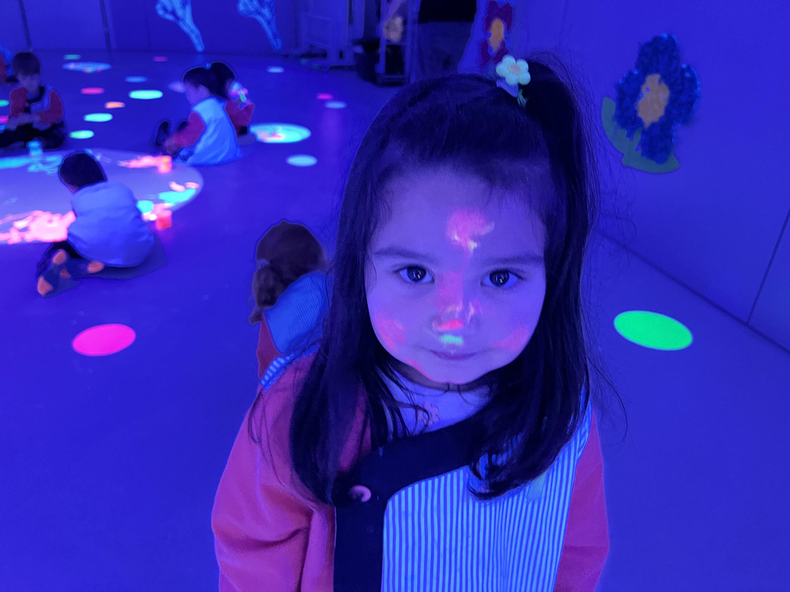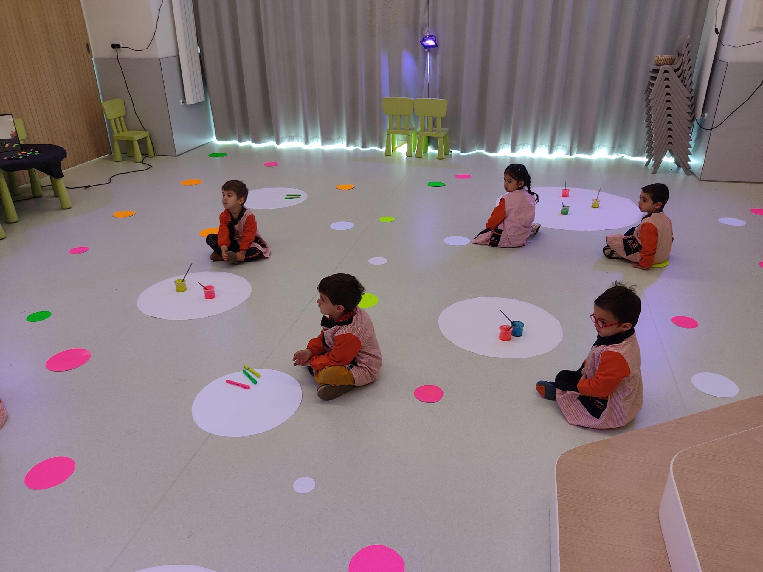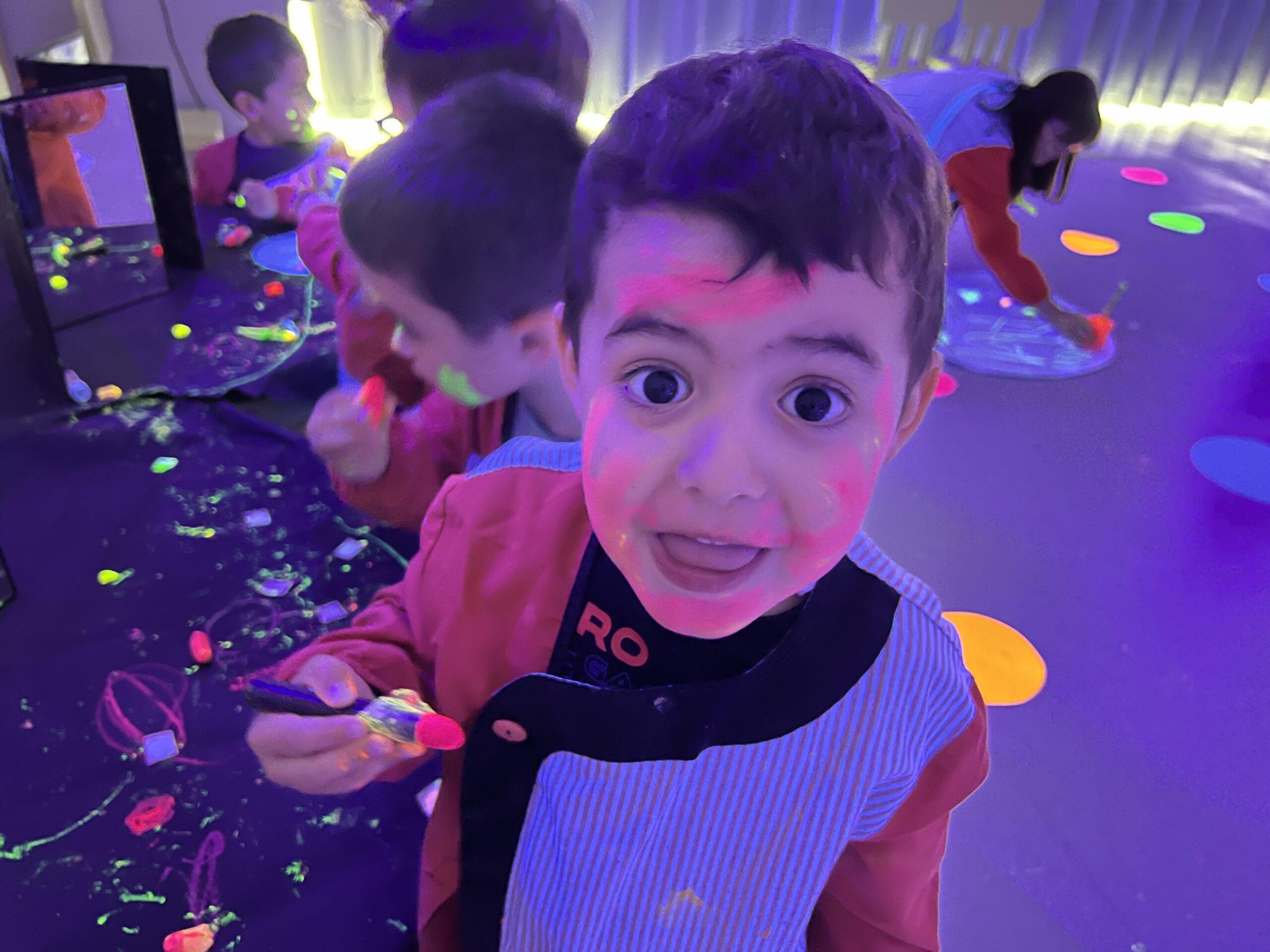 Així doncs, les noies de Koala For Kids van ajudar a profunditzar i continuar treballant la Yayoi. Ens van fer una recreació de l’univers creatiu de l’artista a través de tot l’espai. Mitjançant un focus de llum ultraviolada i cercles de colors, primer de tot, ens van explicar una mica l’obra de la Yayoi i la seva vida. Seguidament, van convidar els nens i les nenes a entrar dins de la instal·lació artística creada. Dins d’aquest espai fluor, els infants van poder pintar, dibuixar i maquillar-se amb pintura fluorescent tot fent cercles tal com feia l’artista. Va ser una experiència molt divertida!