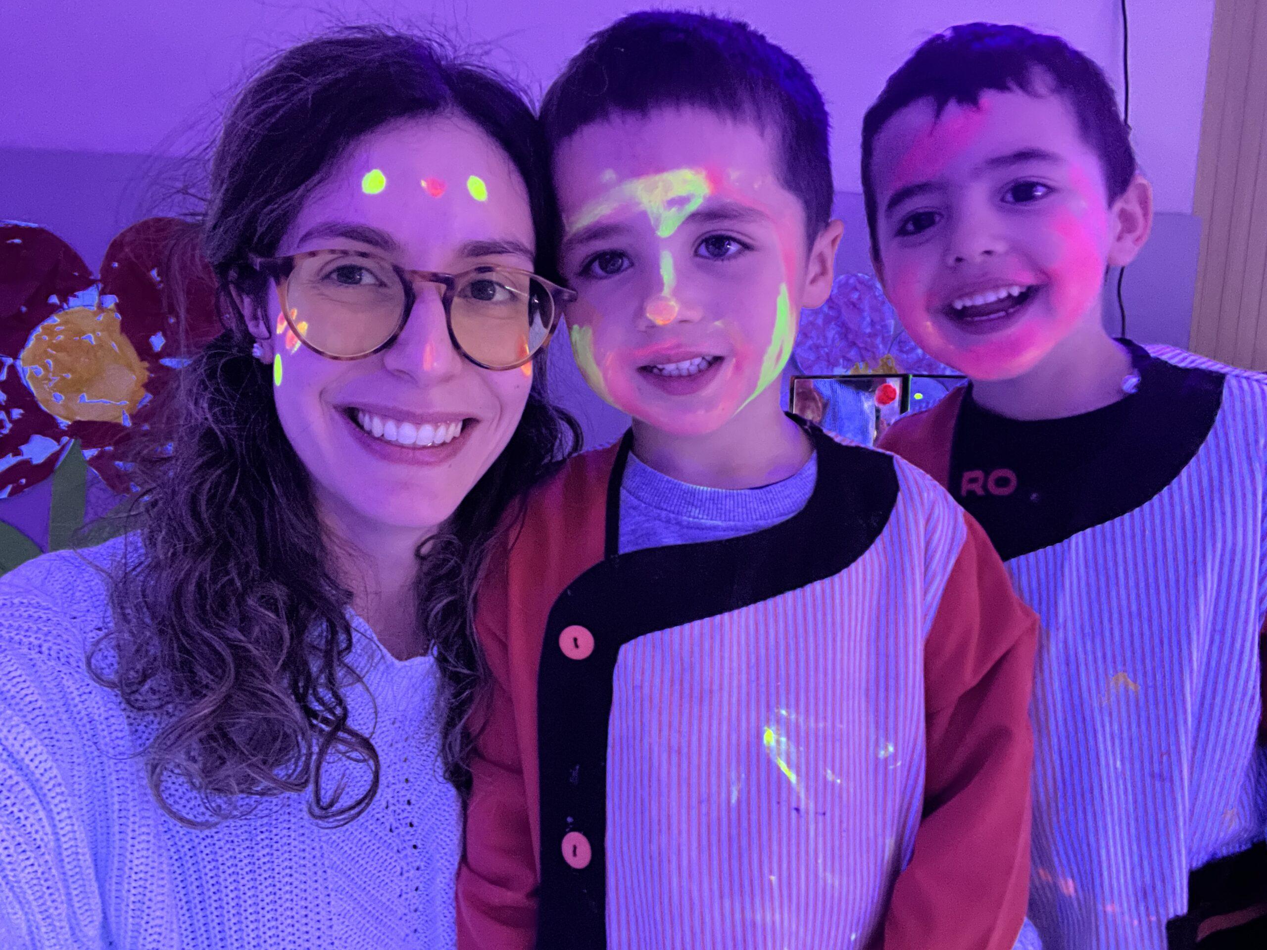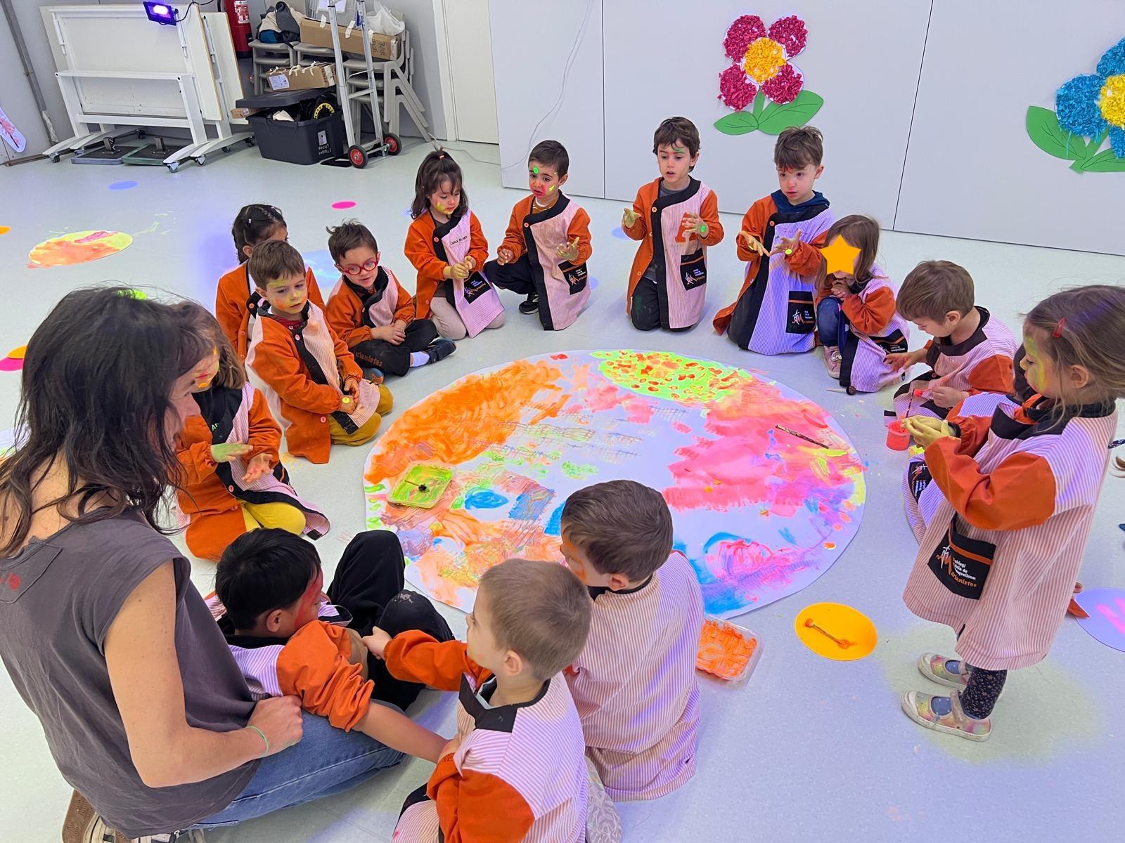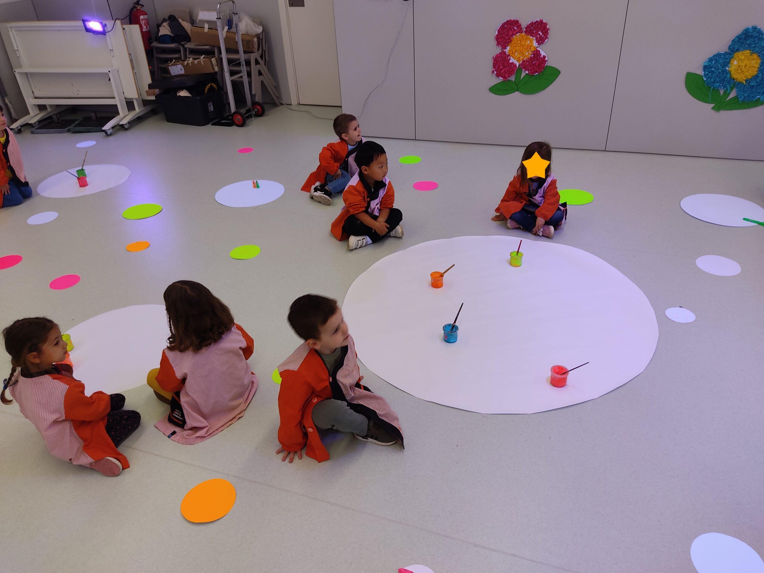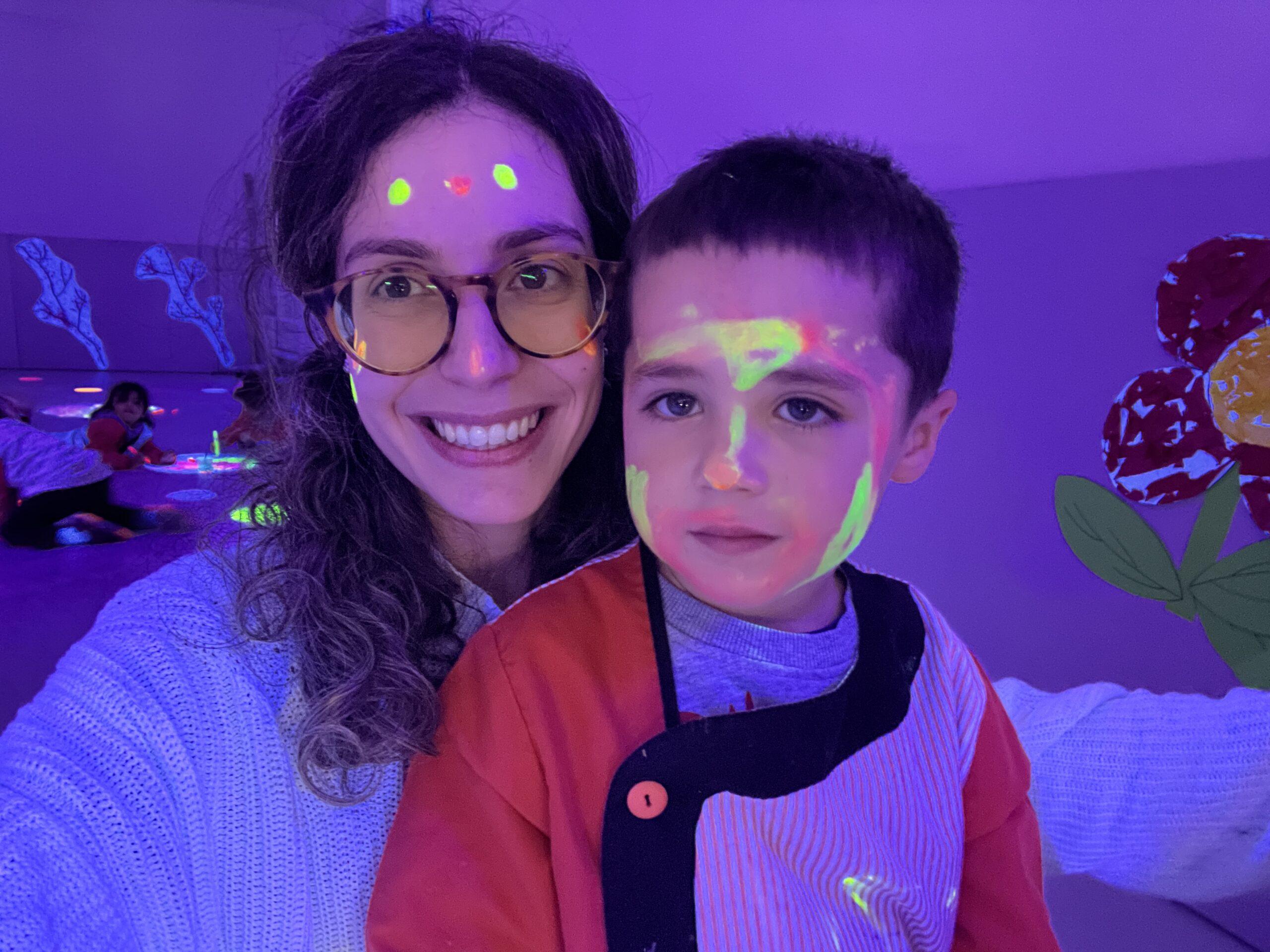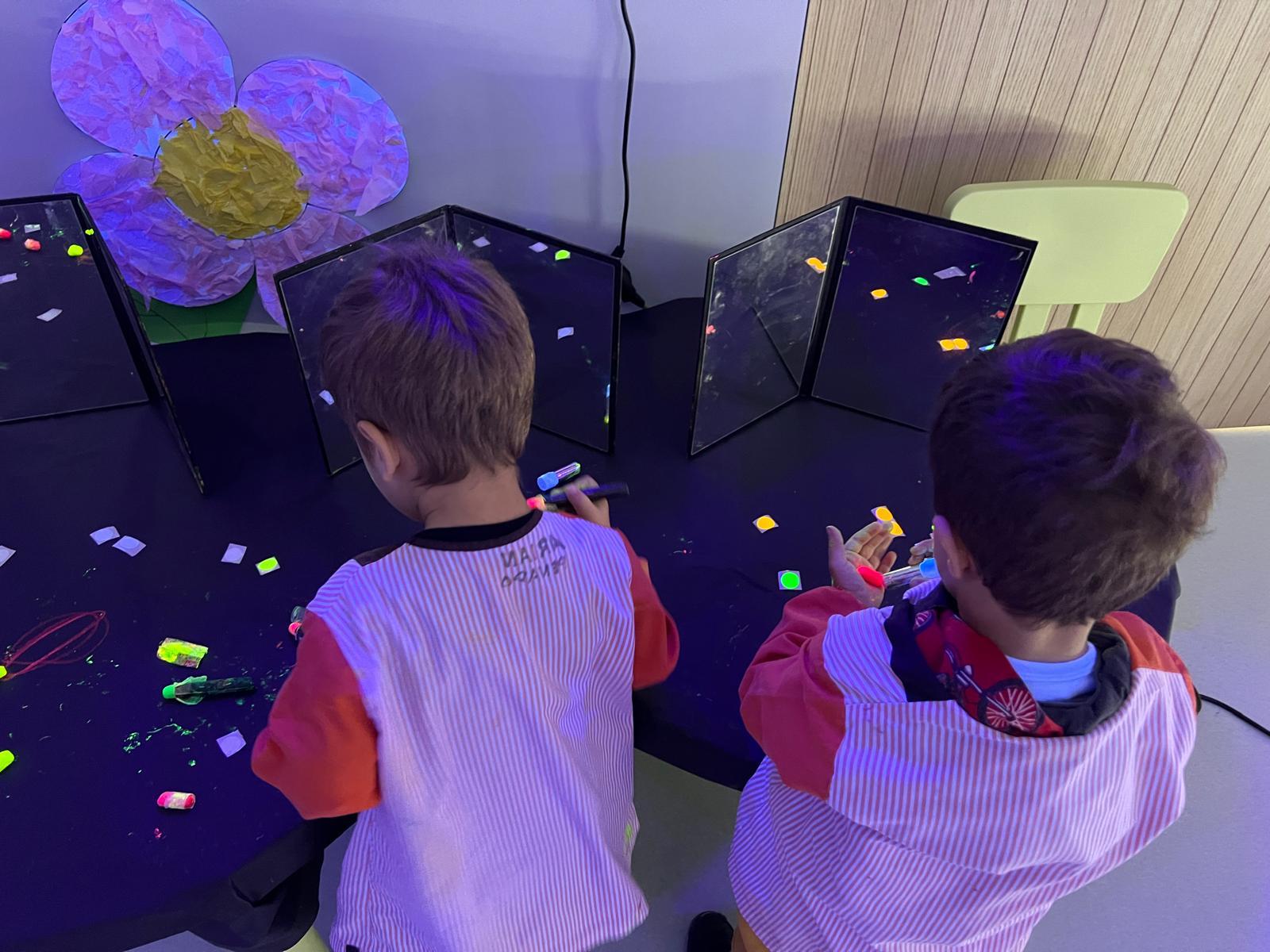 Així doncs, les noies de Koala For Kids van ajudar a profunditzar i continuar treballant la Yayoi. Ens van fer una recreació de l’univers creatiu de l’artista a través de tot l’espai. Mitjançant un focus de llum ultraviolada i cercles de colors, primer de tot, ens van explicar una mica l’obra de la Yayoi i la seva vida. Seguidament, van convidar els nens i les nenes a entrar dins de la instal·lació artística creada. Dins d’aquest espai fluor, els infants van poder pintar, dibuixar i maquillar-se amb pintura fluorescent tot fent cercles tal com feia l’artista. Va ser una experiència molt divertida!