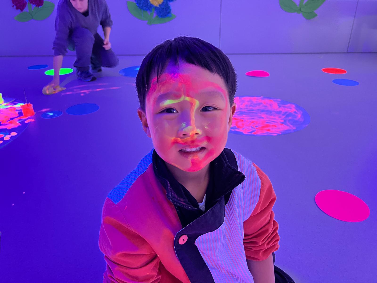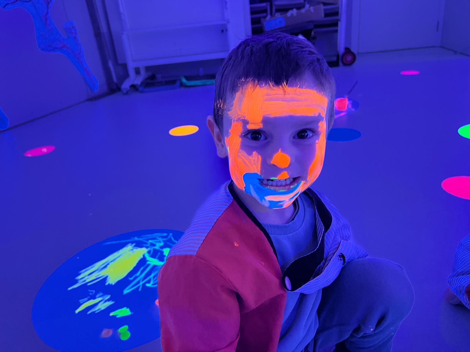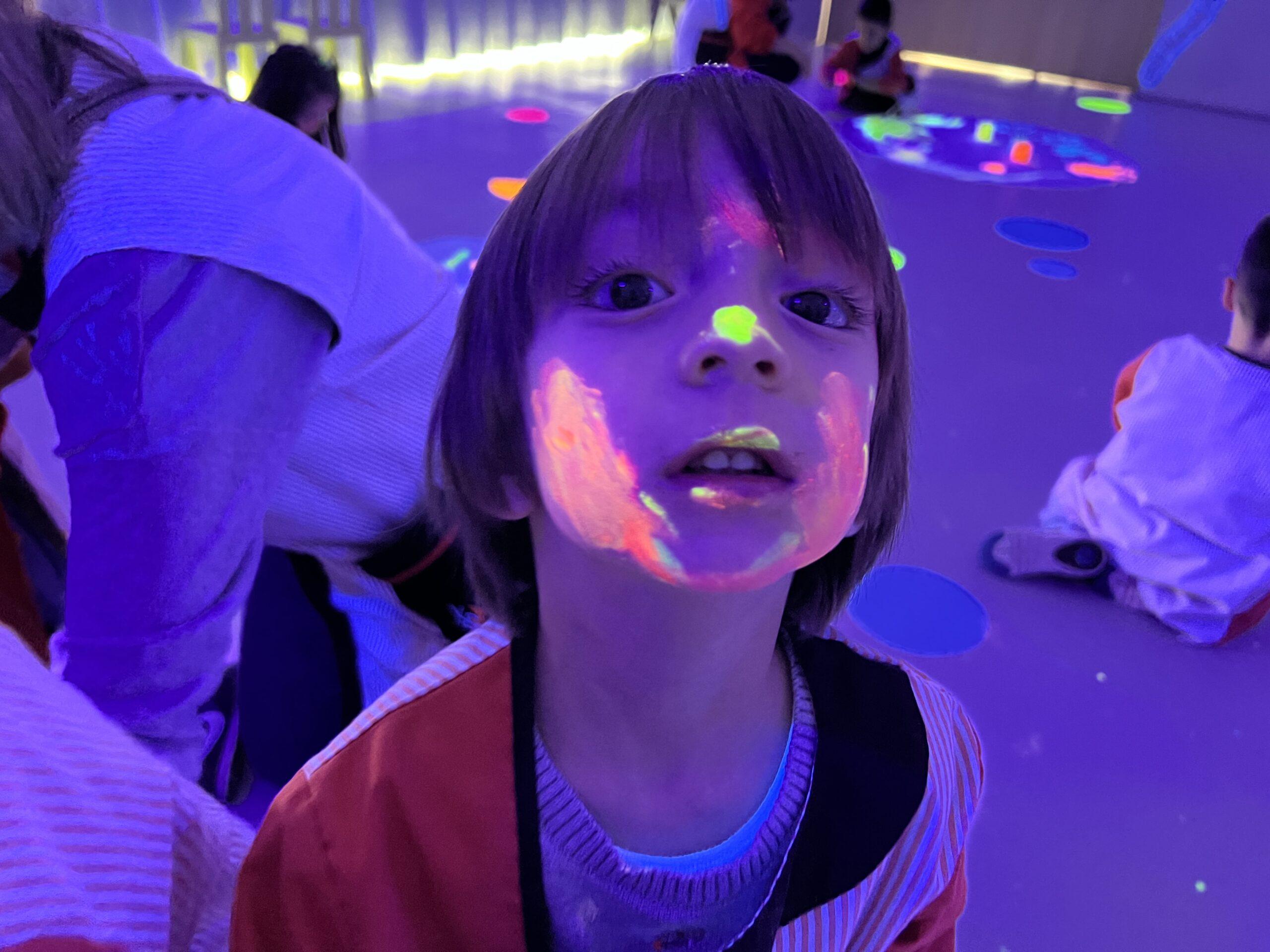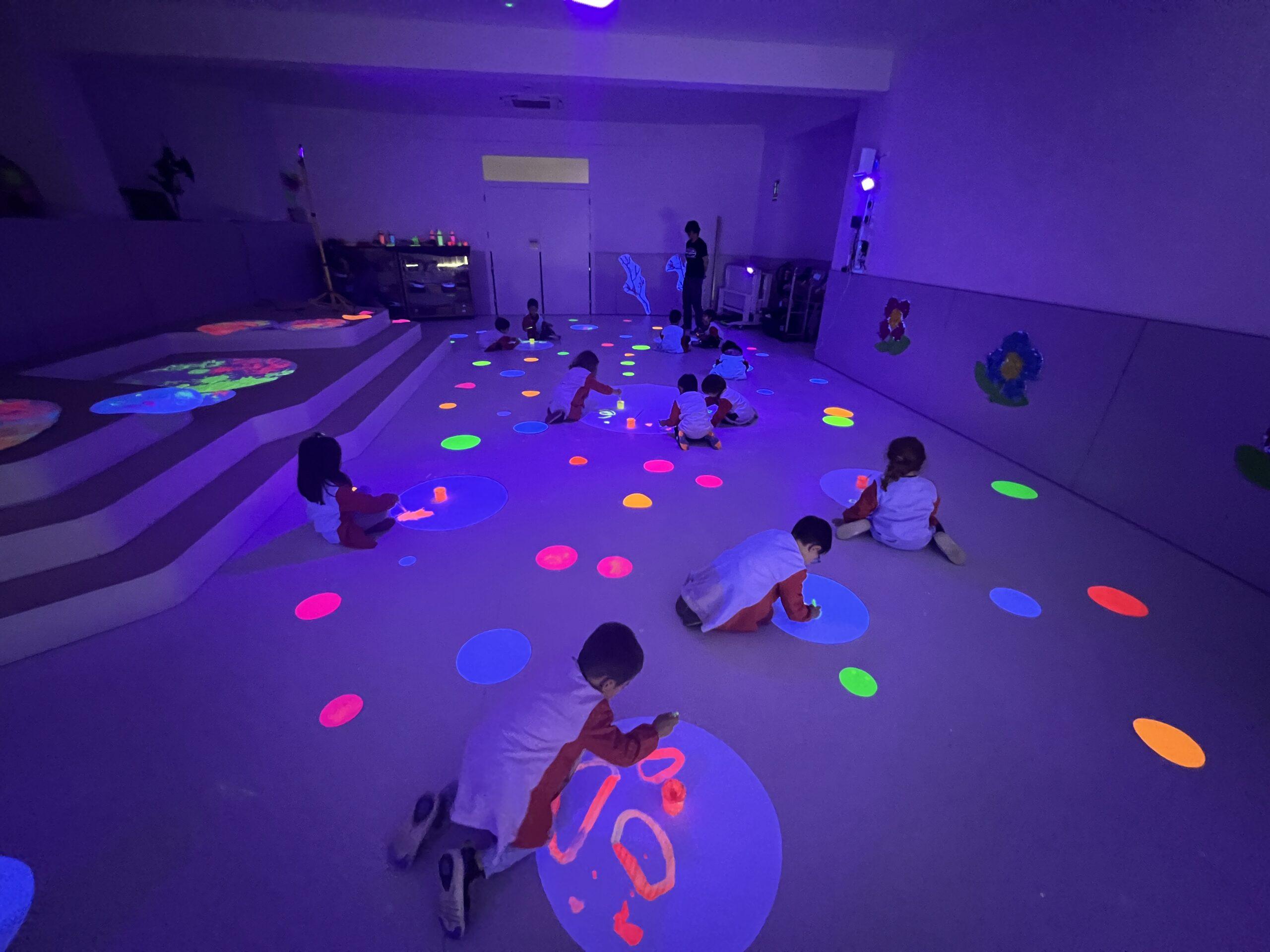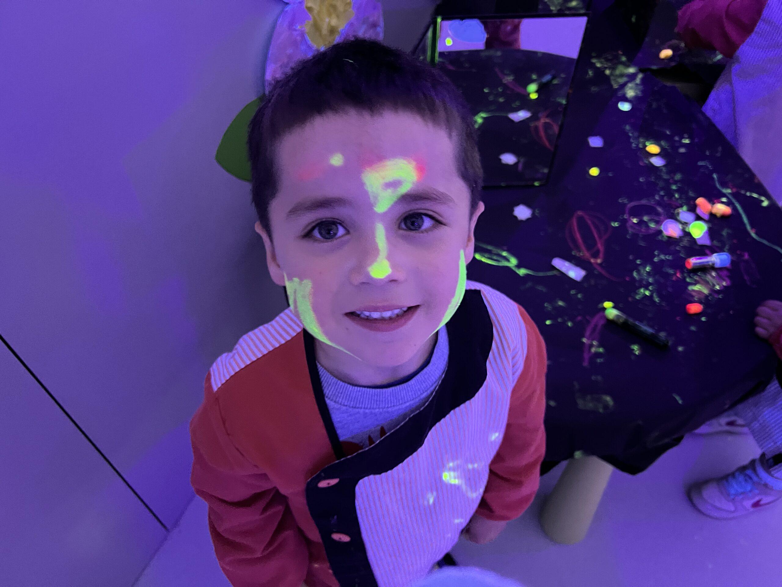 Així doncs, les noies de Koala For Kids van ajudar a profunditzar i continuar treballant la Yayoi. Ens van fer una recreació de l’univers creatiu de l’artista a través de tot l’espai. Mitjançant un focus de llum ultraviolada i cercles de colors, primer de tot, ens van explicar una mica l’obra de la Yayoi i la seva vida. Seguidament, van convidar els nens i les nenes a entrar dins de la instal·lació artística creada. Dins d’aquest espai fluor, els infants van poder pintar, dibuixar i maquillar-se amb pintura fluorescent tot fent cercles tal com feia l’artista. Va ser una experiència molt divertida!