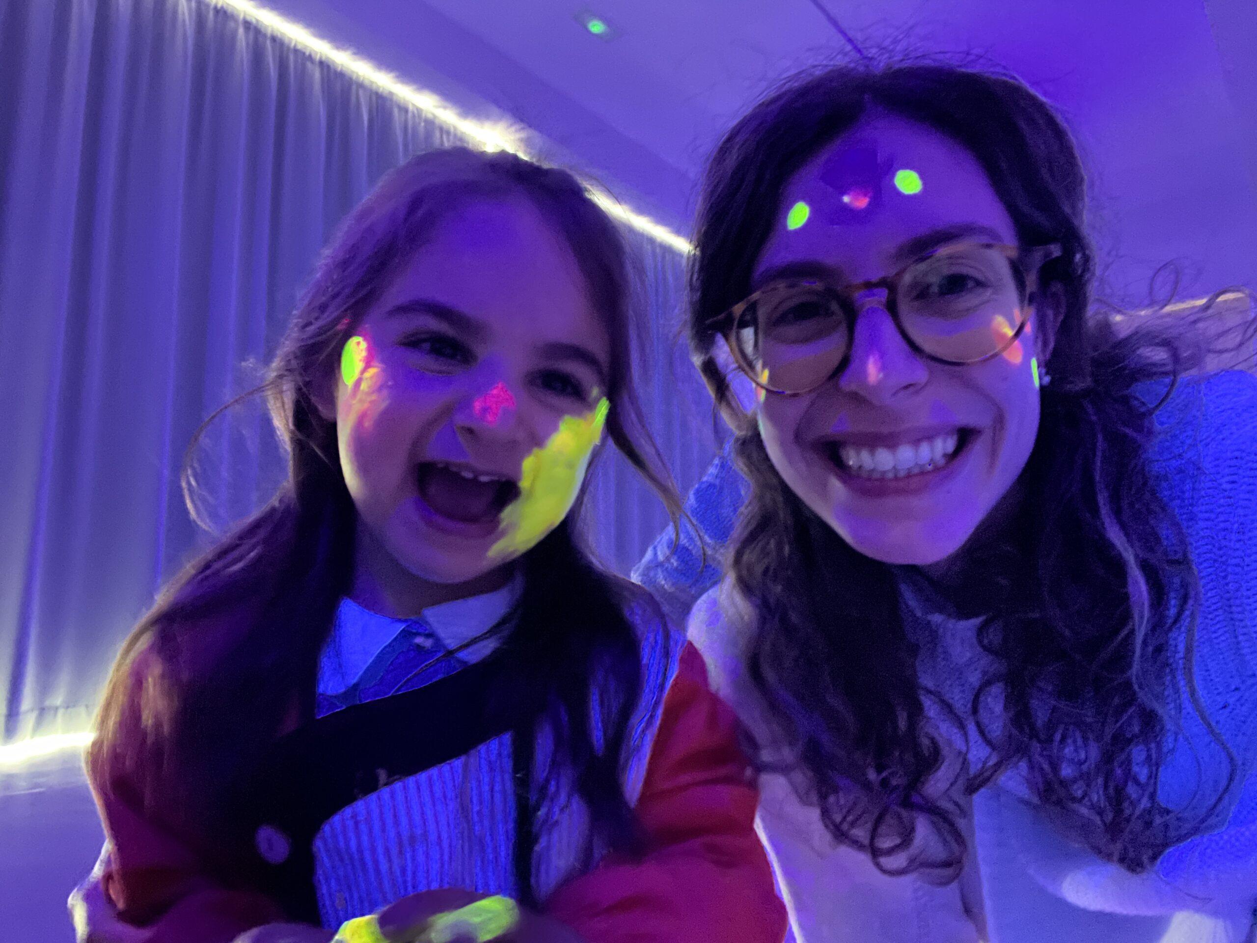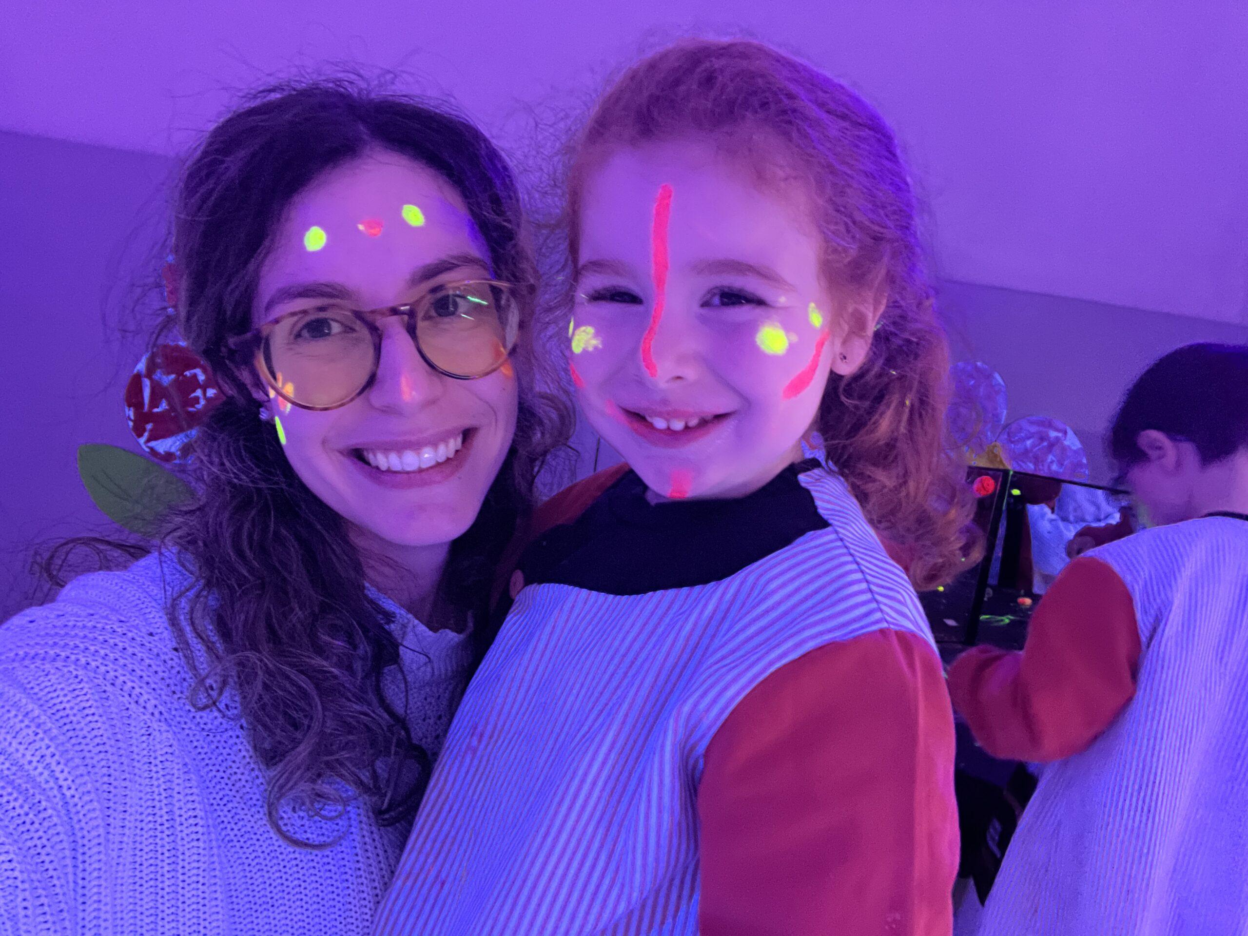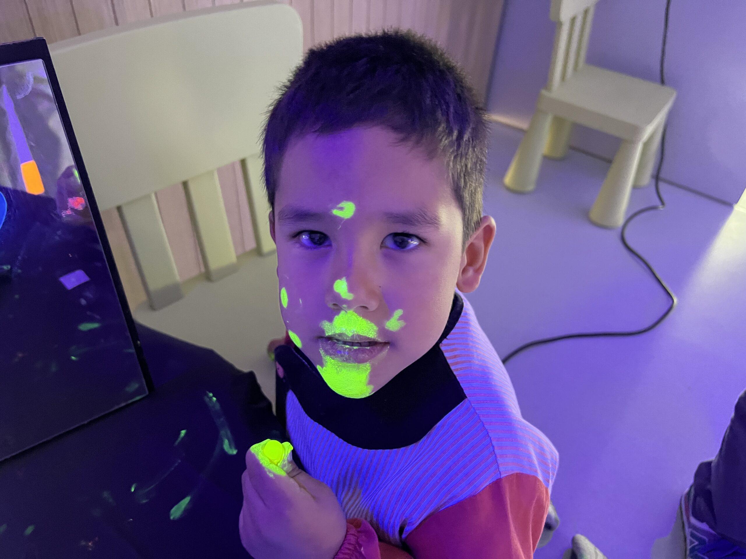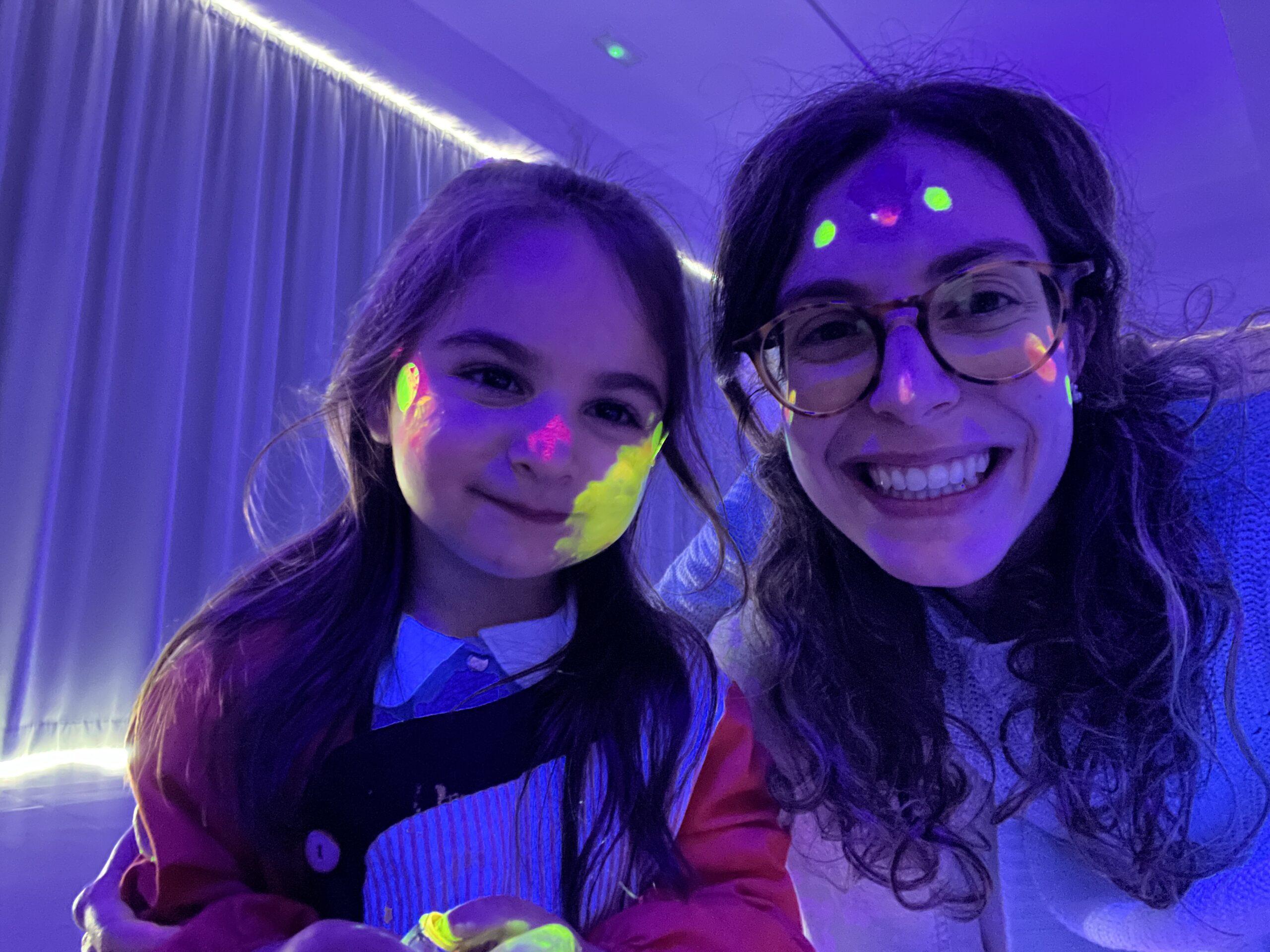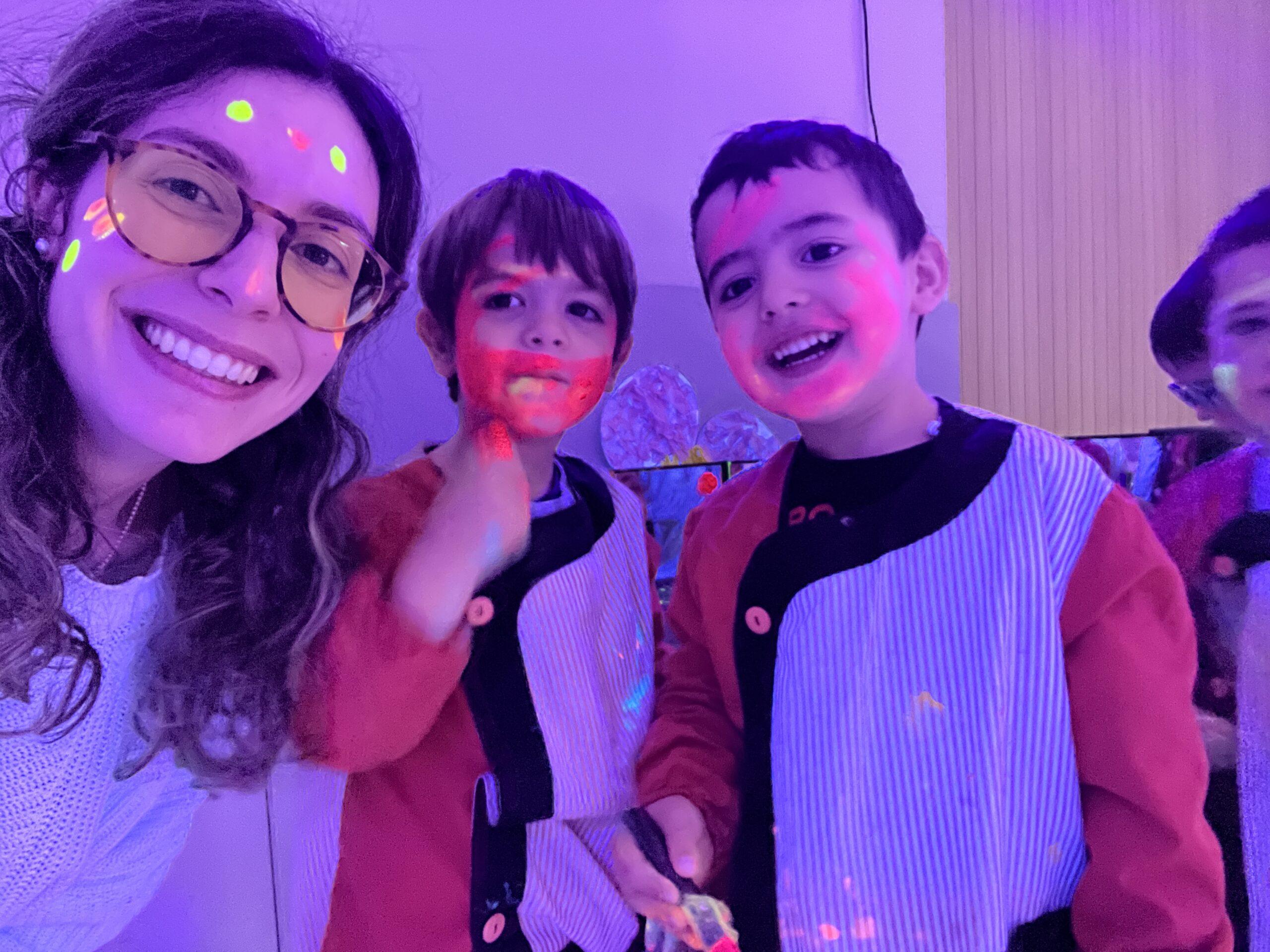 Així doncs, les noies de Koala For Kids van ajudar a profunditzar i continuar treballant la Yayoi. Ens van fer una recreació de l’univers creatiu de l’artista a través de tot l’espai. Mitjançant un focus de llum ultraviolada i cercles de colors, primer de tot, ens van explicar una mica l’obra de la Yayoi i la seva vida. Seguidament, van convidar els nens i les nenes a entrar dins de la instal·lació artística creada. Dins d’aquest espai fluor, els infants van poder pintar, dibuixar i maquillar-se amb pintura fluorescent tot fent cercles tal com feia l’artista. Va ser una experiència molt divertida!