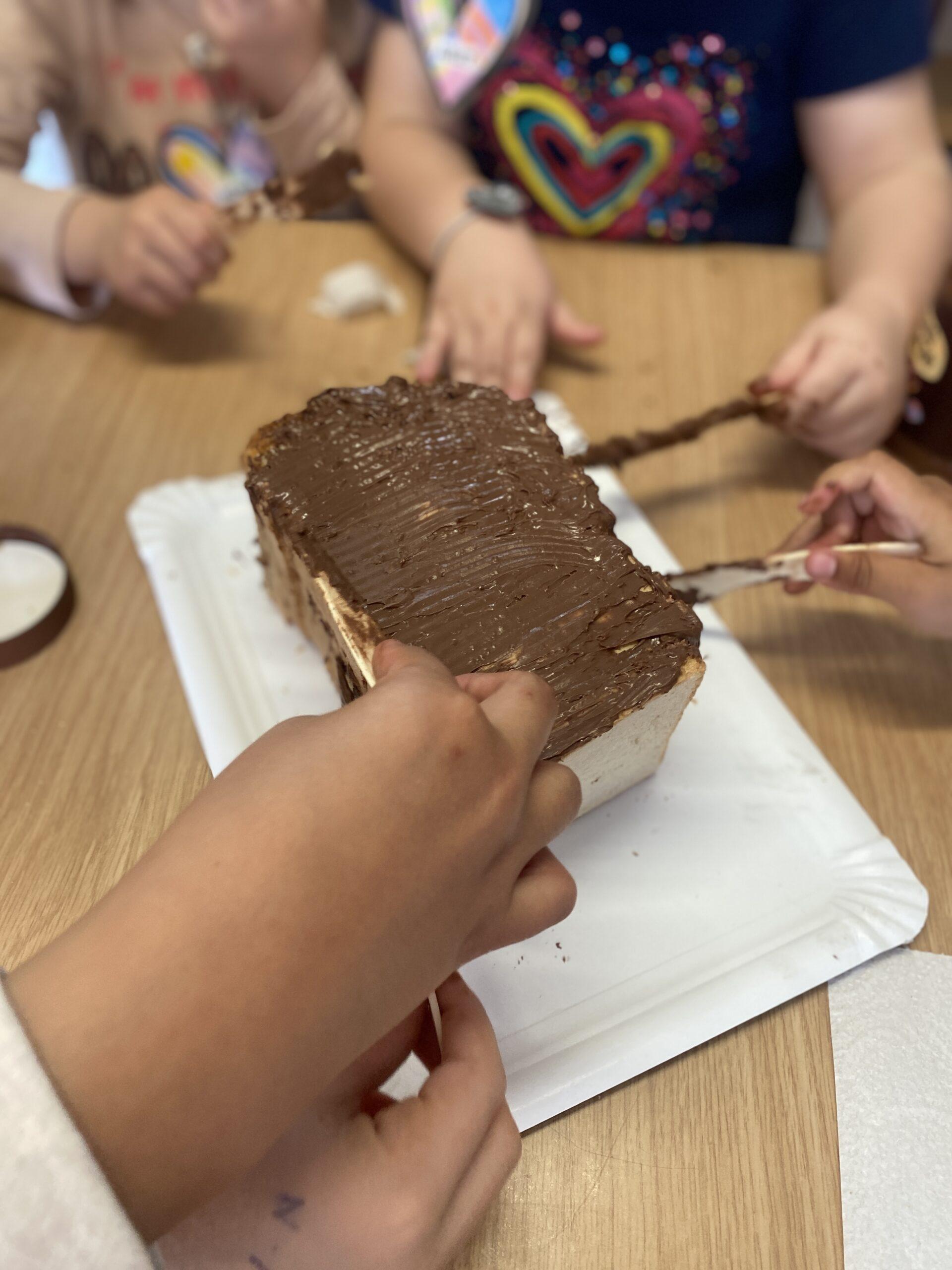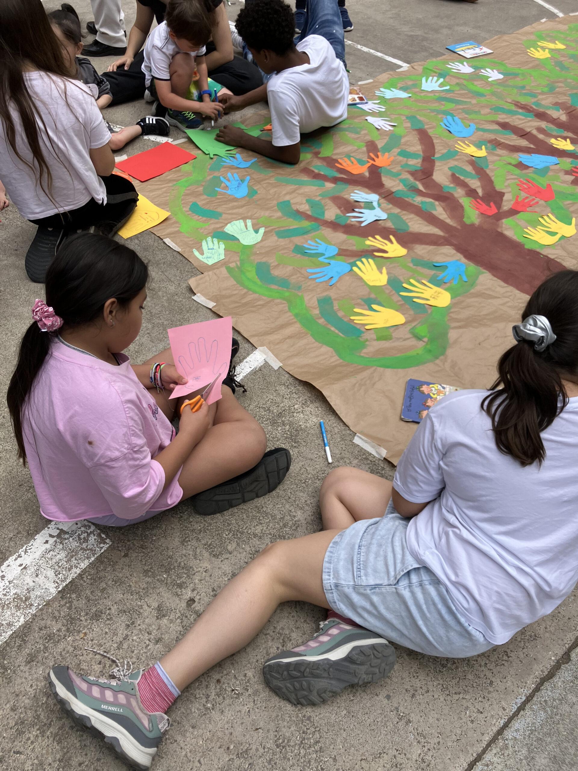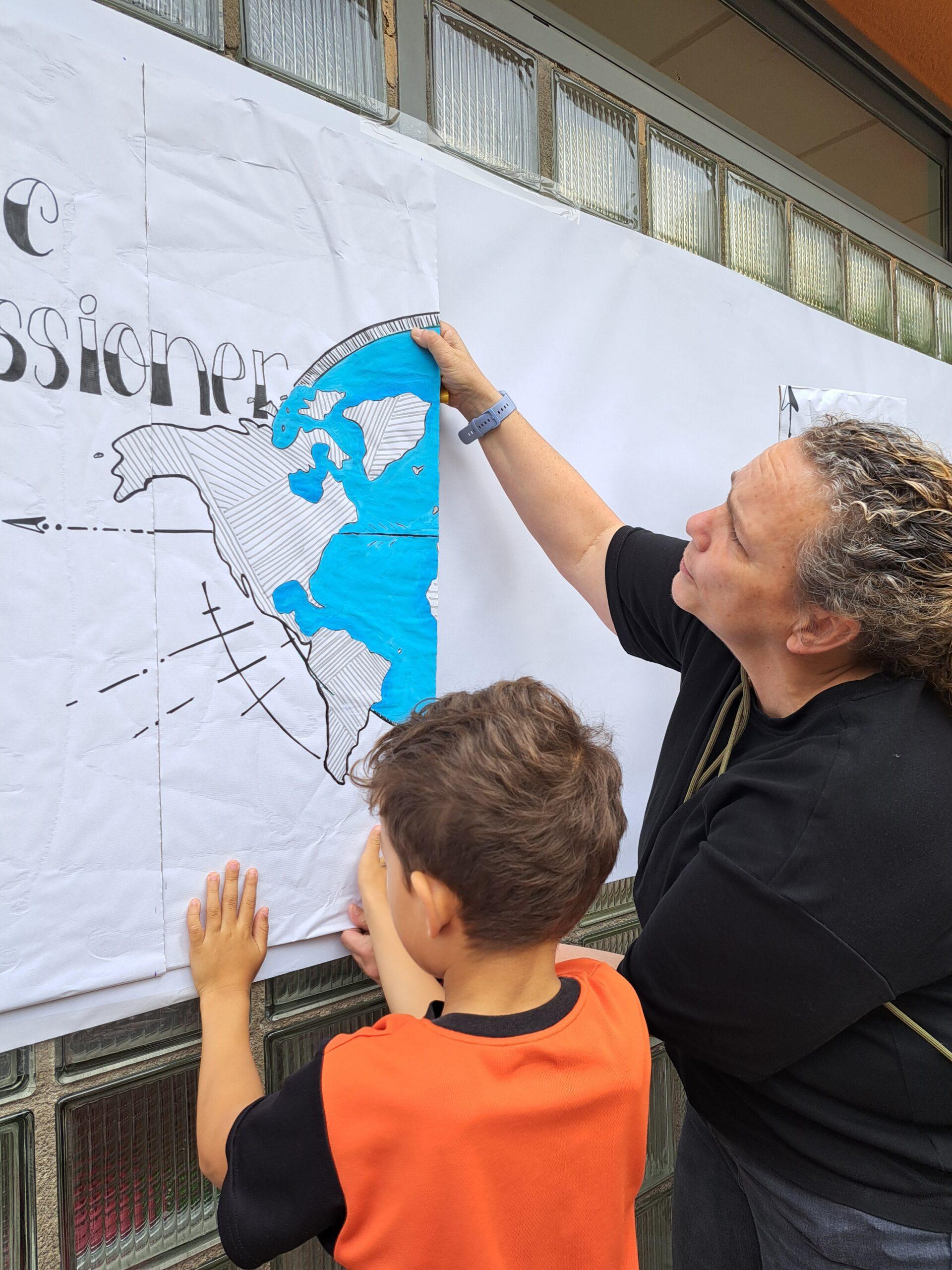 A mig matí es van crear grups amb infants de tots els nivells de l’escola que van anar passant pels tallers ambientats en quatre continents: Àfrica, Amèrica, Europa i Àsia. En el cas d’Àfrica, els infants van per elaborar màscares africanes tot deixant volar la seva imaginació. Respecte al taller d’Amèrica, es va centrar en l’art musical i, en concret, amb l’estil “merengue”, on l’alumnat va poder gaudir d’una coreografia creada per l’alumnat de Secundària. Seguidament, el taller d’Europa es va centrar en una recepta d’un postre típic d’Anglaterra: el Plum Cake. Finalment, i pel que fa al taller d’Àsia, es va crear un mural de la diversitat a través de les siluetes de les mans dels infants per, posteriorment, escriure una paraula bonica i enganxar-la al mural. Aquest anava precedit del lema “Aquestes mans no són el futur, són el present”.