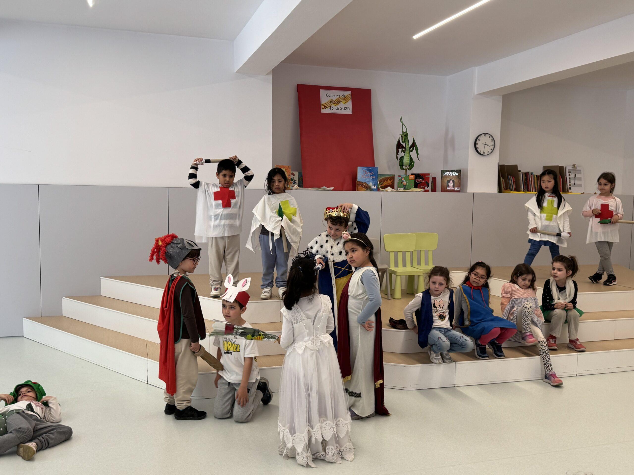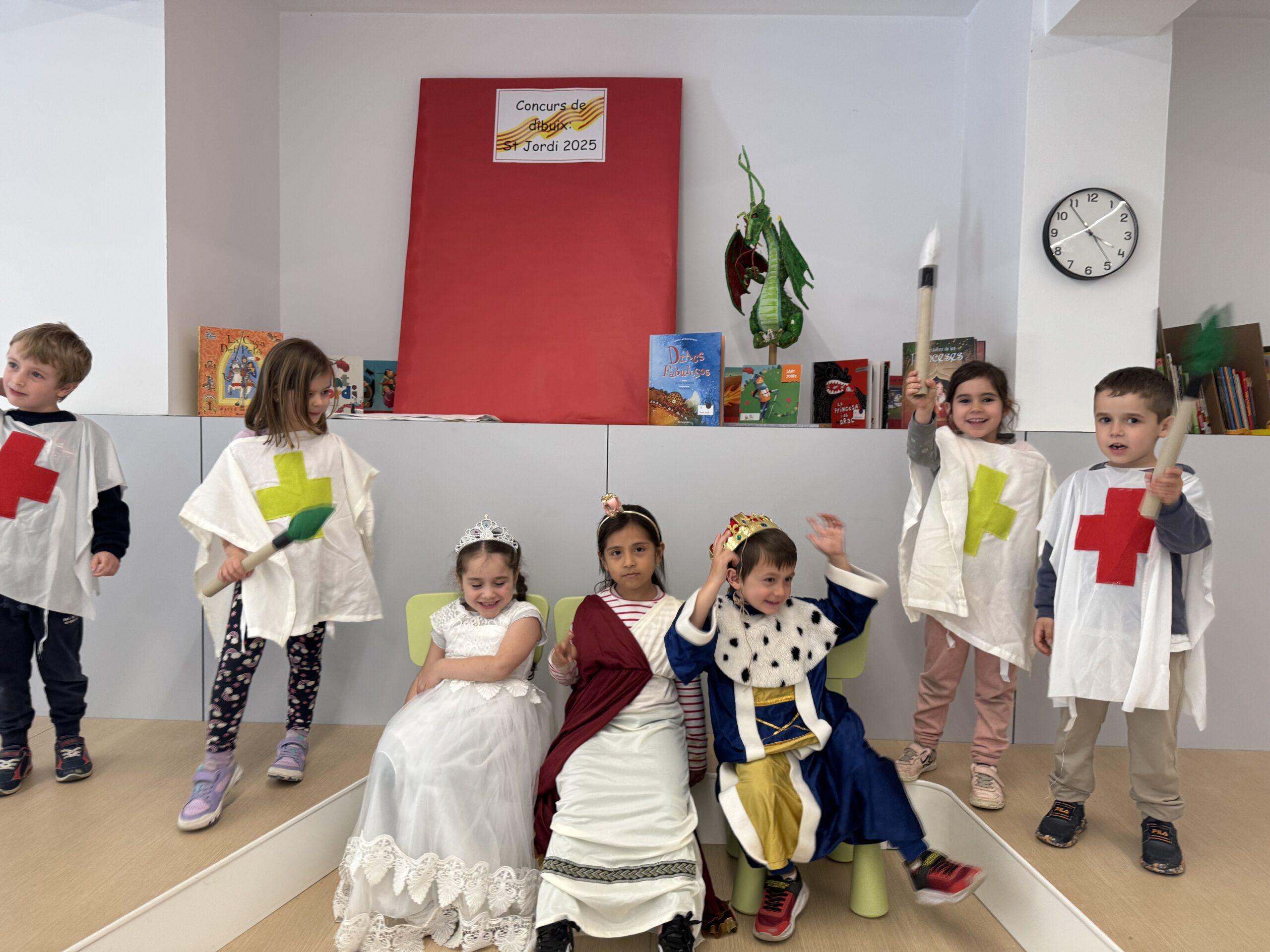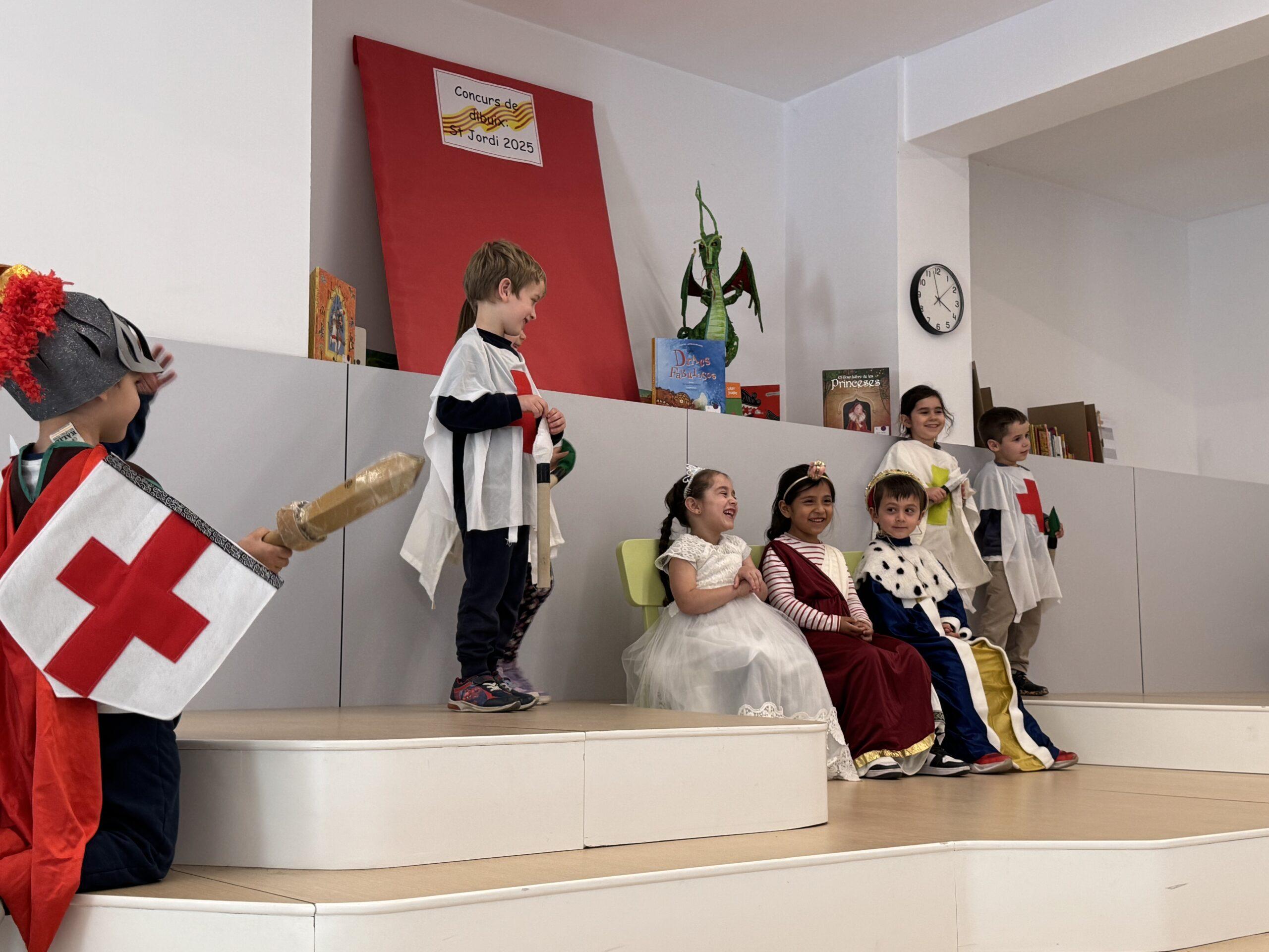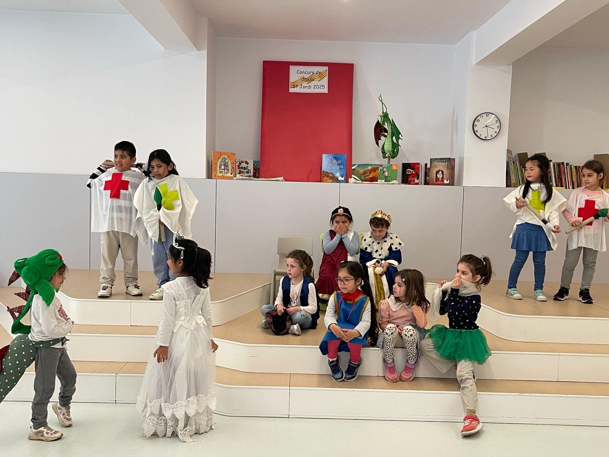 Per finalitzar amb el dia, tot l’alumnat d’aquesta etapa es va reunir a La Plaça. Allà van tenir lloc els Jocs Florals d’Infantil on les guanyadores i els guanyadors del concurs de dibuix de cada classe van sortir a recollir la seva medalla i un llibre per a la classe. Per acabar, els infants més grans del cicle, els d’I5, van fer una representació de la llegenda de Sant Jordi que va donar per acabat un dels dies més bonics de l’any.
