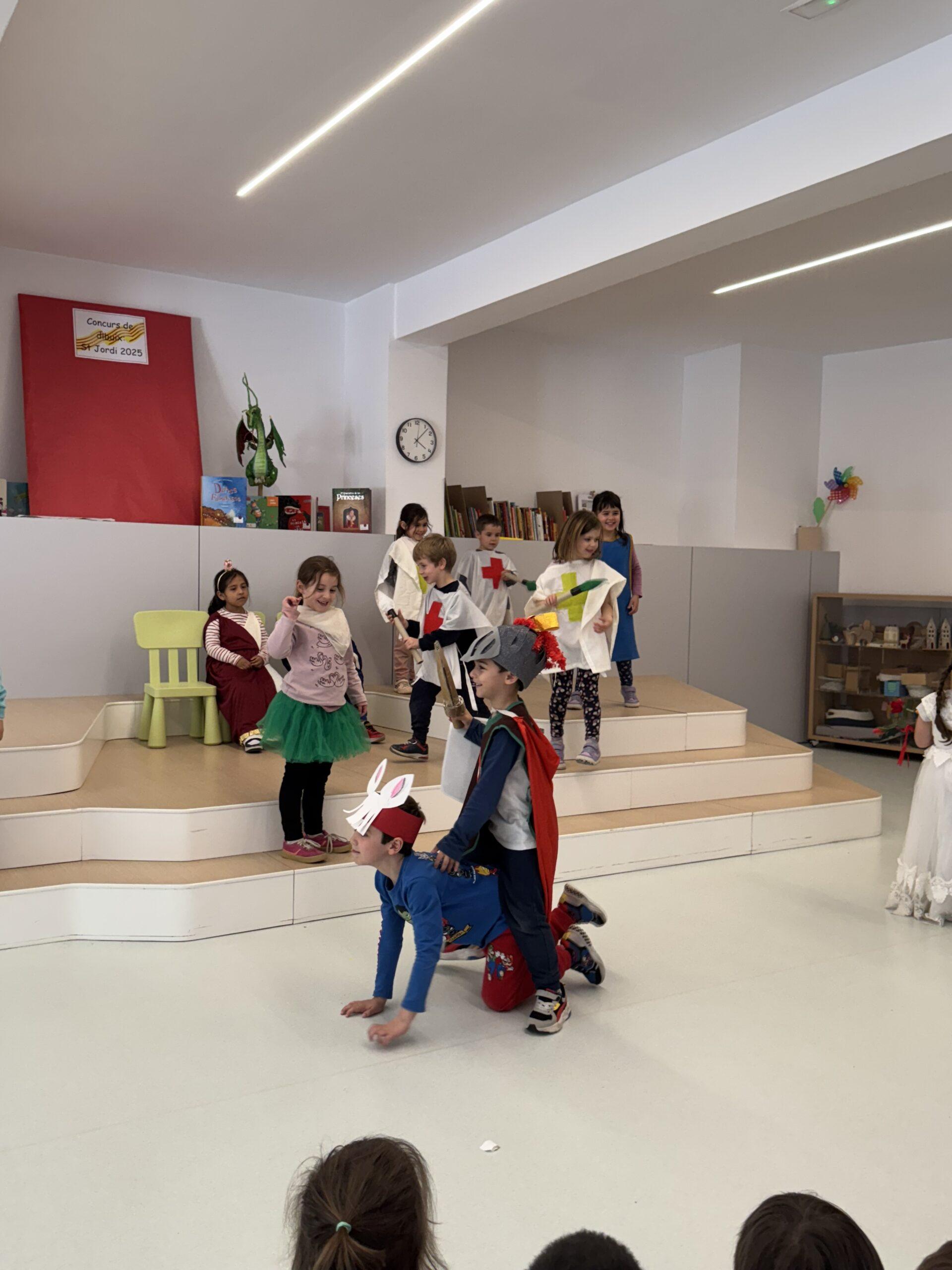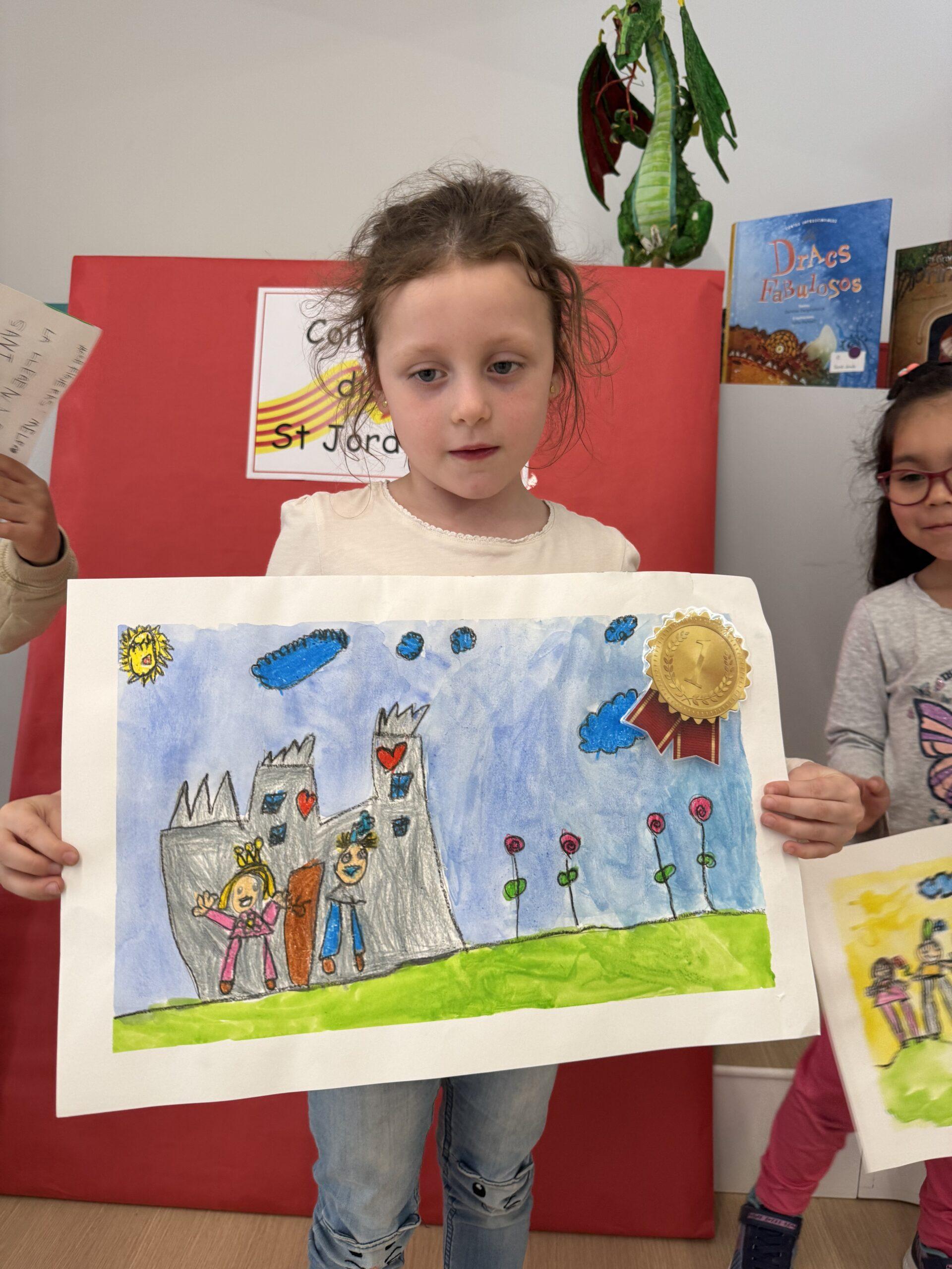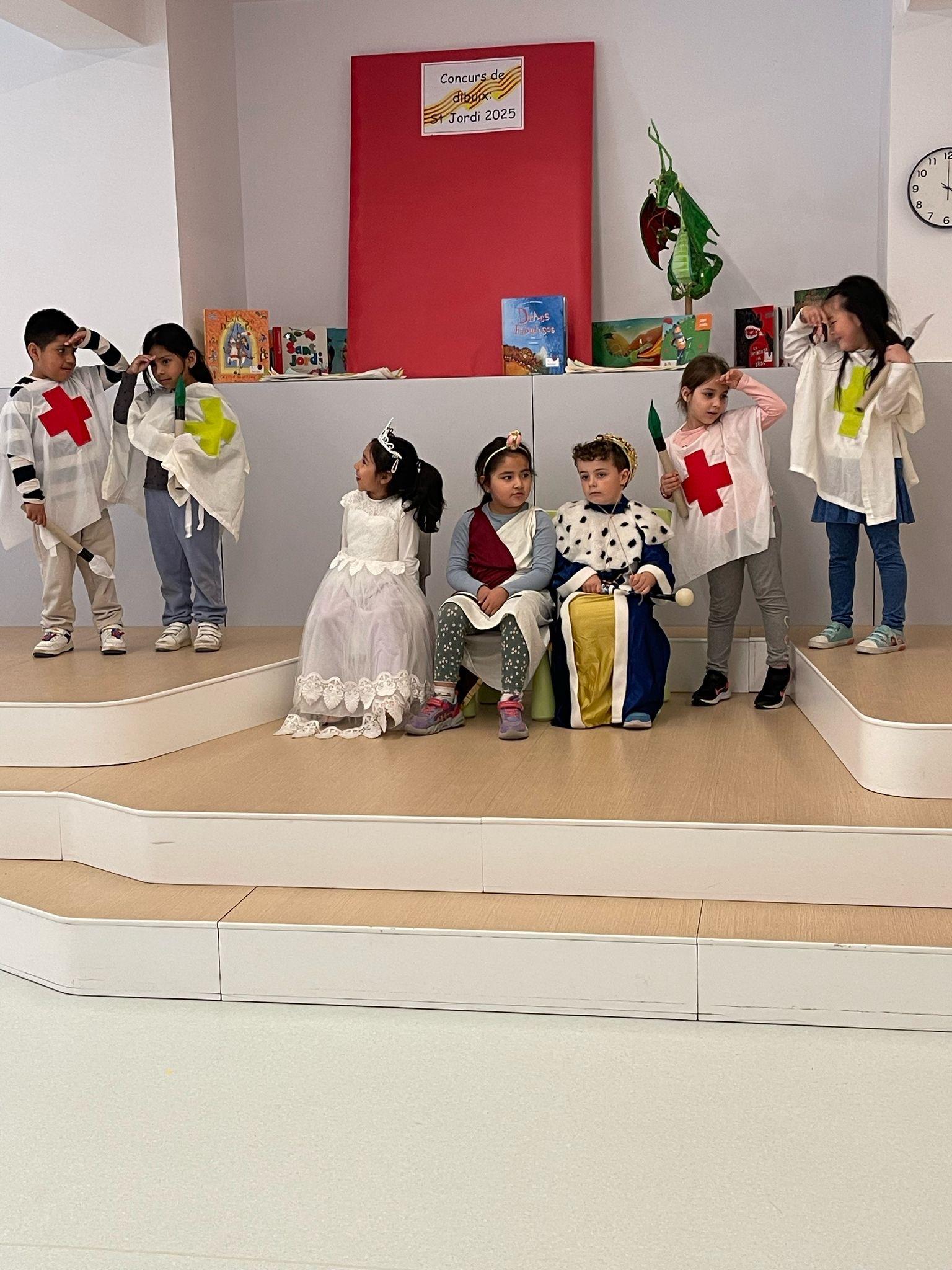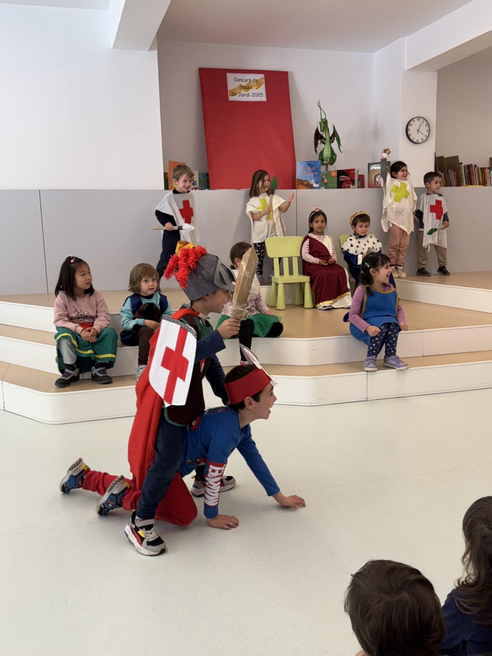 Per finalitzar amb el dia, tot l’alumnat d’aquesta etapa es va reunir a La Plaça. Allà van tenir lloc els Jocs Florals d’Infantil on les guanyadores i els guanyadors del concurs de dibuix de cada classe van sortir a recollir la seva medalla i un llibre per a la classe. Per acabar, els infants més grans del cicle, els d’I5, van fer una representació de la llegenda de Sant Jordi que va donar per acabat un dels dies més bonics de l’any.