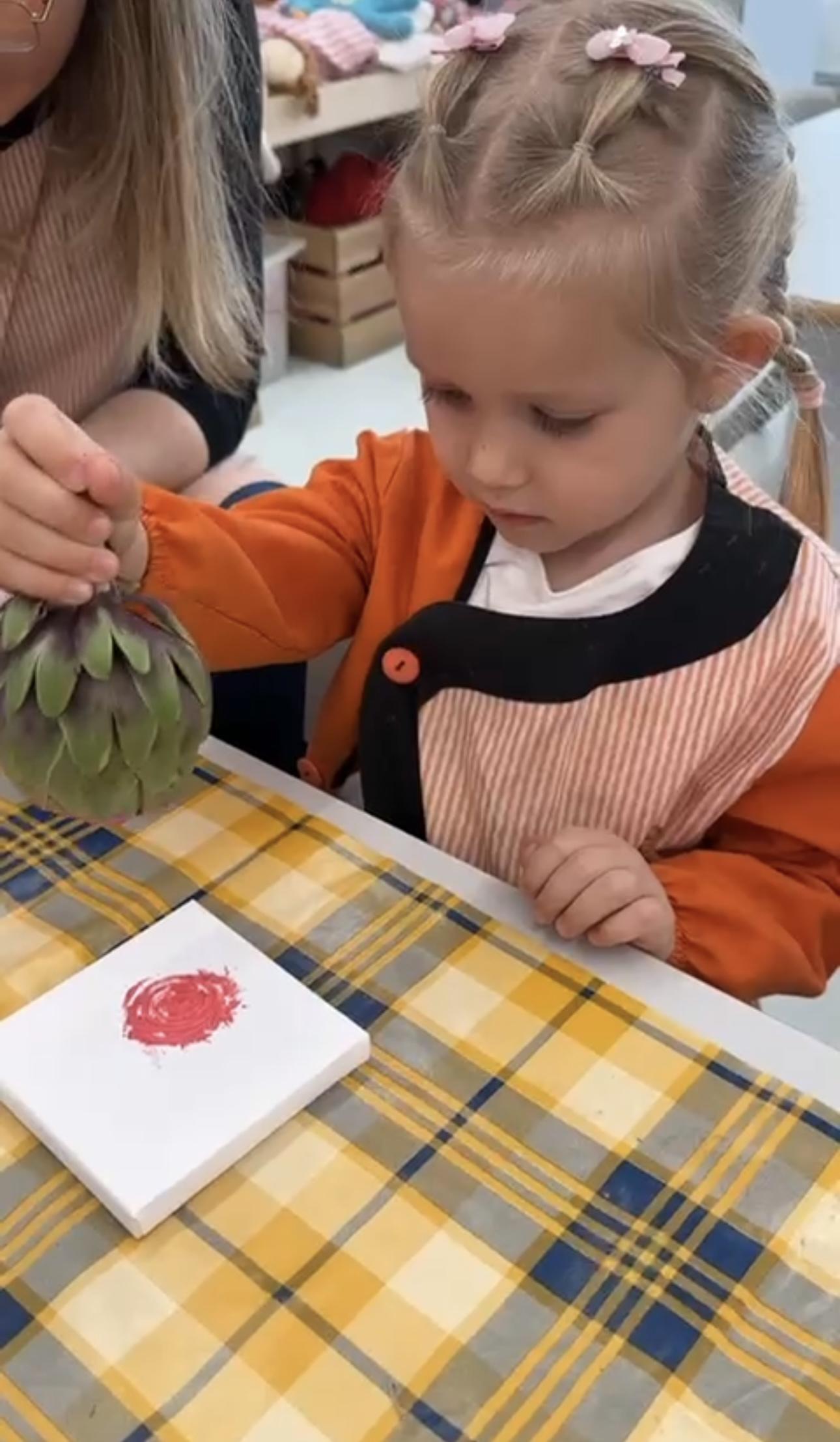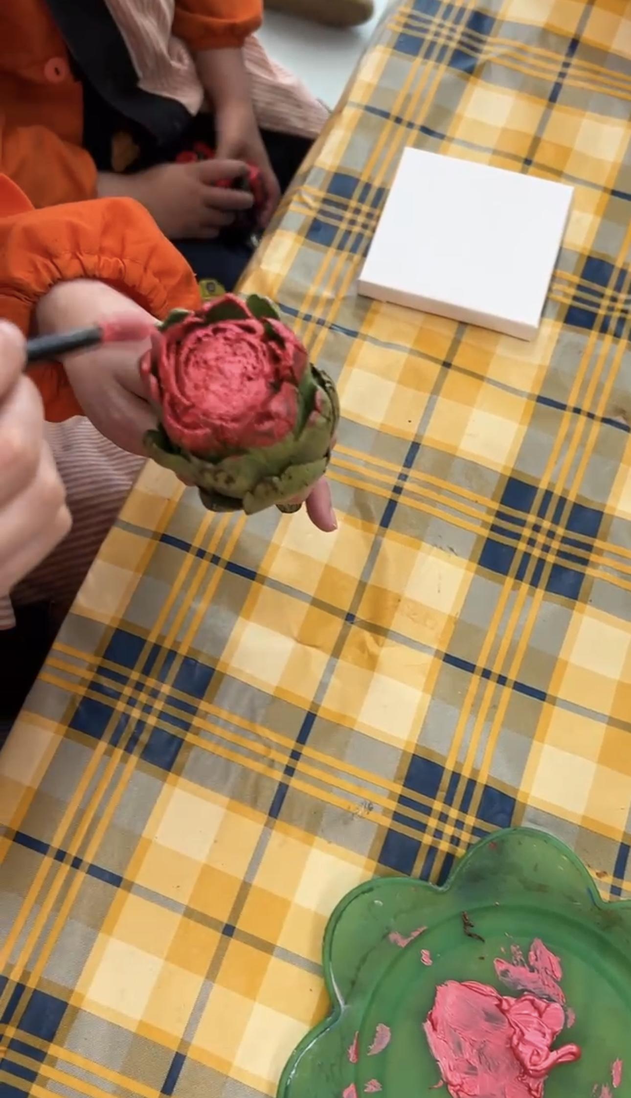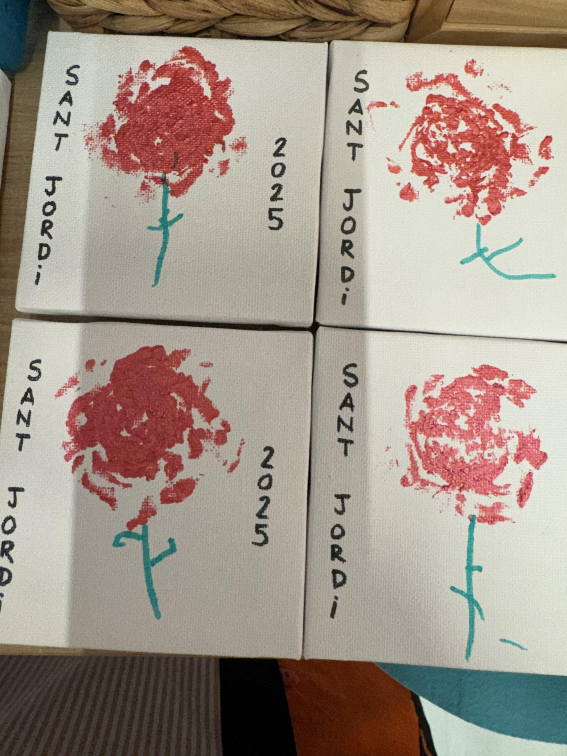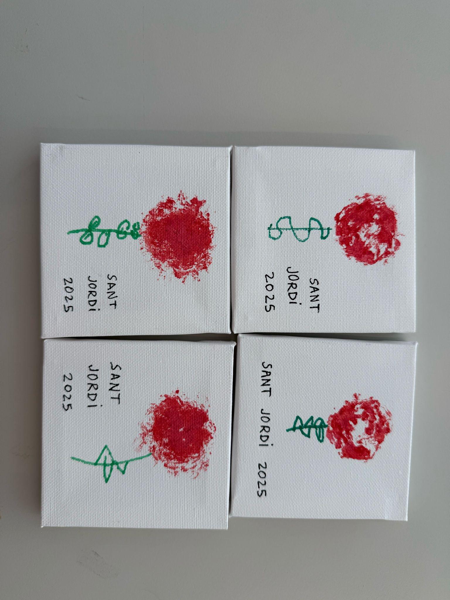 I3 i I4 van estampar una carxofa i després van acabar de fer la tija amb retolador. En canvi, els nens i nenes d’I5 ho van fer amb una plantilla i van escriure-hi “Sant Jordi”. Va quedar un detall molt bonic!