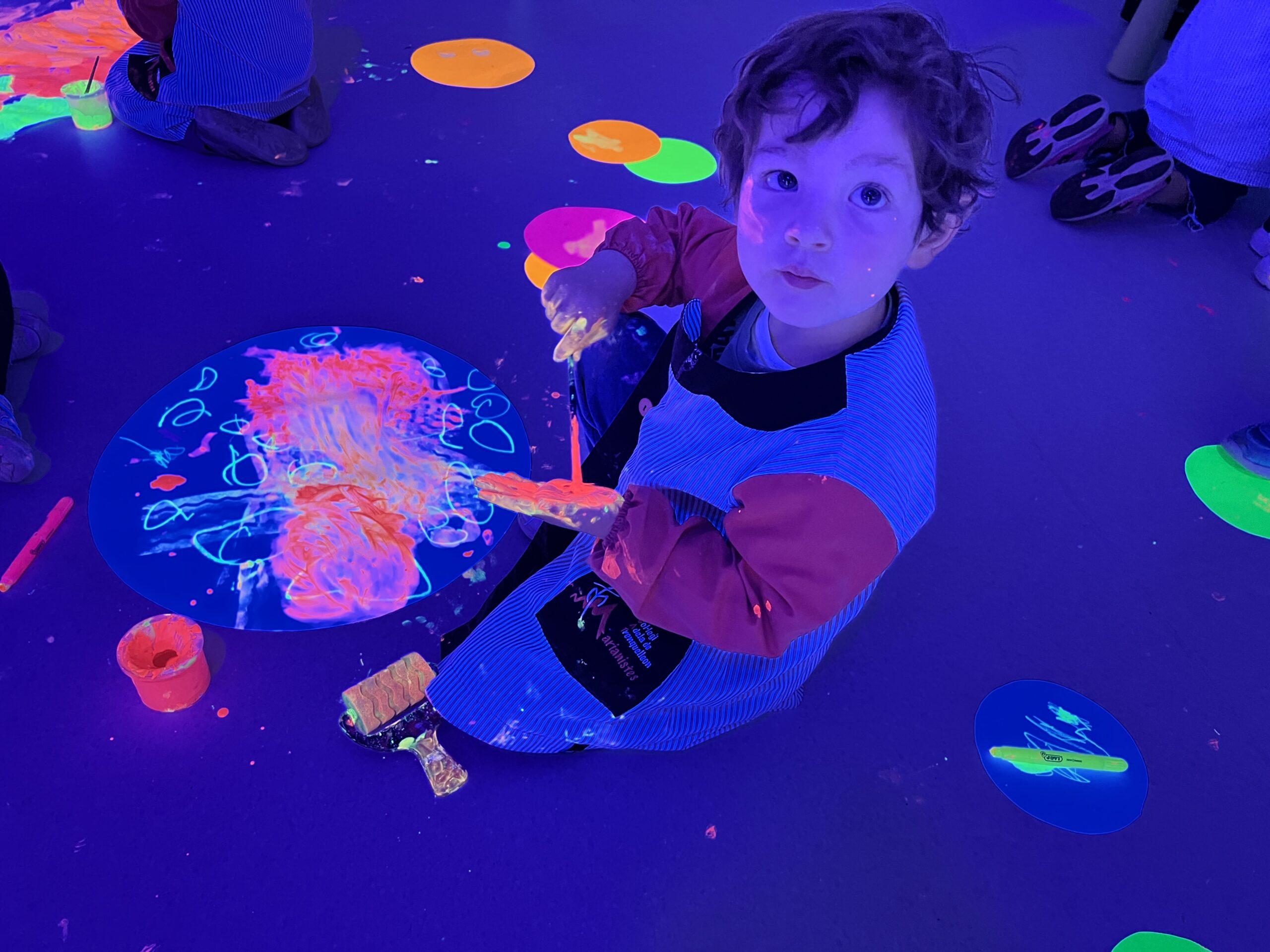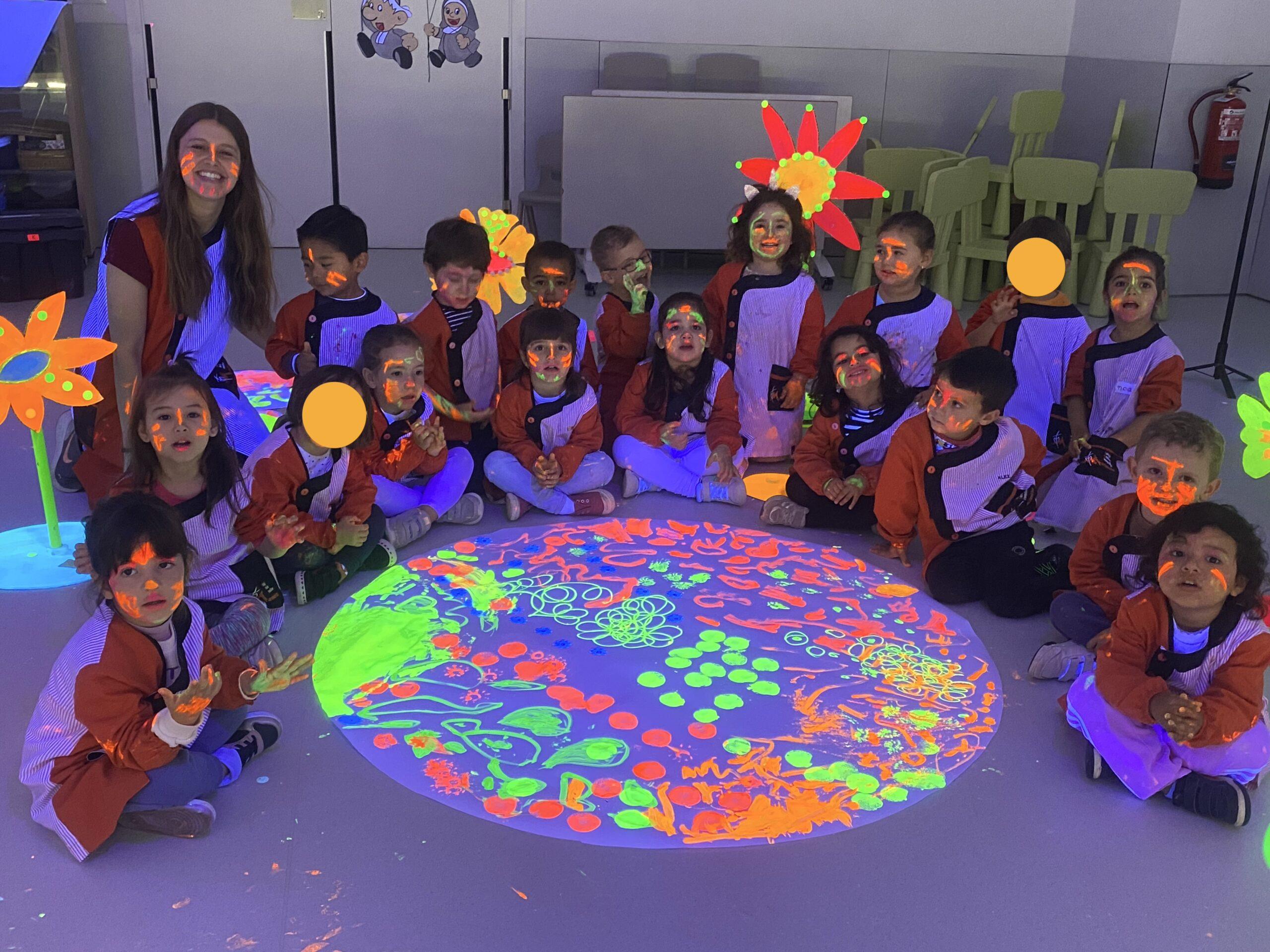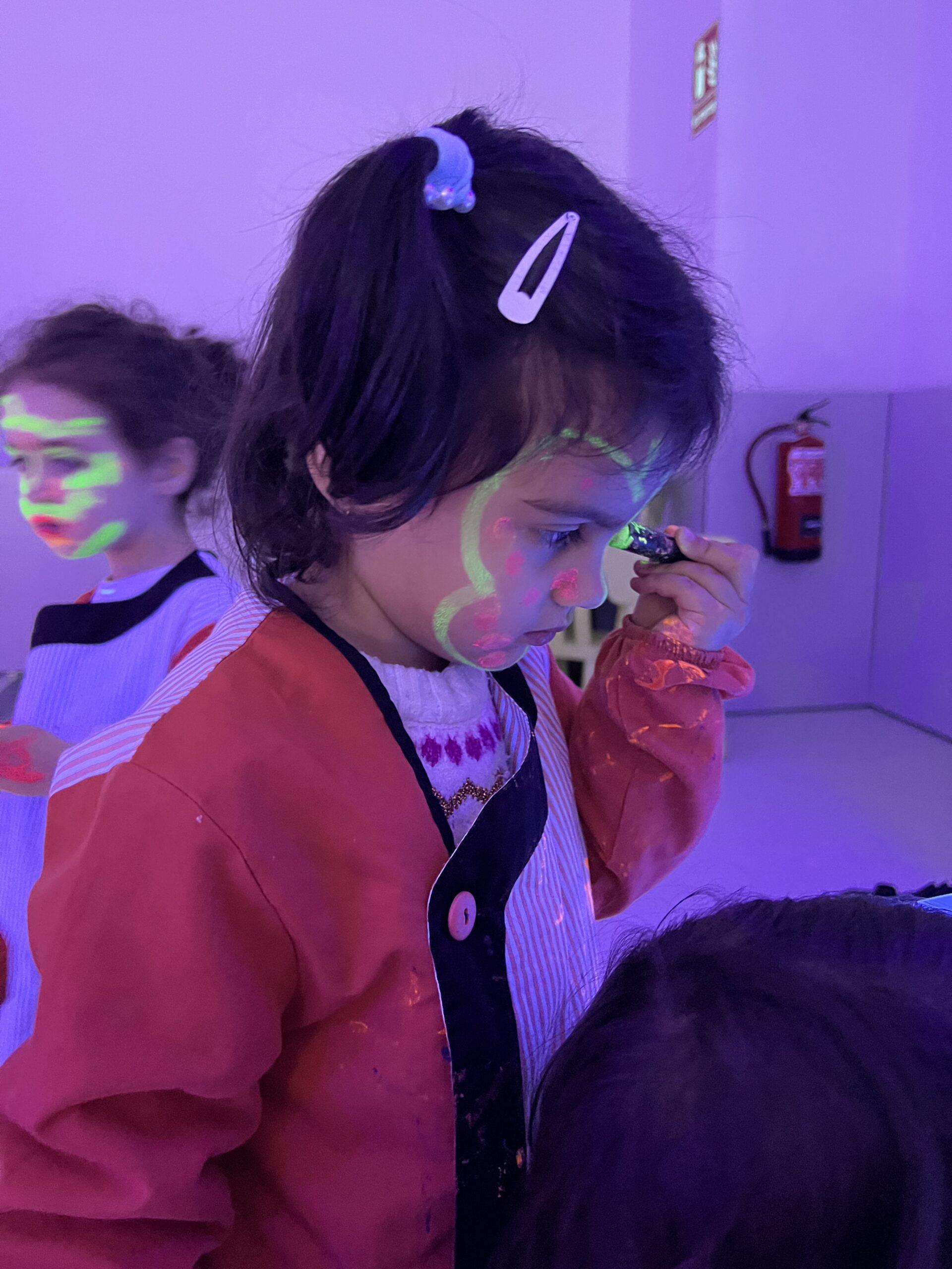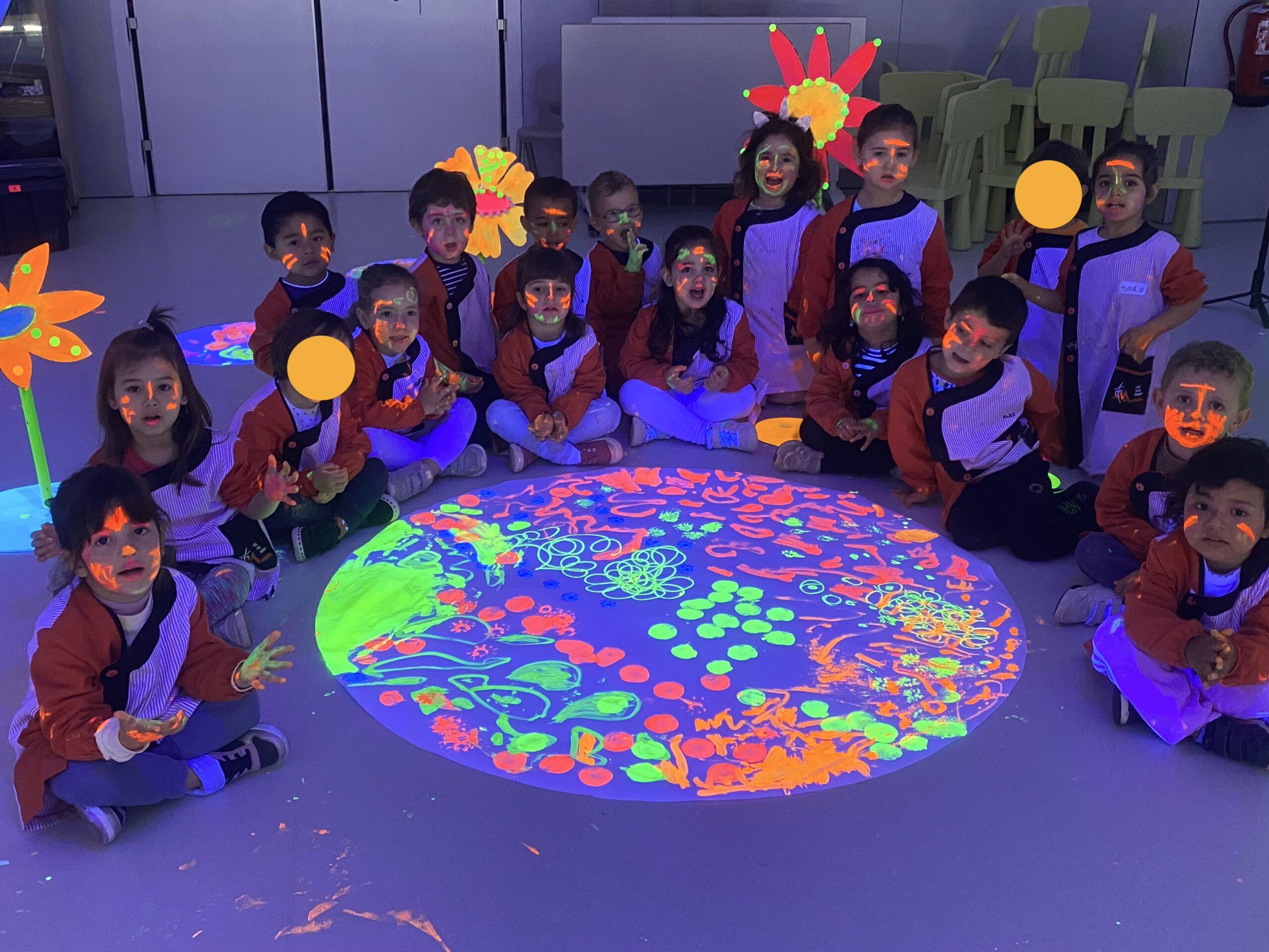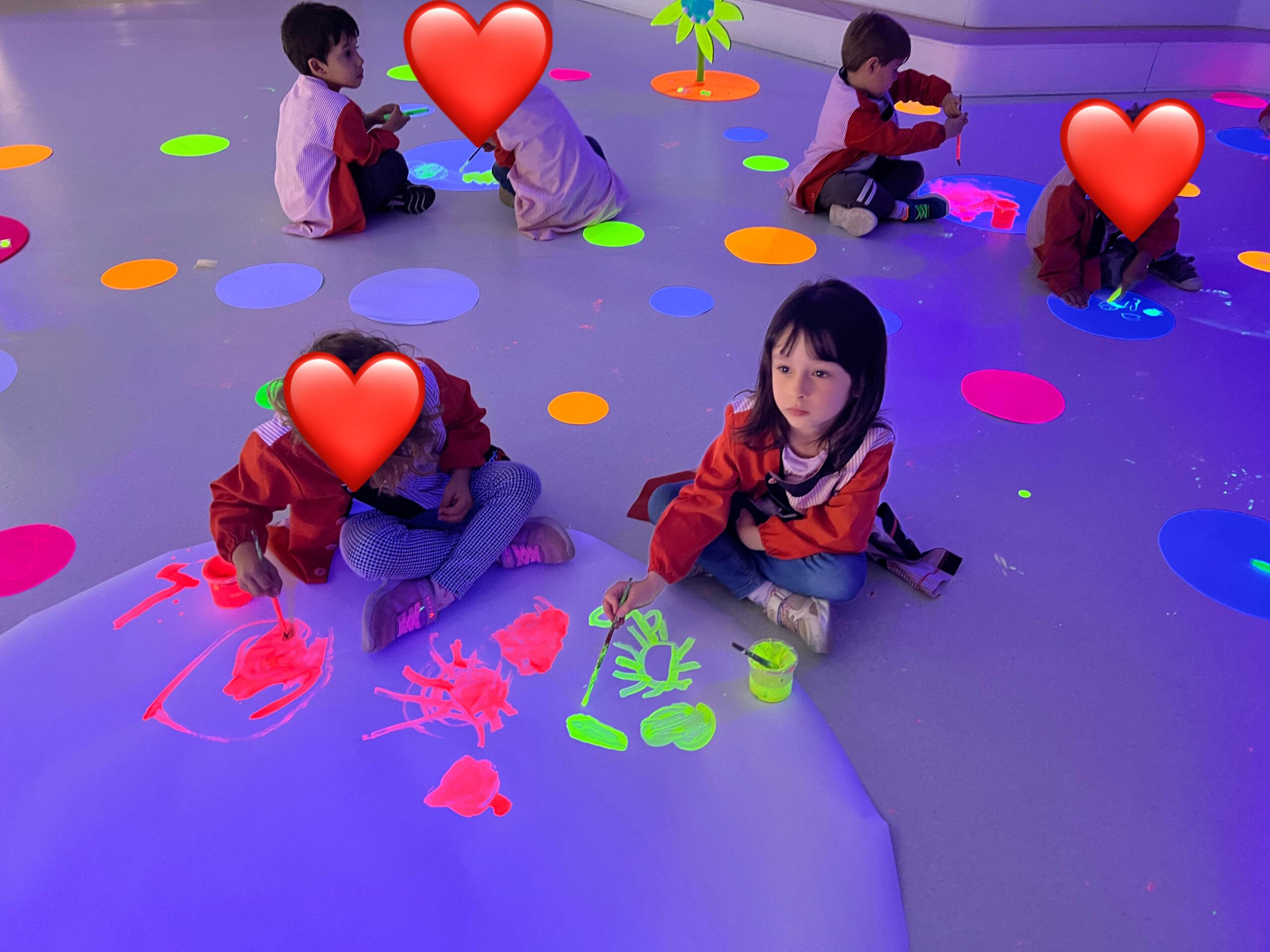 Així doncs, les noies de Koala For Kids ens han ajudat a profunditzar i continuar treballant la Yayoi. Ens van fer una recreació de l’univers creatiu de l’artista a través de tot l’espai. Mitjançant un focus de llum ultraviolada, flors, com les que feia la Yayoi, i cercles de colors, van convidar els nens i a les nenes a entrar dins de la instal·lació artística creada simbolitzant l’entrada a una de les obres d’aquesta artista. Dins d’aquest espai, els infants van poder pintar, dibuixar i maquillar-se amb pintura fluorescent tal com feia l’artista. Va ser una experiència molt divertida i mireu quines imatges més boniques van quedar!