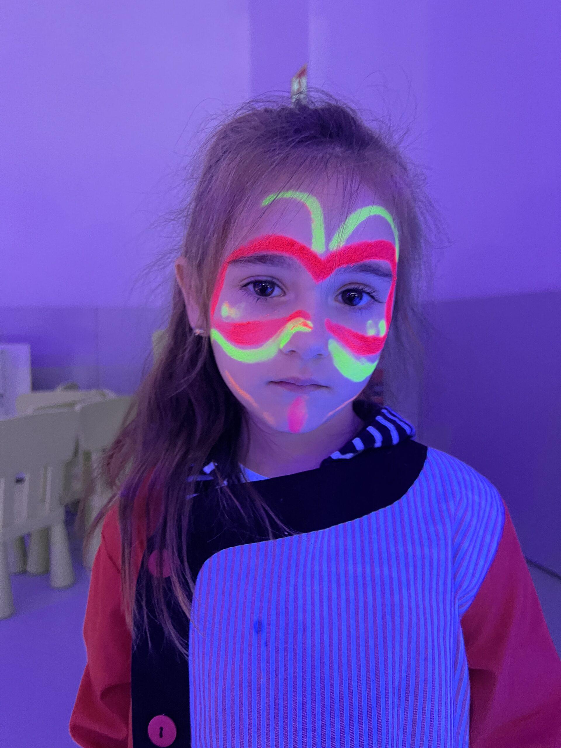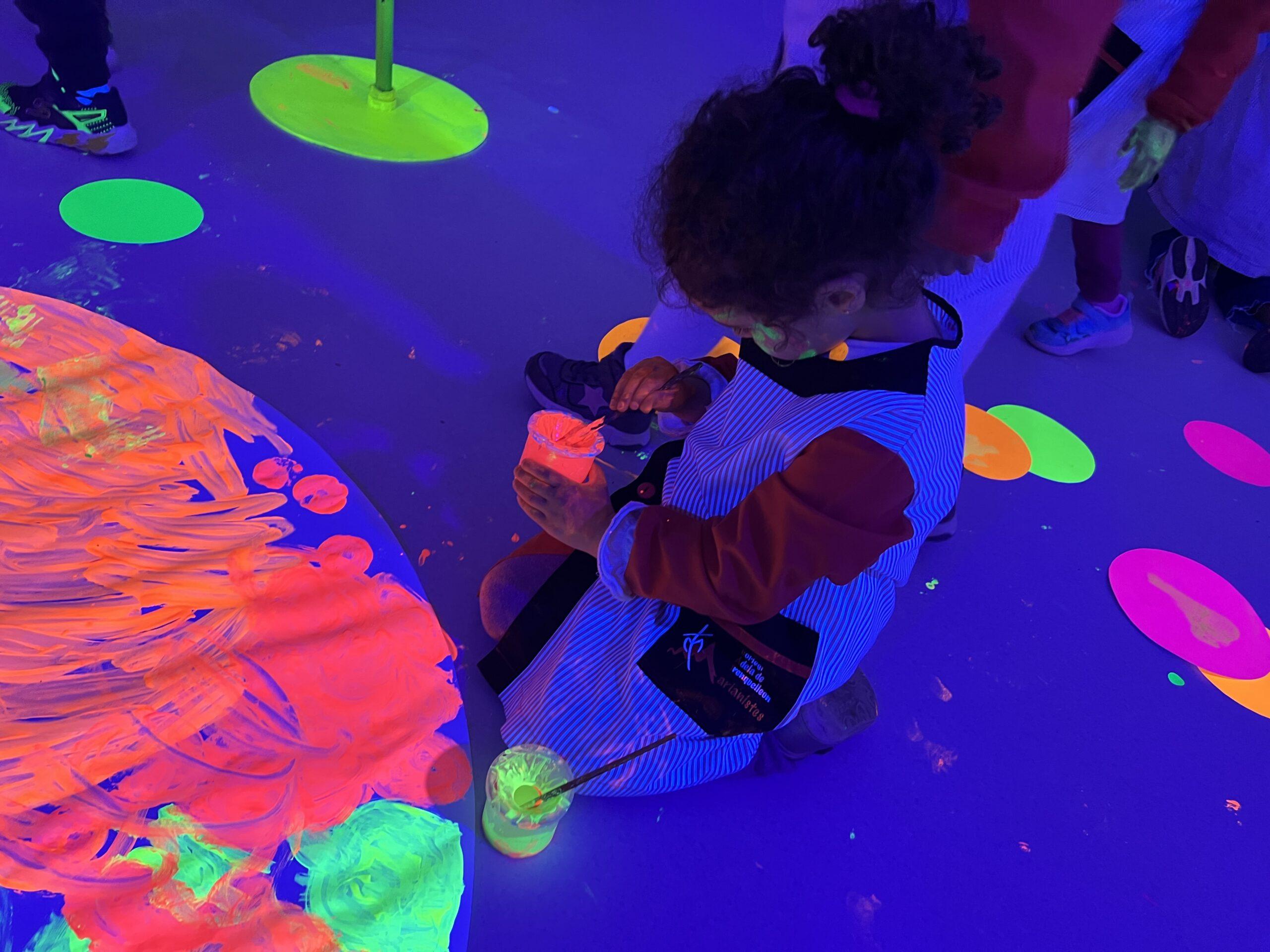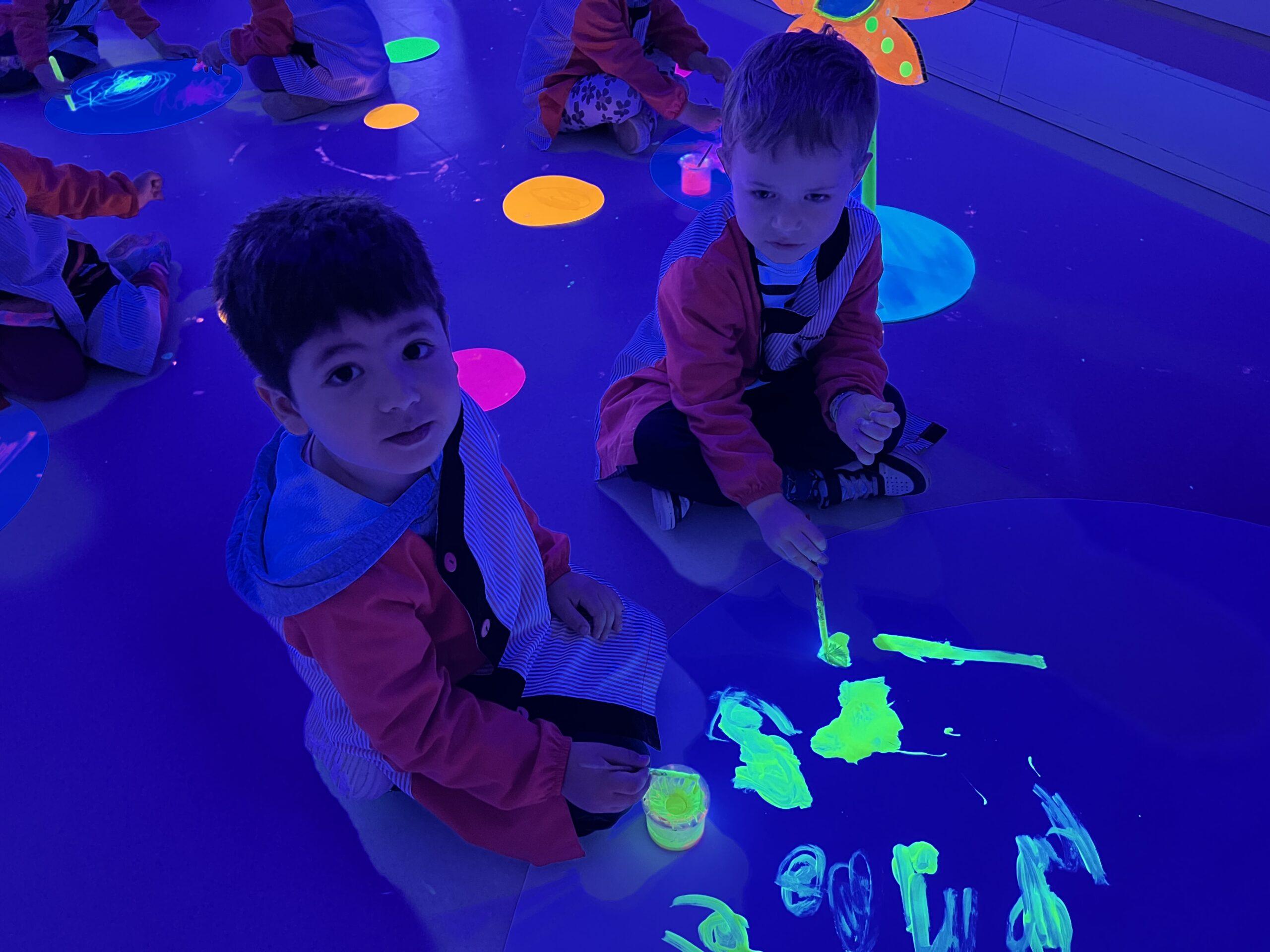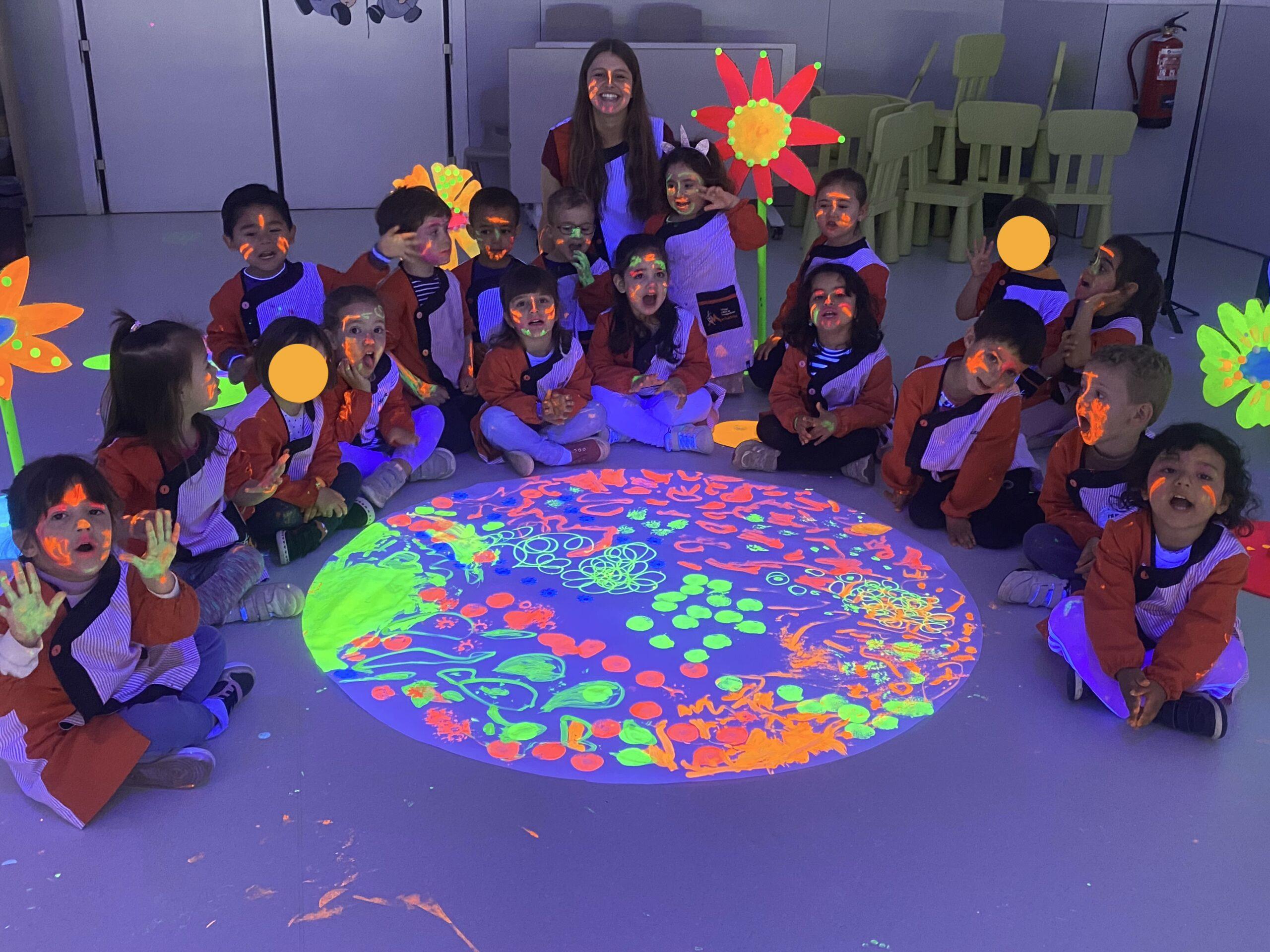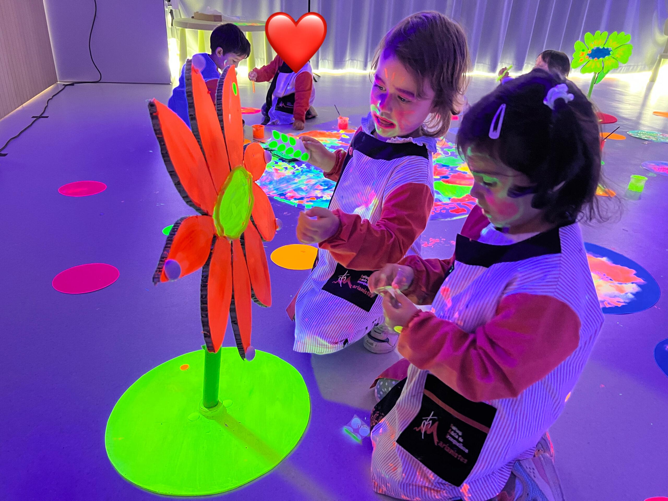 Així doncs, les noies de Koala For Kids ens han ajudat a profunditzar i continuar treballant la Yayoi. Ens van fer una recreació de l’univers creatiu de l’artista a través de tot l’espai. Mitjançant un focus de llum ultraviolada, flors, com les que feia la Yayoi, i cercles de colors, van convidar els nens i a les nenes a entrar dins de la instal·lació artística creada simbolitzant l’entrada a una de les obres d’aquesta artista. Dins d’aquest espai, els infants van poder pintar, dibuixar i maquillar-se amb pintura fluorescent tal com feia l’artista. Va ser una experiència molt divertida i mireu quines imatges més boniques van quedar!