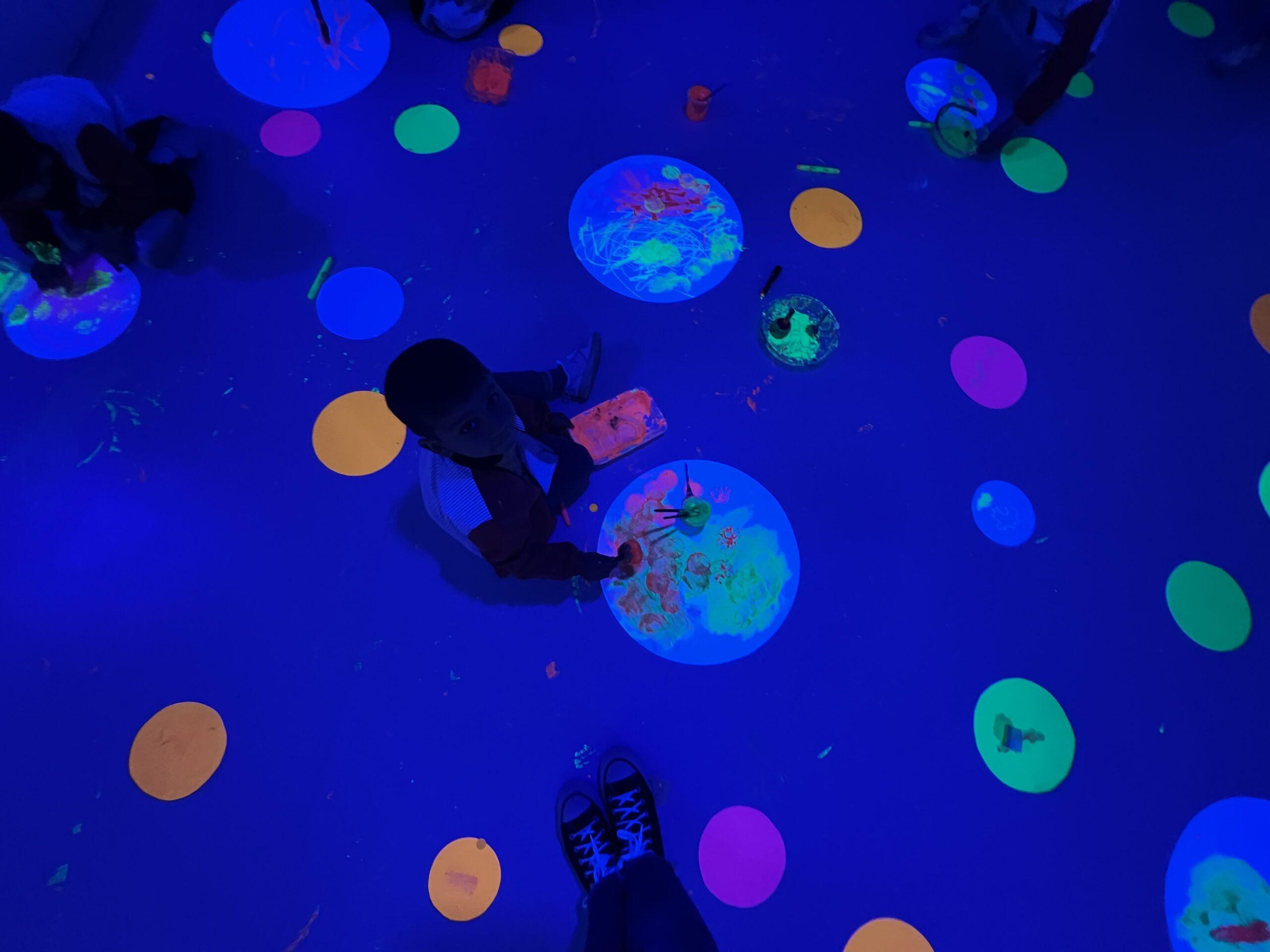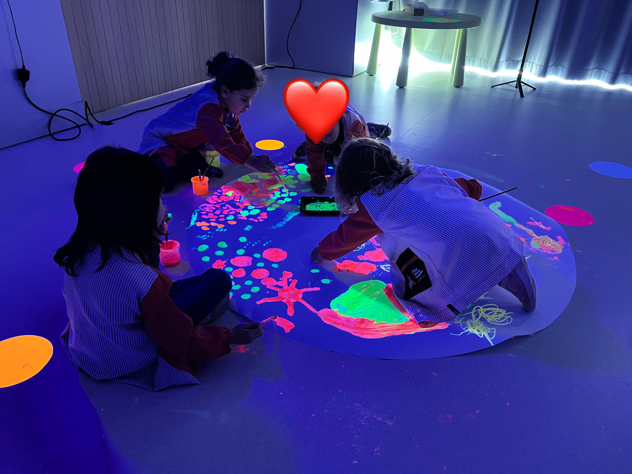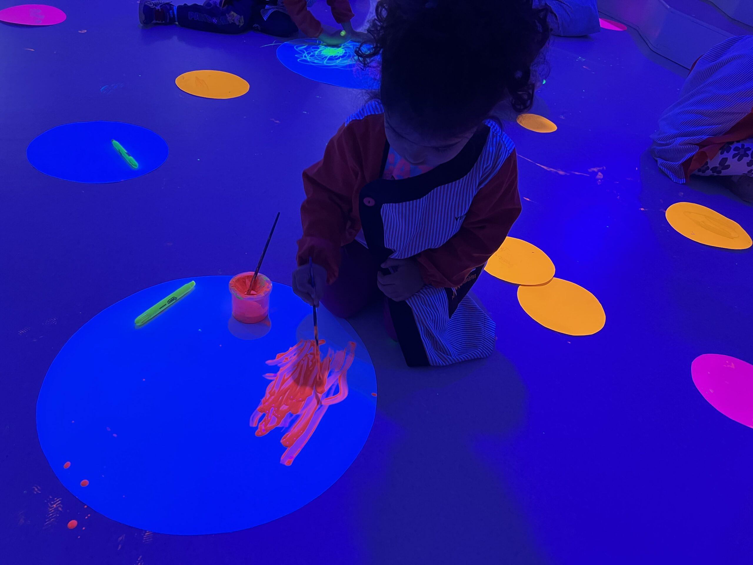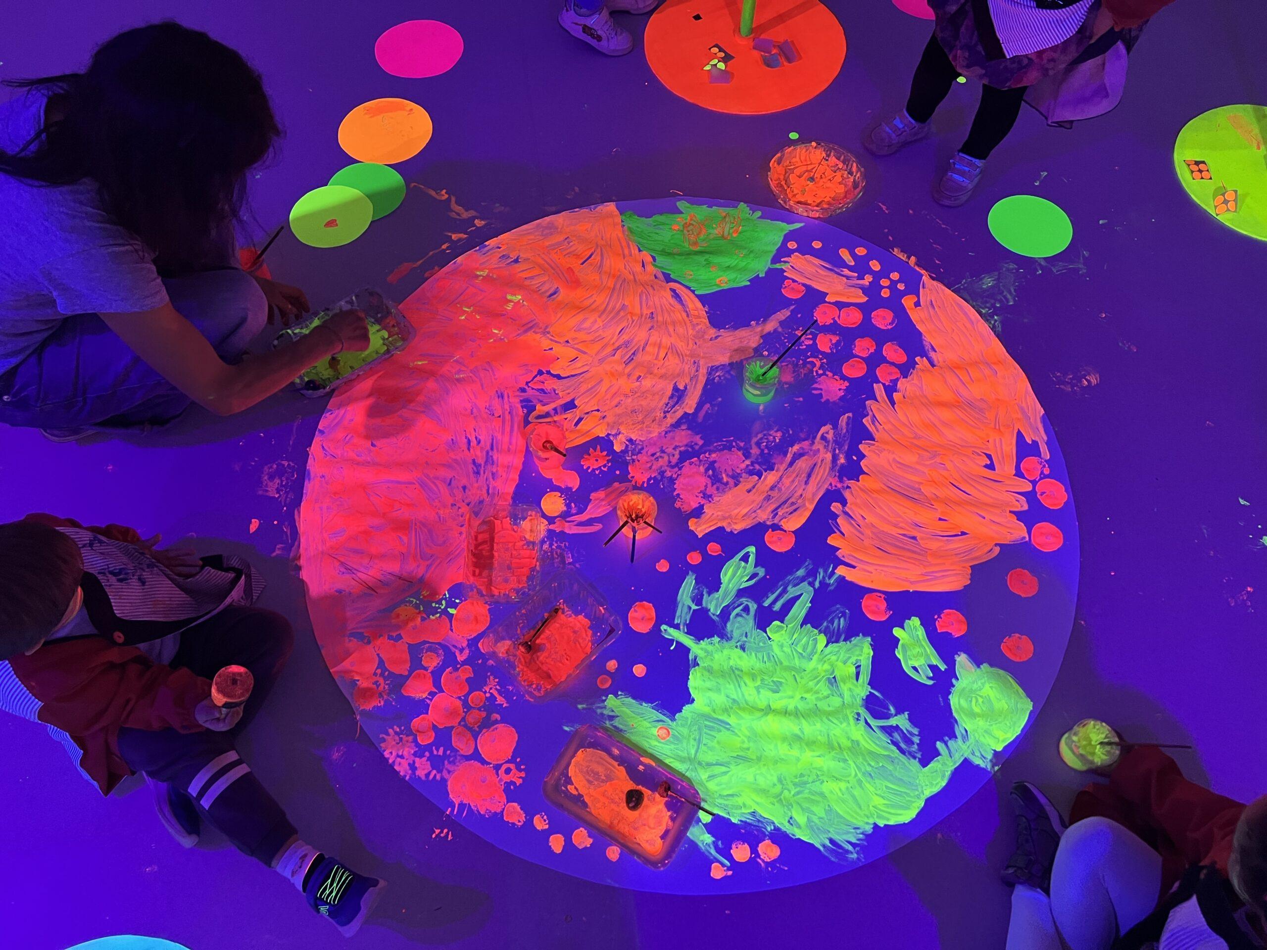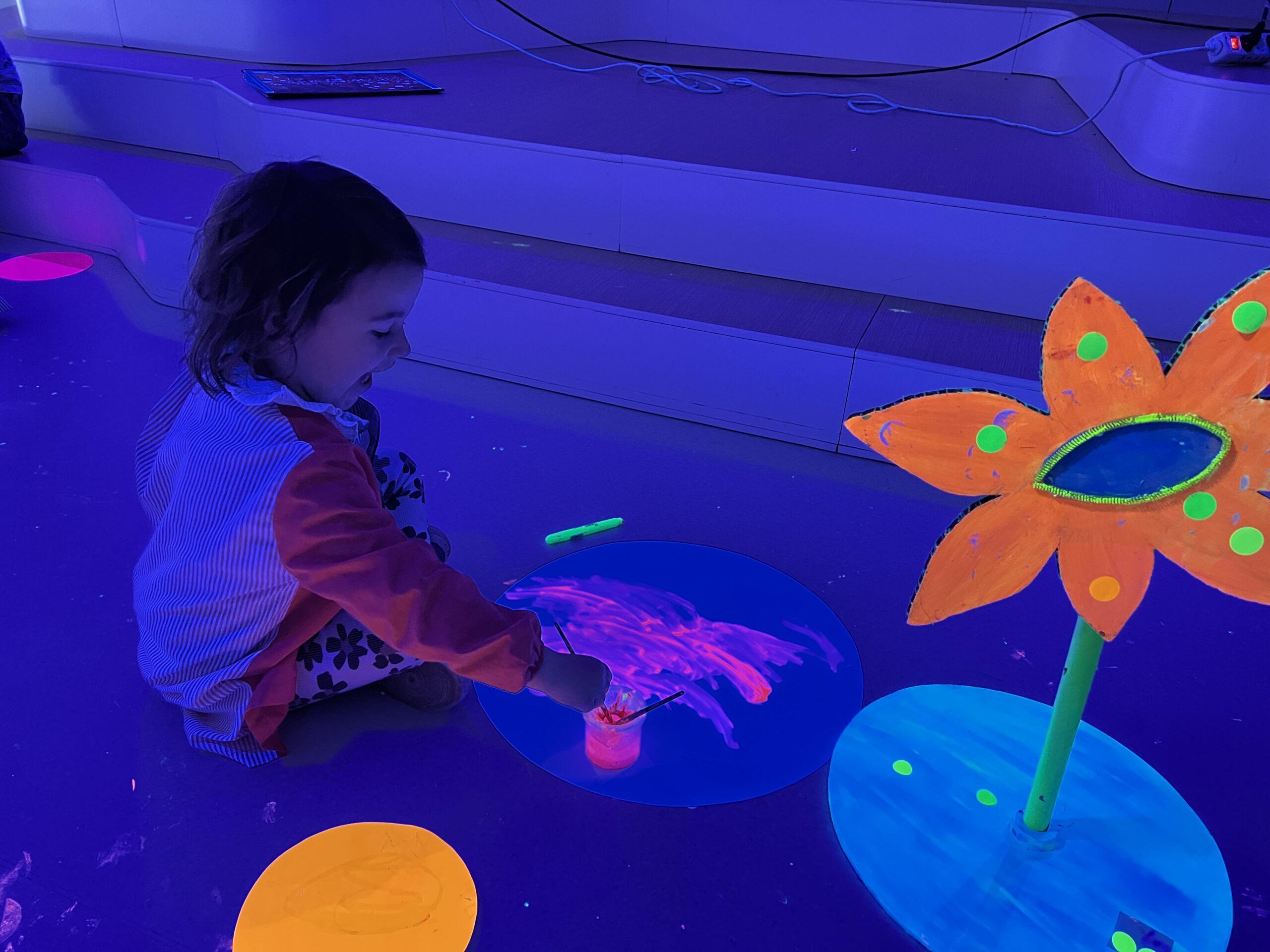 Així doncs, les noies de Koala For Kids ens han ajudat a profunditzar i continuar treballant la Yayoi. Ens van fer una recreació de l’univers creatiu de l’artista a través de tot l’espai. Mitjançant un focus de llum ultraviolada, flors, com les que feia la Yayoi, i cercles de colors, van convidar els nens i a les nenes a entrar dins de la instal·lació artística creada simbolitzant l’entrada a una de les obres d’aquesta artista. Dins d’aquest espai, els infants van poder pintar, dibuixar i maquillar-se amb pintura fluorescent tal com feia l’artista. Va ser una experiència molt divertida i mireu quines imatges més boniques van quedar!