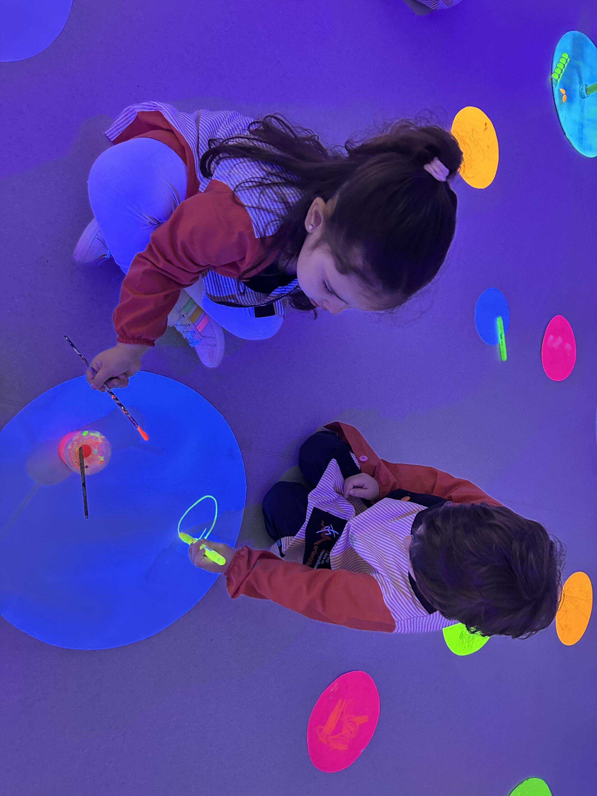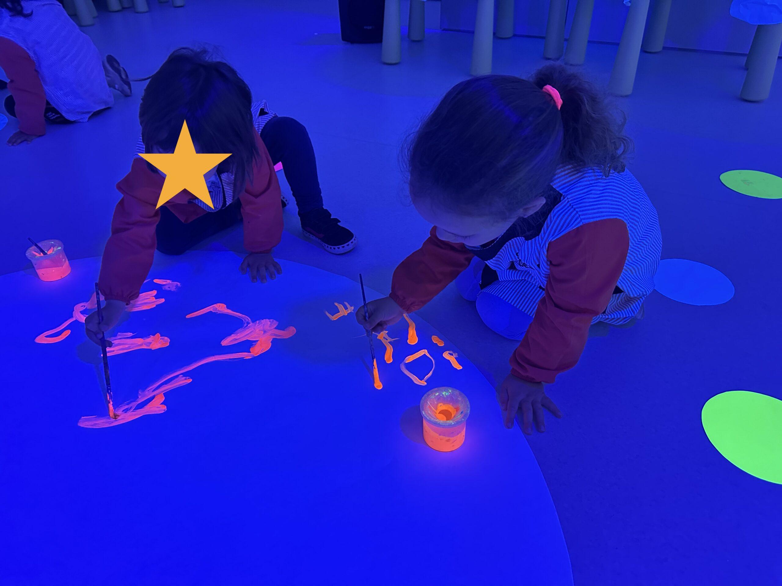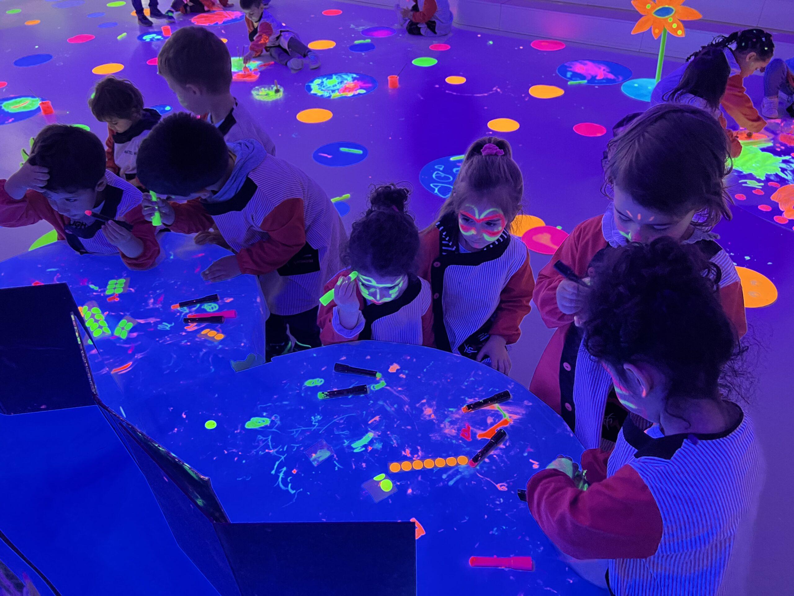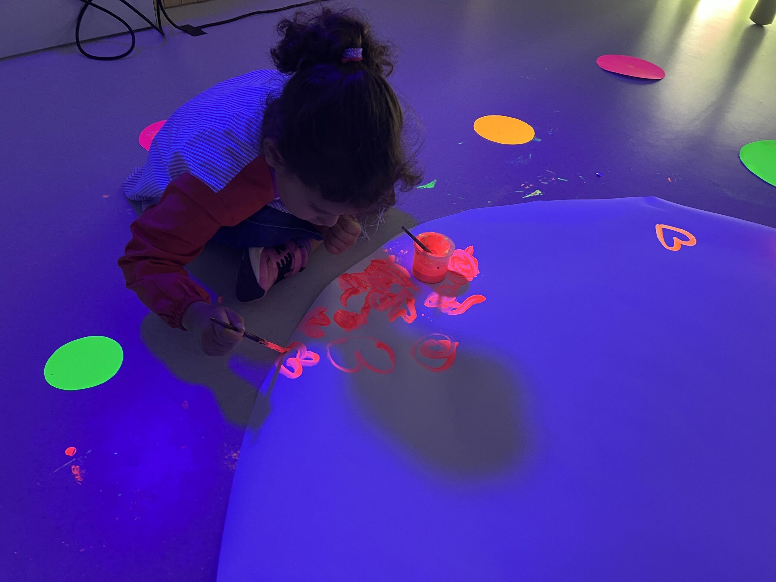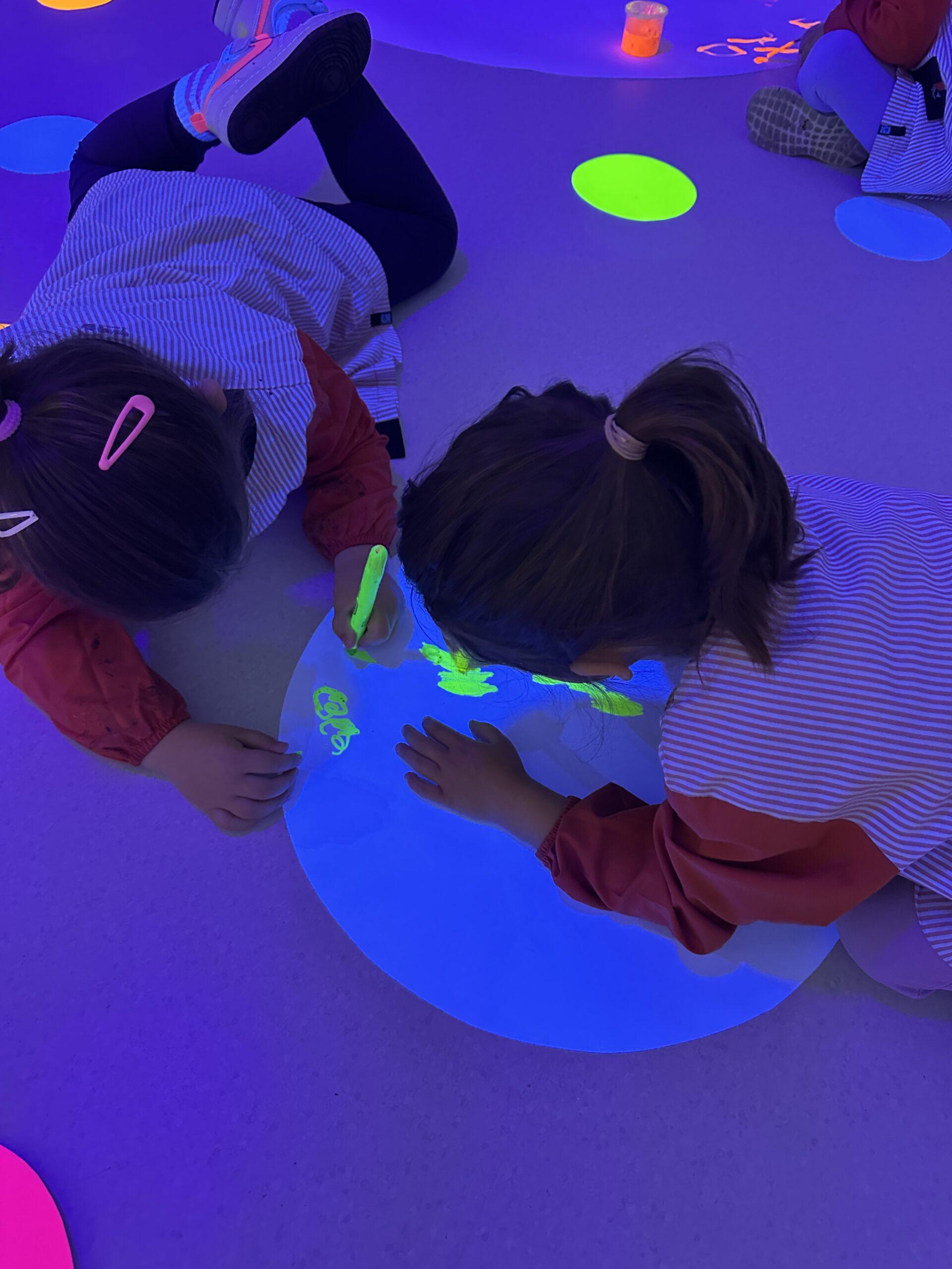 Així doncs, les noies de Koala For Kids ens han ajudat a profunditzar i continuar treballant la Yayoi. Ens van fer una recreació de l’univers creatiu de l’artista a través de tot l’espai. Mitjançant un focus de llum ultraviolada, flors, com les que feia la Yayoi, i cercles de colors, van convidar els nens i a les nenes a entrar dins de la instal·lació artística creada simbolitzant l’entrada a una de les obres d’aquesta artista. Dins d’aquest espai, els infants van poder pintar, dibuixar i maquillar-se amb pintura fluorescent tal com feia l’artista. Va ser una experiència molt divertida i mireu quines imatges més boniques van quedar!