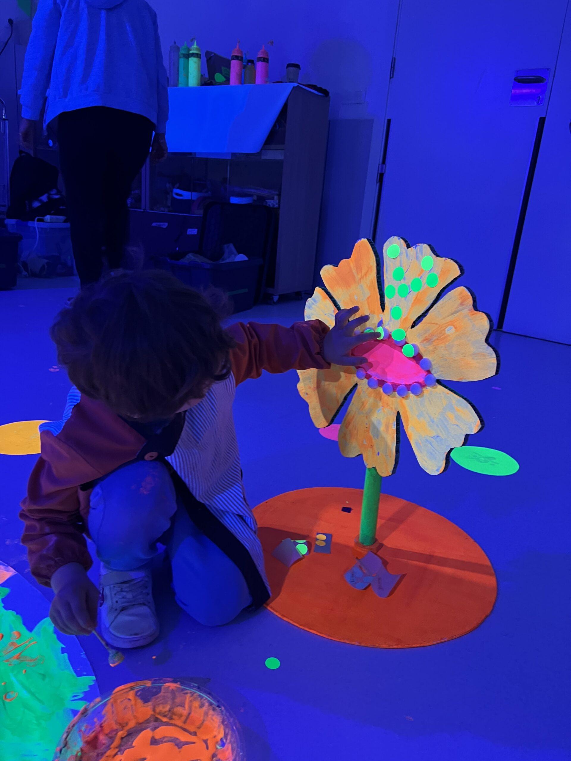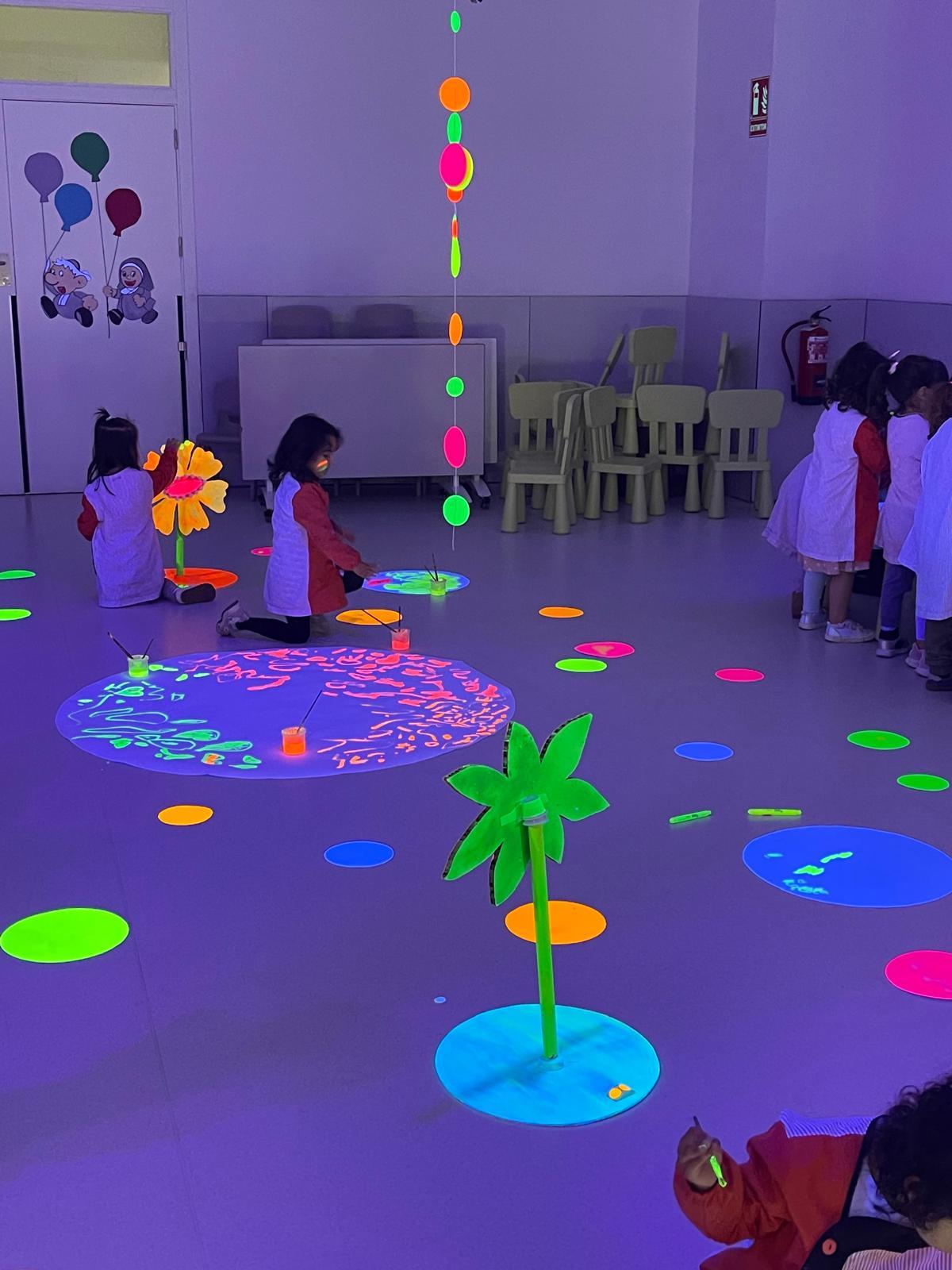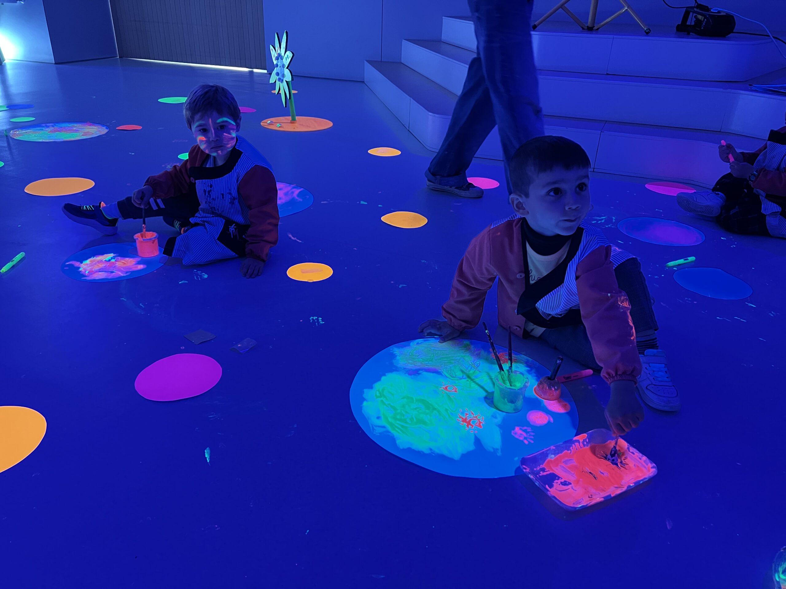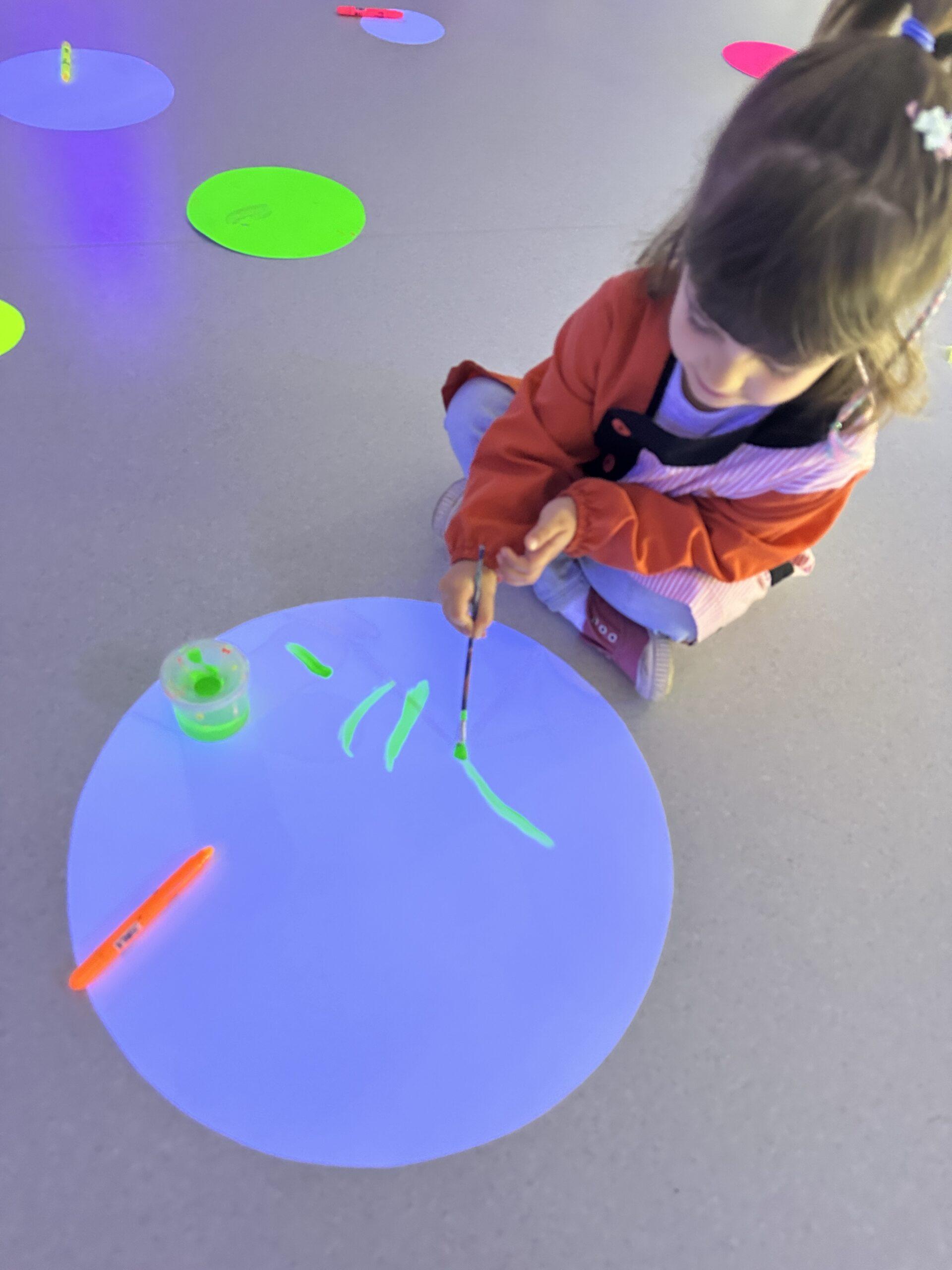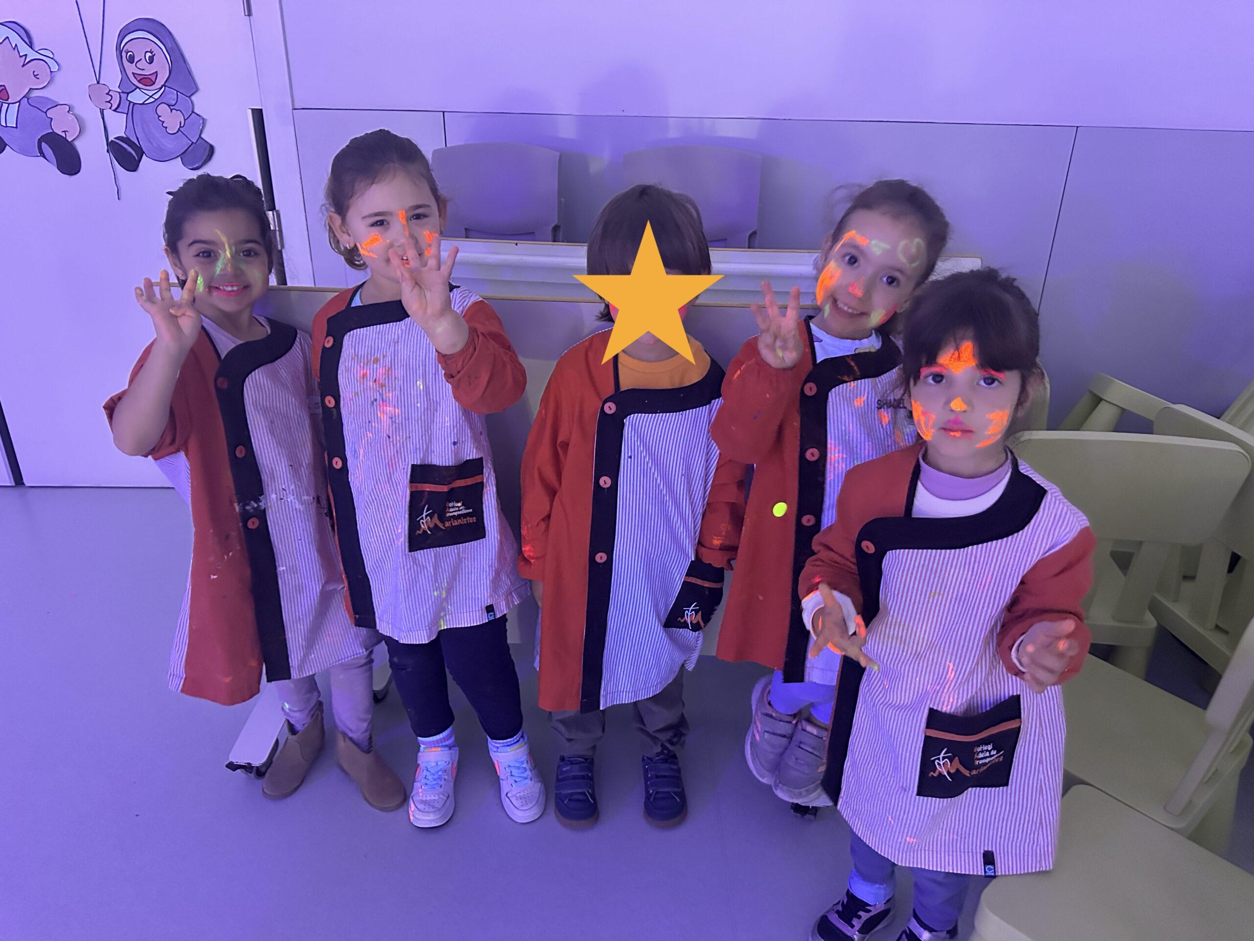 Així doncs, les noies de Koala For Kids ens han ajudat a profunditzar i continuar treballant la Yayoi. Ens van fer una recreació de l’univers creatiu de l’artista a través de tot l’espai. Mitjançant un focus de llum ultraviolada, flors, com les que feia la Yayoi, i cercles de colors, van convidar els nens i a les nenes a entrar dins de la instal·lació artística creada simbolitzant l’entrada a una de les obres d’aquesta artista. Dins d’aquest espai, els infants van poder pintar, dibuixar i maquillar-se amb pintura fluorescent tal com feia l’artista. Va ser una experiència molt divertida i mireu quines imatges més boniques van quedar!