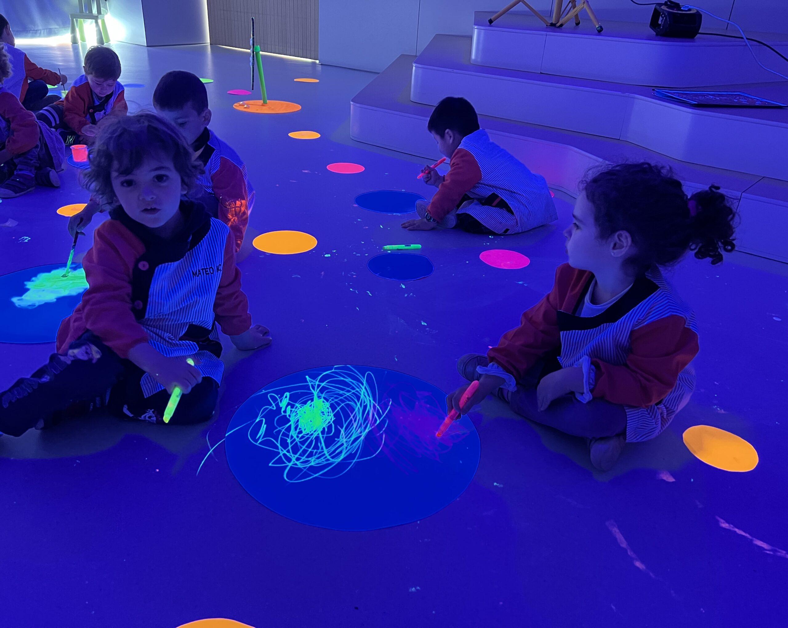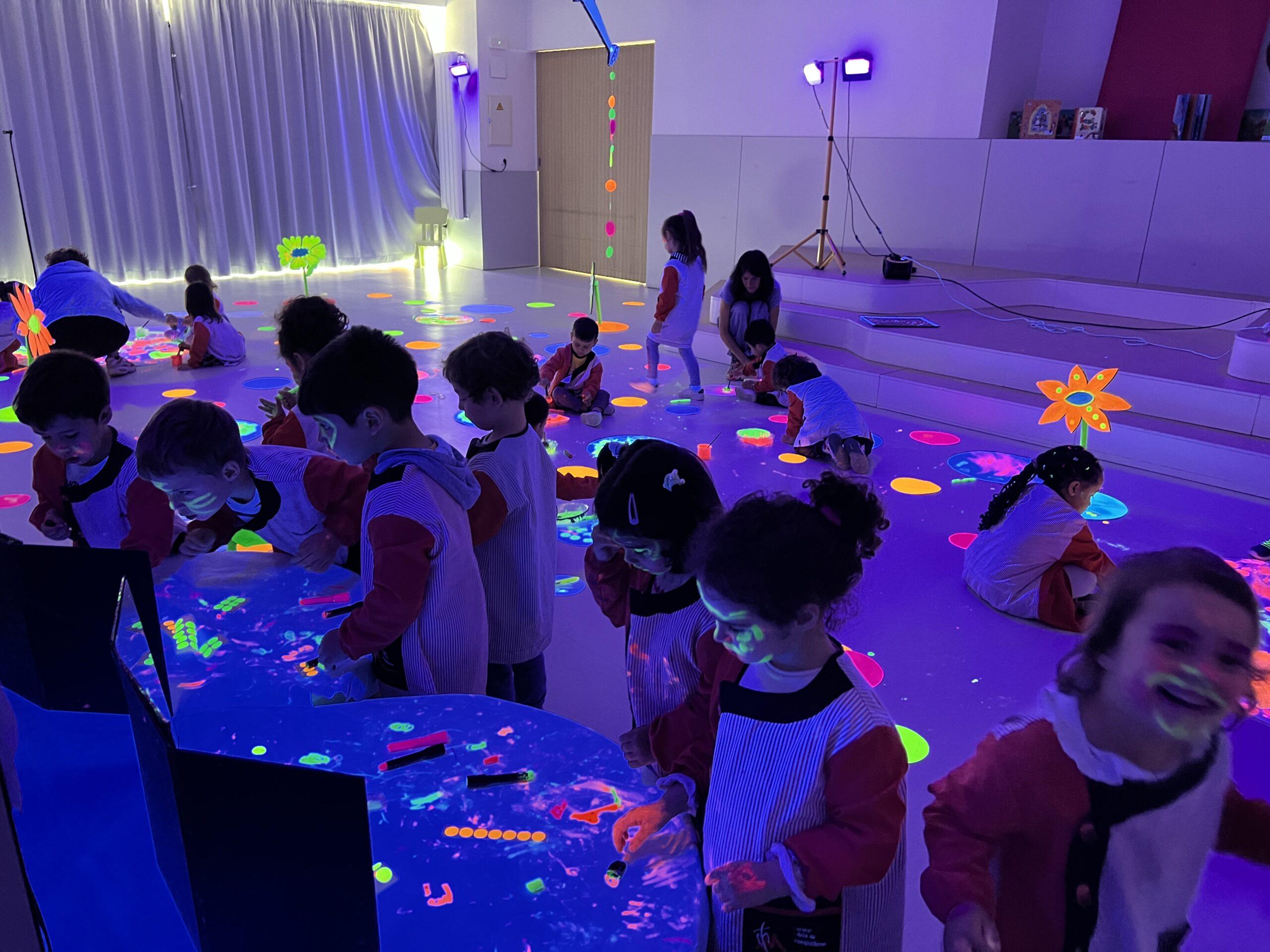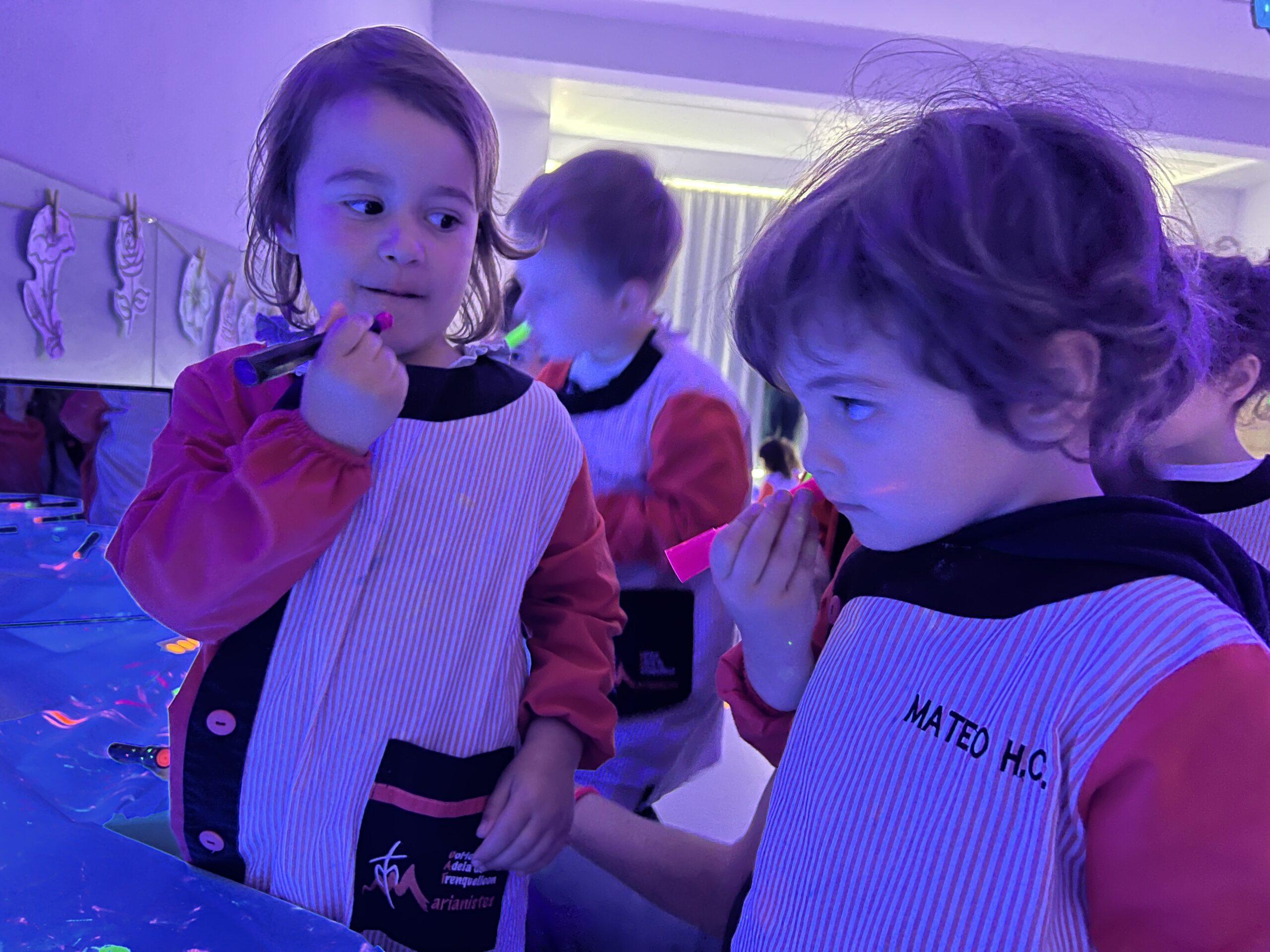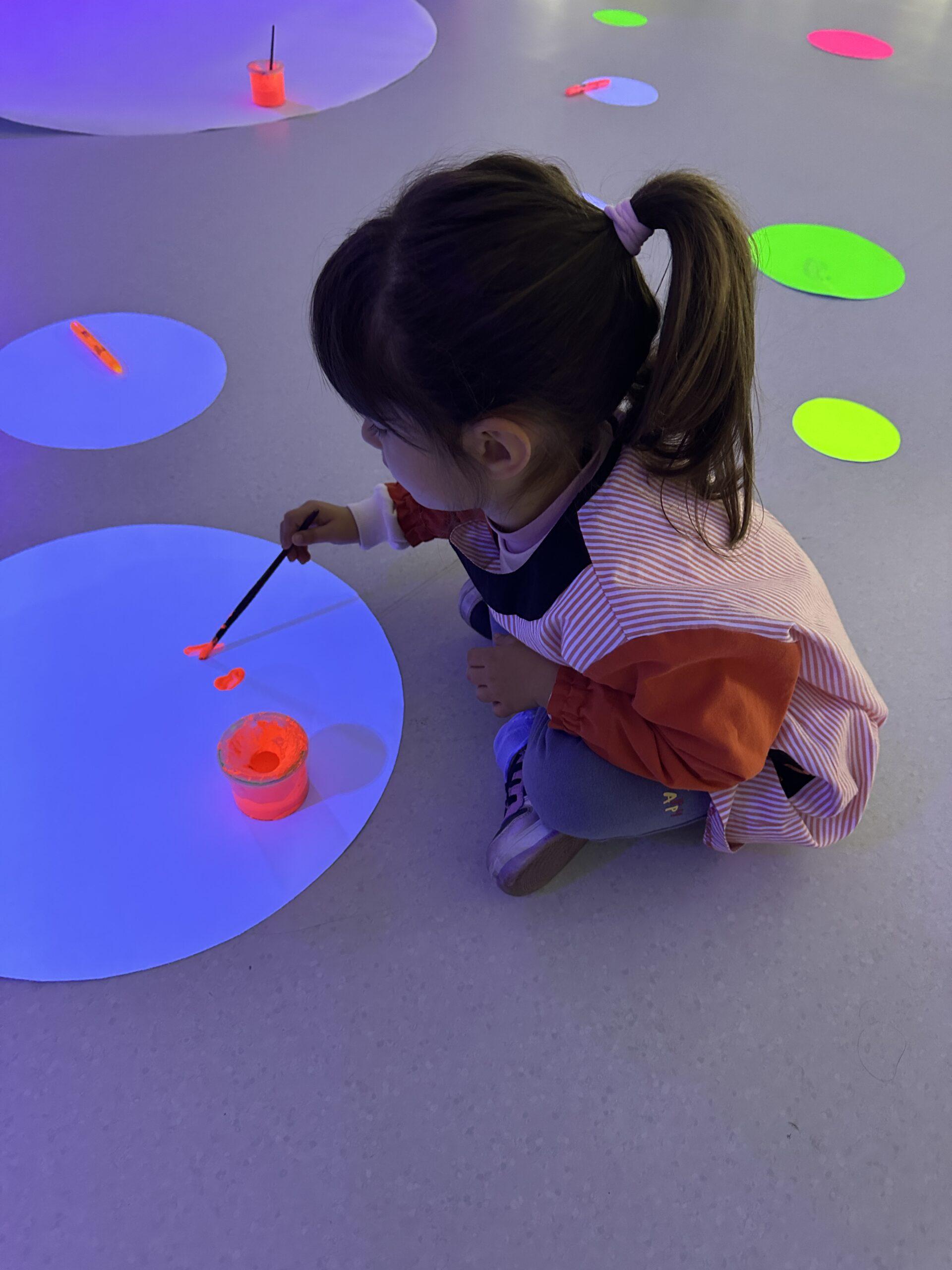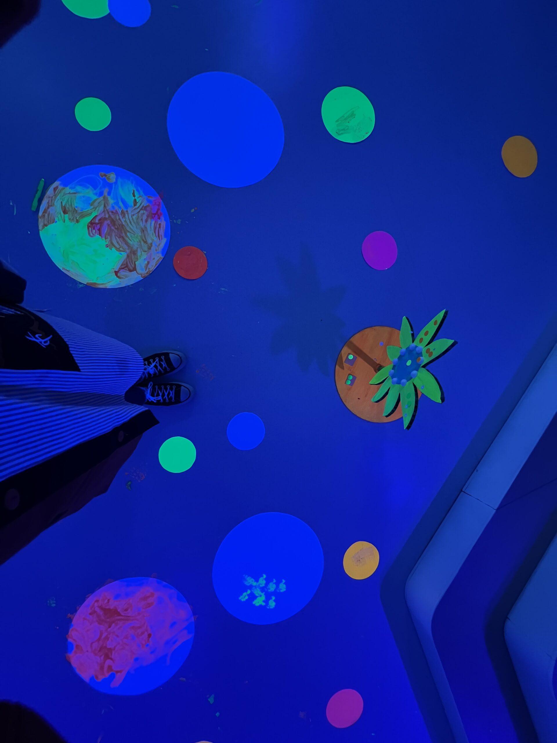 Així doncs, les noies de Koala For Kids ens han ajudat a profunditzar i continuar treballant la Yayoi. Ens van fer una recreació de l’univers creatiu de l’artista a través de tot l’espai. Mitjançant un focus de llum ultraviolada, flors, com les que feia la Yayoi, i cercles de colors, van convidar els nens i a les nenes a entrar dins de la instal·lació artística creada simbolitzant l’entrada a una de les obres d’aquesta artista. Dins d’aquest espai, els infants van poder pintar, dibuixar i maquillar-se amb pintura fluorescent tal com feia l’artista. Va ser una experiència molt divertida i mireu quines imatges més boniques van quedar!