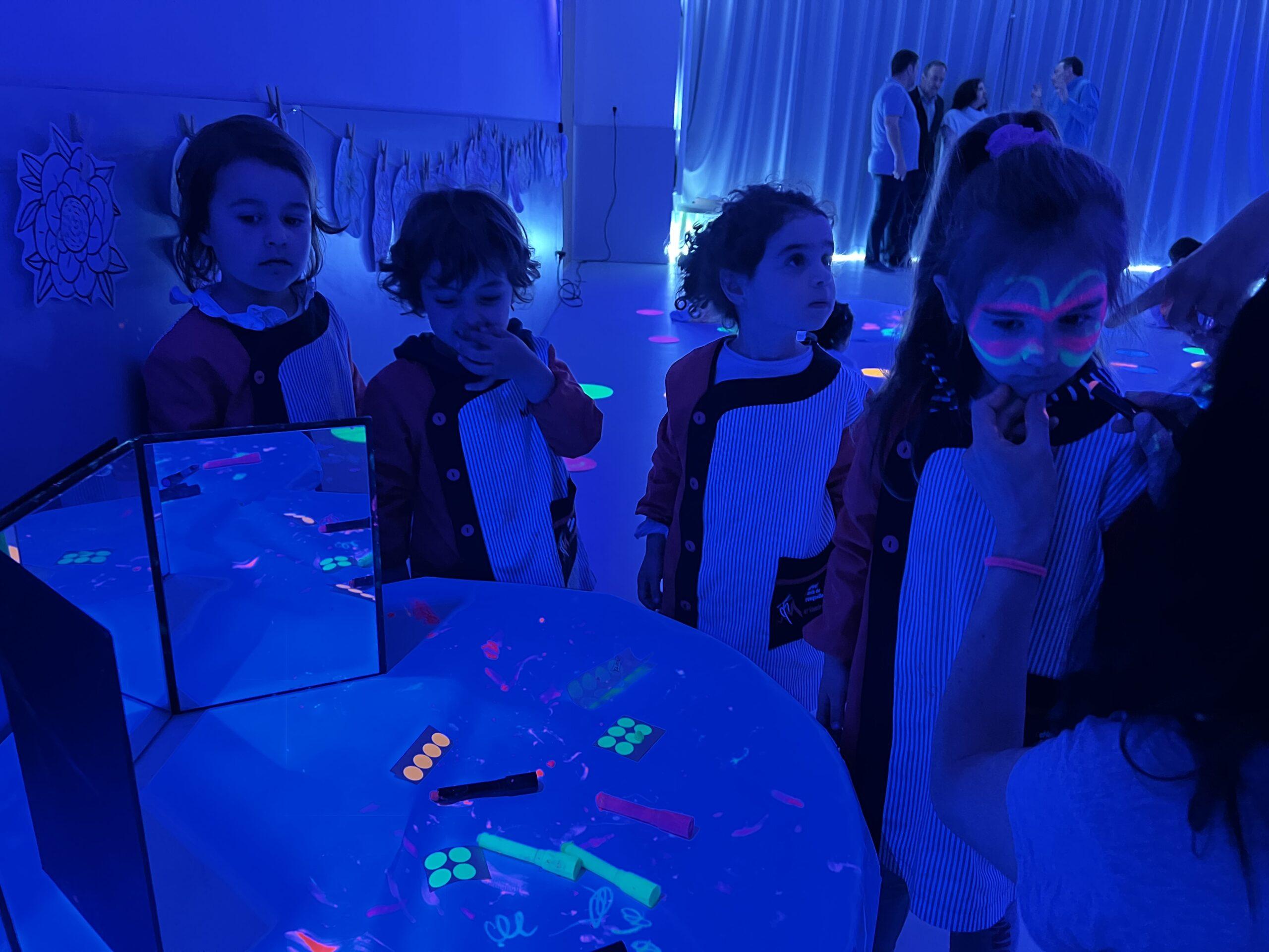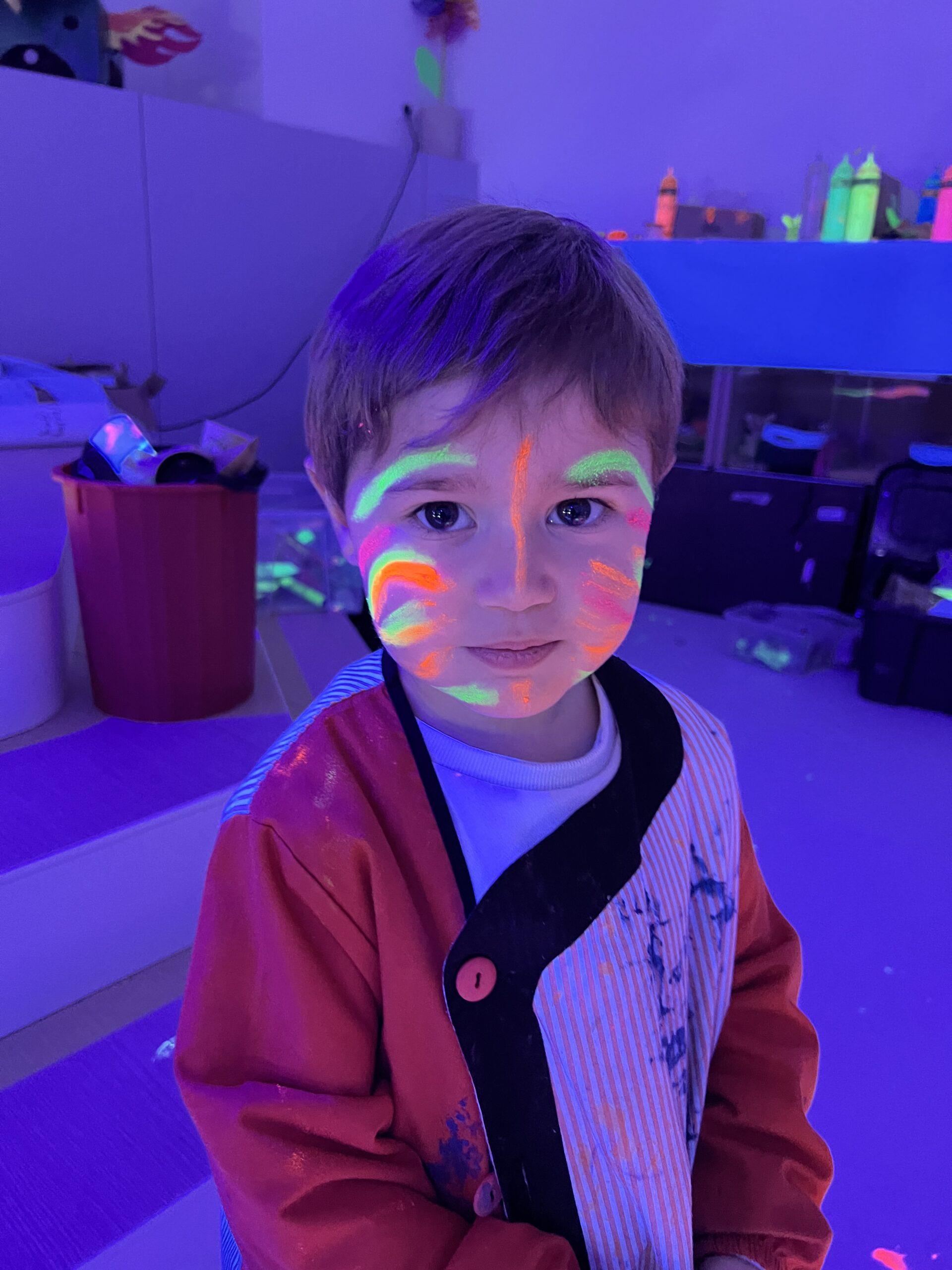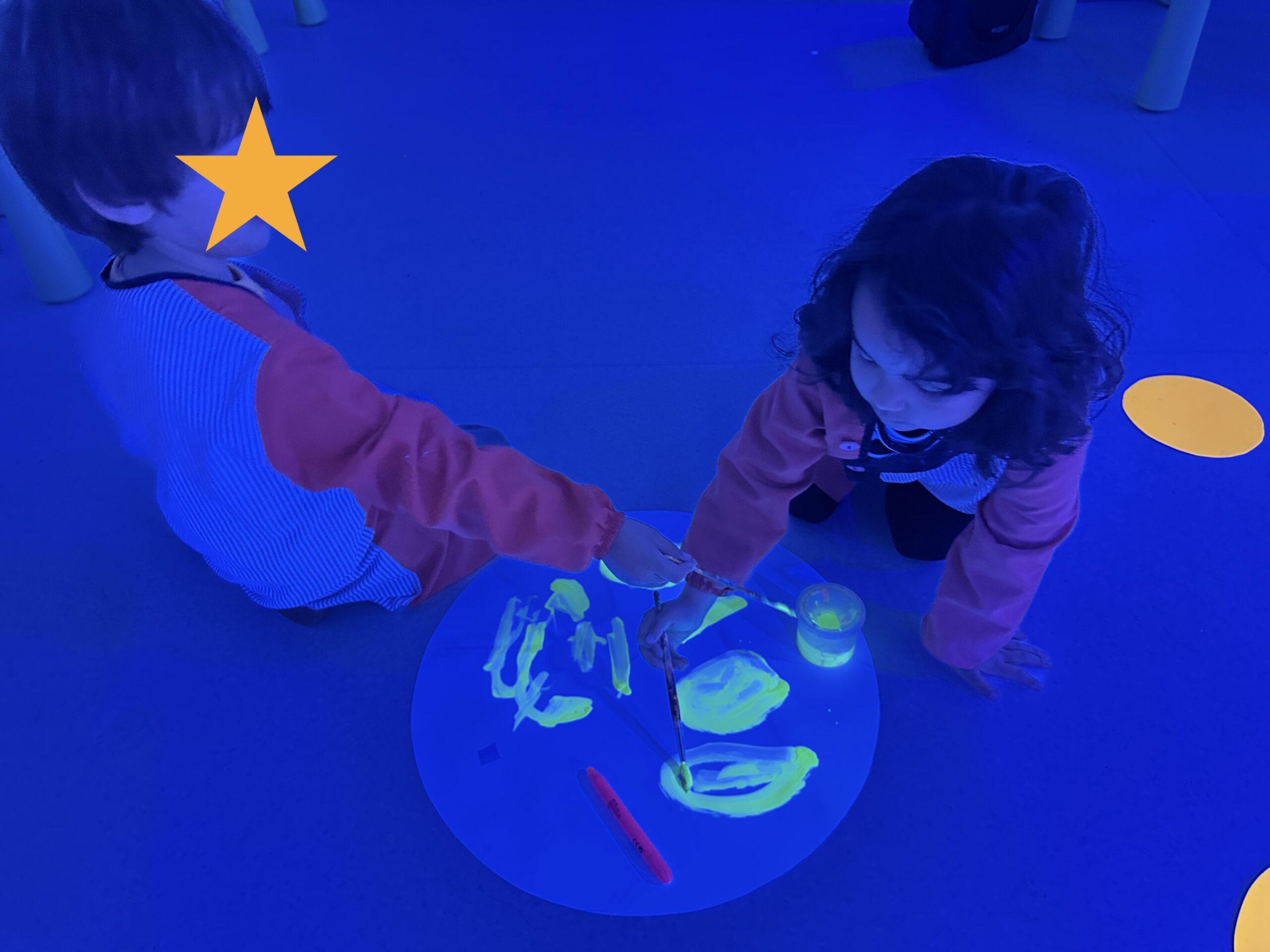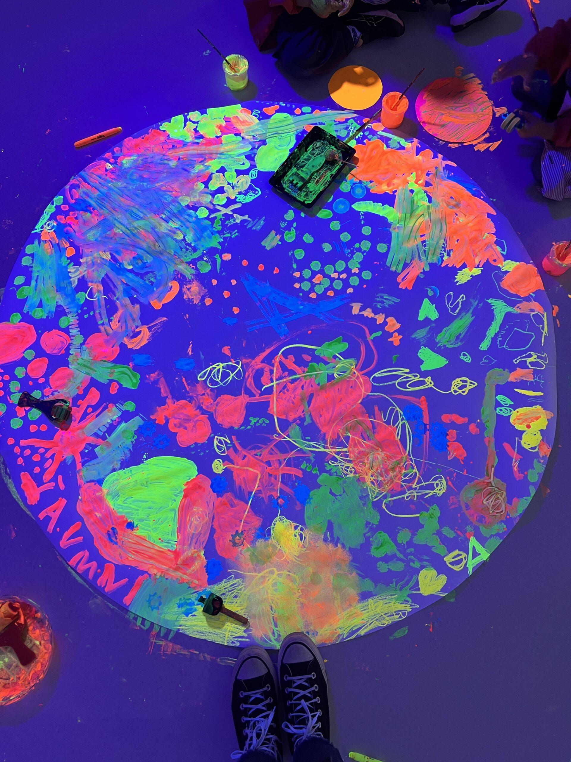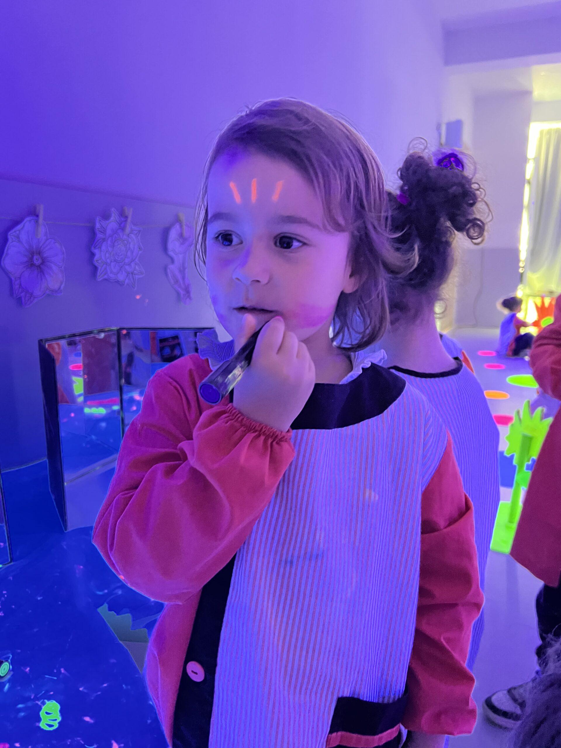 Així doncs, les noies de Koala For Kids ens han ajudat a profunditzar i continuar treballant la Yayoi. Ens van fer una recreació de l’univers creatiu de l’artista a través de tot l’espai. Mitjançant un focus de llum ultraviolada, flors, com les que feia la Yayoi, i cercles de colors, van convidar els nens i a les nenes a entrar dins de la instal·lació artística creada simbolitzant l’entrada a una de les obres d’aquesta artista. Dins d’aquest espai, els infants van poder pintar, dibuixar i maquillar-se amb pintura fluorescent tal com feia l’artista. Va ser una experiència molt divertida i mireu quines imatges més boniques van quedar!
