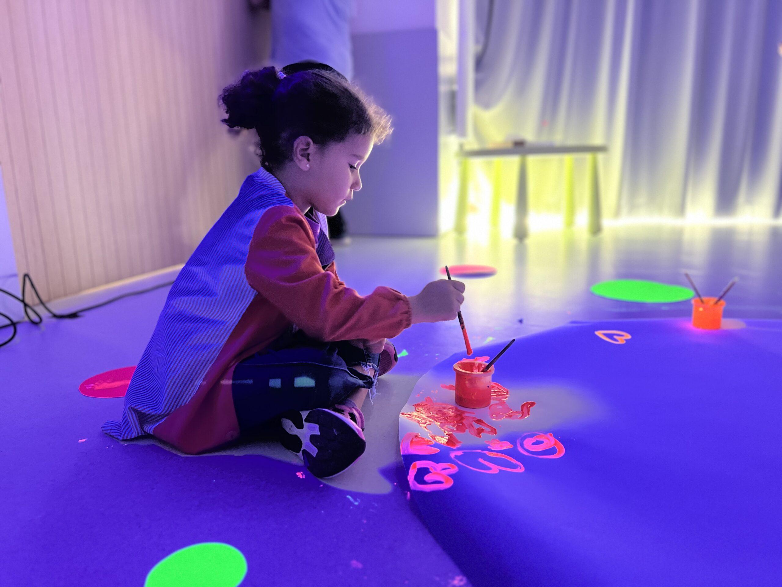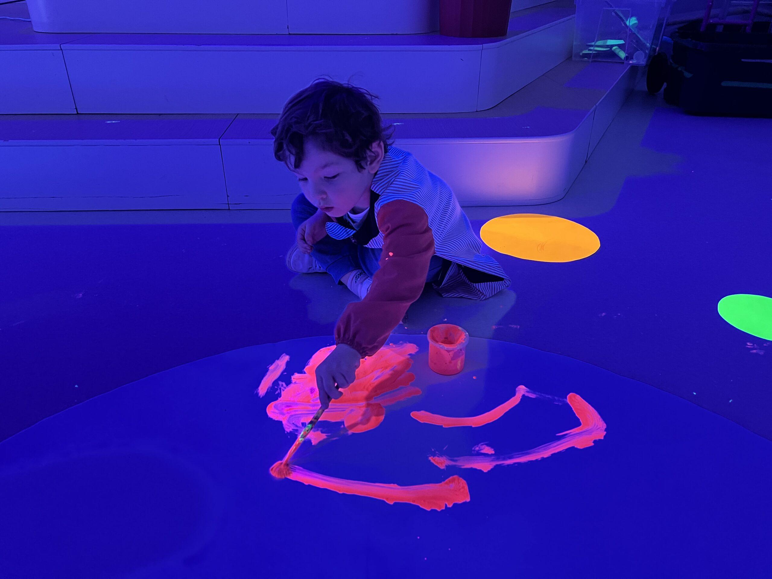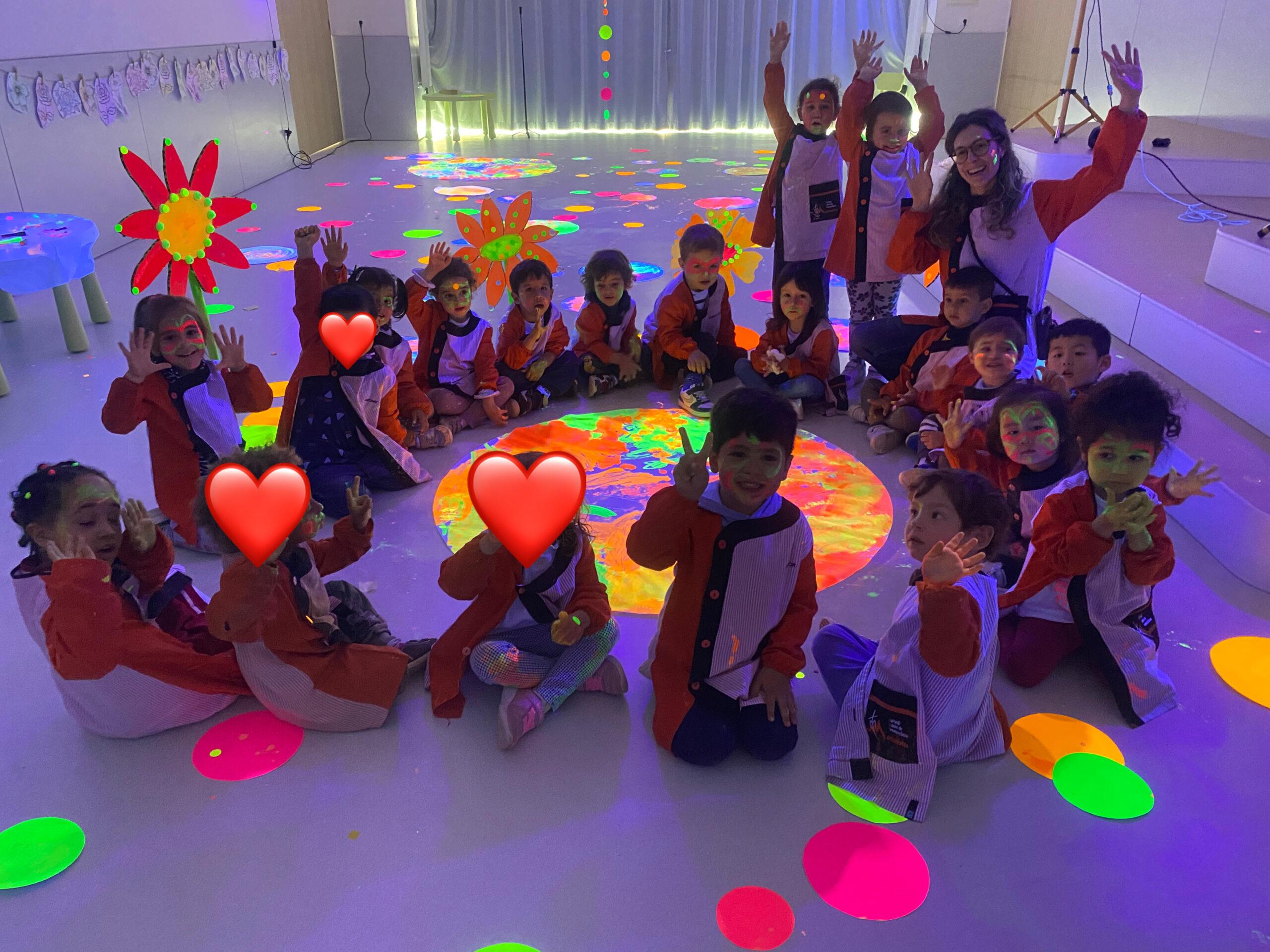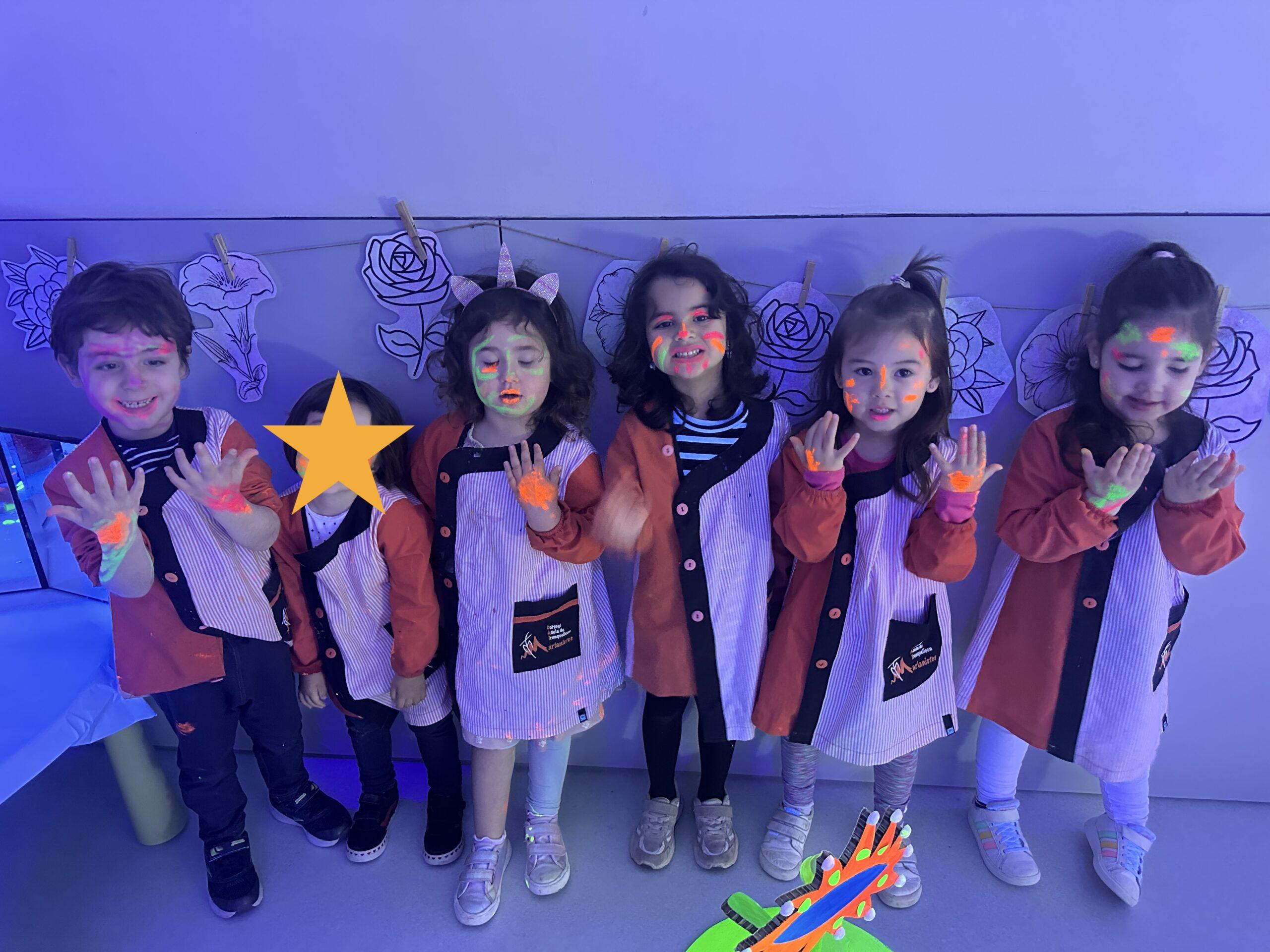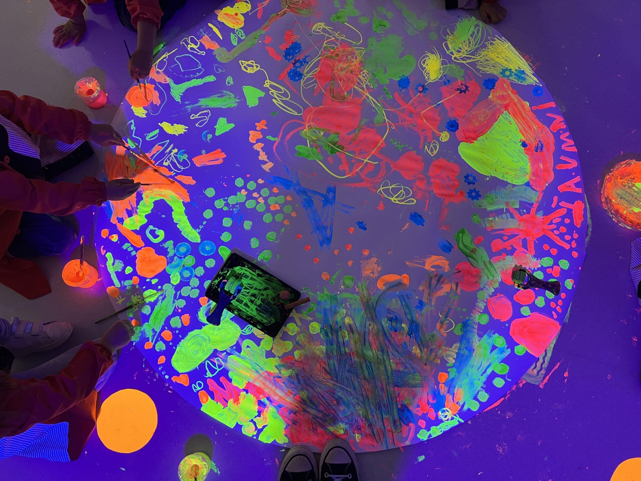 Així doncs, les noies de Koala For Kids ens han ajudat a profunditzar i continuar treballant la Yayoi. Ens van fer una recreació de l’univers creatiu de l’artista a través de tot l’espai. Mitjançant un focus de llum ultraviolada, flors, com les que feia la Yayoi, i cercles de colors, van convidar els nens i a les nenes a entrar dins de la instal·lació artística creada simbolitzant l’entrada a una de les obres d’aquesta artista. Dins d’aquest espai, els infants van poder pintar, dibuixar i maquillar-se amb pintura fluorescent tal com feia l’artista. Va ser una experiència molt divertida i mireu quines imatges més boniques van quedar!