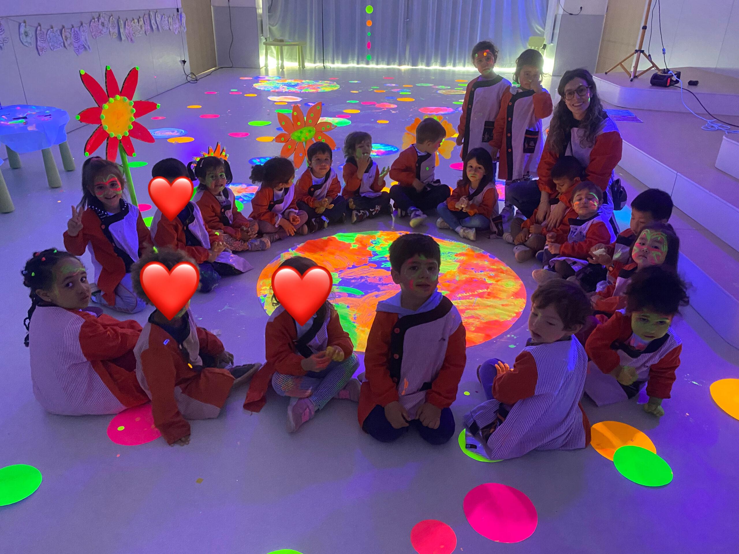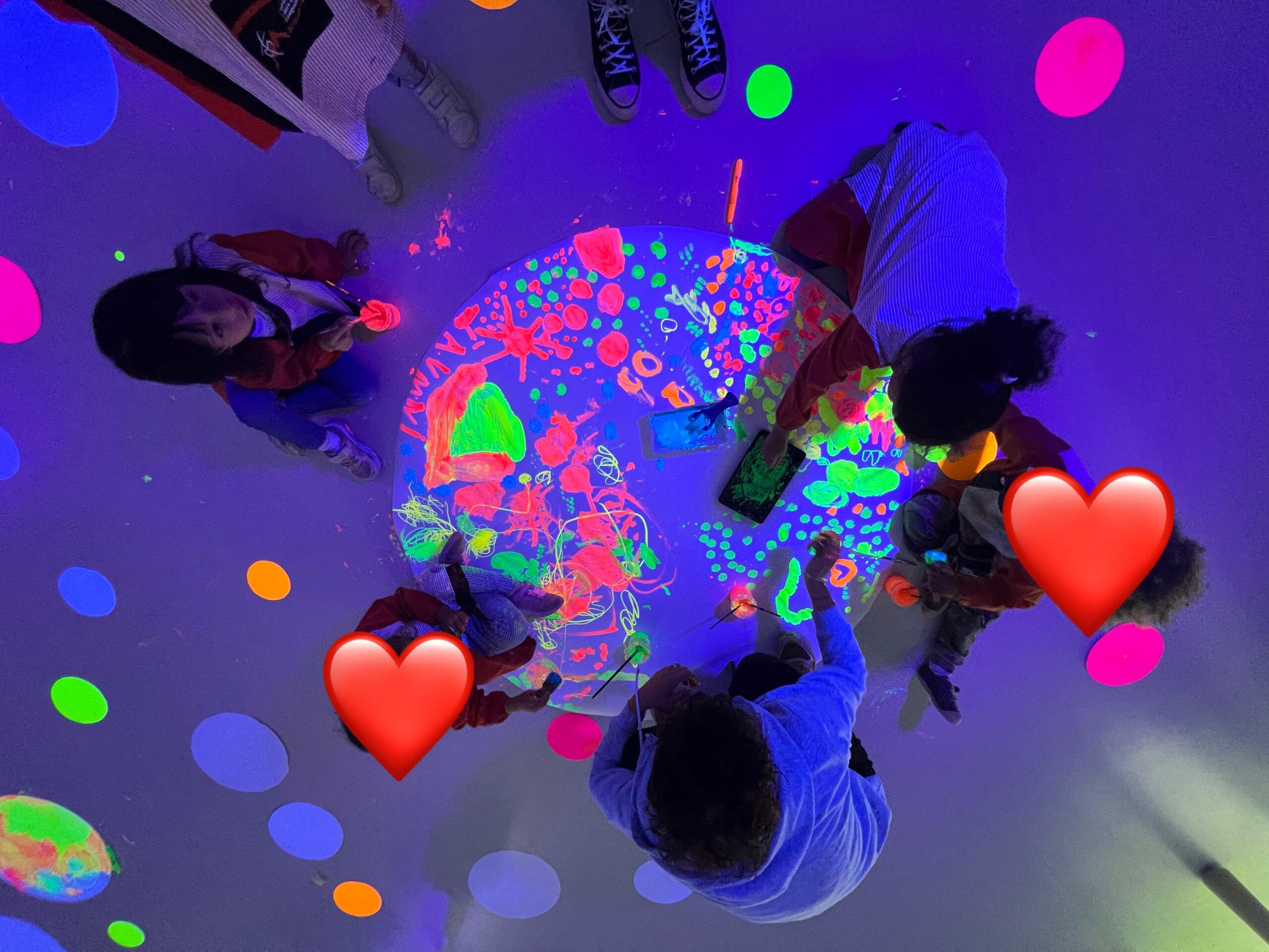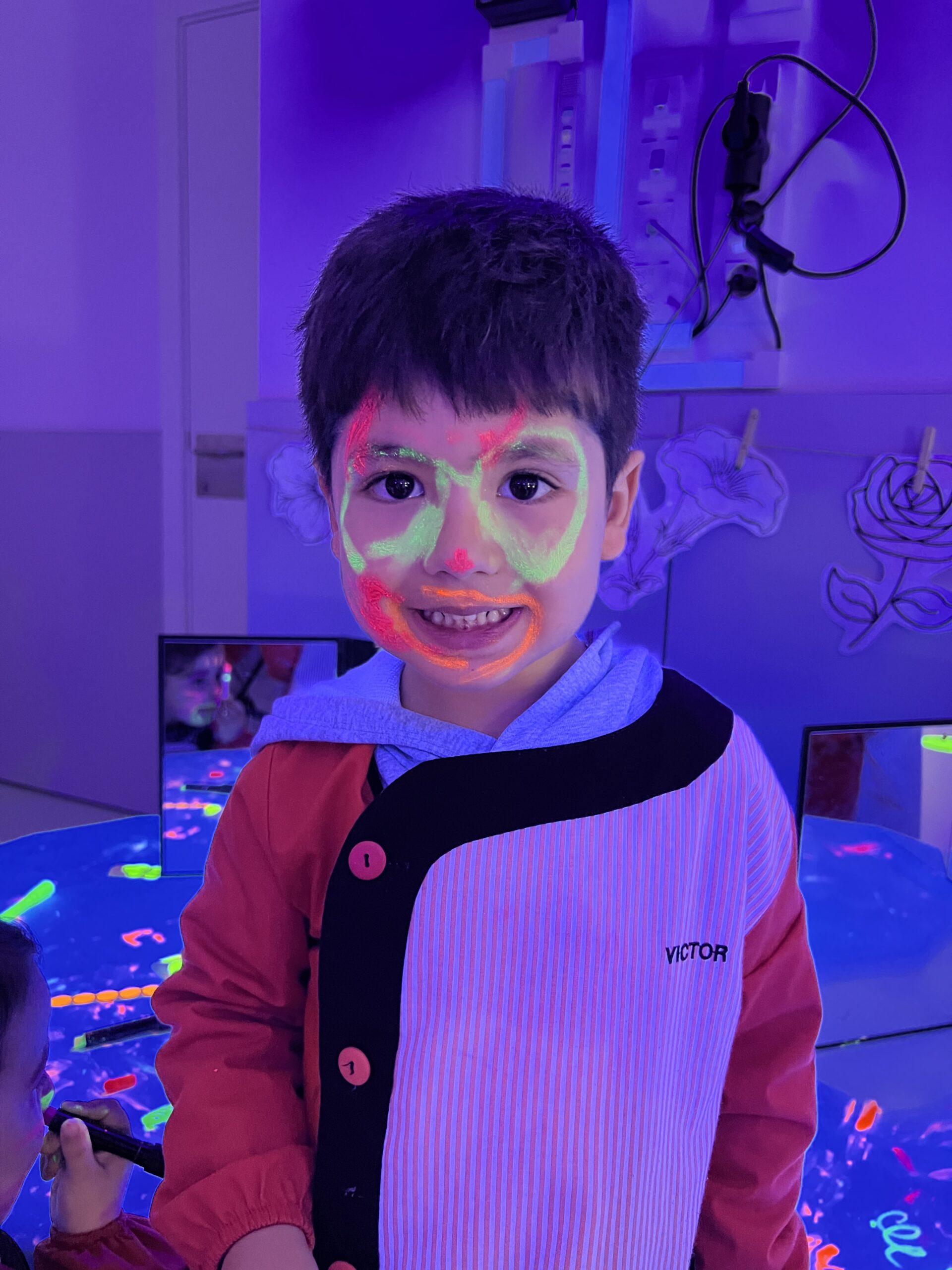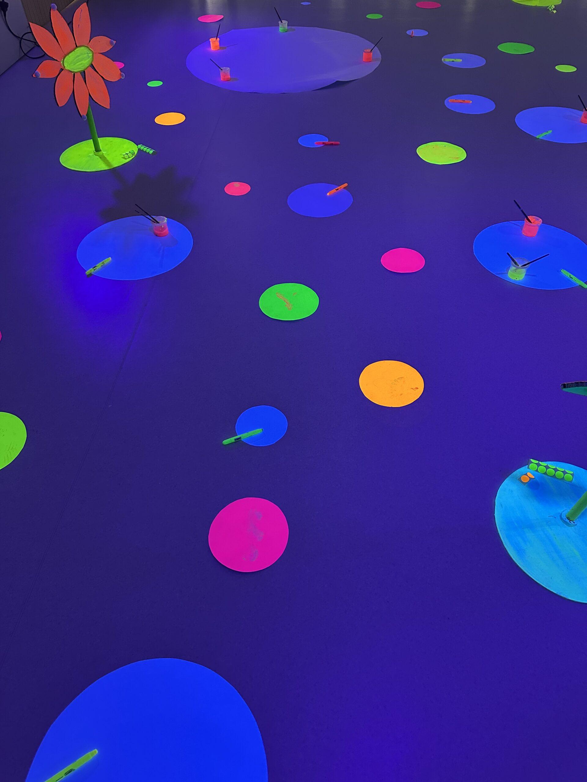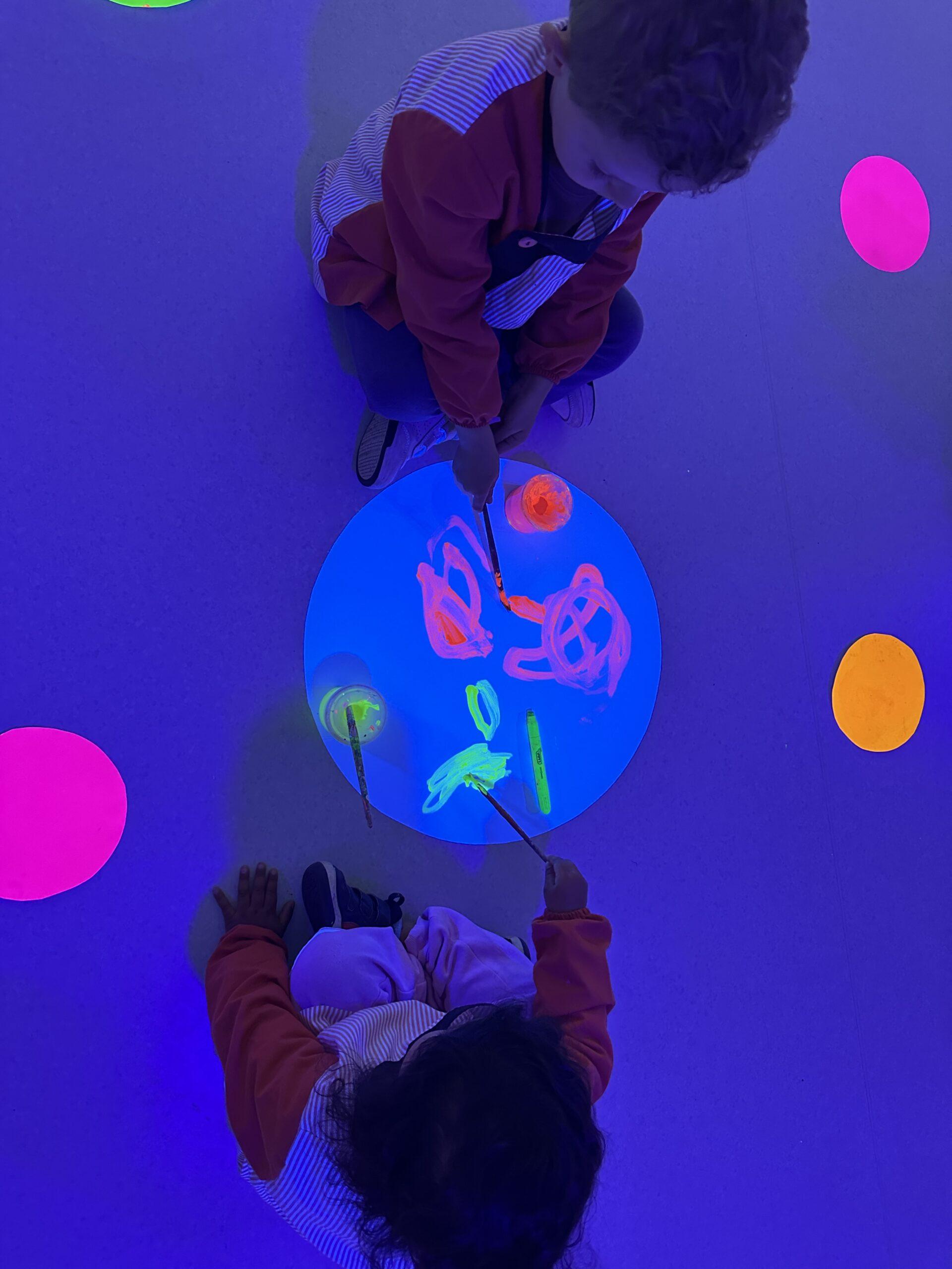 Així doncs, les noies de Koala For Kids ens han ajudat a profunditzar i continuar treballant la Yayoi. Ens van fer una recreació de l’univers creatiu de l’artista a través de tot l’espai. Mitjançant un focus de llum ultraviolada, flors, com les que feia la Yayoi, i cercles de colors, van convidar els nens i a les nenes a entrar dins de la instal·lació artística creada simbolitzant l’entrada a una de les obres d’aquesta artista. Dins d’aquest espai, els infants van poder pintar, dibuixar i maquillar-se amb pintura fluorescent tal com feia l’artista. Va ser una experiència molt divertida i mireu quines imatges més boniques van quedar!