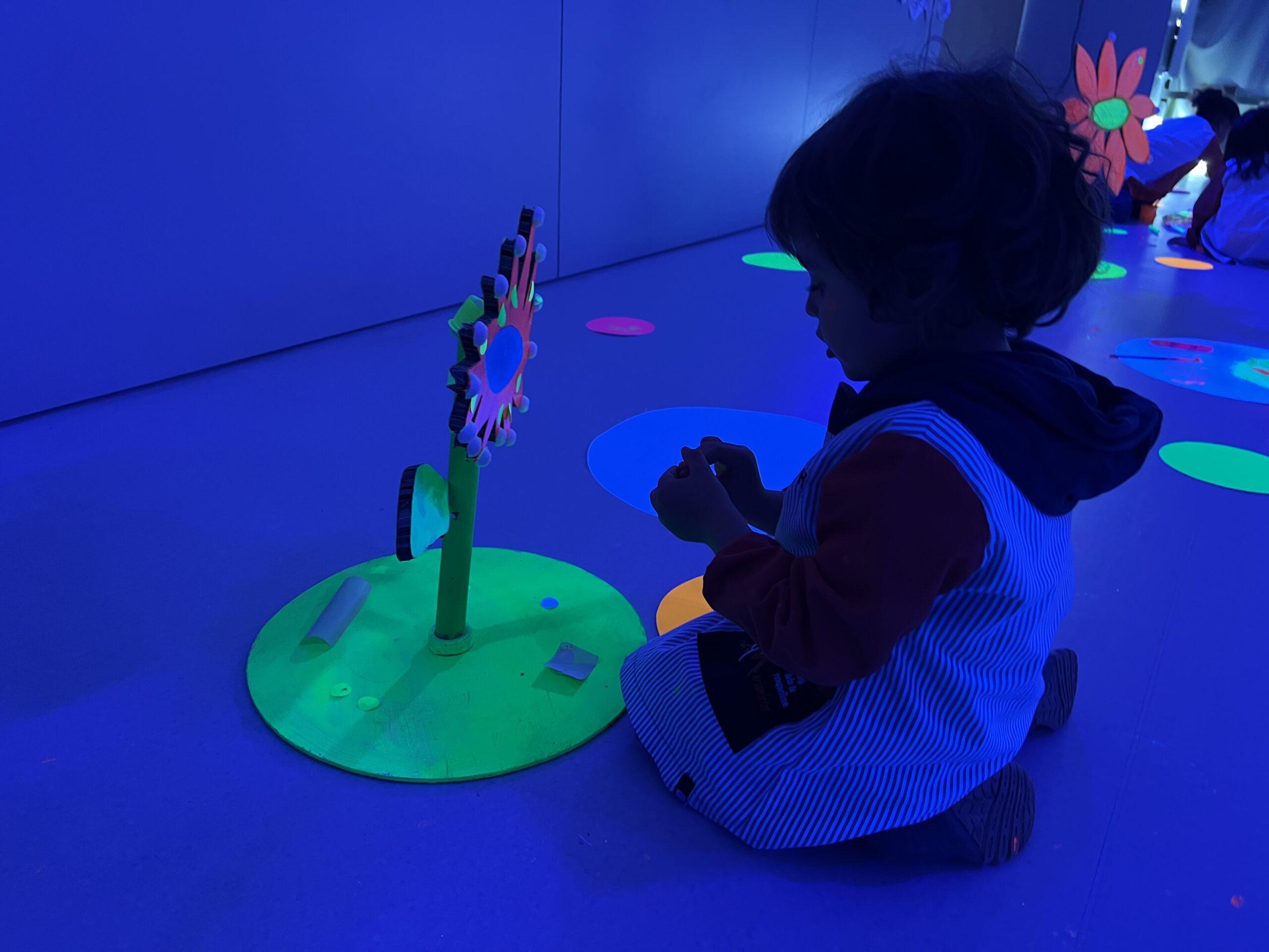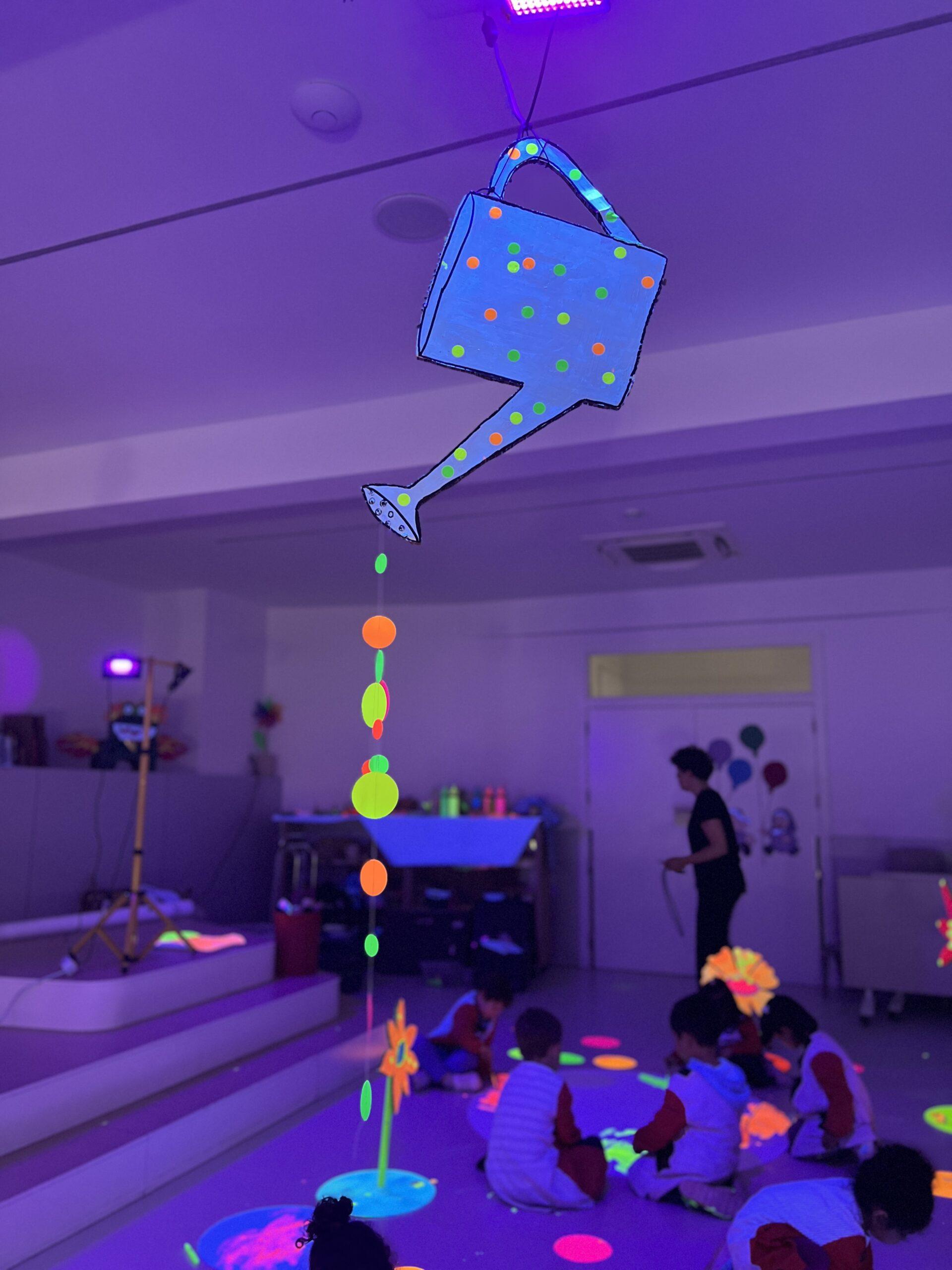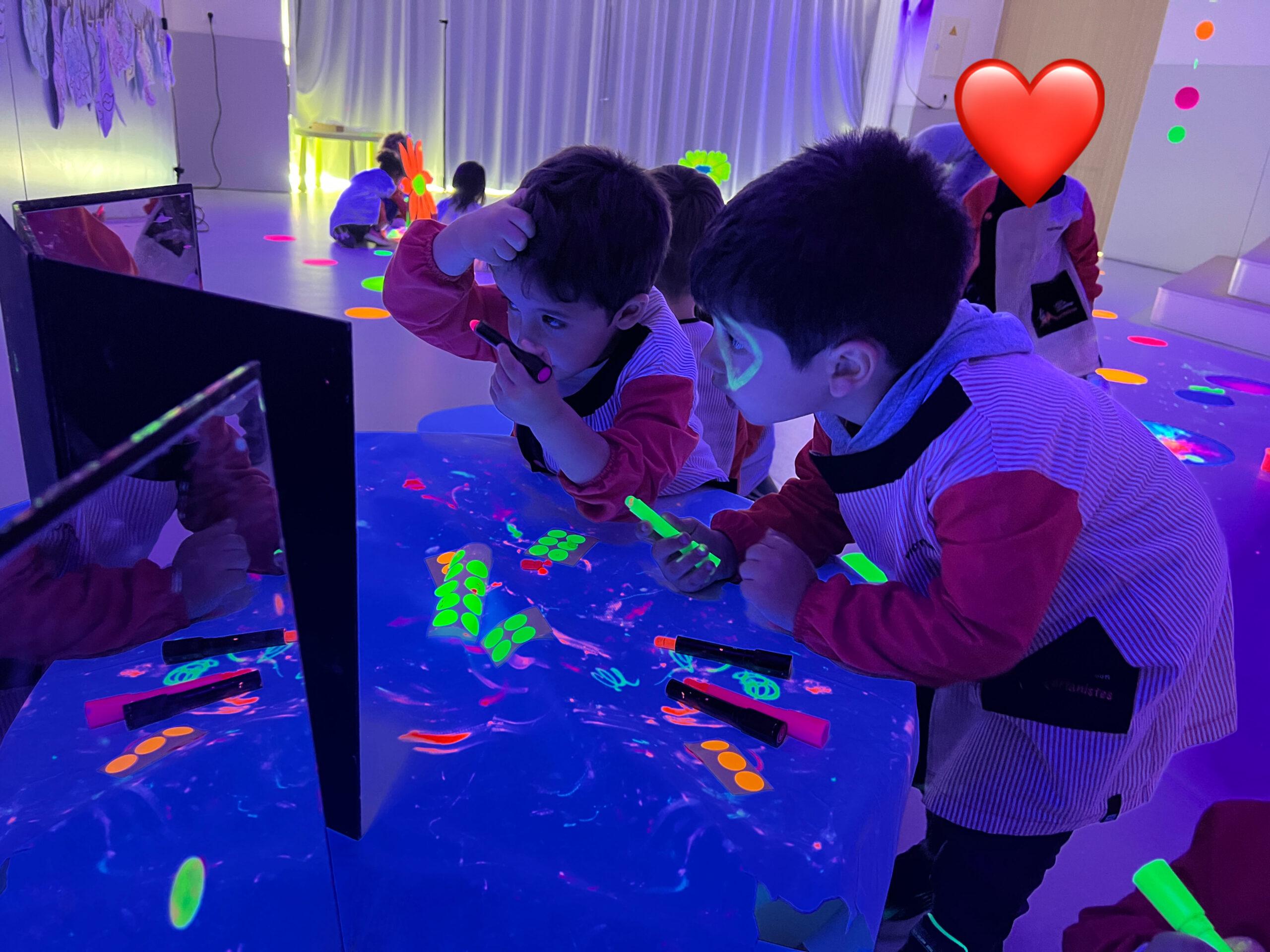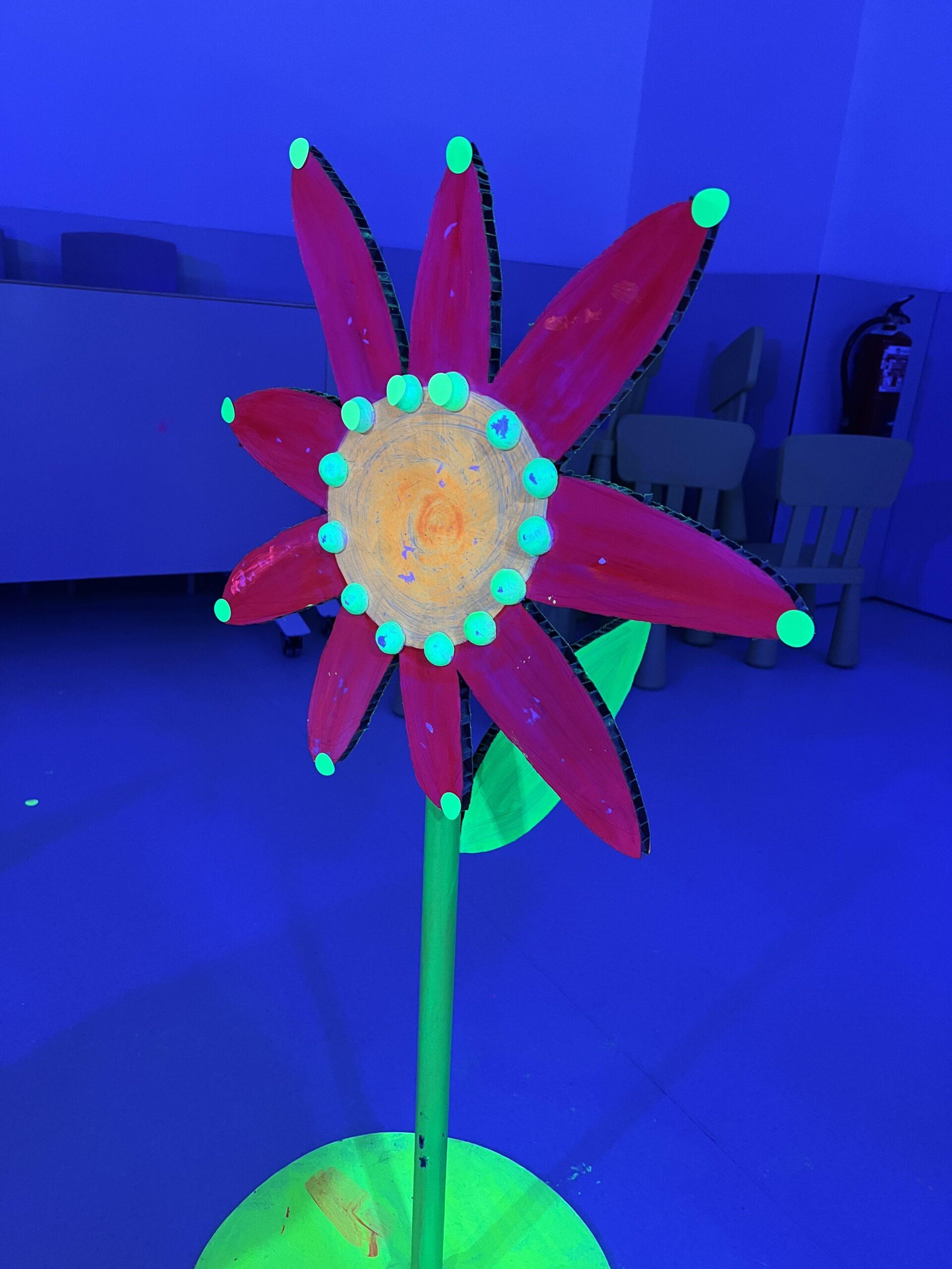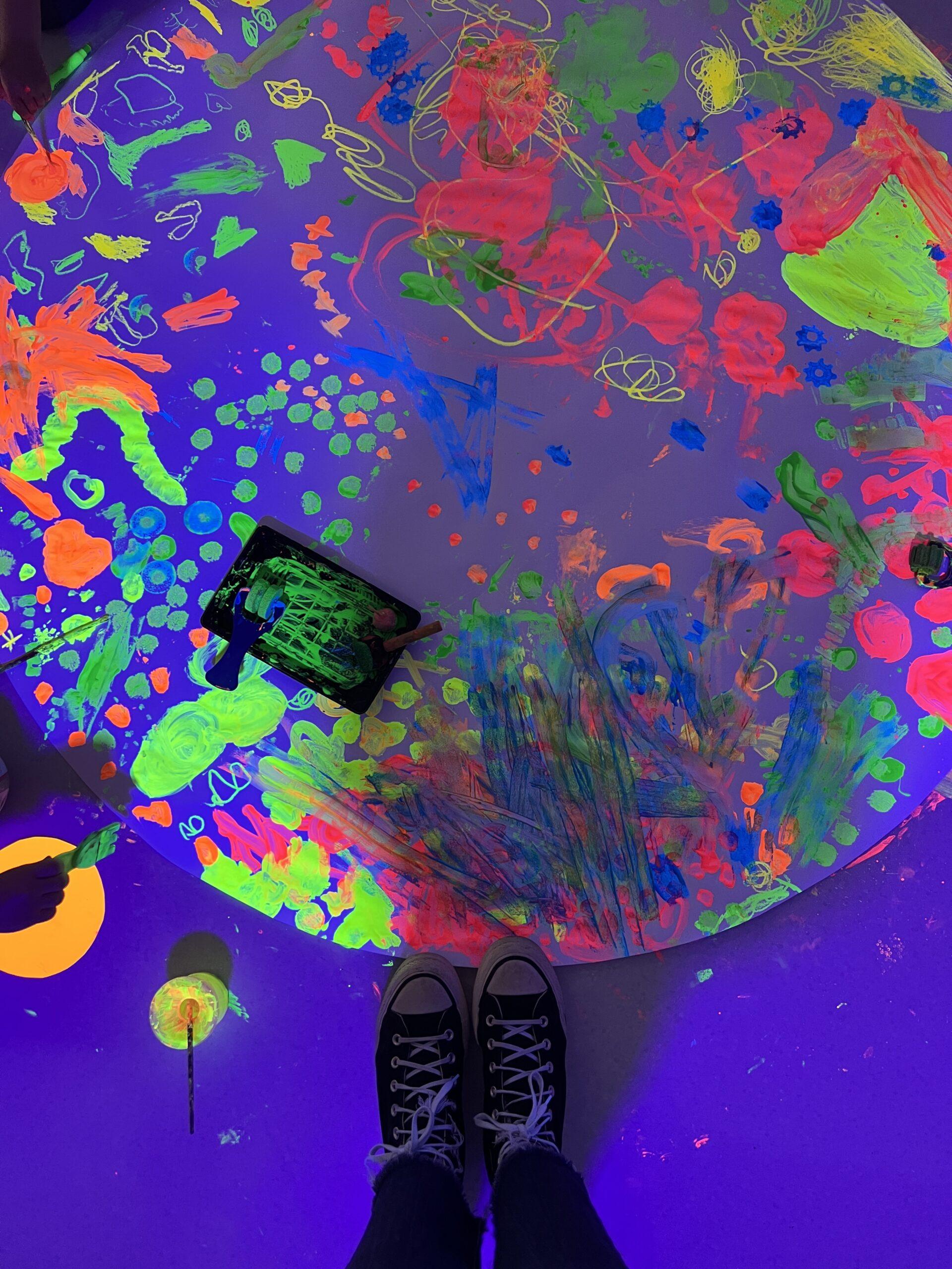Així doncs, les noies de Koala For Kids ens han ajudat a profunditzar i continuar treballant la Yayoi. Ens van fer una recreació de l’univers creatiu de l’artista a través de tot l’espai. Mitjançant un focus de llum ultraviolada, flors, com les que feia la Yayoi, i cercles de colors, van convidar els nens i a les nenes a entrar dins de la instal·lació artística creada simbolitzant l’entrada a una de les obres d’aquesta artista. Dins d’aquest espai, els infants van poder pintar, dibuixar i maquillar-se amb pintura fluorescent tal com feia l’artista. Va ser una experiència molt divertida i mireu quines imatges més boniques van quedar!