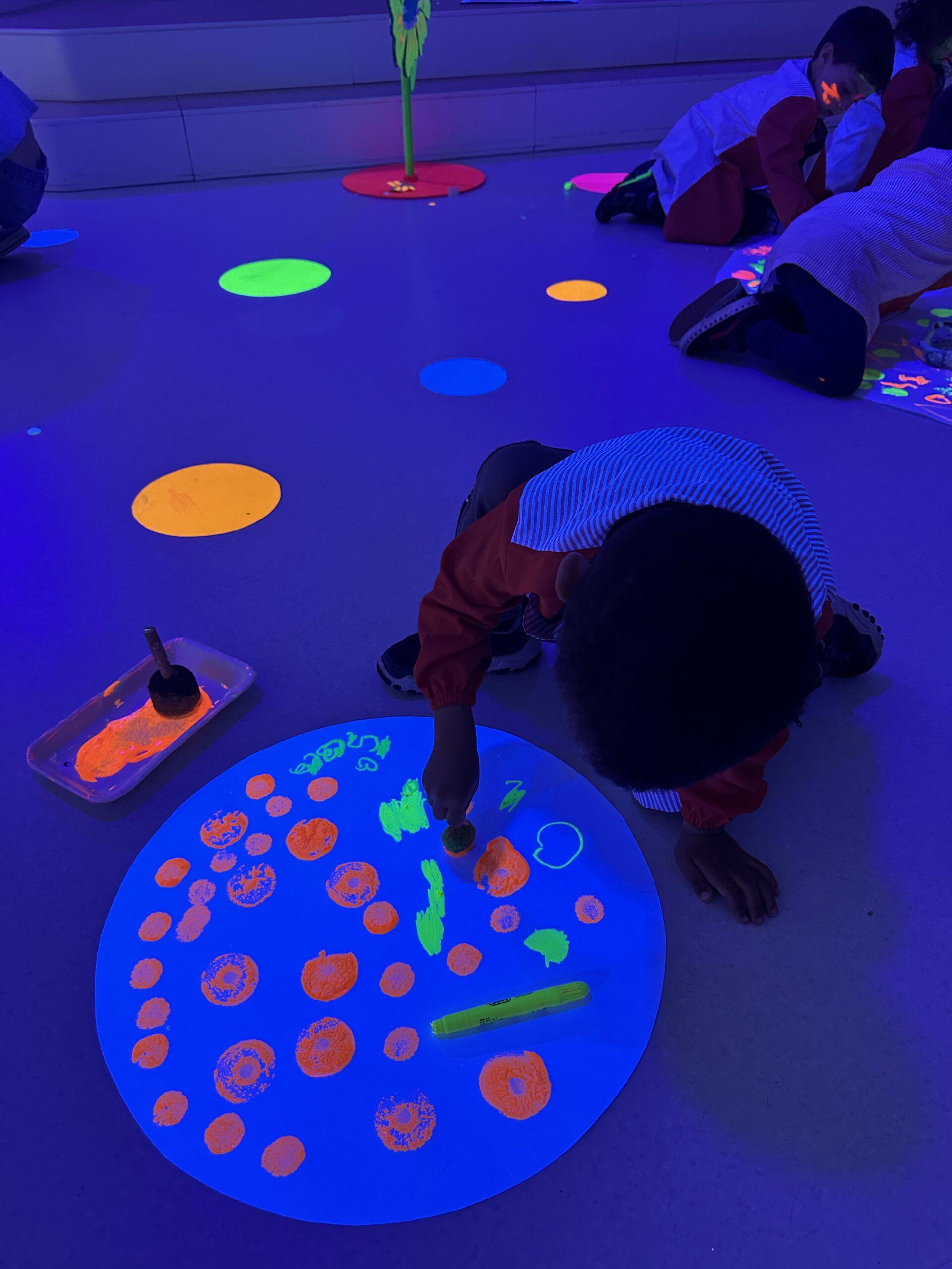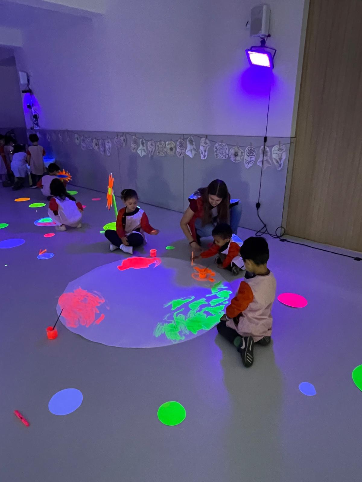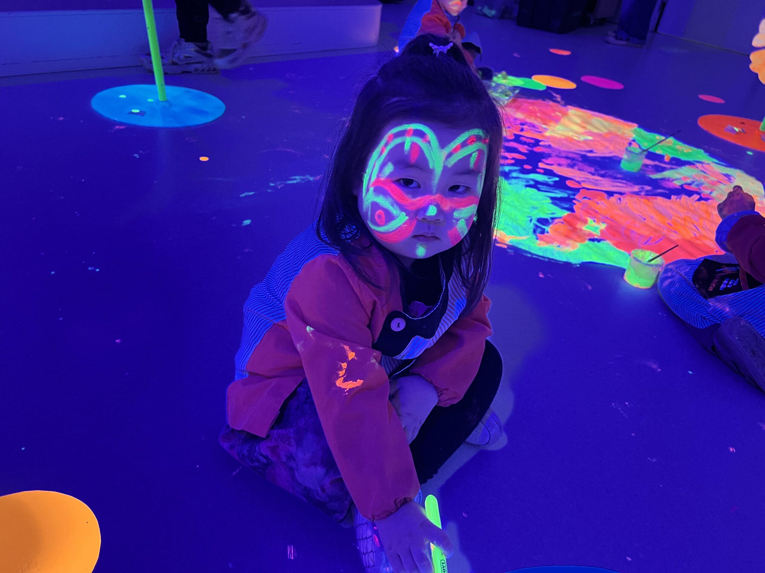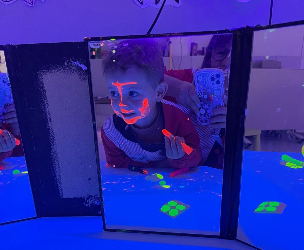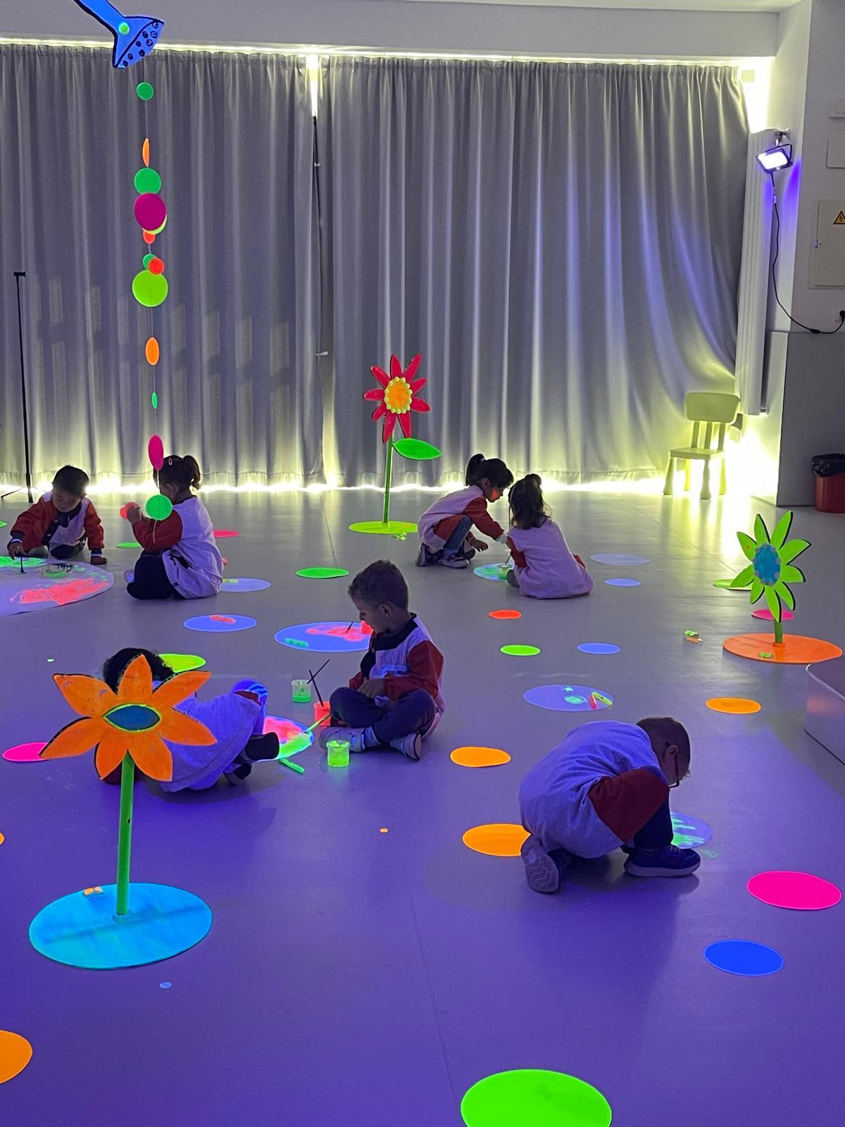 Així doncs, les noies de Koala For Kids ens han ajudat a profunditzar i continuar treballant la Yayoi. Ens van fer una recreació de l’univers creatiu de l’artista a través de tot l’espai. Mitjançant un focus de llum ultraviolada, flors, com les que feia la Yayoi, i cercles de colors, van convidar els nens i a les nenes a entrar dins de la instal·lació artística creada simbolitzant l’entrada a una de les obres d’aquesta artista. Dins d’aquest espai, els infants van poder pintar, dibuixar i maquillar-se amb pintura fluorescent tal com feia l’artista. Va ser una experiència molt divertida i mireu quines imatges més boniques van quedar!