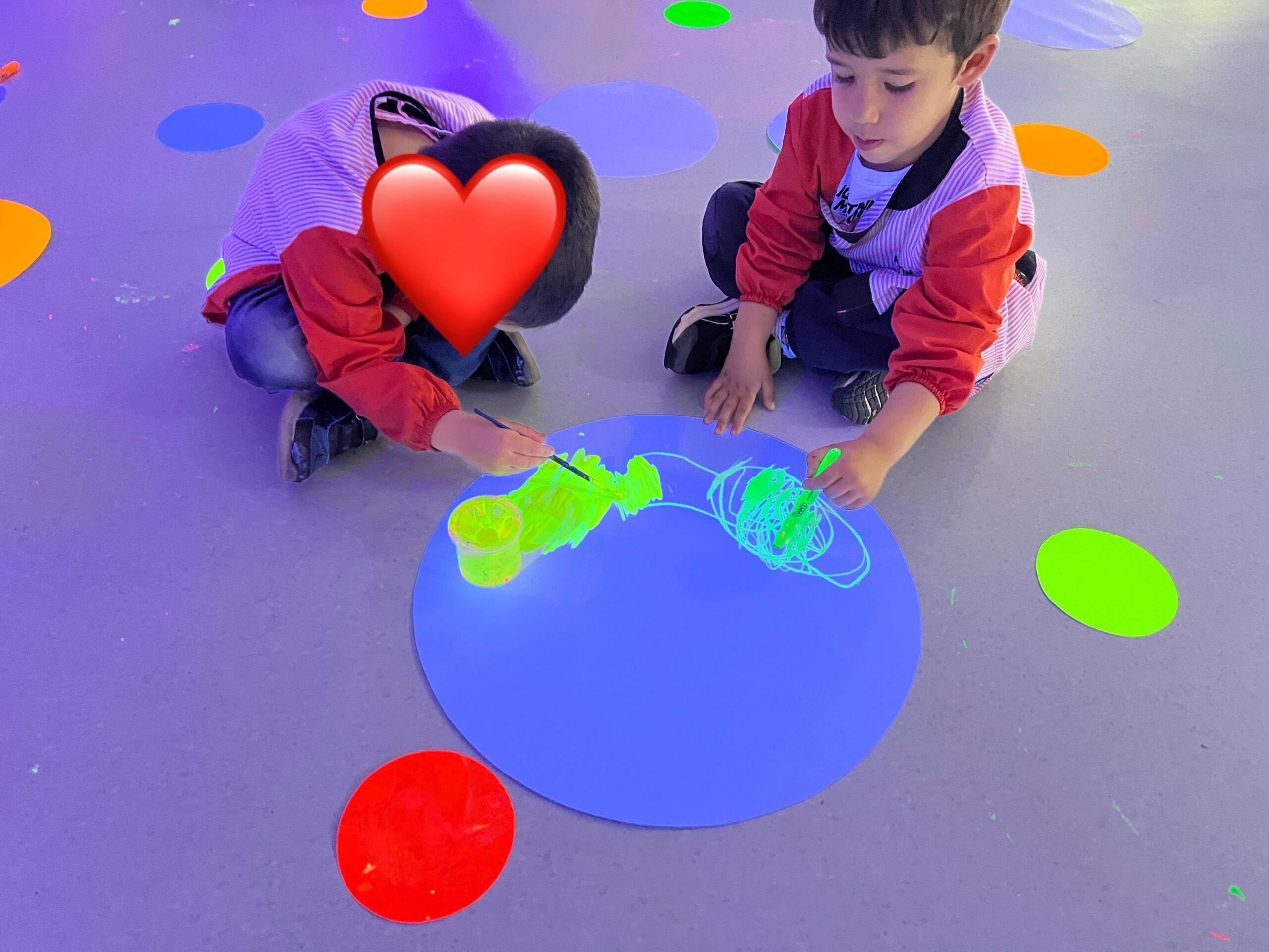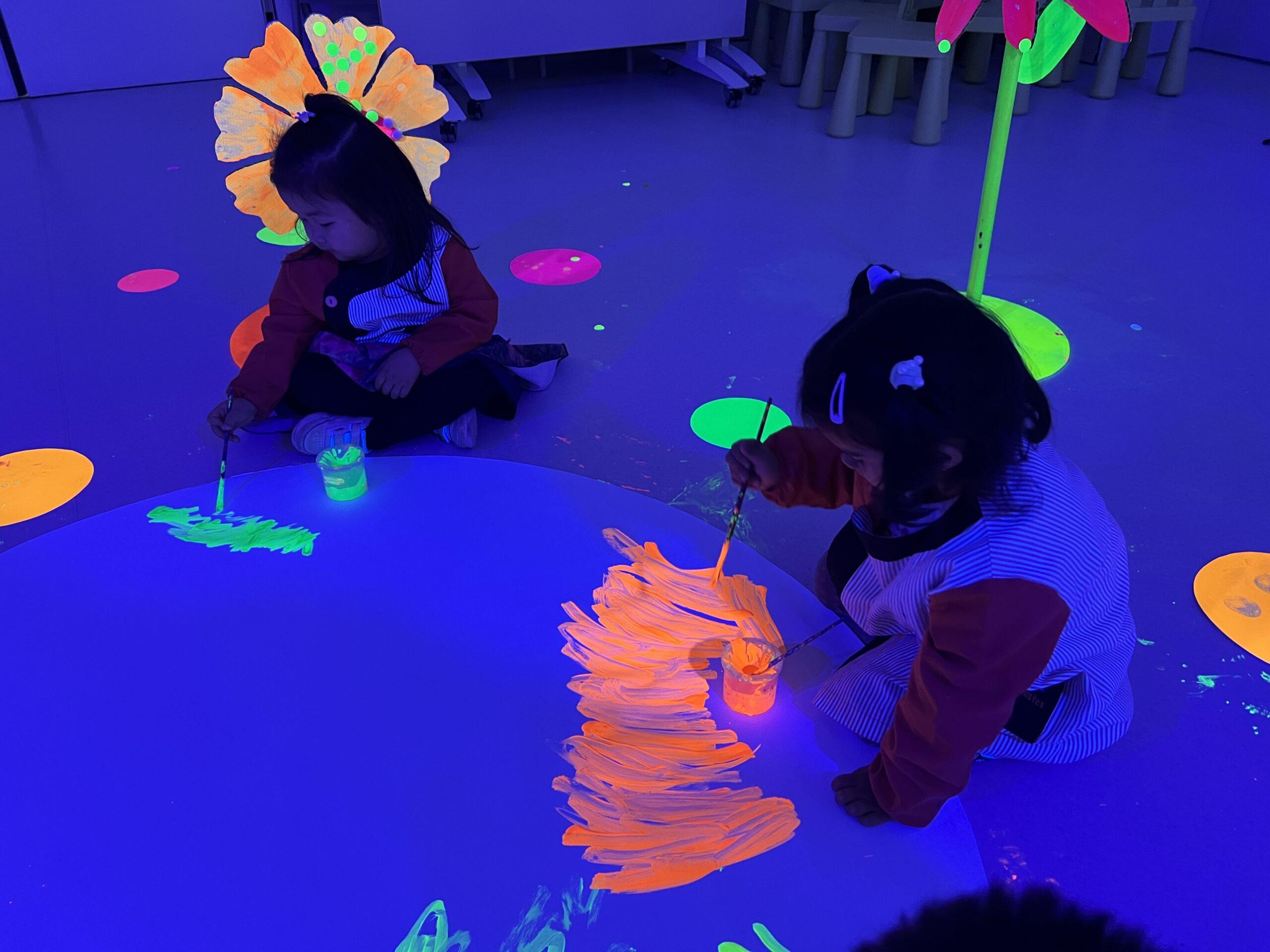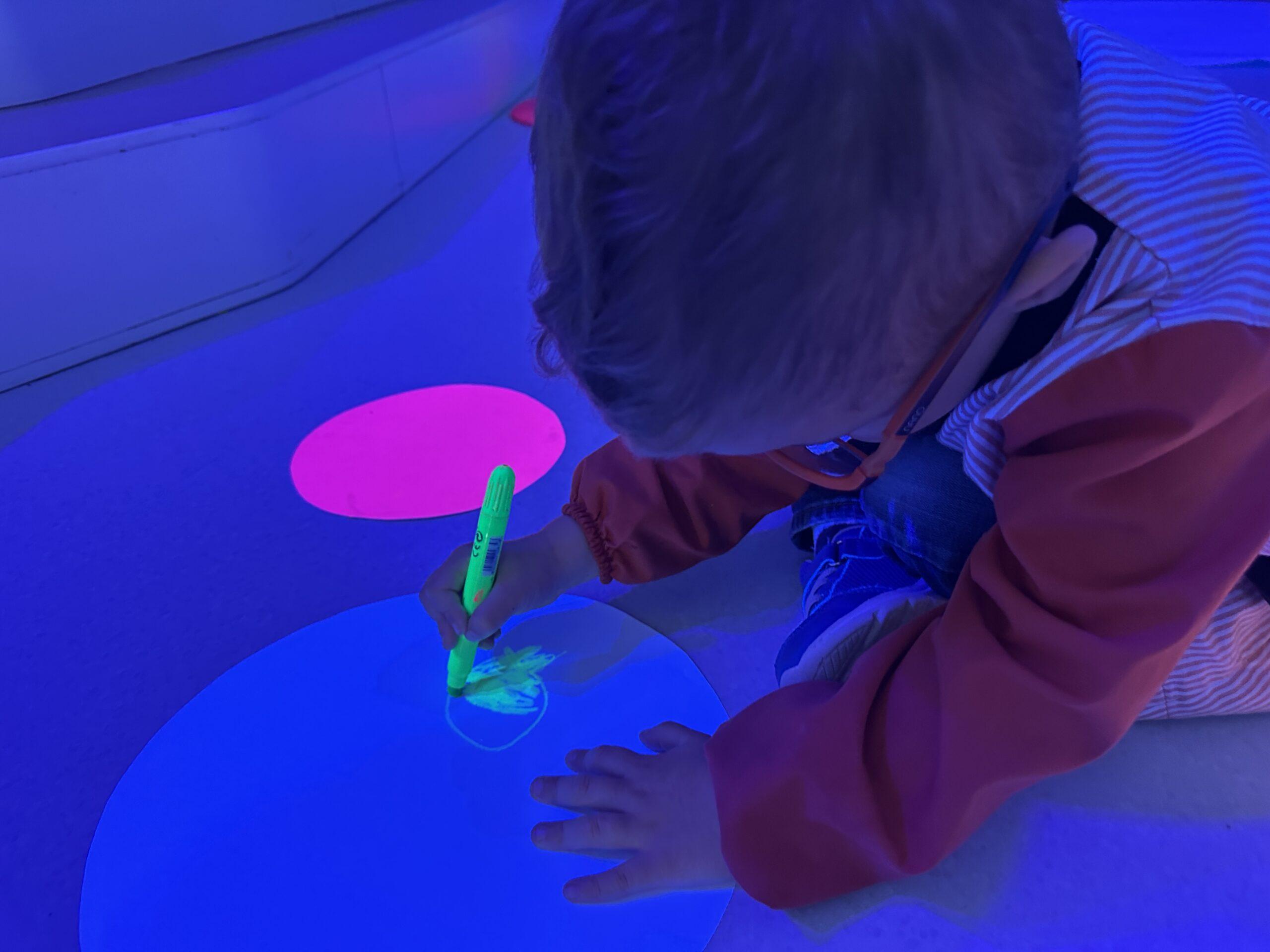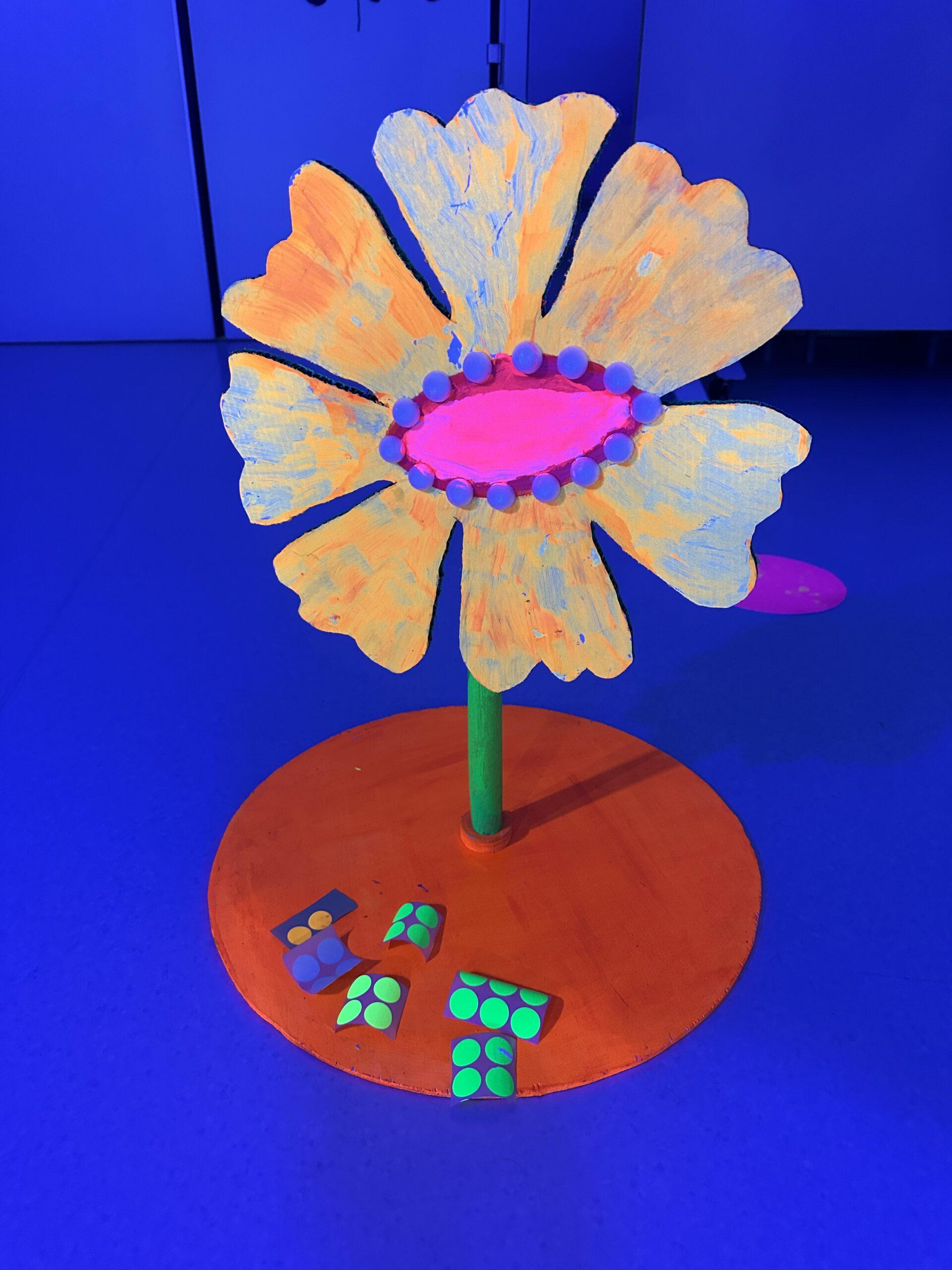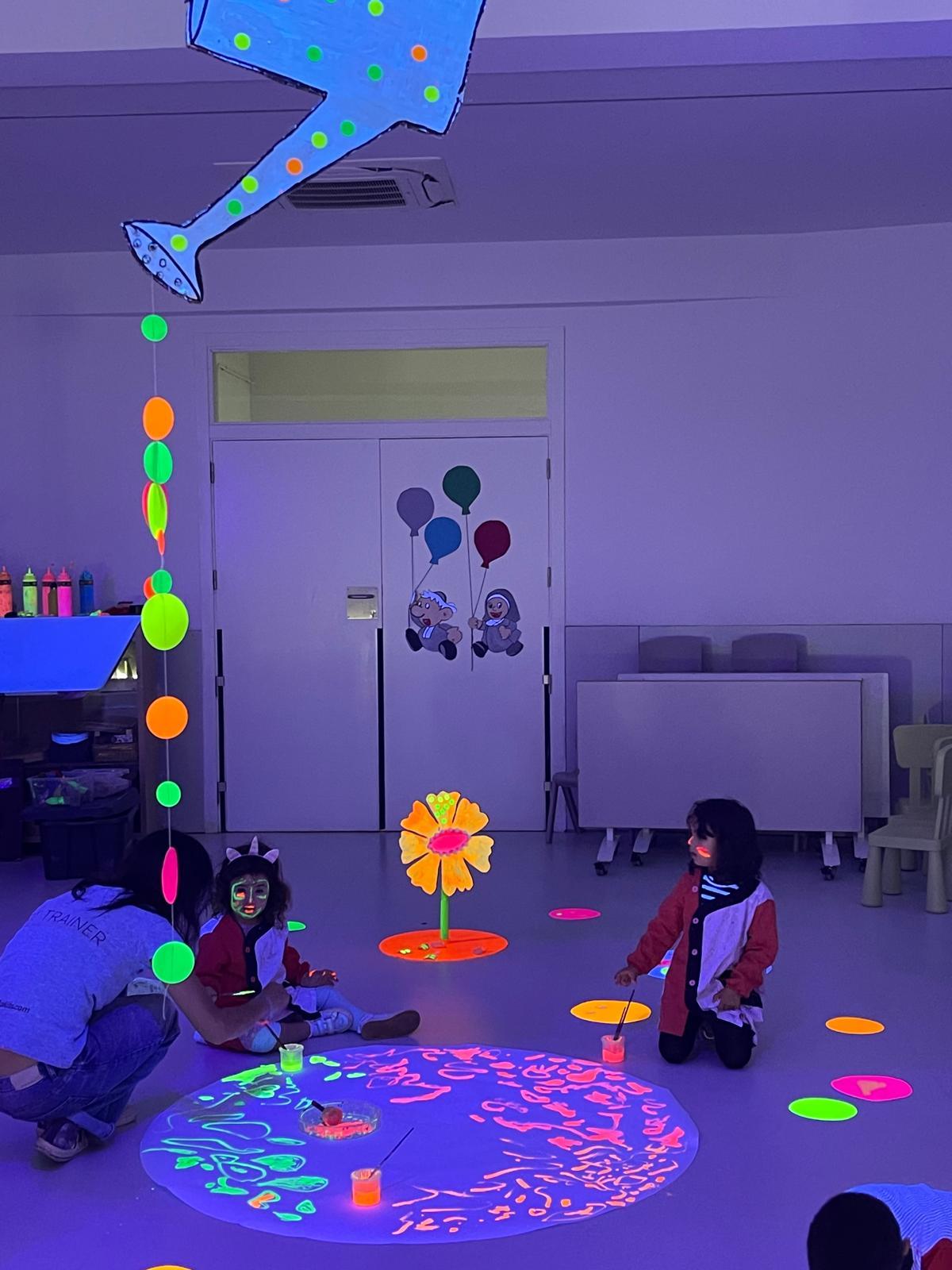 Així doncs, les noies de Koala For Kids ens han ajudat a profunditzar i continuar treballant la Yayoi. Ens van fer una recreació de l’univers creatiu de l’artista a través de tot l’espai. Mitjançant un focus de llum ultraviolada, flors, com les que feia la Yayoi, i cercles de colors, van convidar els nens i a les nenes a entrar dins de la instal·lació artística creada simbolitzant l’entrada a una de les obres d’aquesta artista. Dins d’aquest espai, els infants van poder pintar, dibuixar i maquillar-se amb pintura fluorescent tal com feia l’artista. Va ser una experiència molt divertida i mireu quines imatges més boniques van quedar!