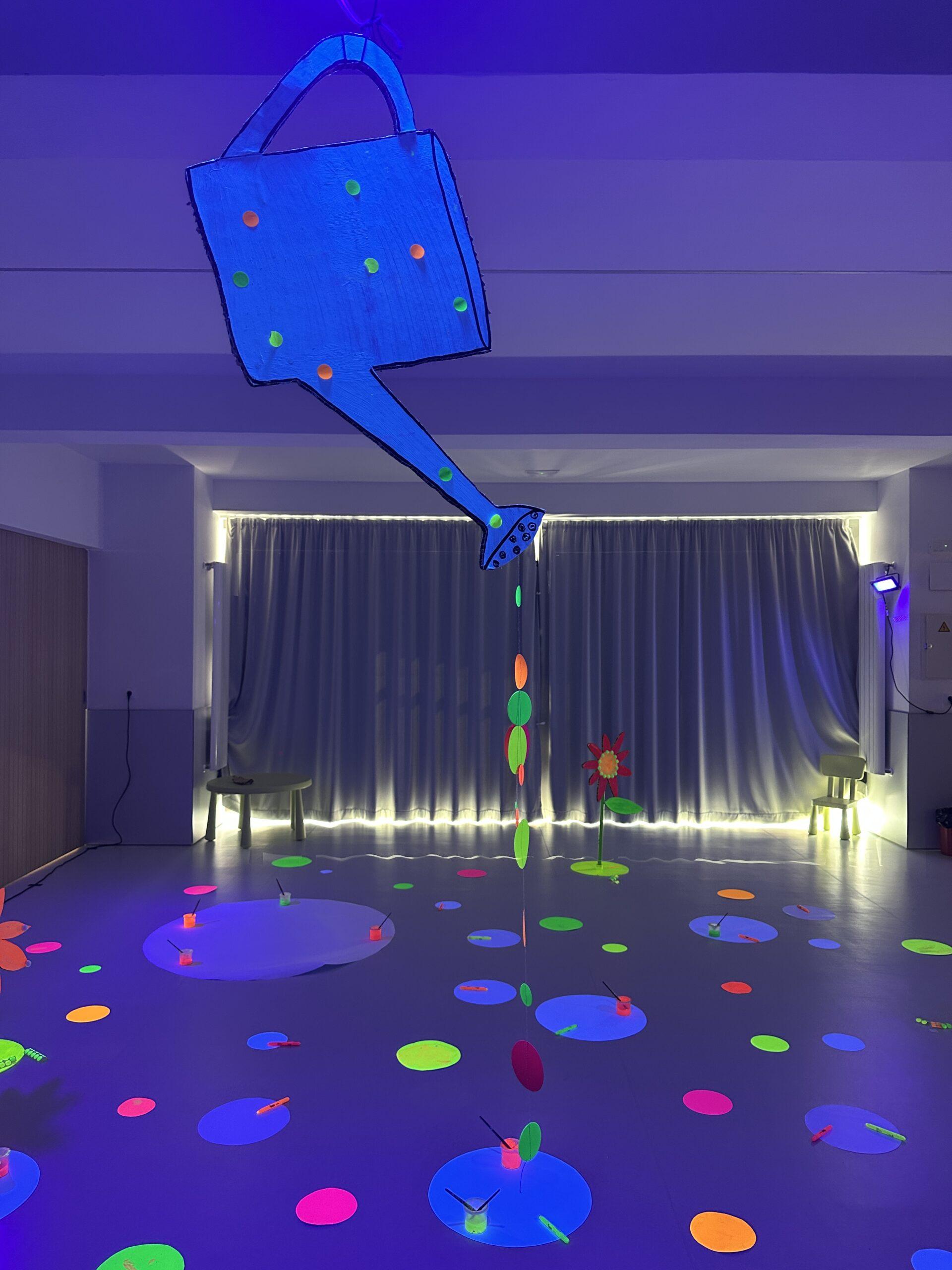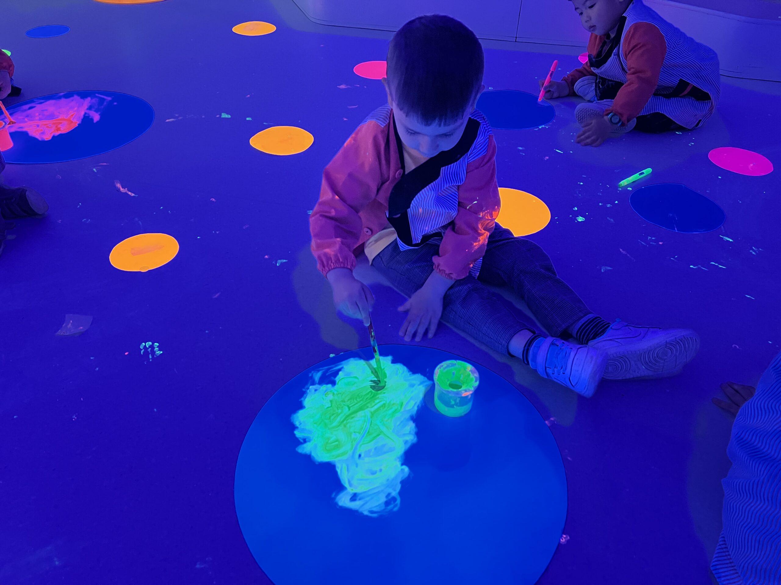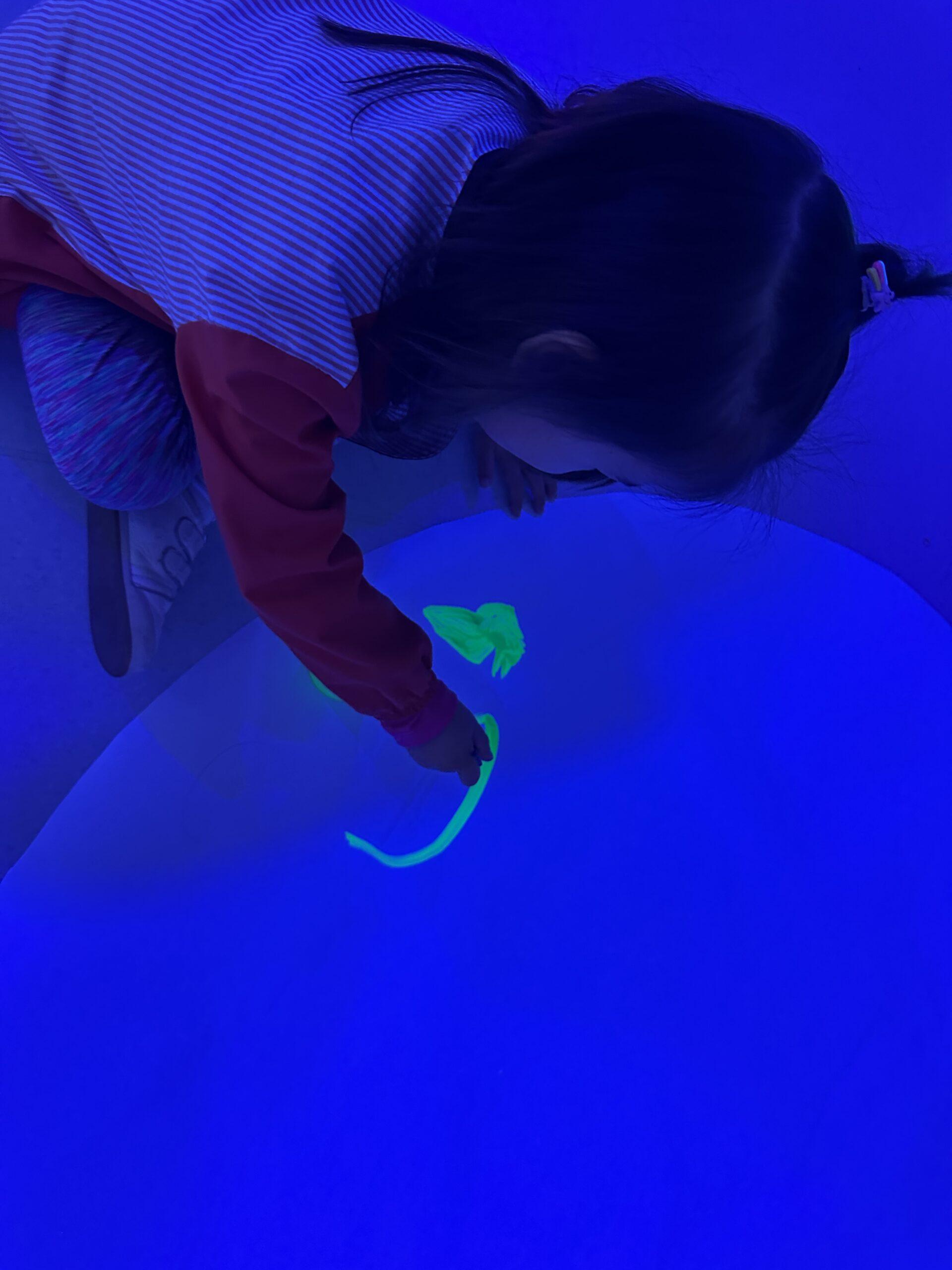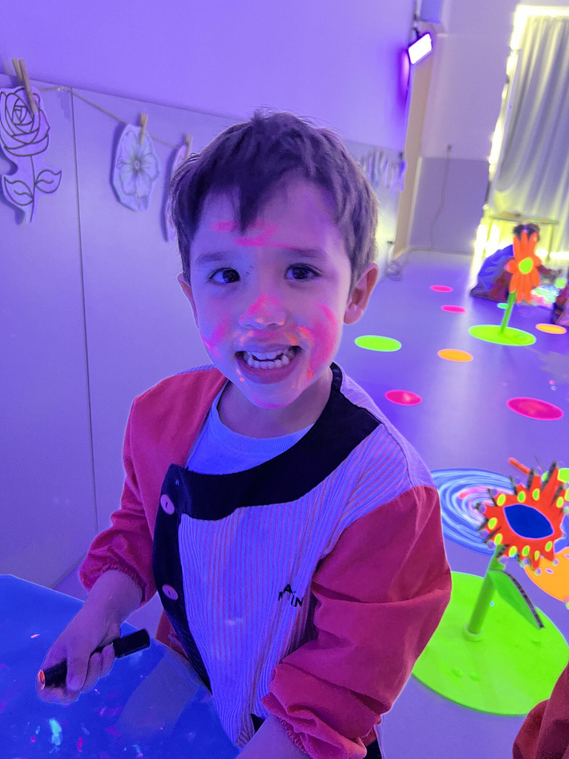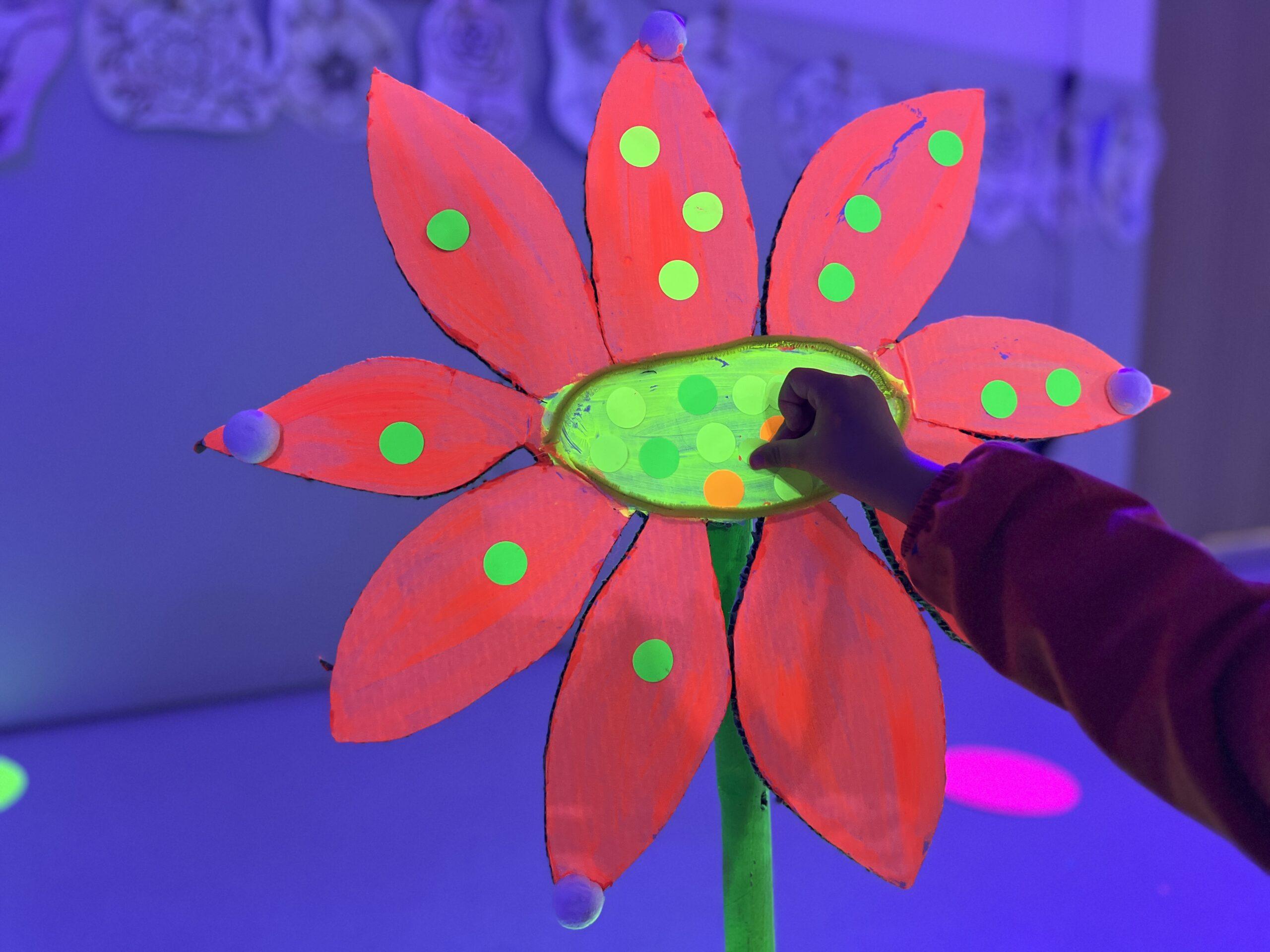 Així doncs, les noies de Koala For Kids ens han ajudat a profunditzar i continuar treballant la Yayoi. Ens van fer una recreació de l’univers creatiu de l’artista a través de tot l’espai. Mitjançant un focus de llum ultraviolada, flors, com les que feia la Yayoi, i cercles de colors, van convidar els nens i a les nenes a entrar dins de la instal·lació artística creada simbolitzant l’entrada a una de les obres d’aquesta artista. Dins d’aquest espai, els infants van poder pintar, dibuixar i maquillar-se amb pintura fluorescent tal com feia l’artista. Va ser una experiència molt divertida i mireu quines imatges més boniques van quedar!