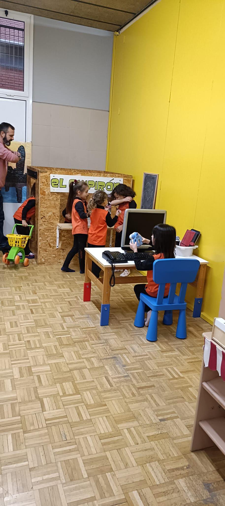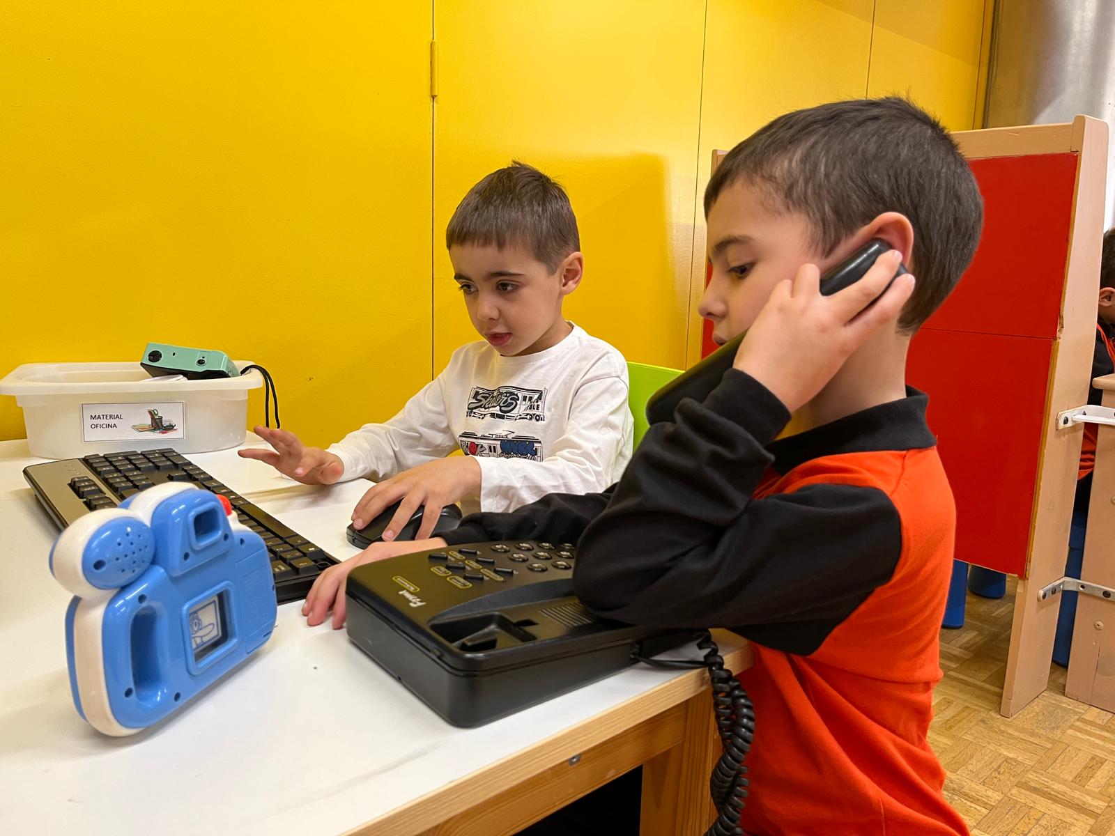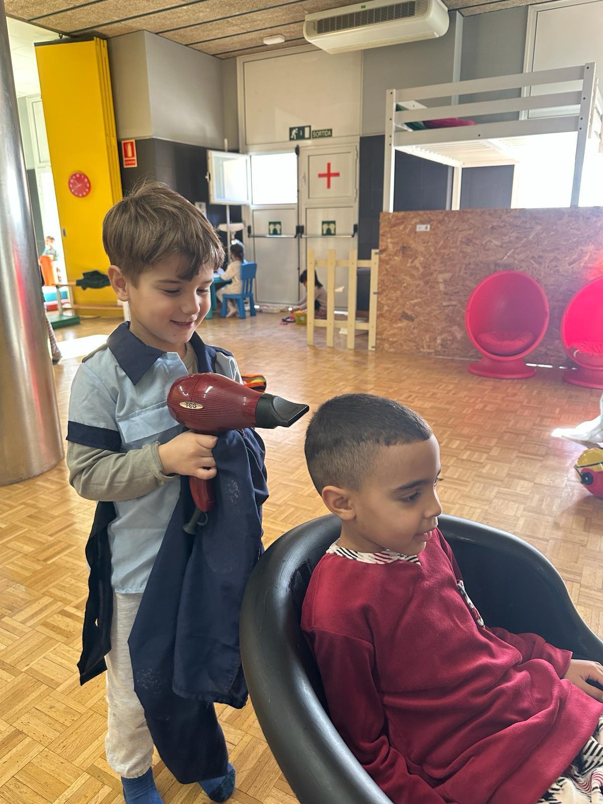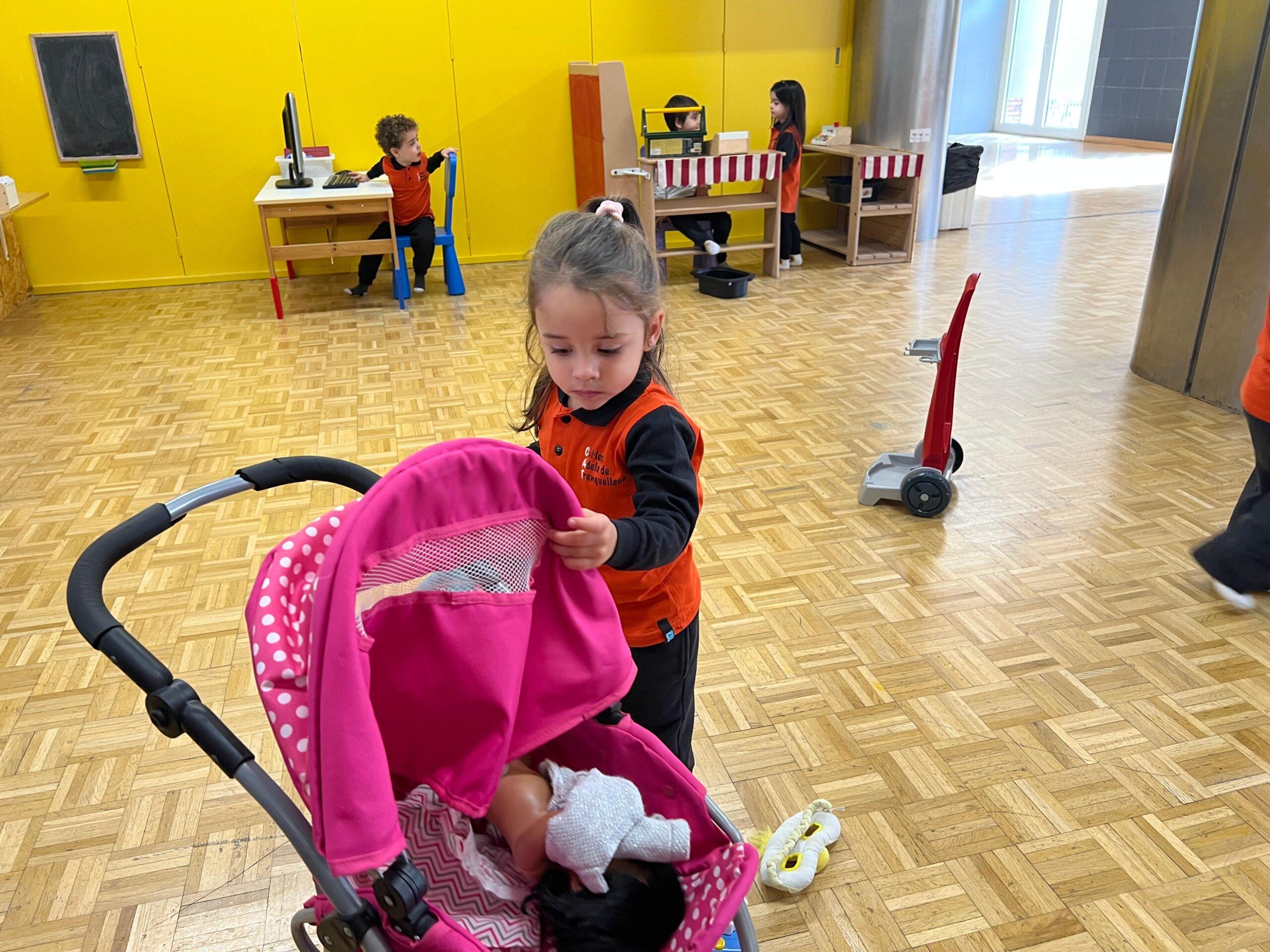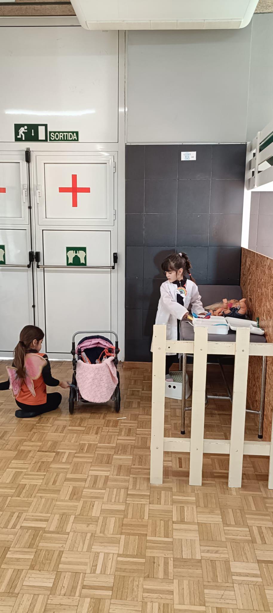 Allà van trobar-hi propostes molt variades. Van poder endinsar-se en el joc simbòlic amb la botigueta, la cuineta, la perruqueria i l’espai de metges. També van jugar a fer veure que treballaven en una oficina amb ordinadors i telèfons. Amb l’ajuda de les disfresses van acabar de donar vida a totes aquestes històries.