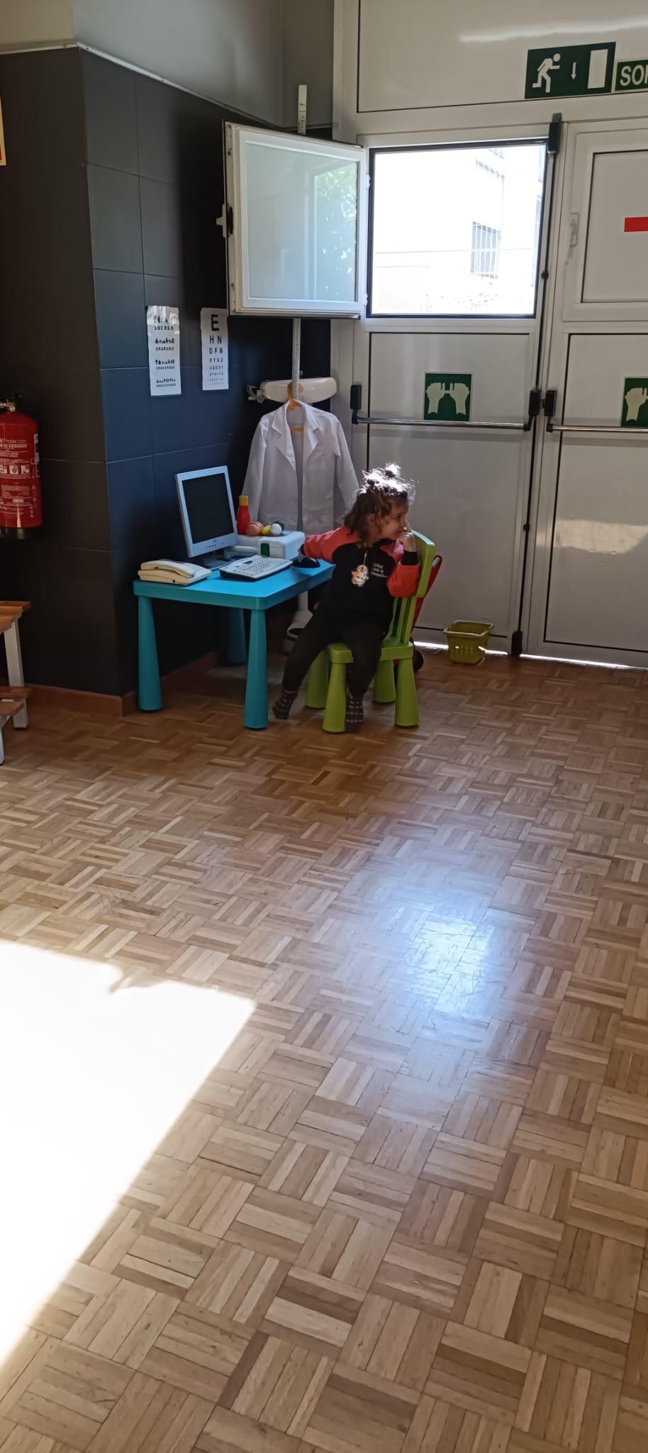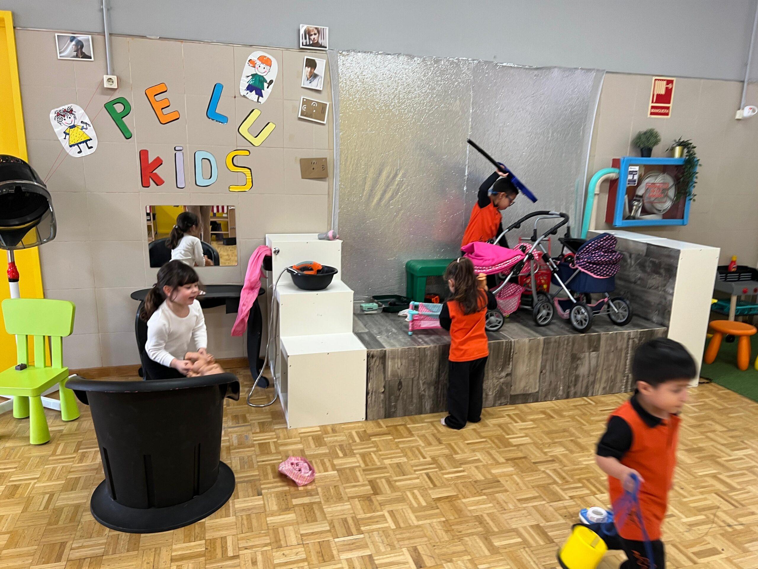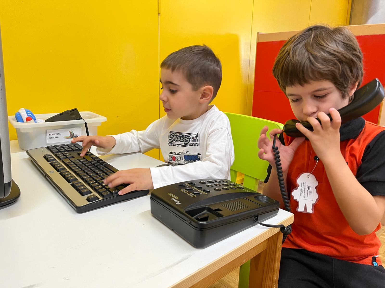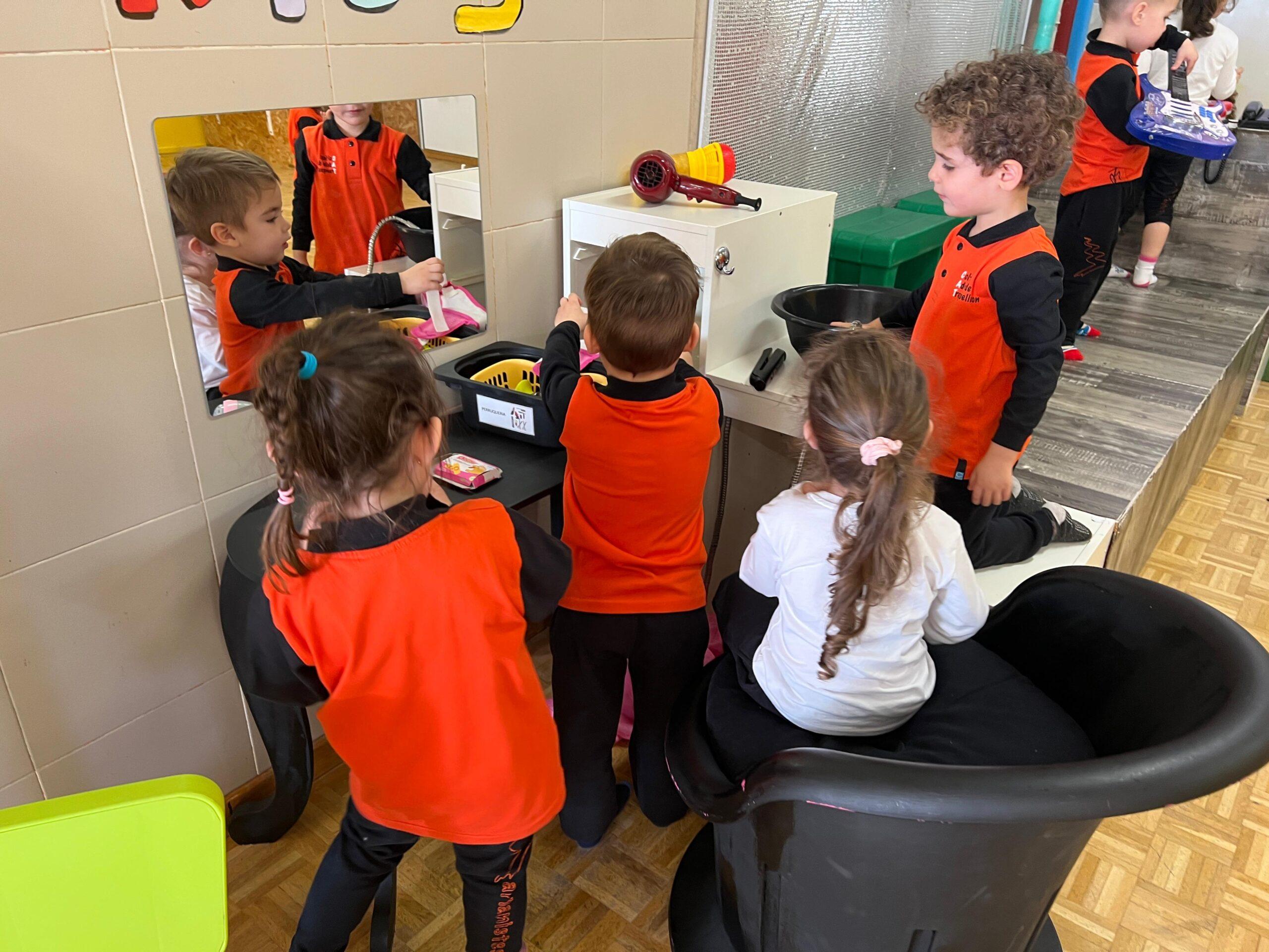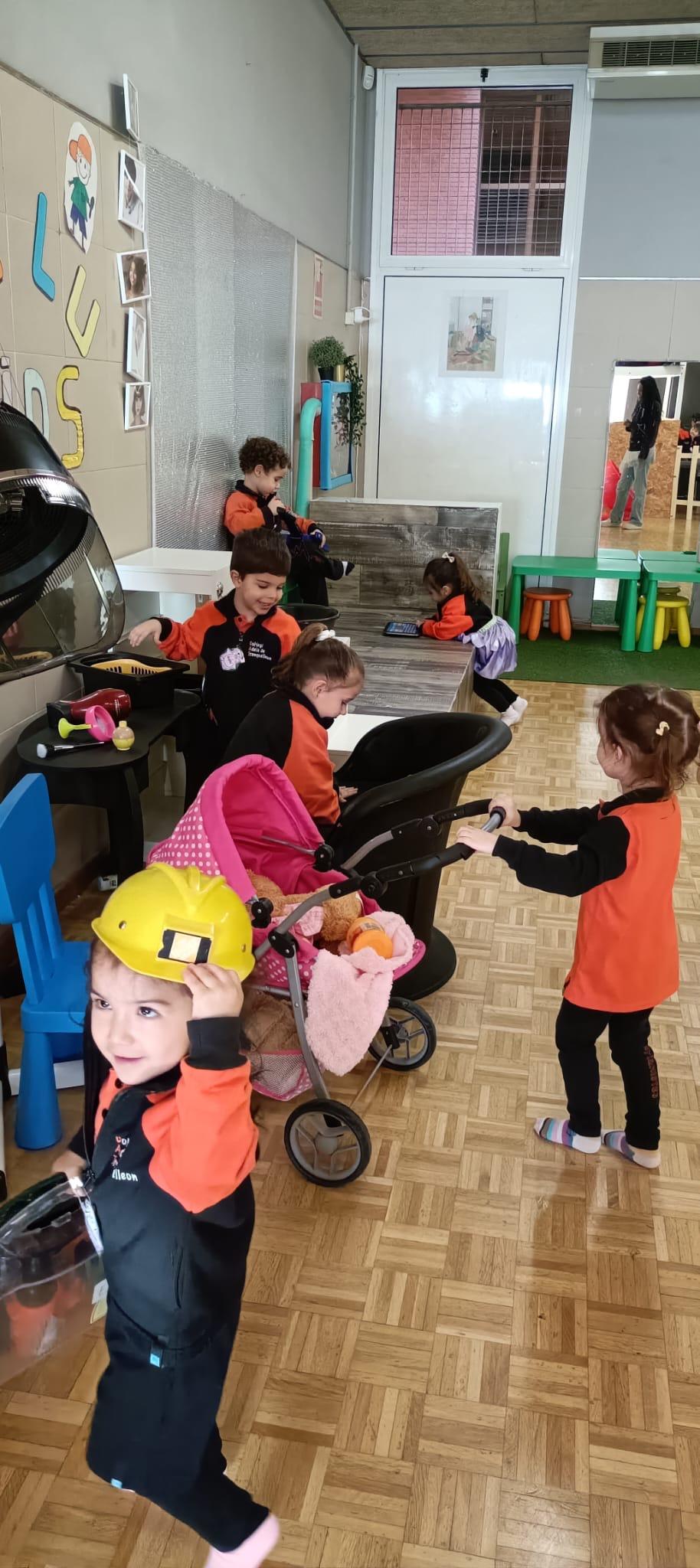 Allà van trobar-hi propostes molt variades. Van poder endinsar-se en el joc simbòlic amb la botigueta, la cuineta, la perruqueria i l’espai de metges. També van jugar a fer veure que treballaven en una oficina amb ordinadors i telèfons. Amb l’ajuda de les disfresses van acabar de donar vida a totes aquestes històries.