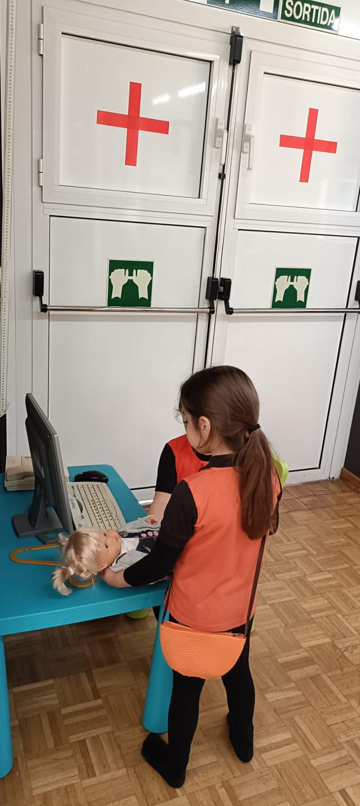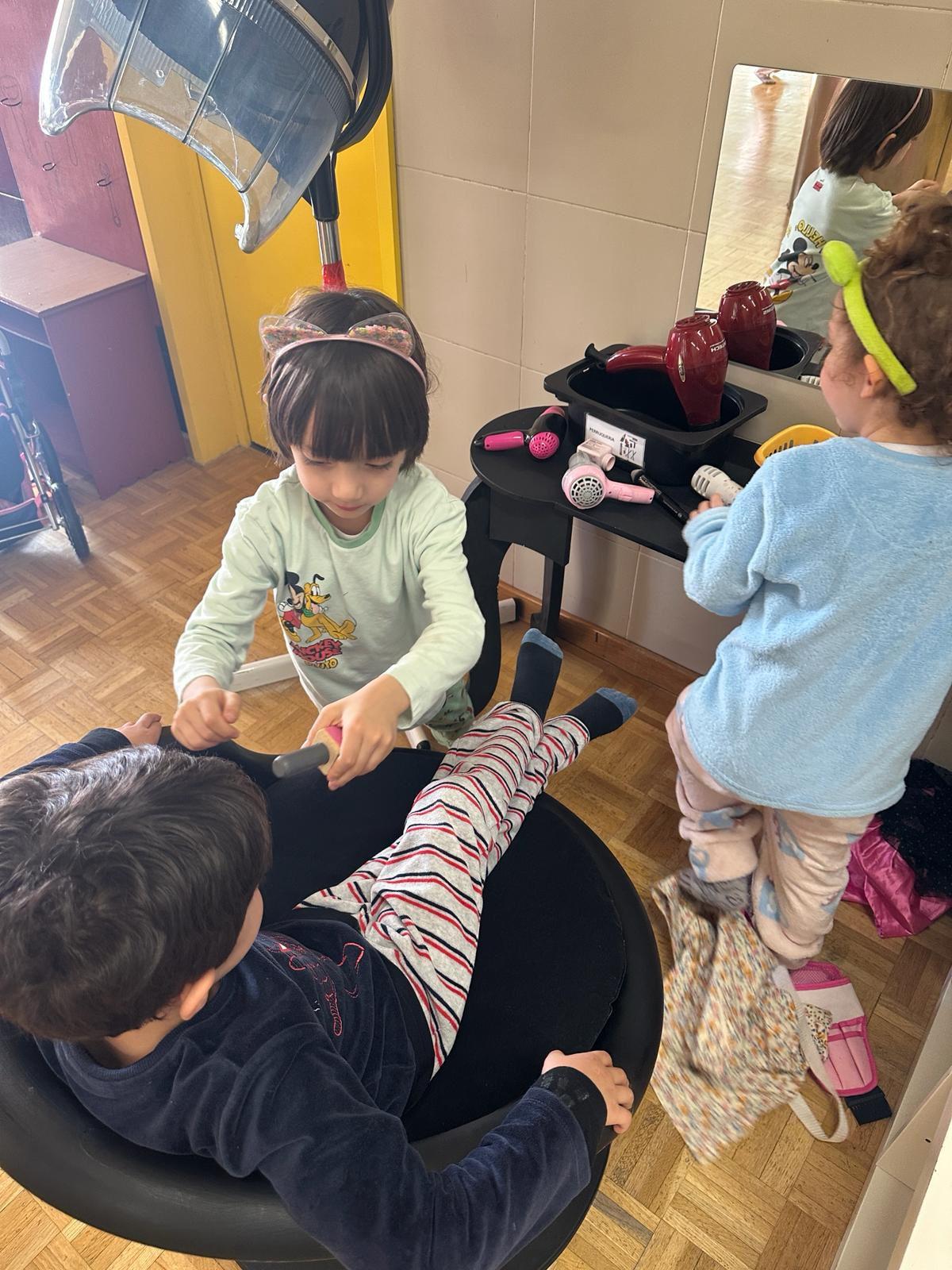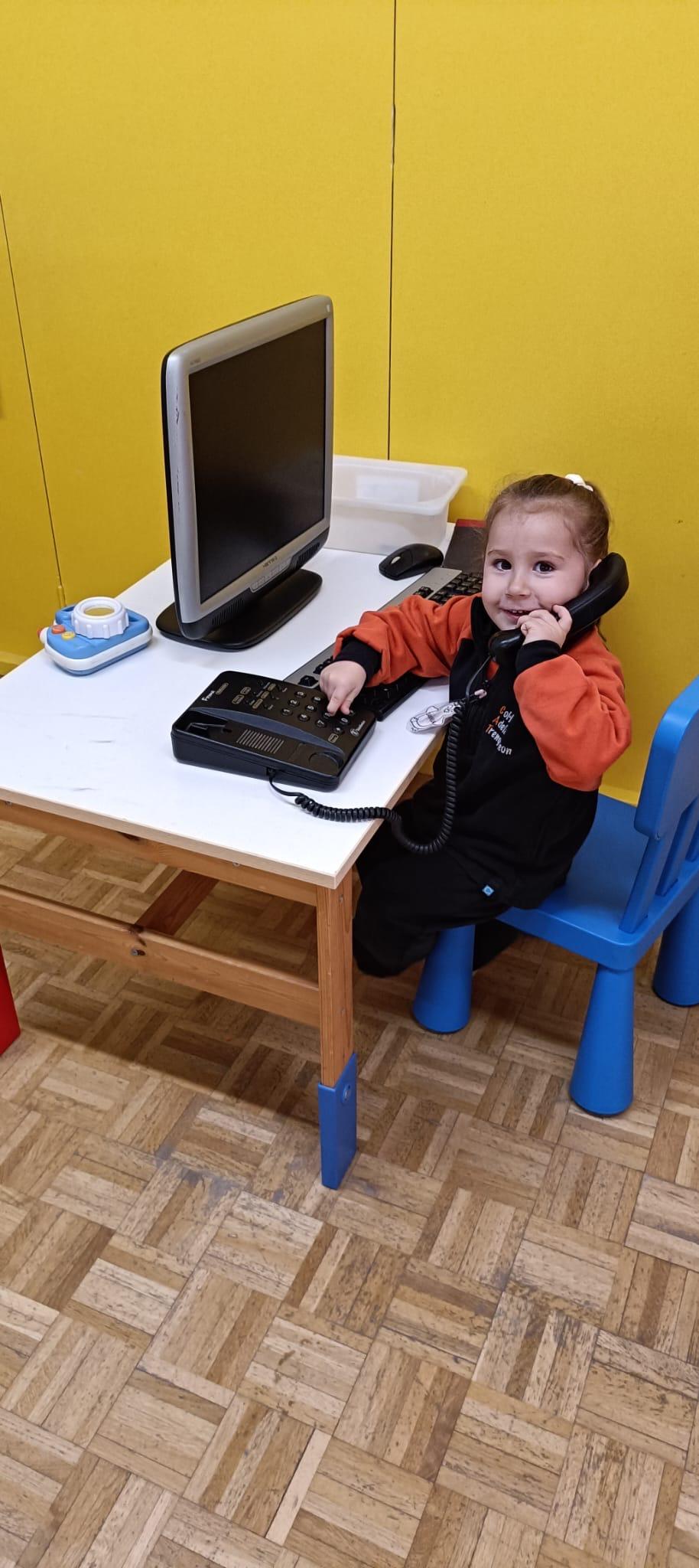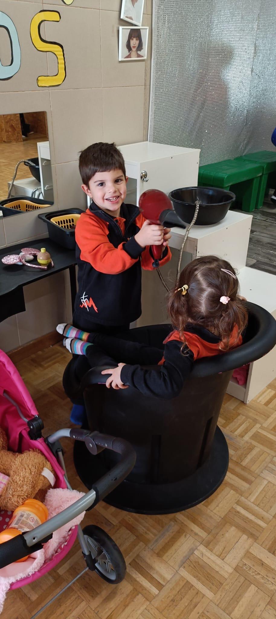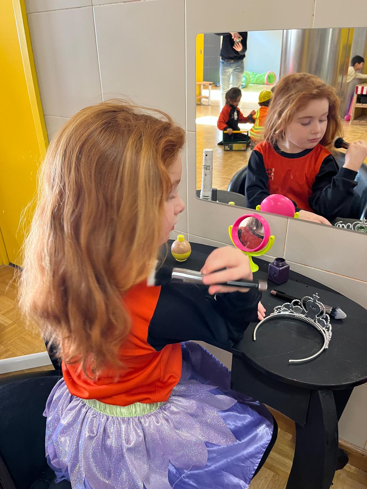 Allà van trobar-hi propostes molt variades. Van poder endinsar-se en el joc simbòlic amb la botigueta, la cuineta, la perruqueria i l’espai de metges. També van jugar a fer veure que treballaven en una oficina amb ordinadors i telèfons. Amb l’ajuda de les disfresses van acabar de donar vida a totes aquestes històries.