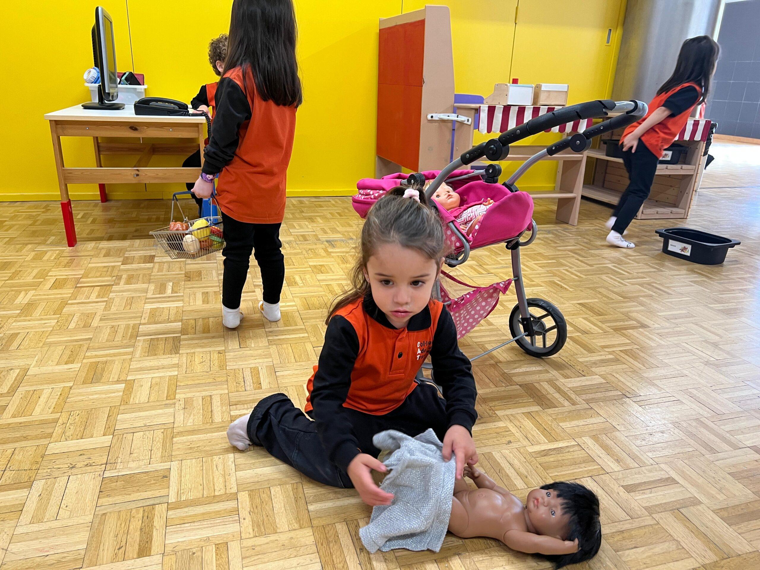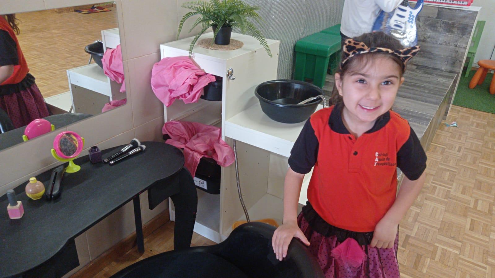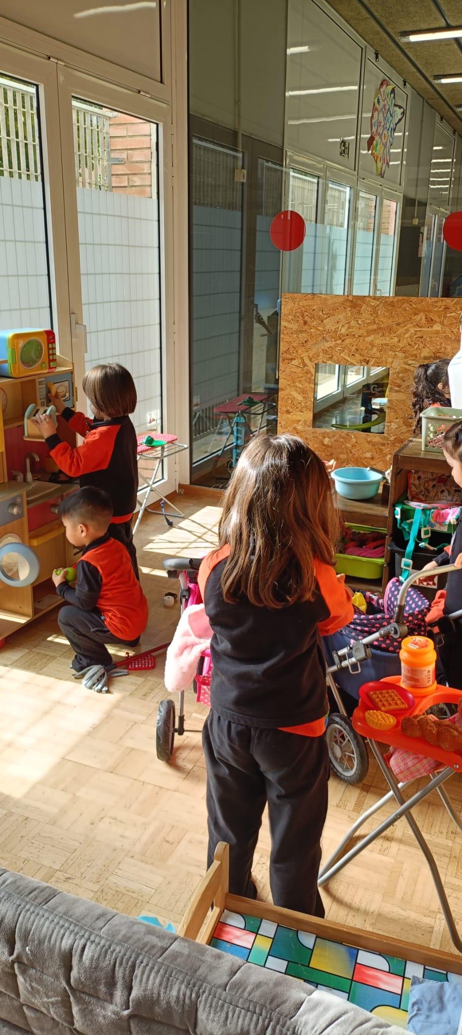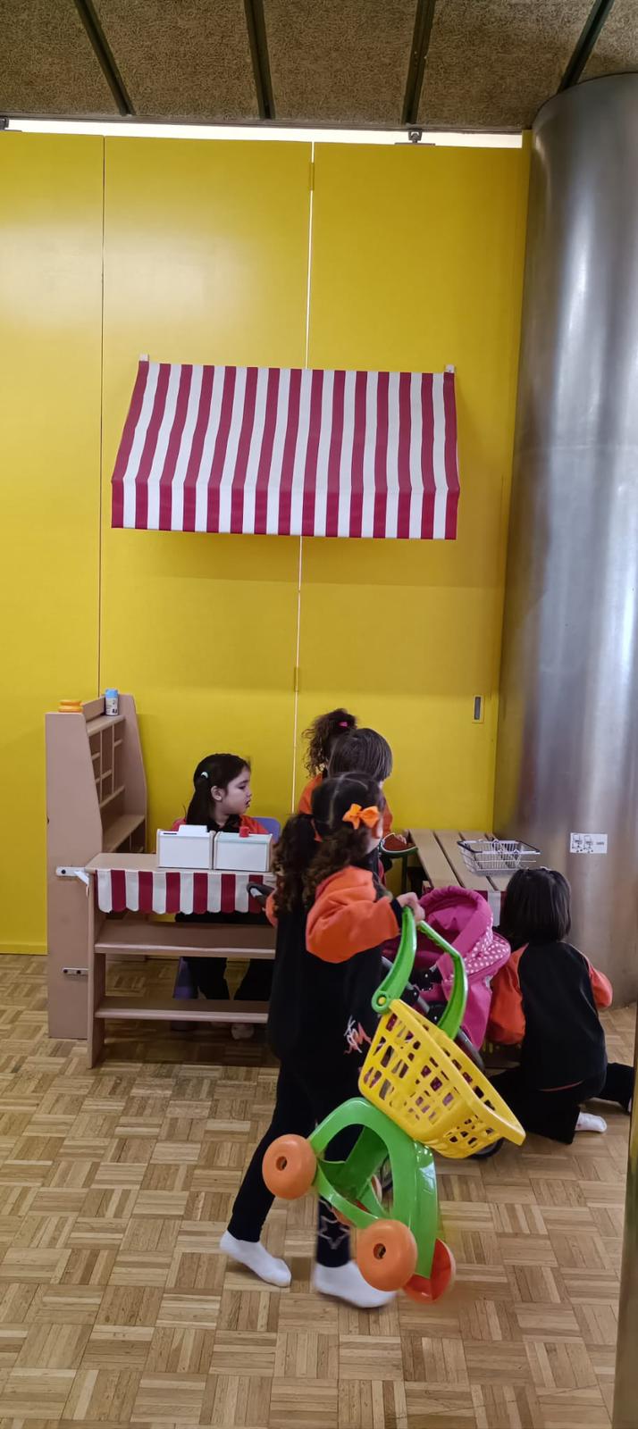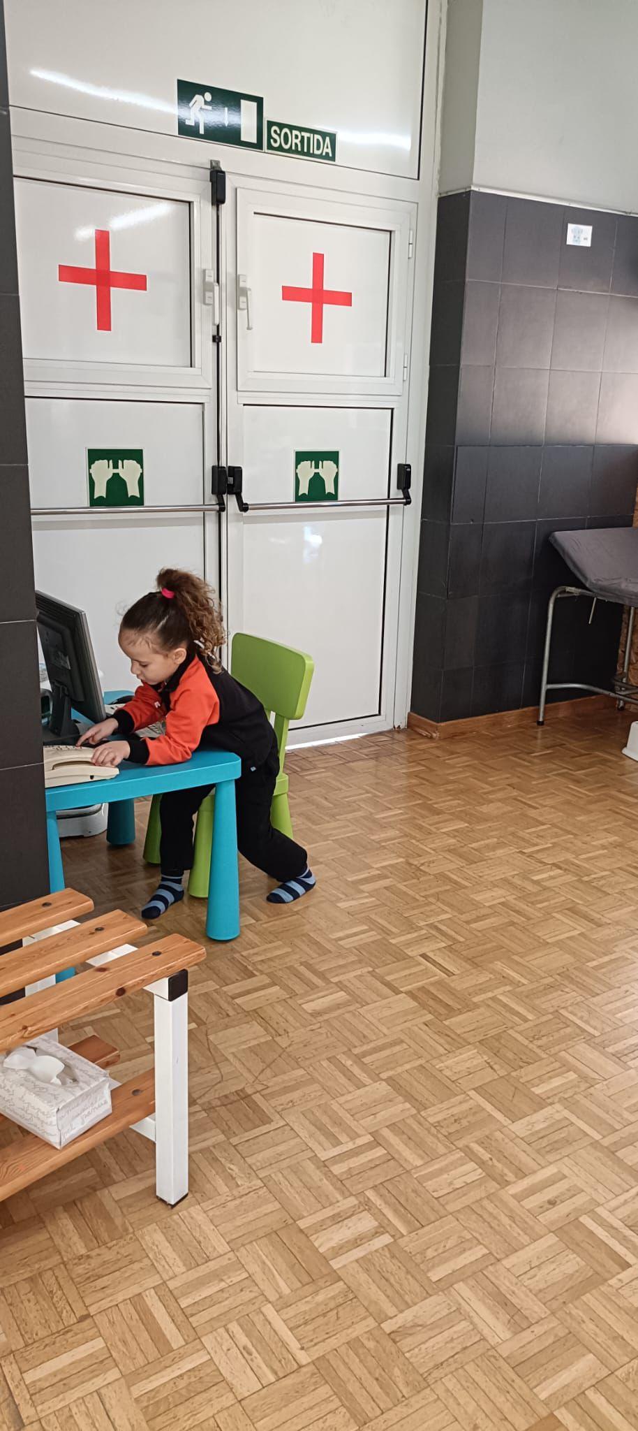 Allà van trobar-hi propostes molt variades. Van poder endinsar-se en el joc simbòlic amb la botigueta, la cuineta, la perruqueria i l’espai de metges. També van jugar a fer veure que treballaven en una oficina amb ordinadors i telèfons. Amb l’ajuda de les disfresses van acabar de donar vida a totes aquestes històries.