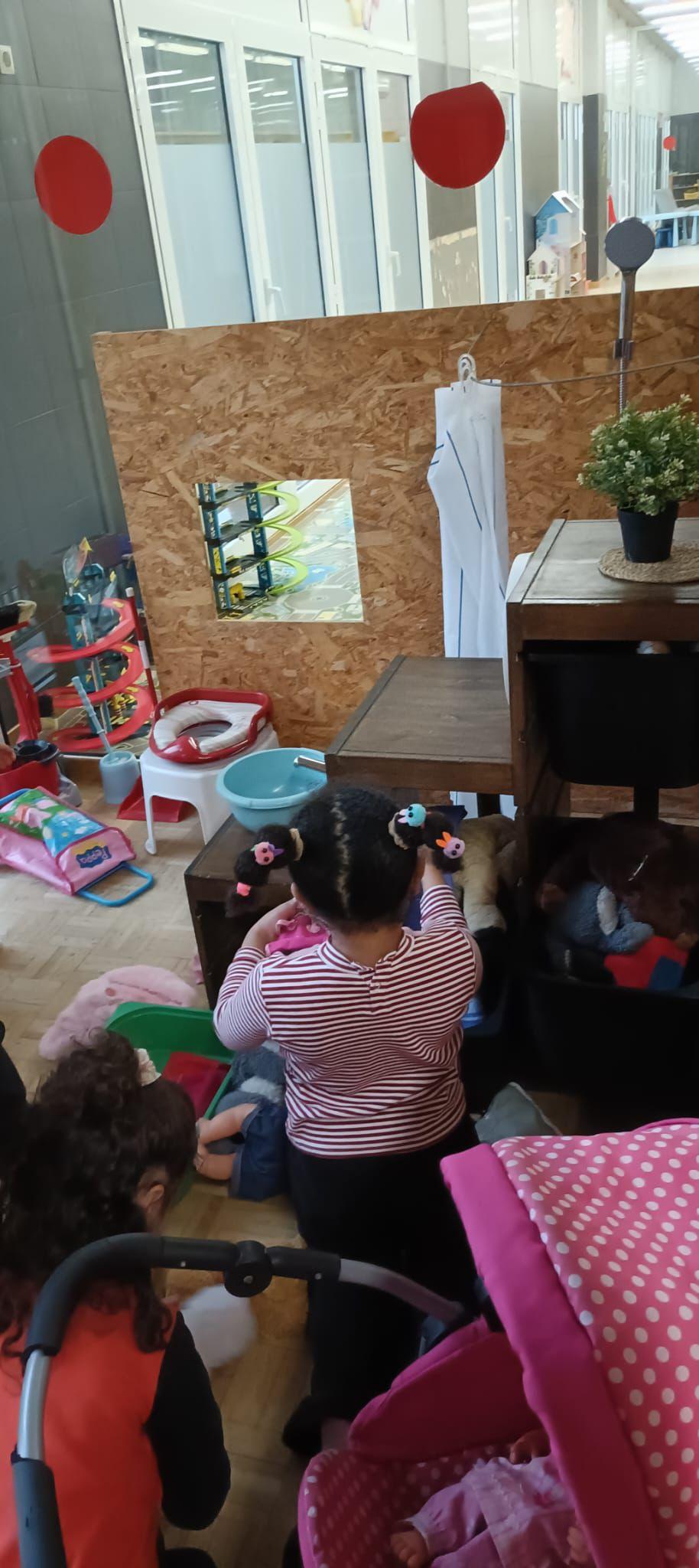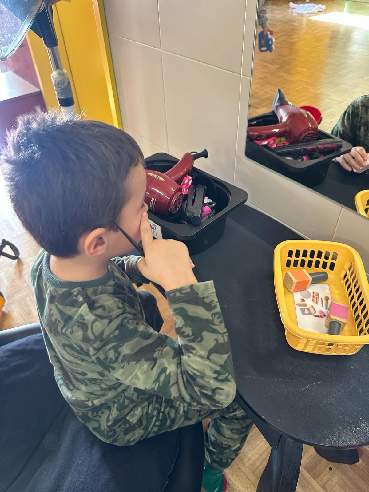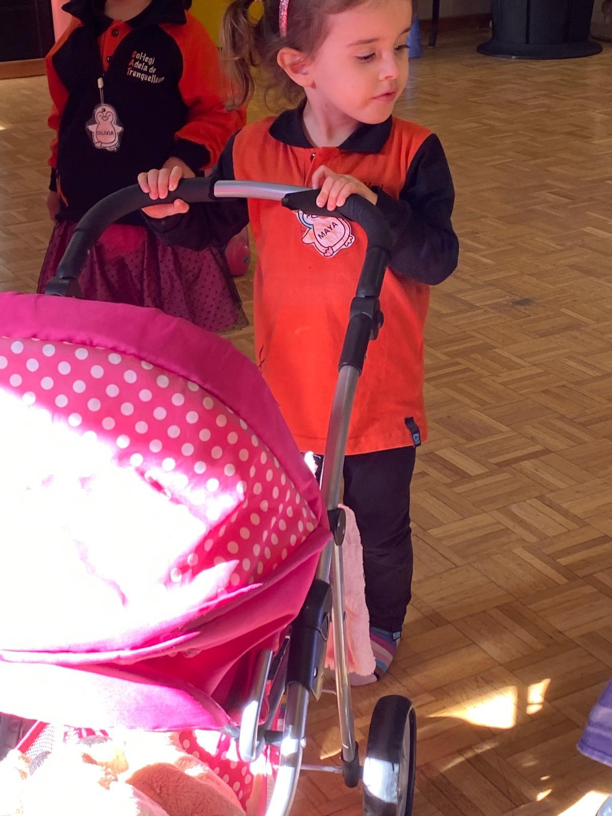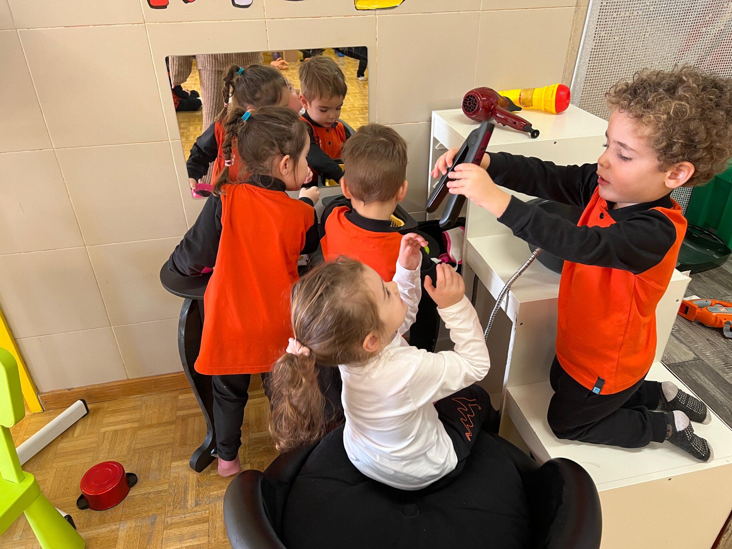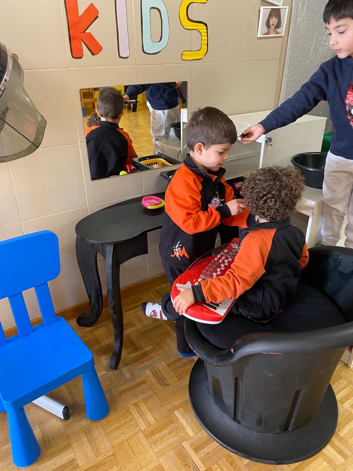 Allà van trobar-hi propostes molt variades. Van poder endinsar-se en el joc simbòlic amb la botigueta, la cuineta, la perruqueria i l’espai de metges. També van jugar a fer veure que treballaven en una oficina amb ordinadors i telèfons. Amb l’ajuda de les disfresses van acabar de donar vida a totes aquestes històries.