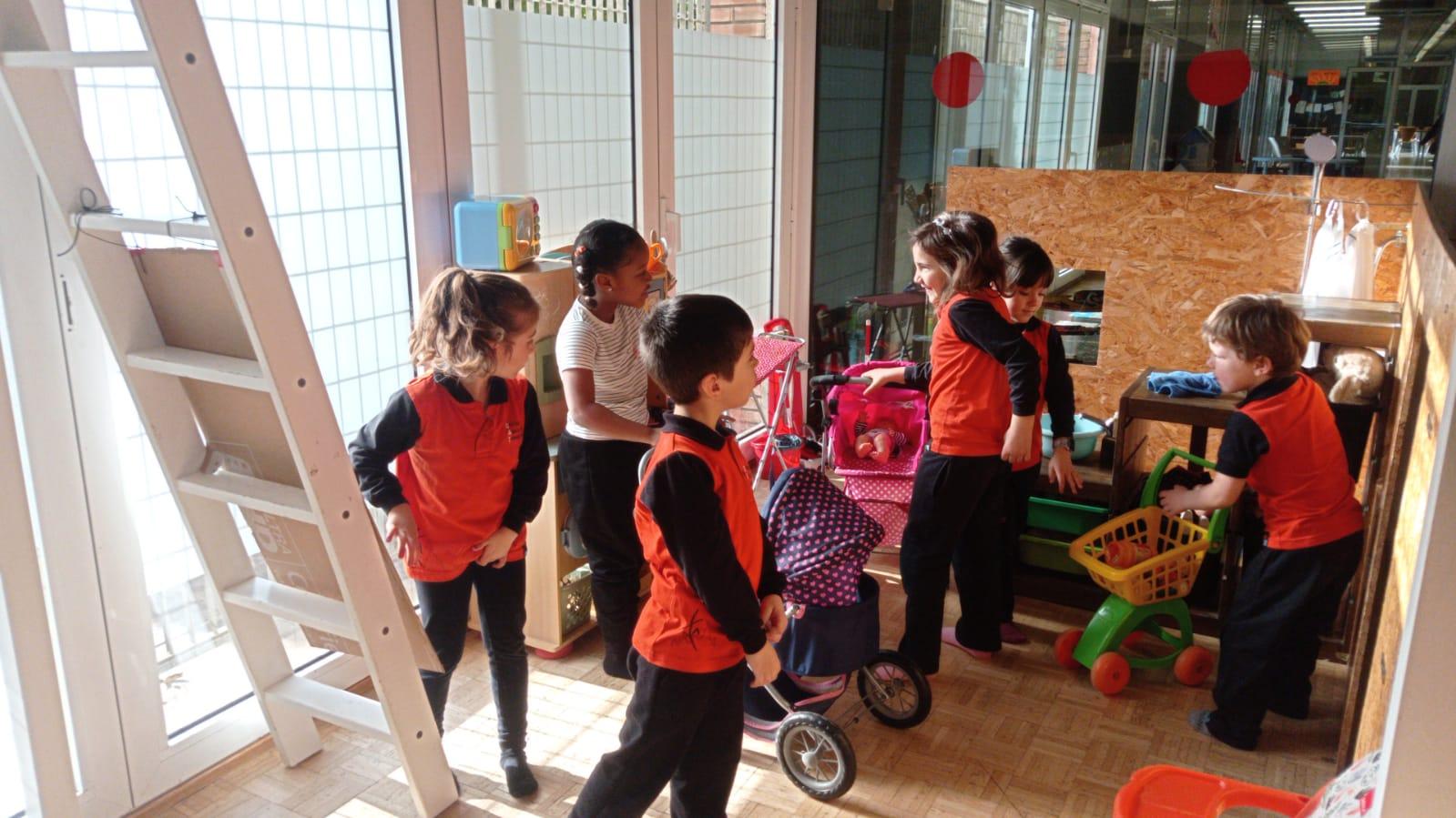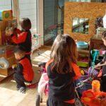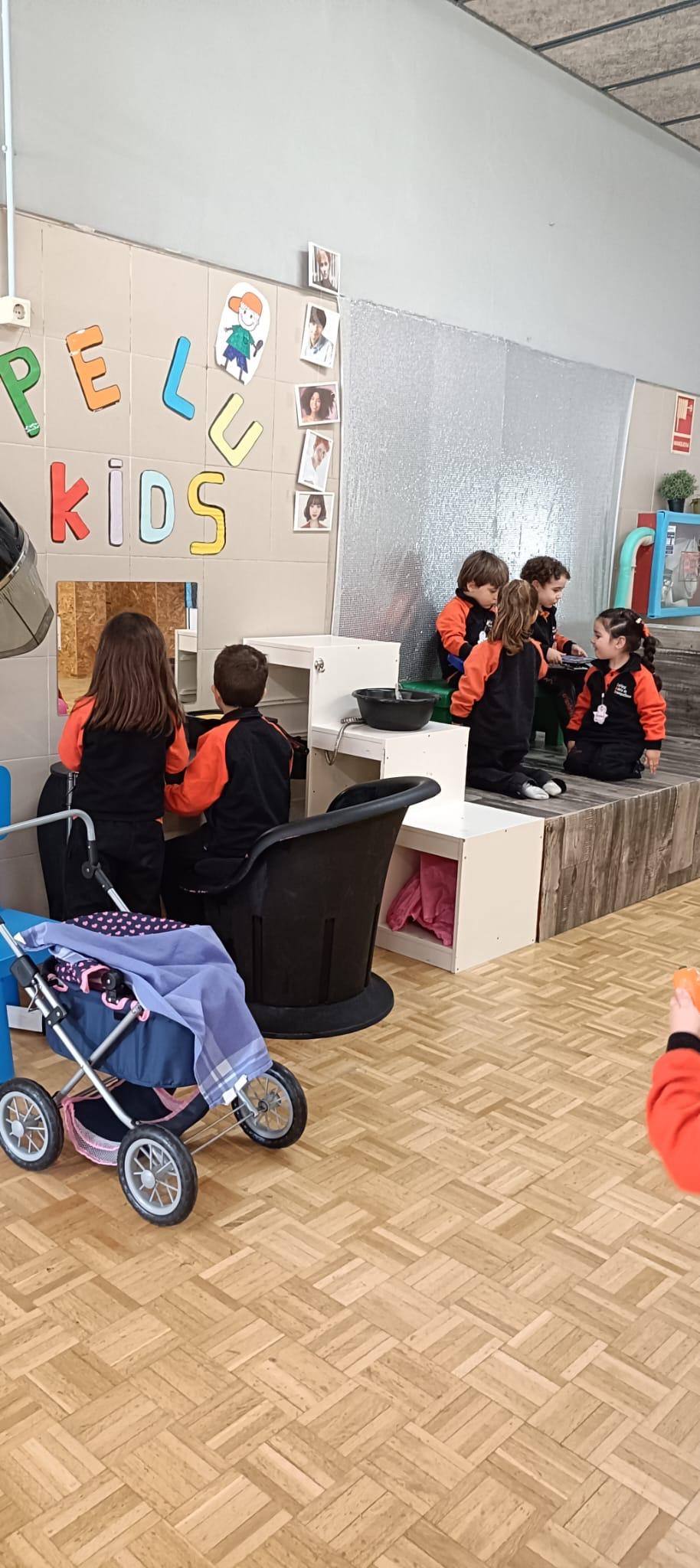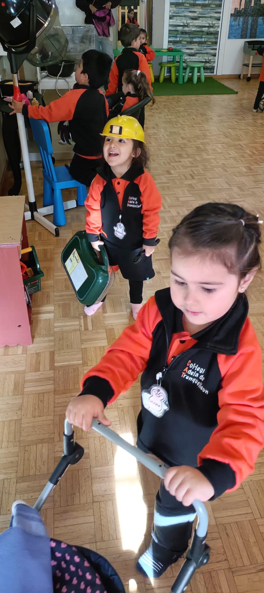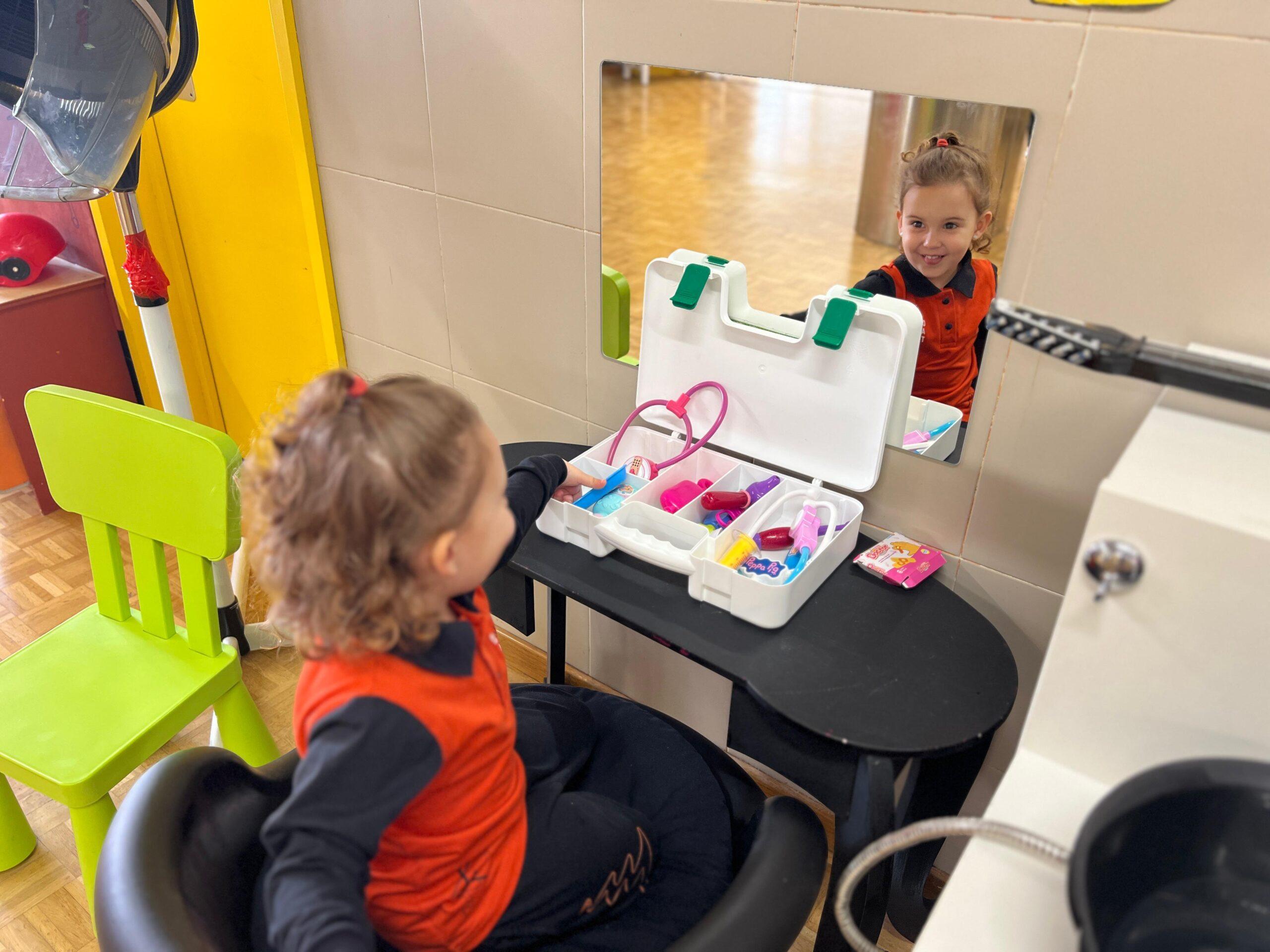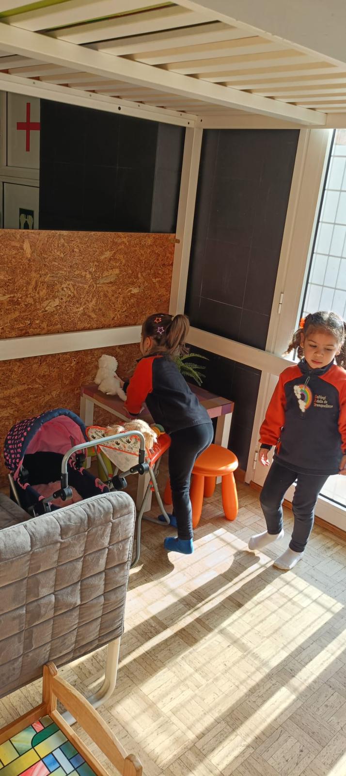 Allà van trobar-hi propostes molt variades. Van poder endinsar-se en el joc simbòlic amb la botigueta, la cuineta, la perruqueria i l’espai de metges. També van jugar a fer veure que treballaven en una oficina amb ordinadors i telèfons. Amb l’ajuda de les disfresses van acabar de donar vida a totes aquestes històries.