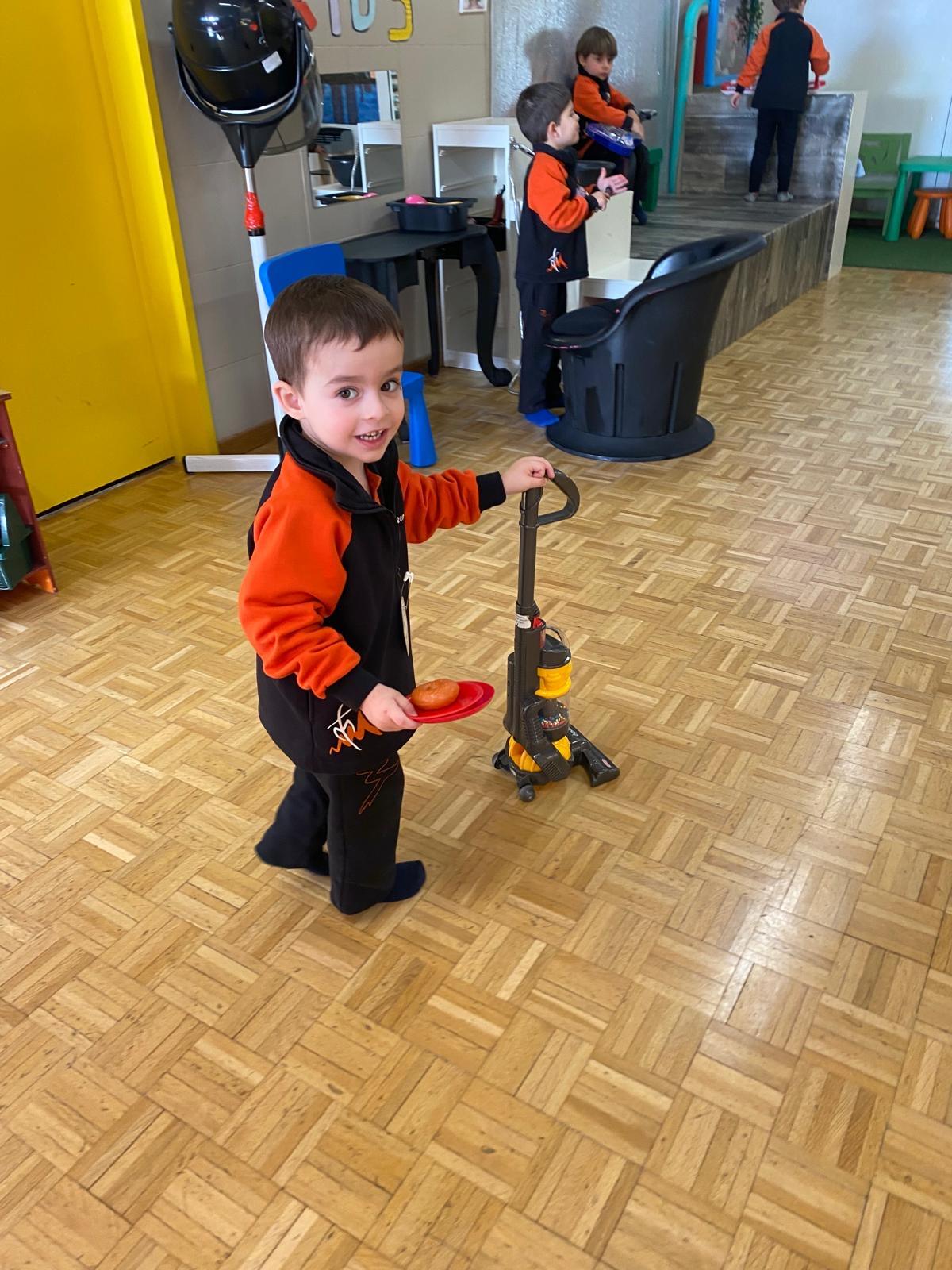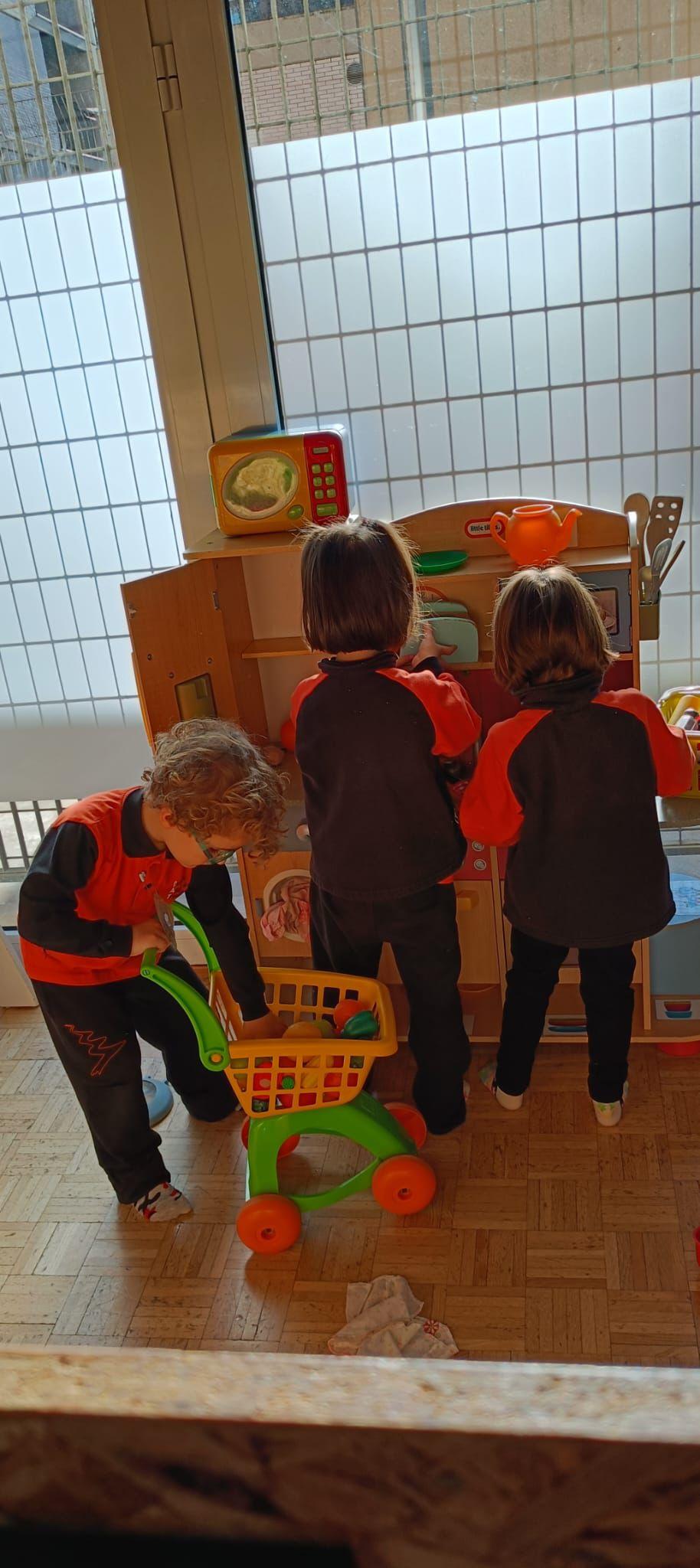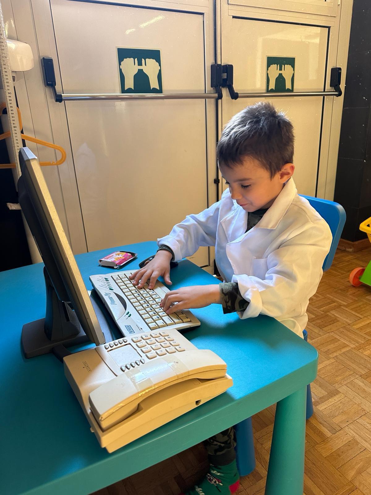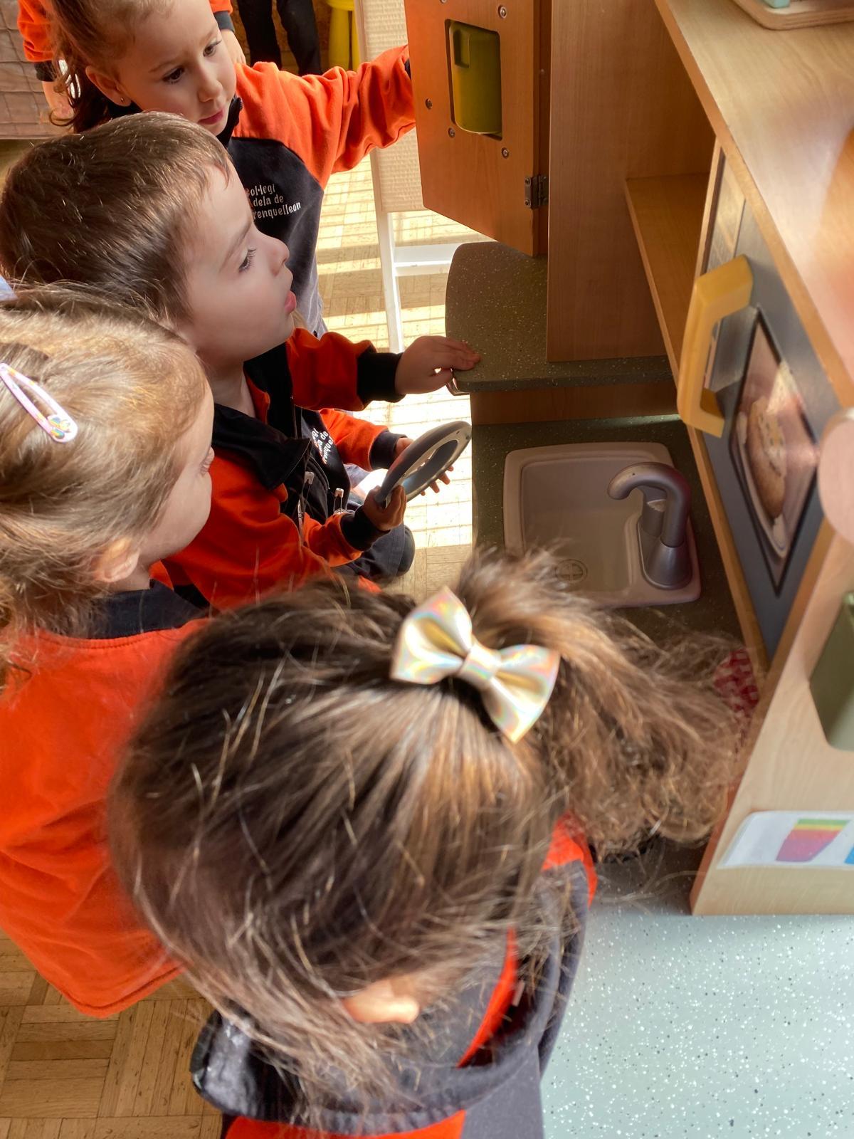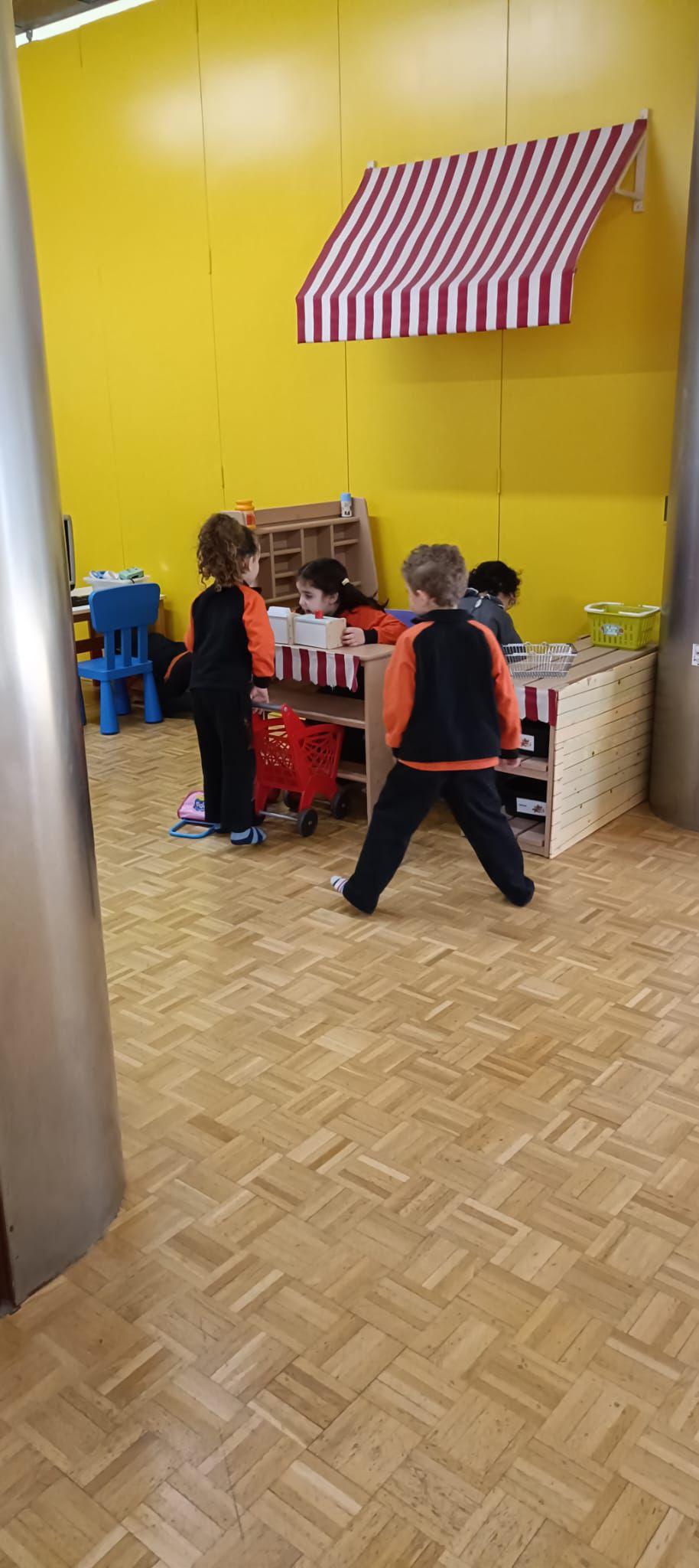 Allà van trobar-hi propostes molt variades. Van poder endinsar-se en el joc simbòlic amb la botigueta, la cuineta, la perruqueria i l’espai de metges. També van jugar a fer veure que treballaven en una oficina amb ordinadors i telèfons. Amb l’ajuda de les disfresses van acabar de donar vida a totes aquestes històries.