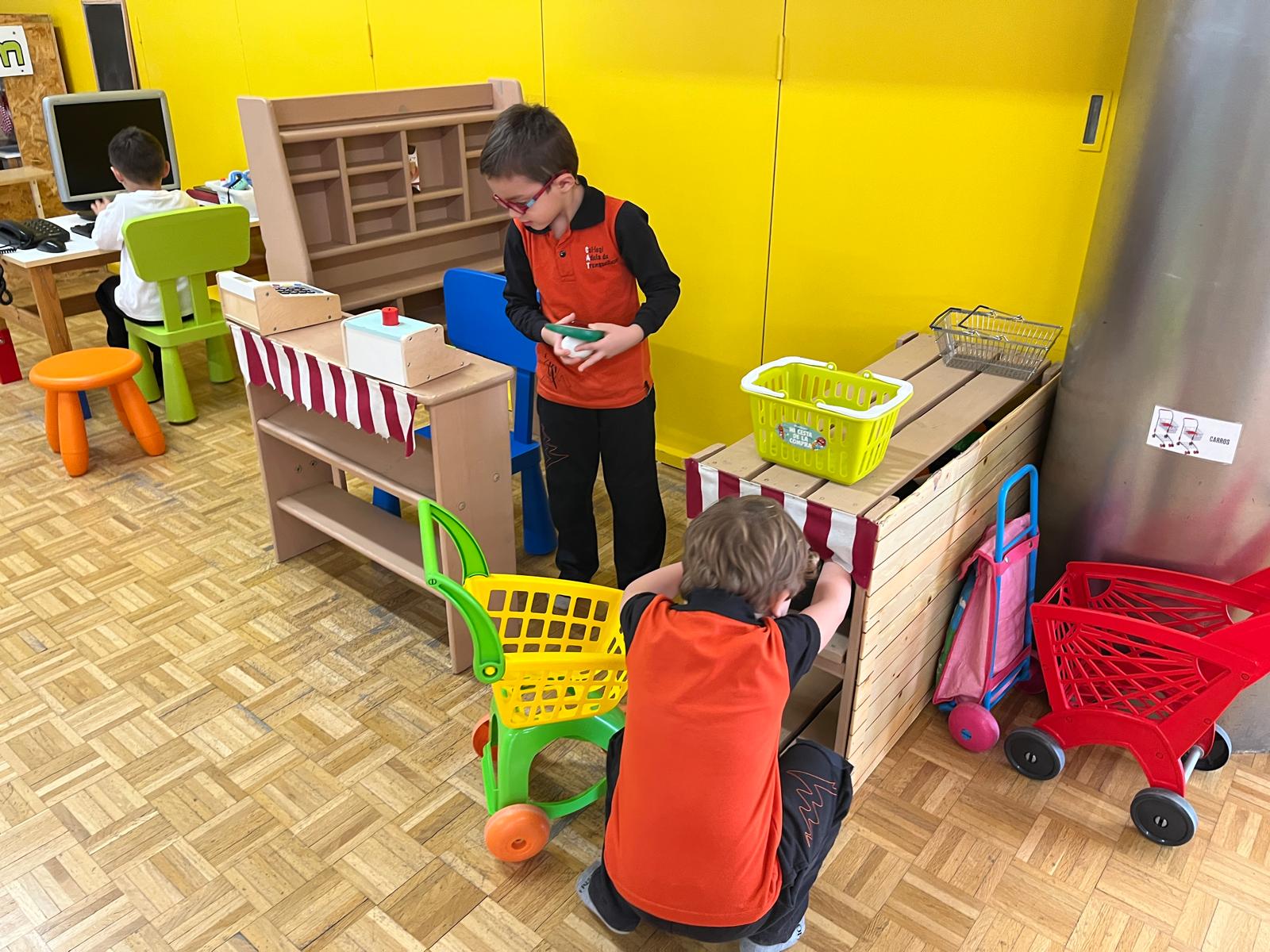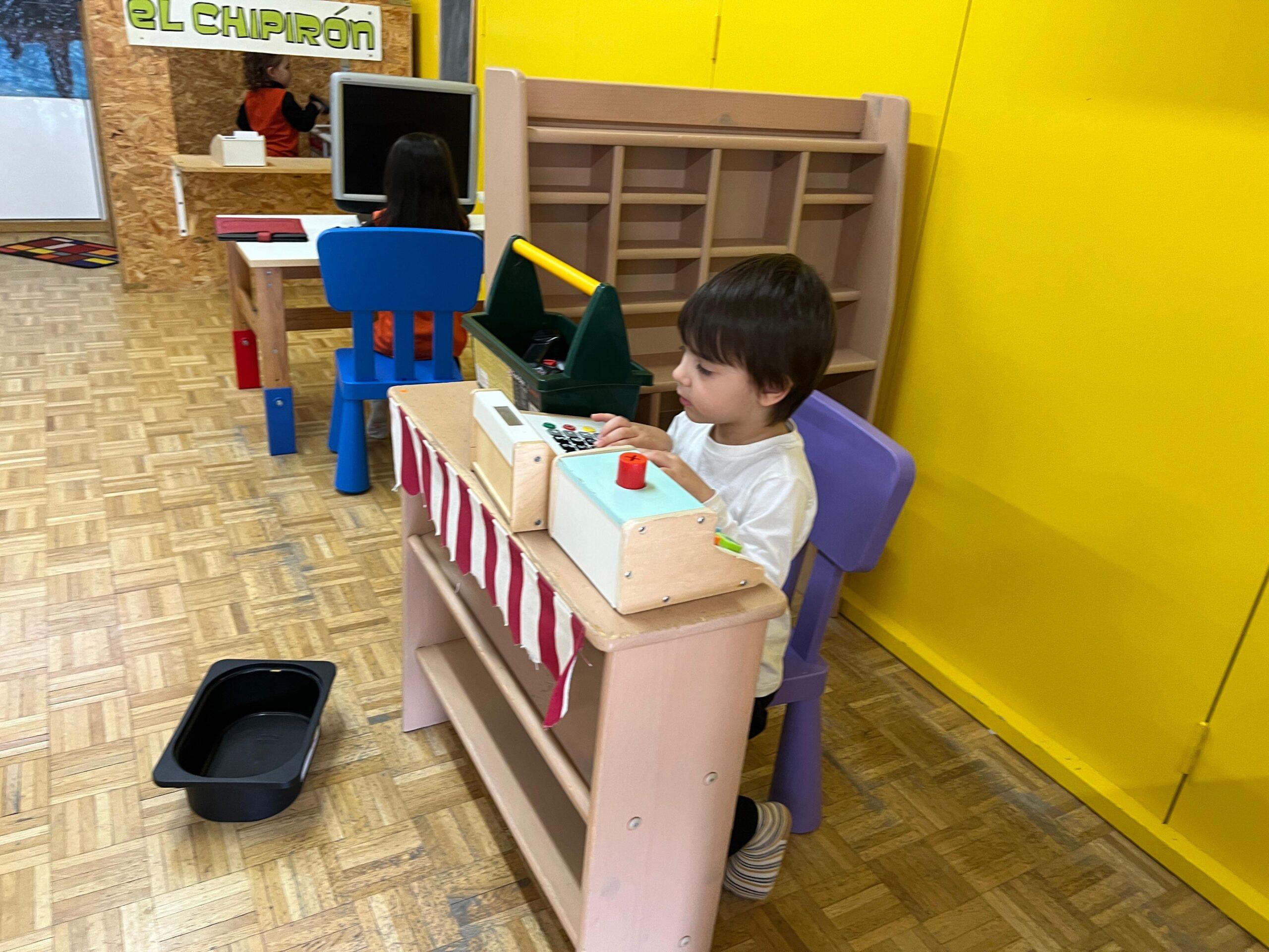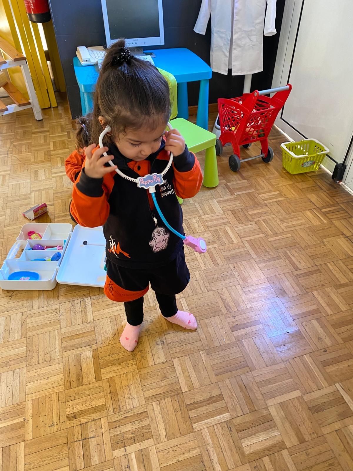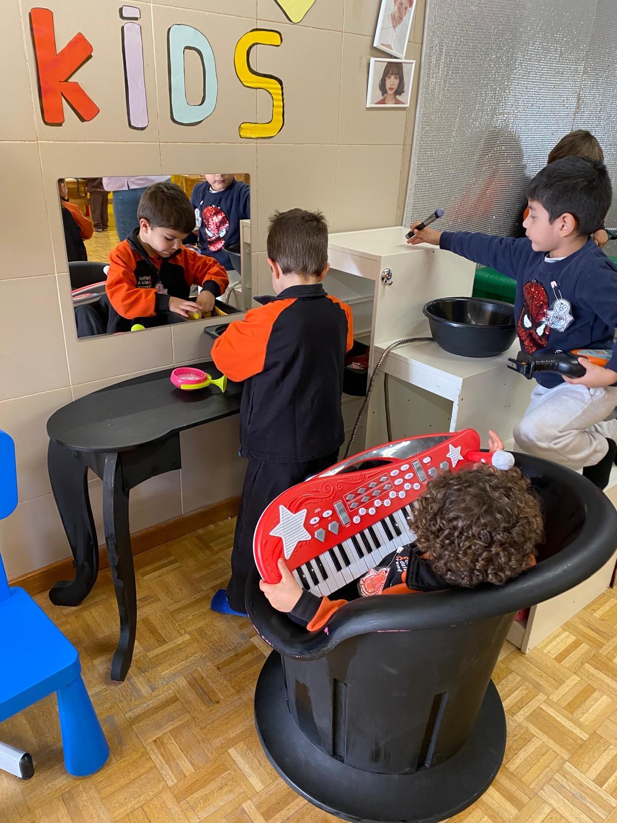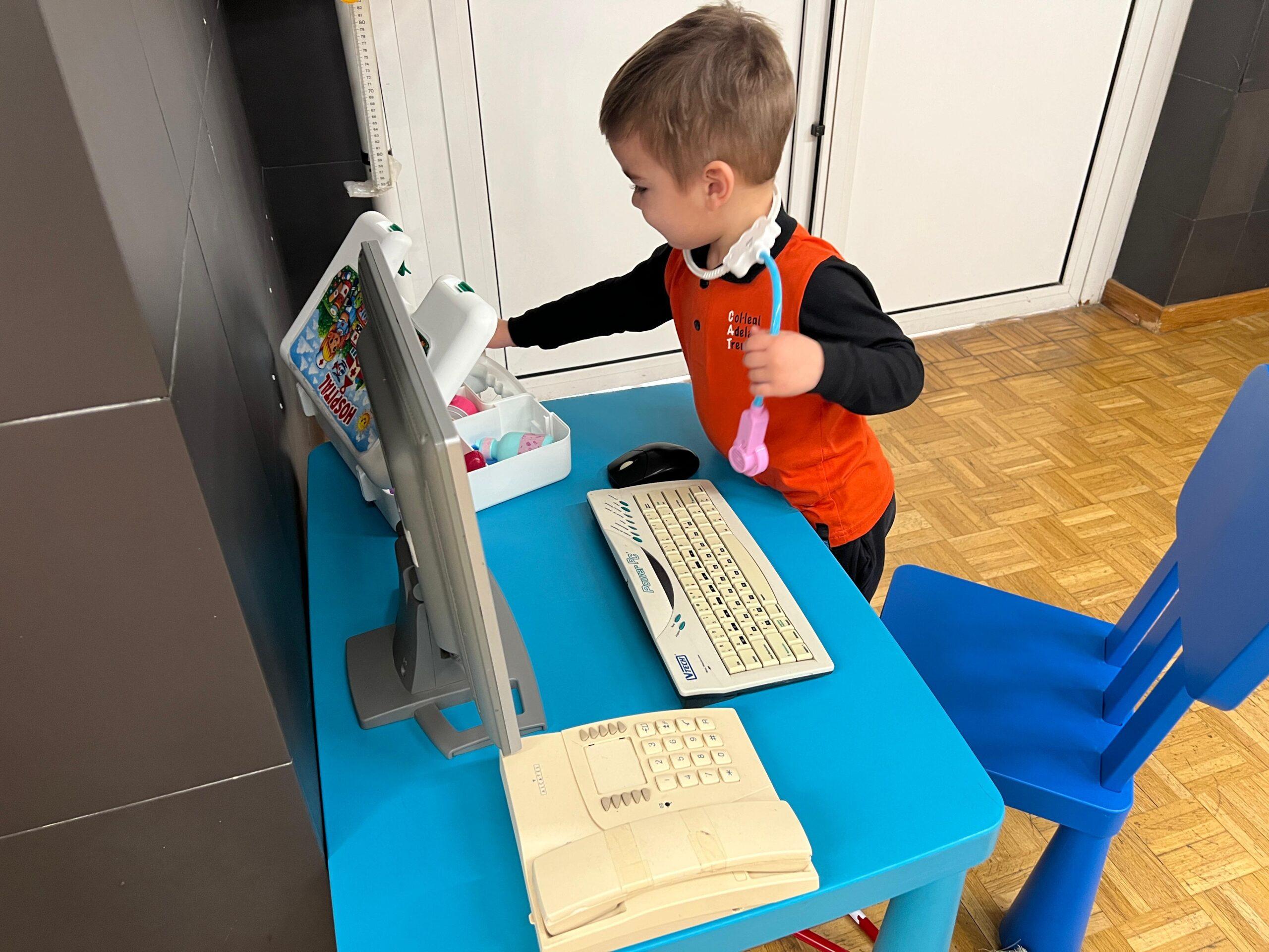 Allà van trobar-hi propostes molt variades. Van poder endinsar-se en el joc simbòlic amb la botigueta, la cuineta, la perruqueria i l’espai de metges. També van jugar a fer veure que treballaven en una oficina amb ordinadors i telèfons. Amb l’ajuda de les disfresses van acabar de donar vida a totes aquestes històries.