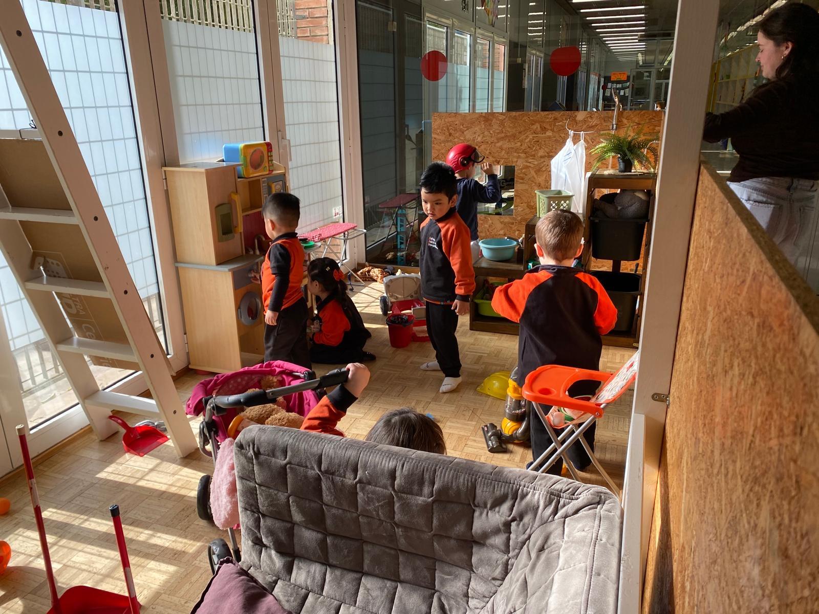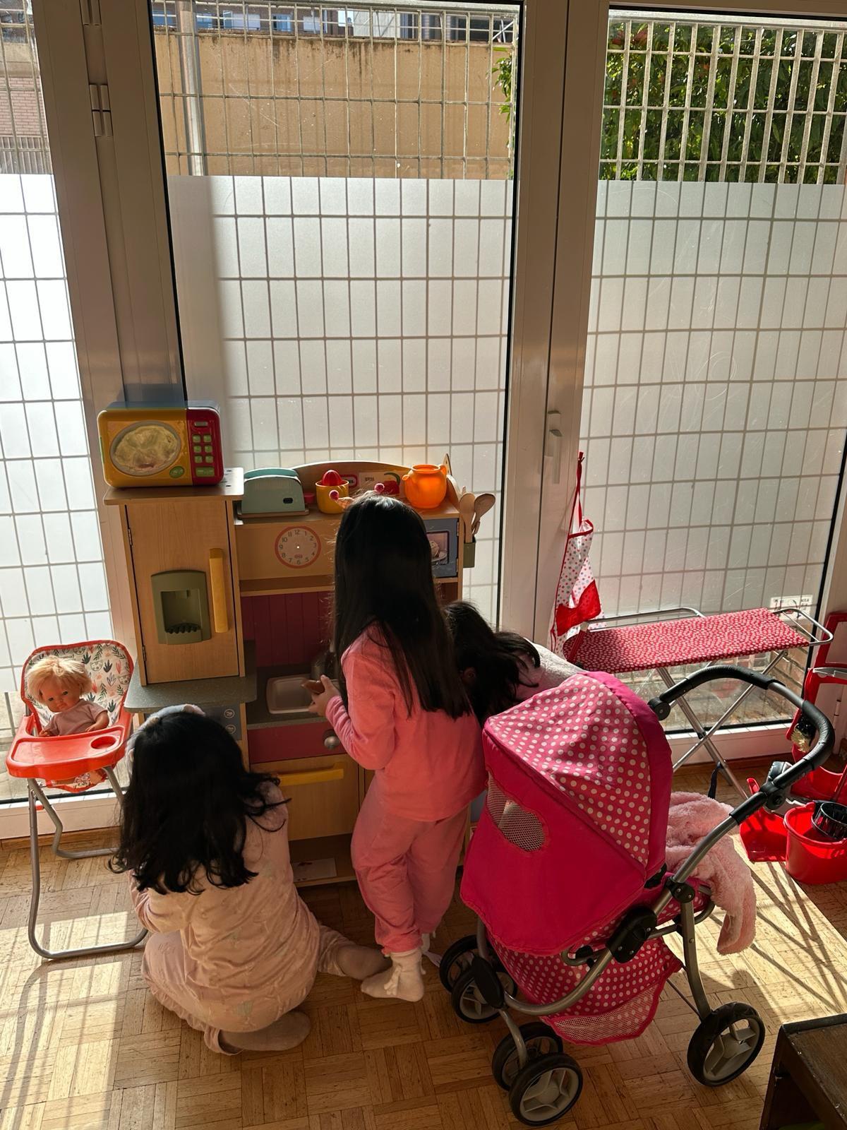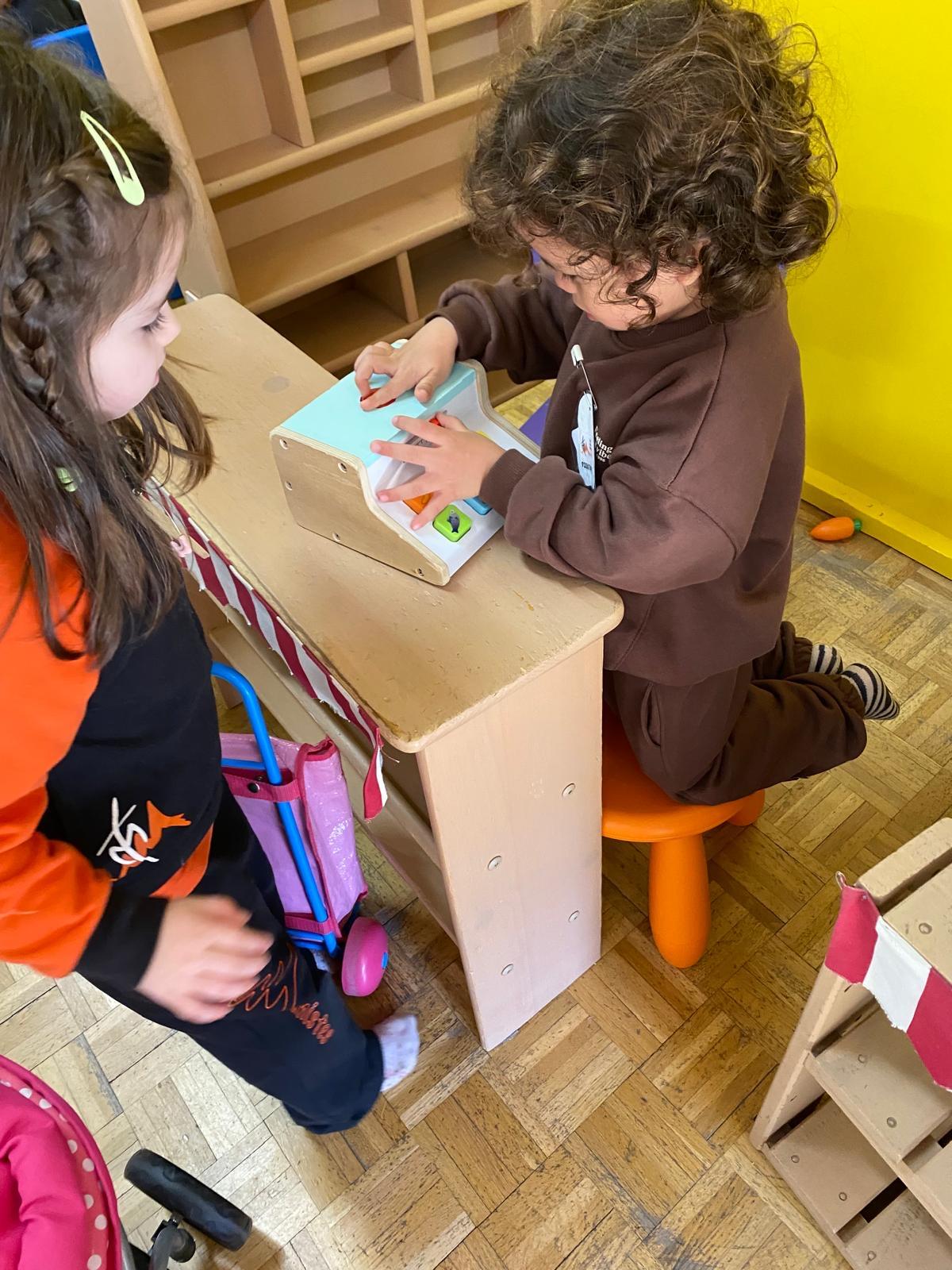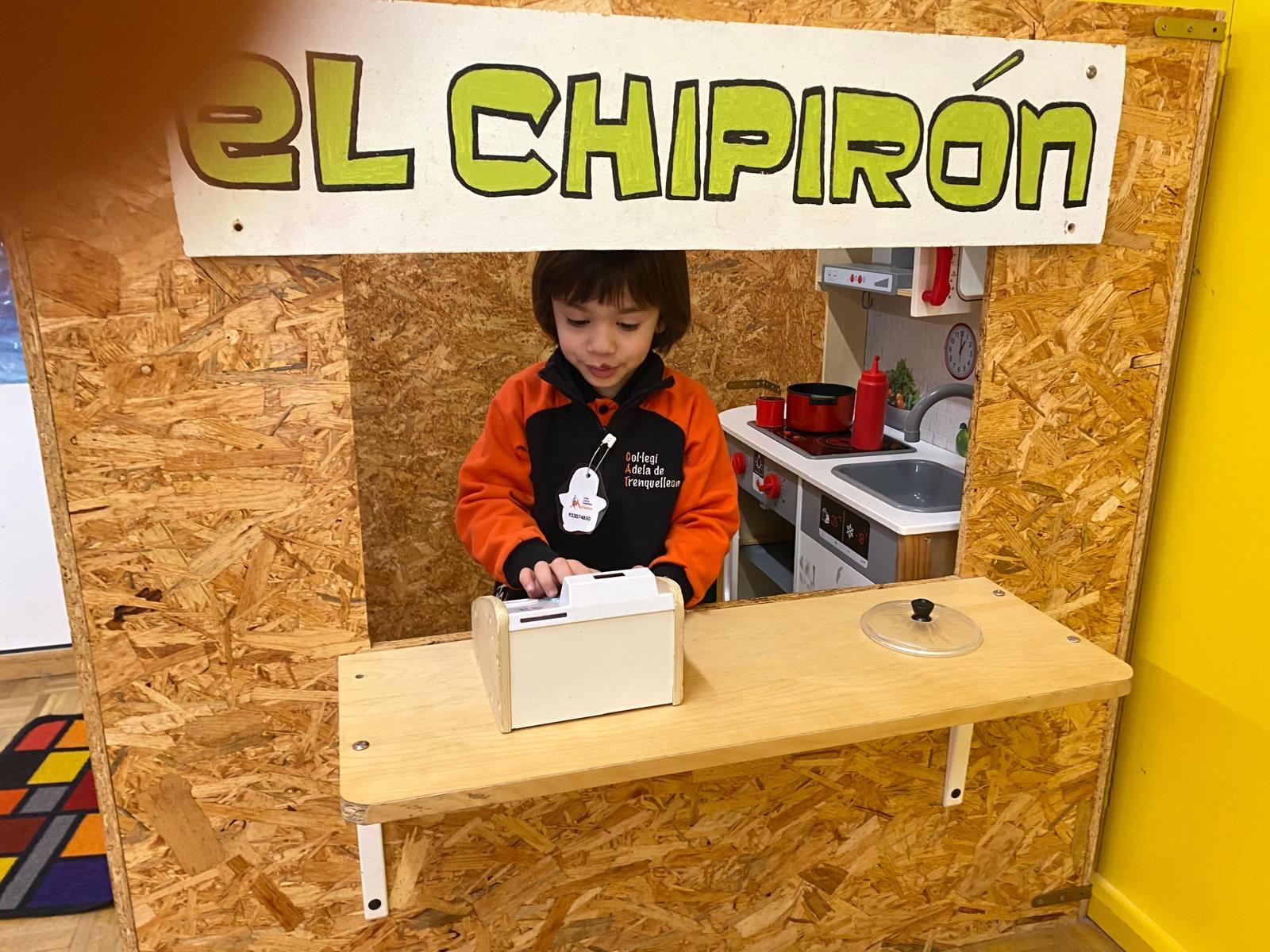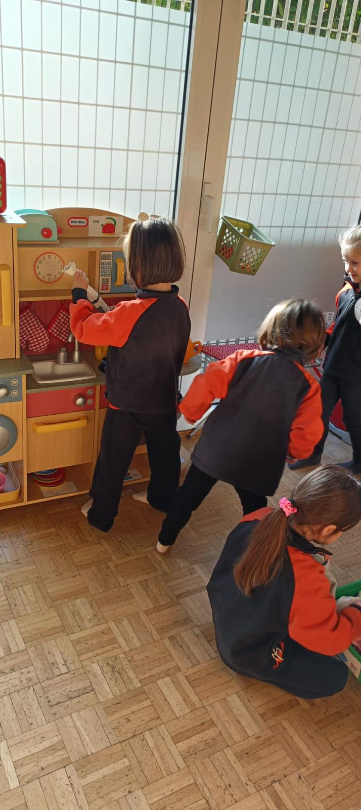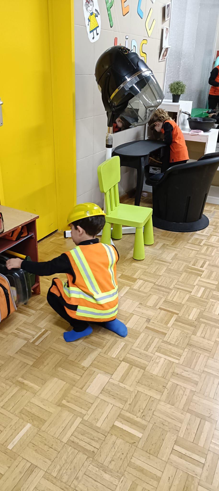 Allà van trobar-hi propostes molt variades. Van poder endinsar-se en el joc simbòlic amb la botigueta, la cuineta, la perruqueria i l’espai de metges. També van jugar a fer veure que treballaven en una oficina amb ordinadors i telèfons. Amb l’ajuda de les disfresses van acabar de donar vida a totes aquestes històries.