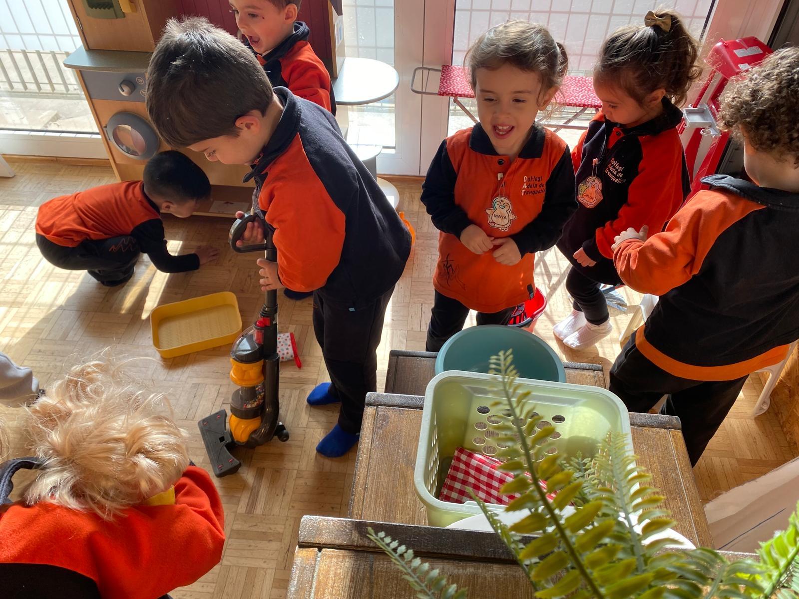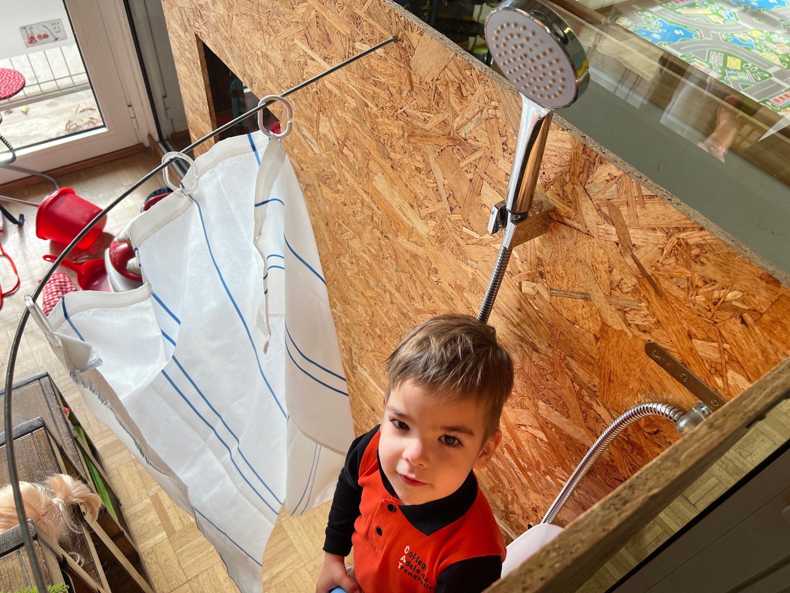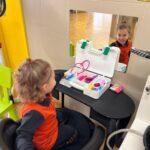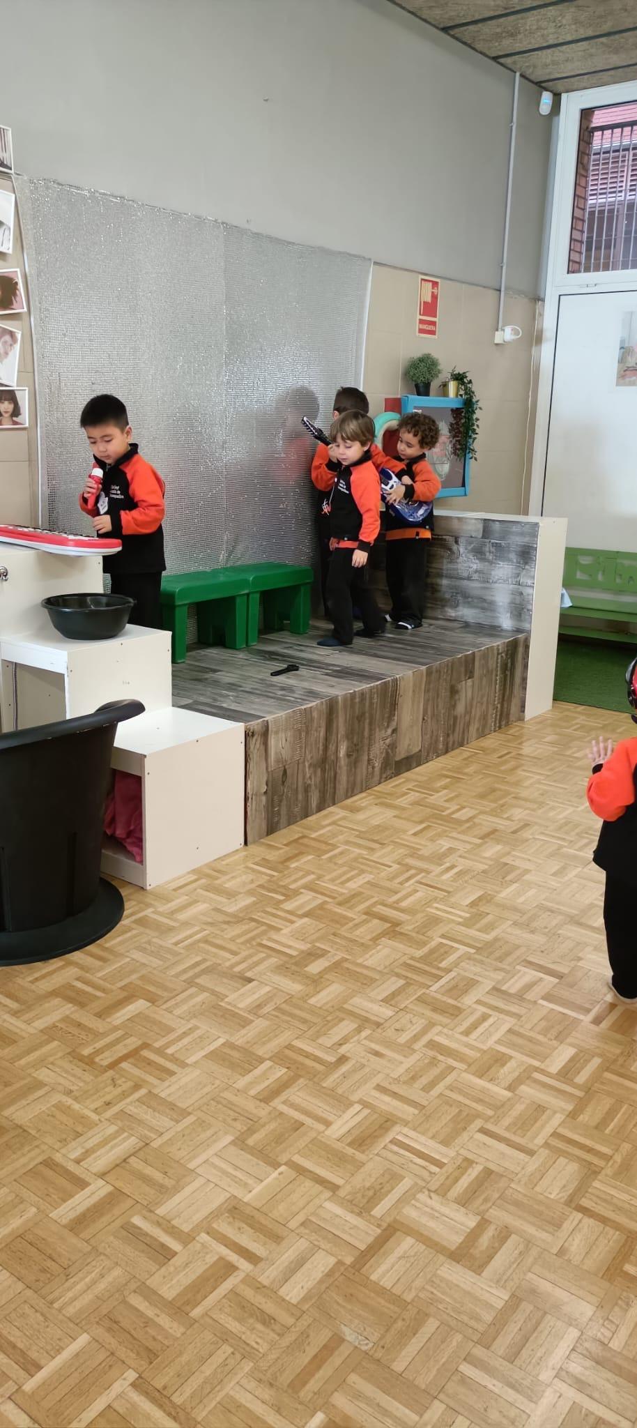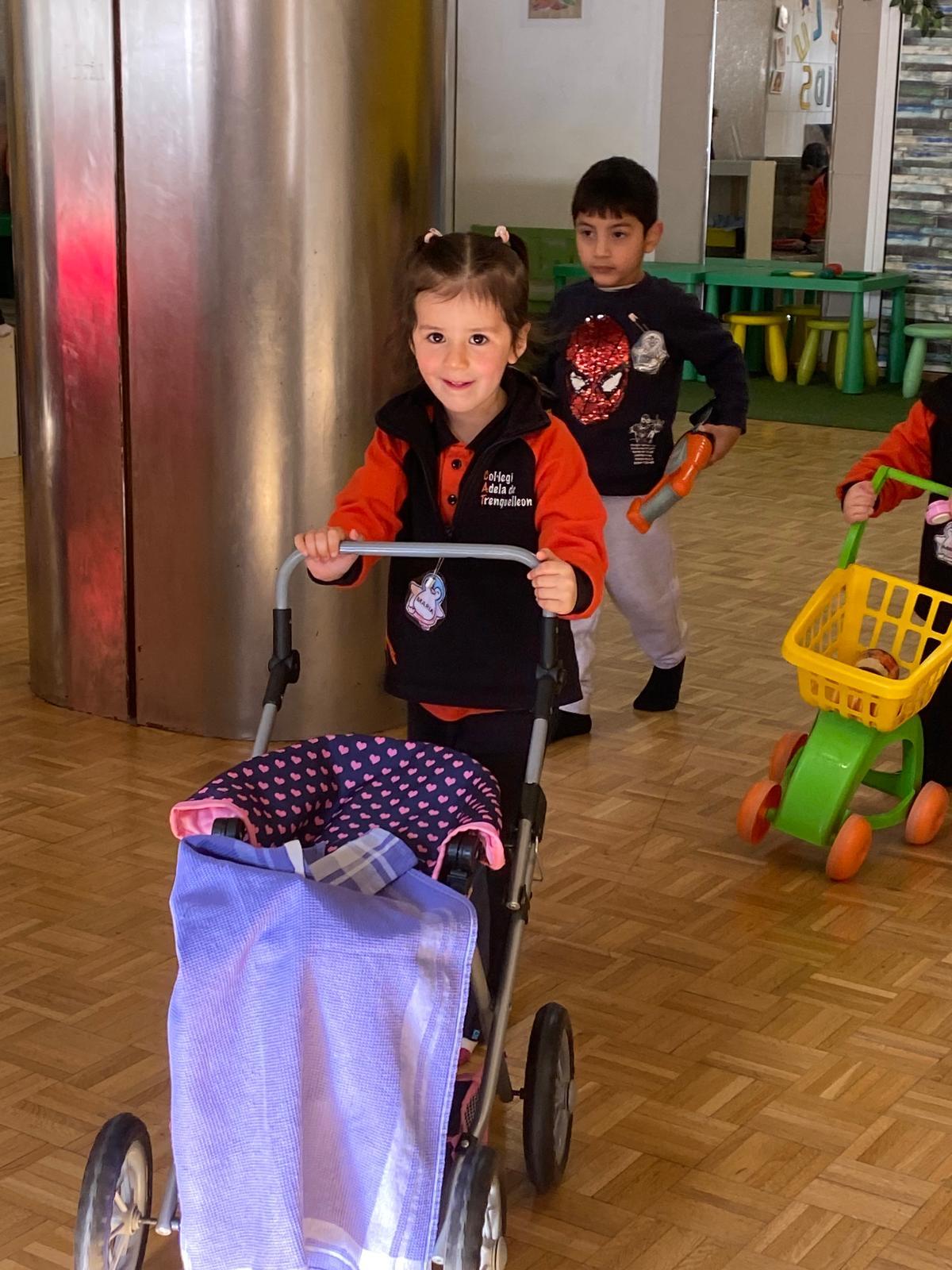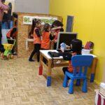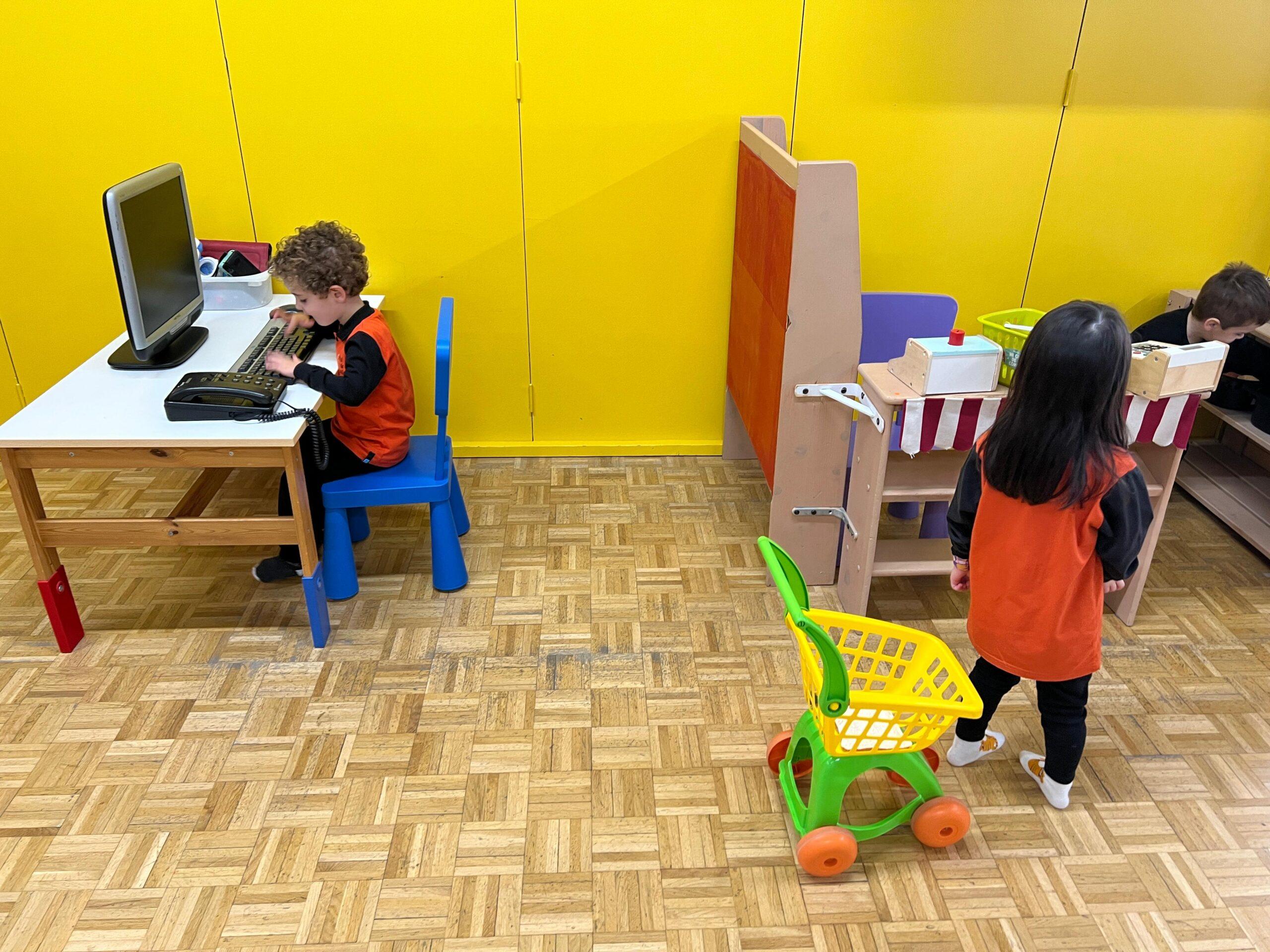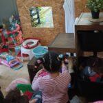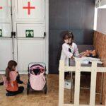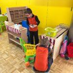 Allà van trobar-hi propostes molt variades. Van poder endinsar-se en el joc simbòlic amb la botigueta, la cuineta, la perruqueria i l’espai de metges. També van jugar a fer veure que treballaven en una oficina amb ordinadors i telèfons. Amb l’ajuda de les disfresses van acabar de donar vida a totes aquestes històries.