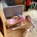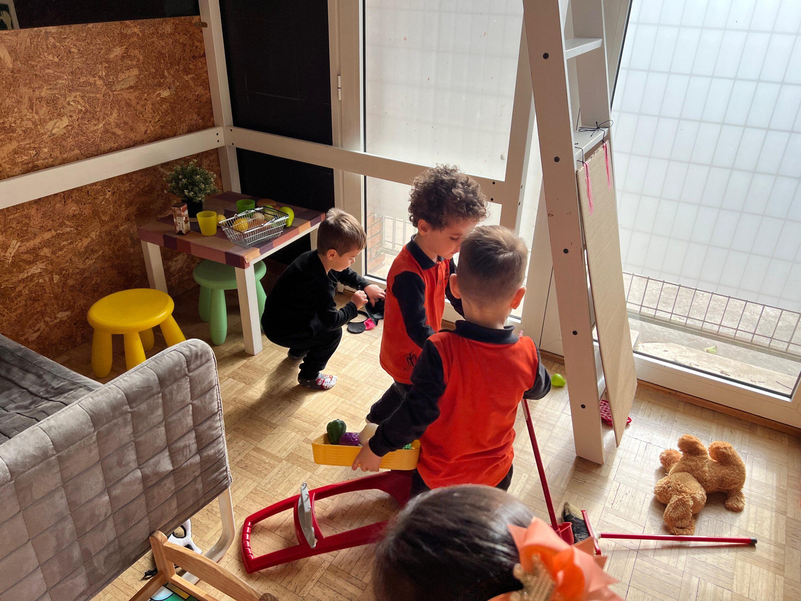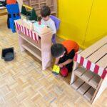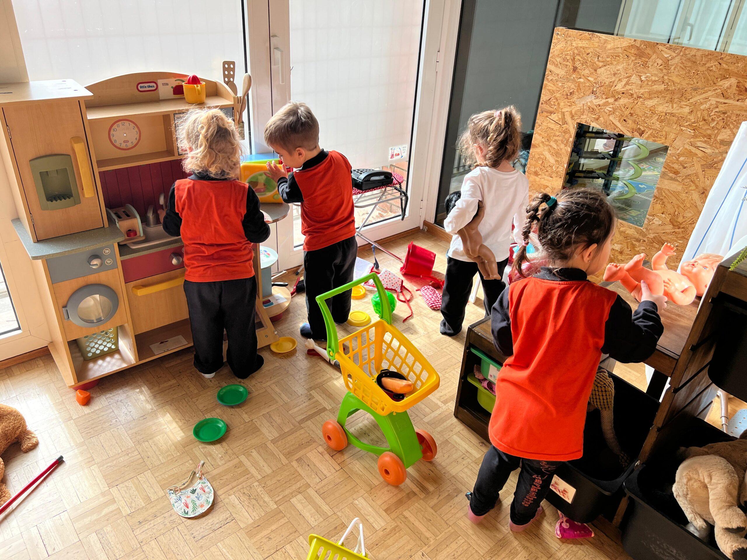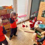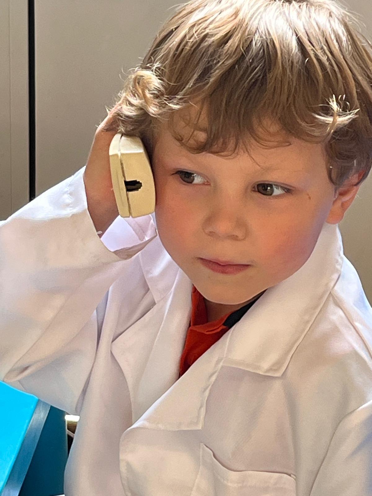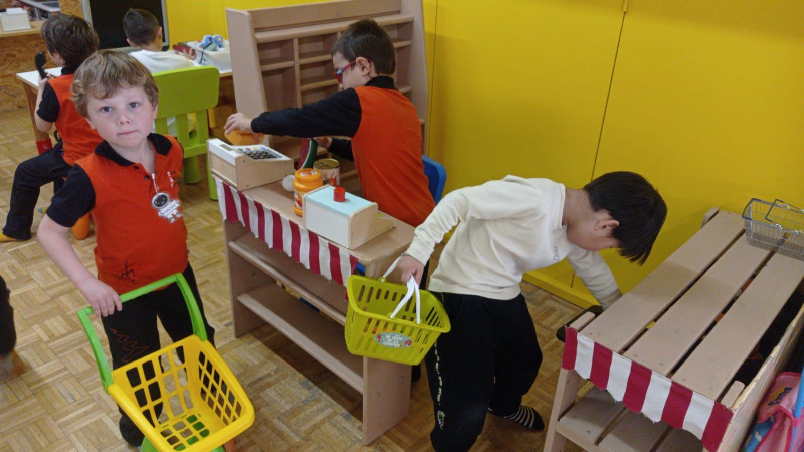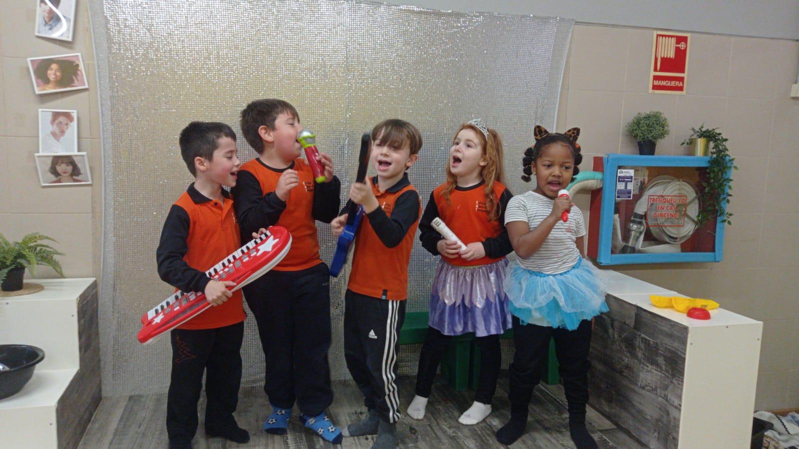 Allà van trobar-hi propostes molt variades. Van poder endinsar-se en el joc simbòlic amb la botigueta, la cuineta, la perruqueria i l’espai de metges. També van jugar a fer veure que treballaven en una oficina amb ordinadors i telèfons. Amb l’ajuda de les disfresses van acabar de donar vida a totes aquestes històries.